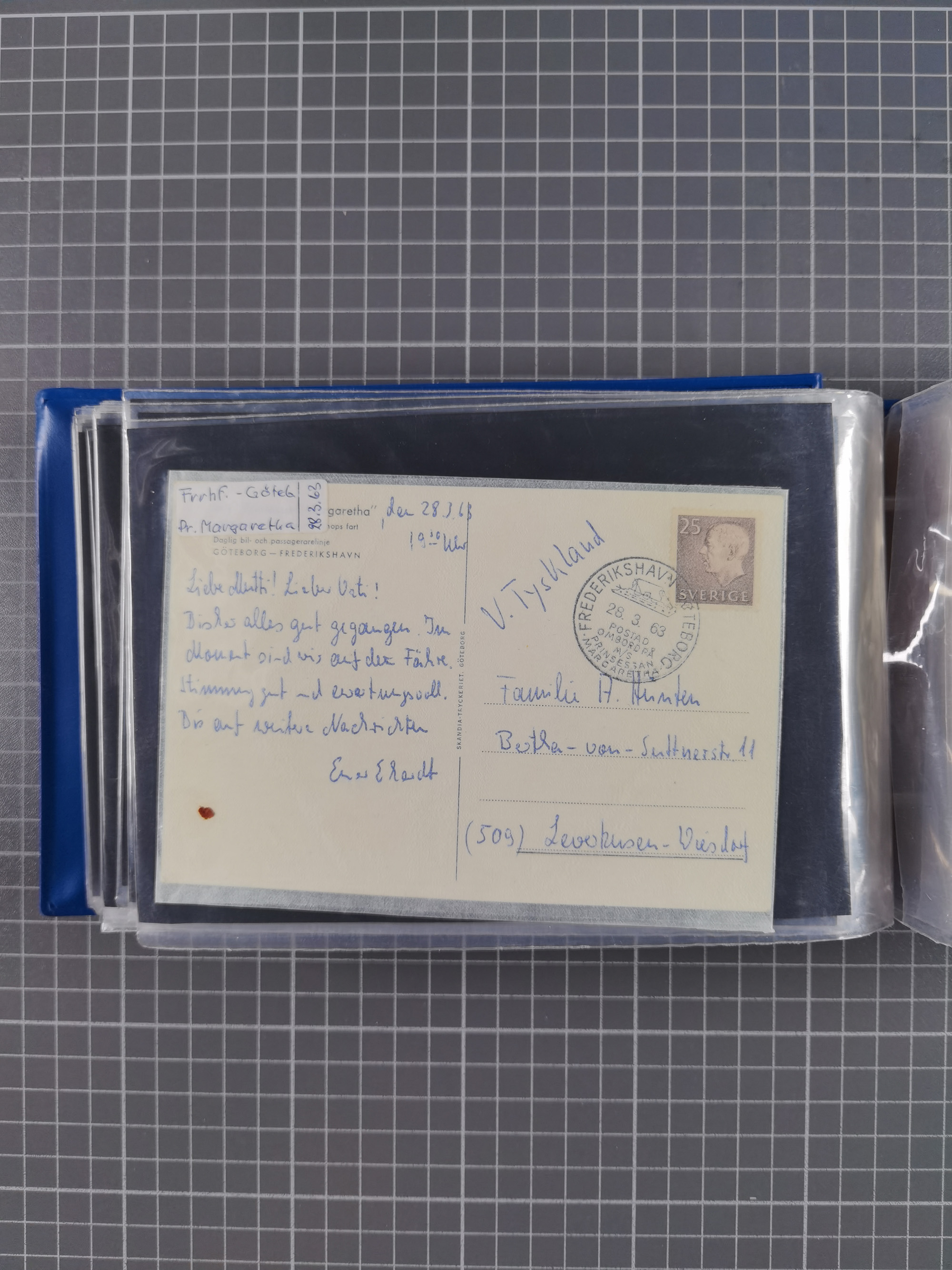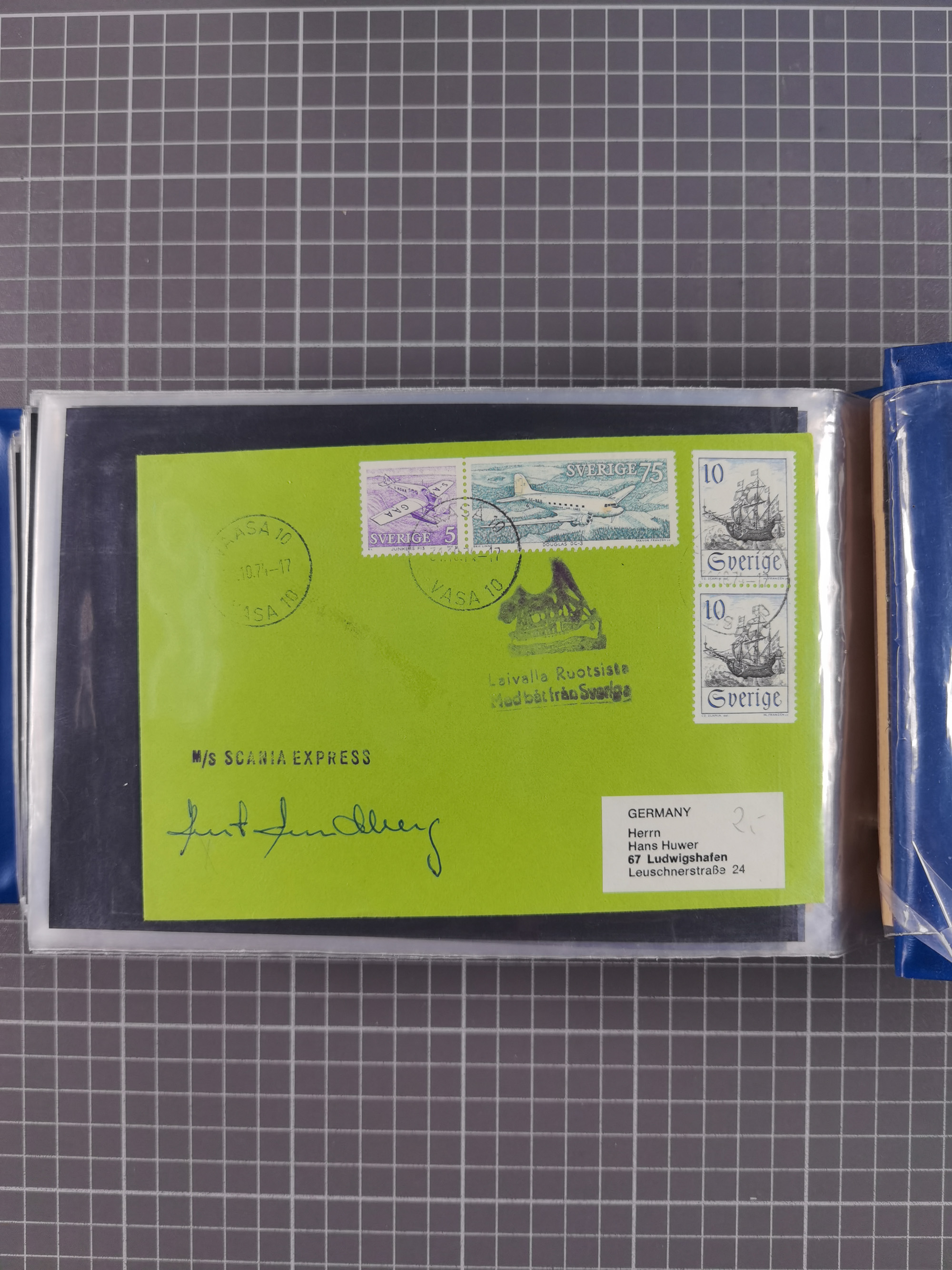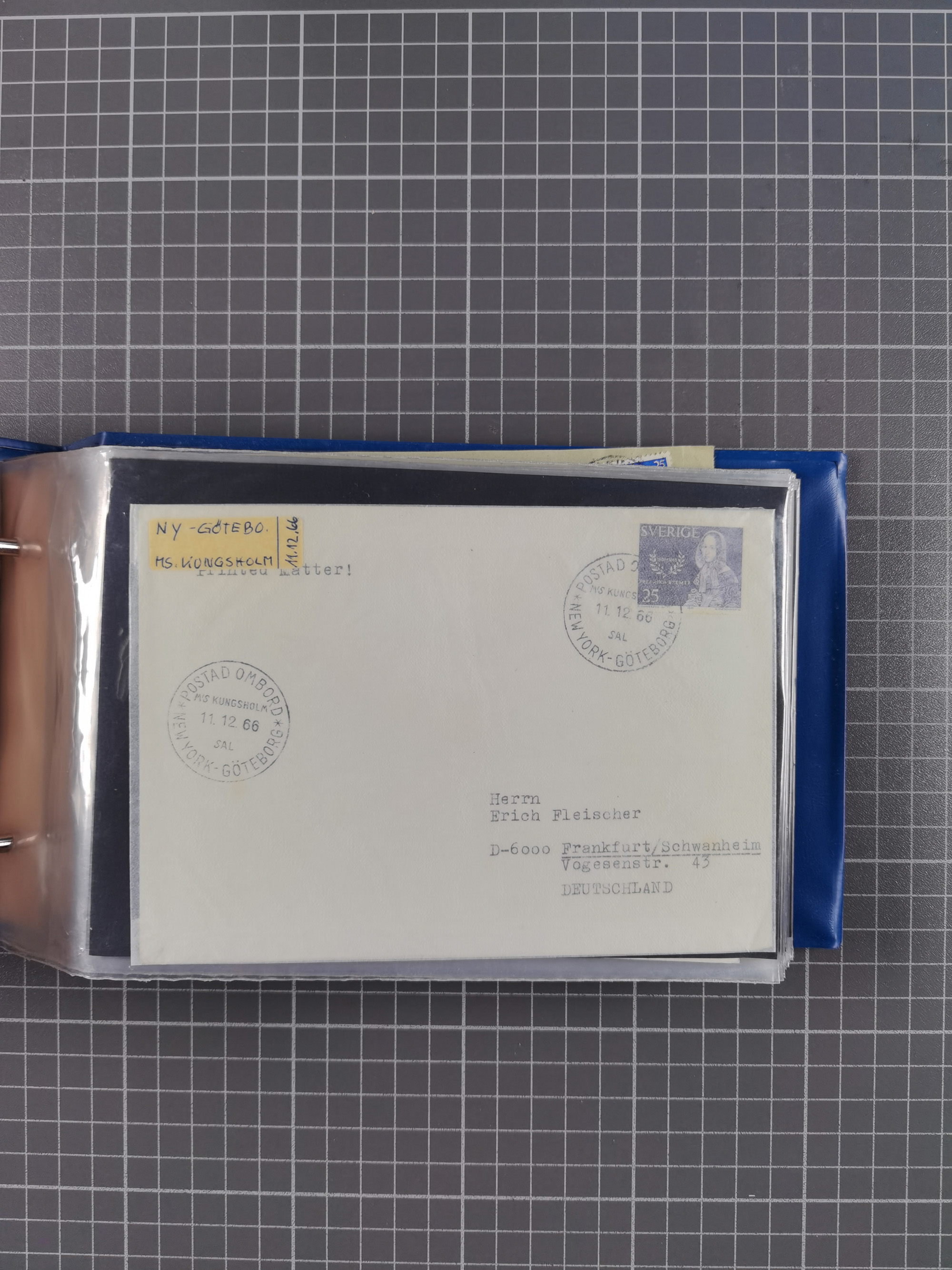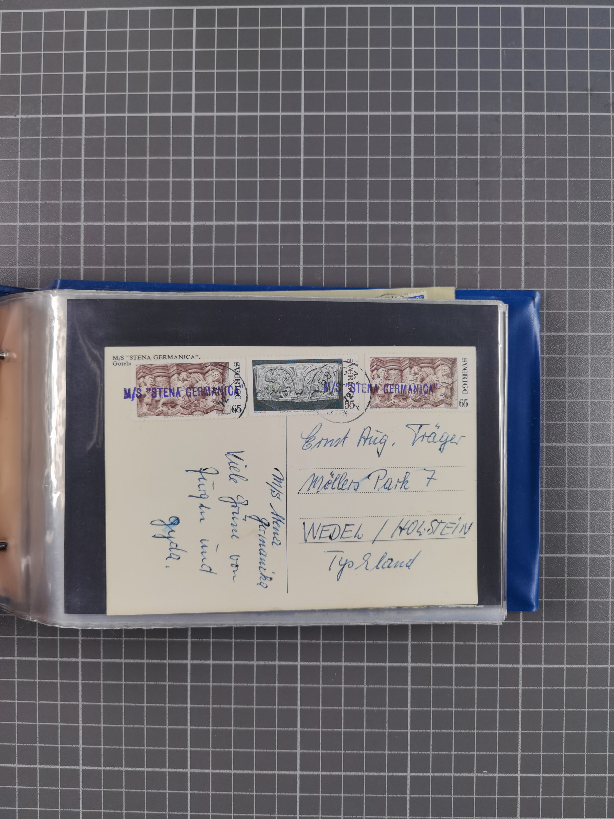 1853/1950, interessante Sammlung “Nordische Schiffspost” inkl. Transit- und Anlandungsstempeln mit fast 60 Briefen, Karten und GSK sowie einigen losen Marken und Briefstücken, dabei u.a. NDP-Faltbrief 1870 mit Ra3" AUS (Wollin) PER DAMPFSCHIFF….", markenloser Faltbrief 1871 mit Rahmenstempel “AUS STETTIN PER DAMPFSCHIFF”, dänischer Nummernstempel “1” auf D. Reich Ganzsachenkarte 10 Pfg,, frankierter Island-Brief mit Stempel “ABERDEEN 1933” und Ra1 “SHIPP LETTER" und einige Briefe mit schwedischen Sonderfahrten-Stempel der 30er-Jahre. Alles auf Albenblättern mit Beschriftung, ex Steinmeyer