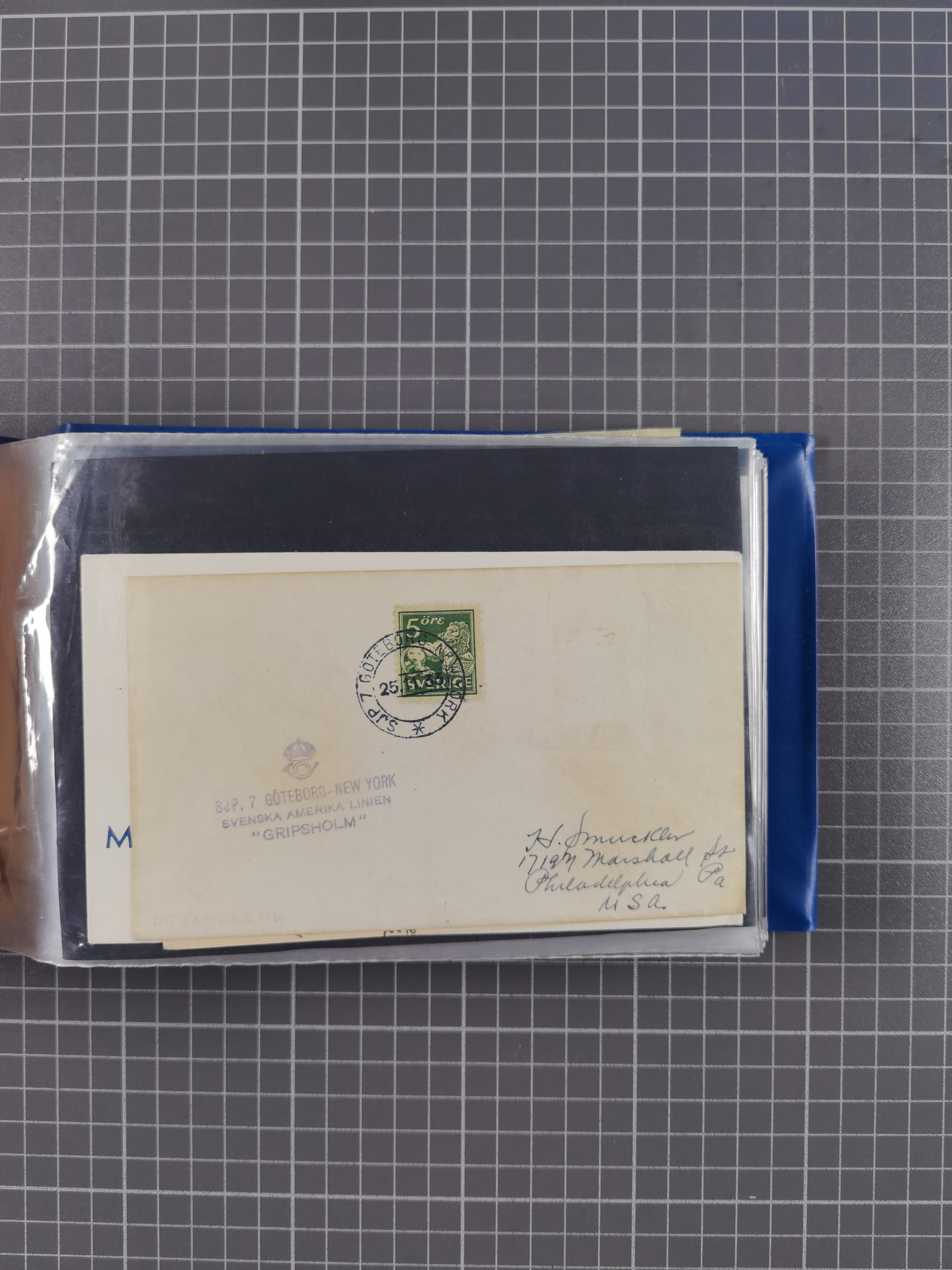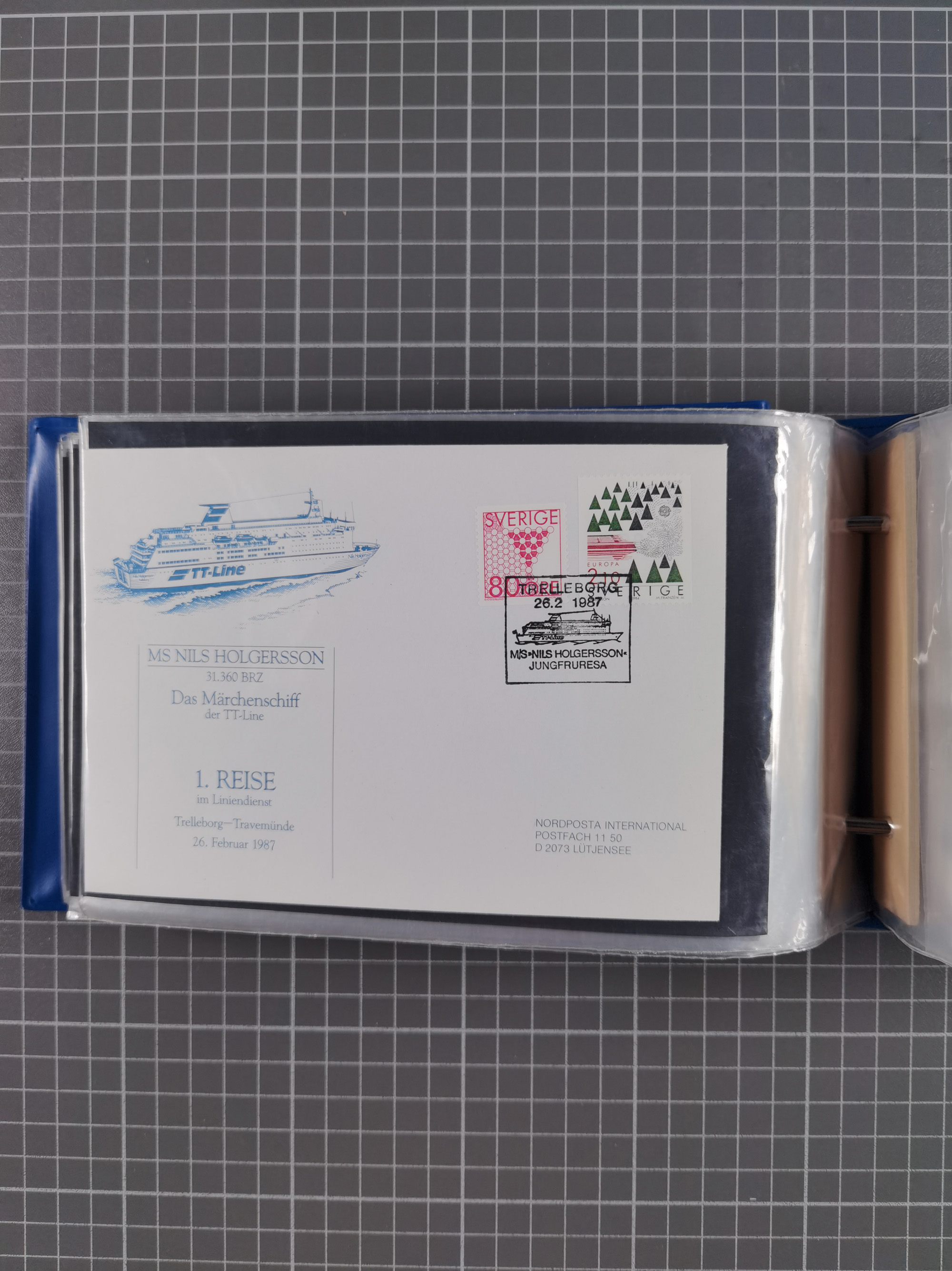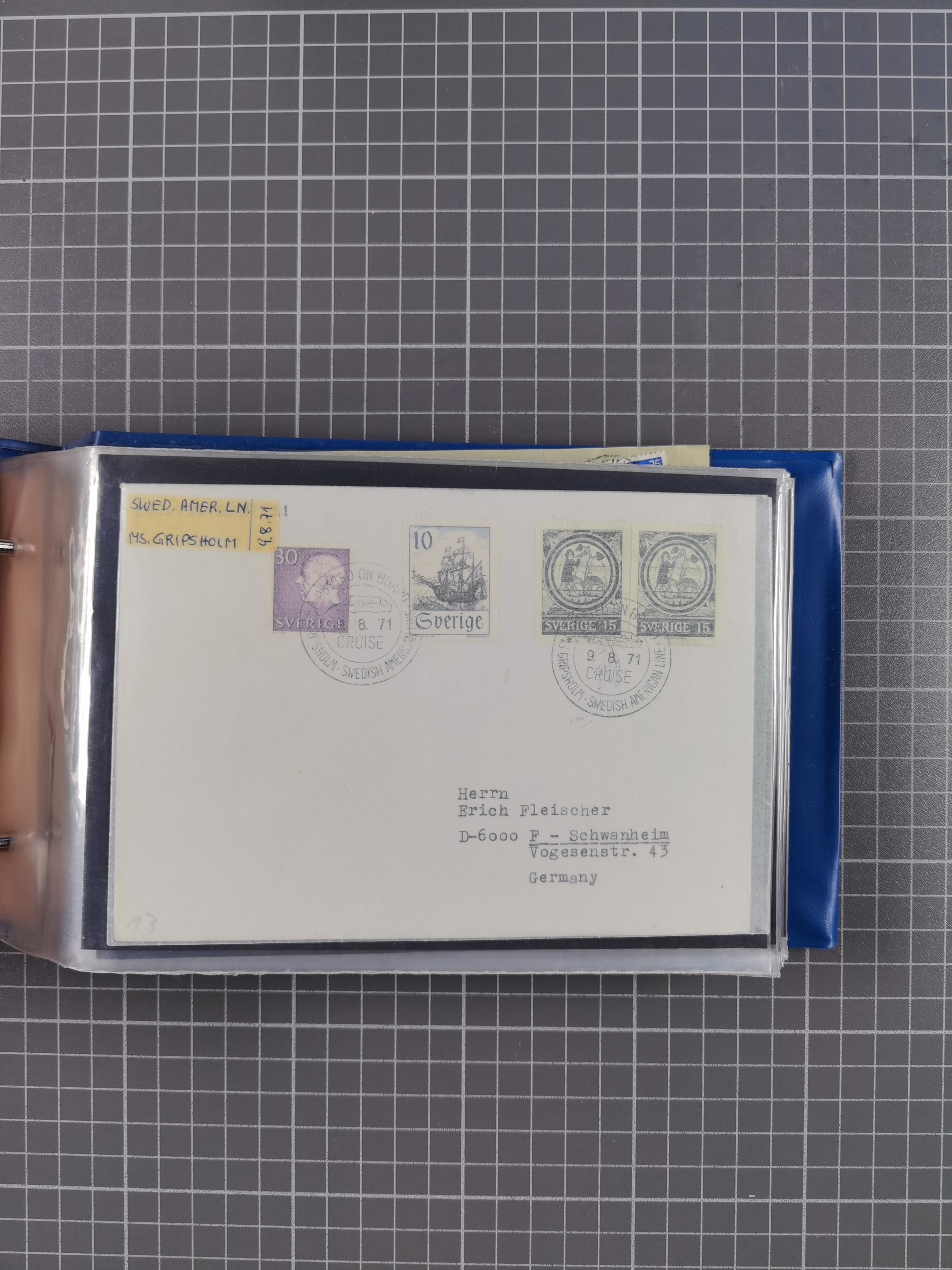 1853/1950, interessante Sammlung “Nordische Schiffspost” inkl. Transit- und Anlandungsstempeln mit fast 60 Briefen, Karten und GSK sowie einigen losen Marken und Briefstücken, dabei u.a. NDP-Faltbrief 1870 mit Ra3" AUS (Wollin) PER DAMPFSCHIFF….", markenloser Faltbrief 1871 mit Rahmenstempel “AUS STETTIN PER DAMPFSCHIFF”, dänischer Nummernstempel “1” auf D. Reich Ganzsachenkarte 10 Pfg,, frankierter Island-Brief mit Stempel “ABERDEEN 1933” und Ra1 “SHIPP LETTER" und einige Briefe mit schwedischen Sonderfahrten-Stempel der 30er-Jahre. Alles auf Albenblättern mit Beschriftung, ex Steinmeyer