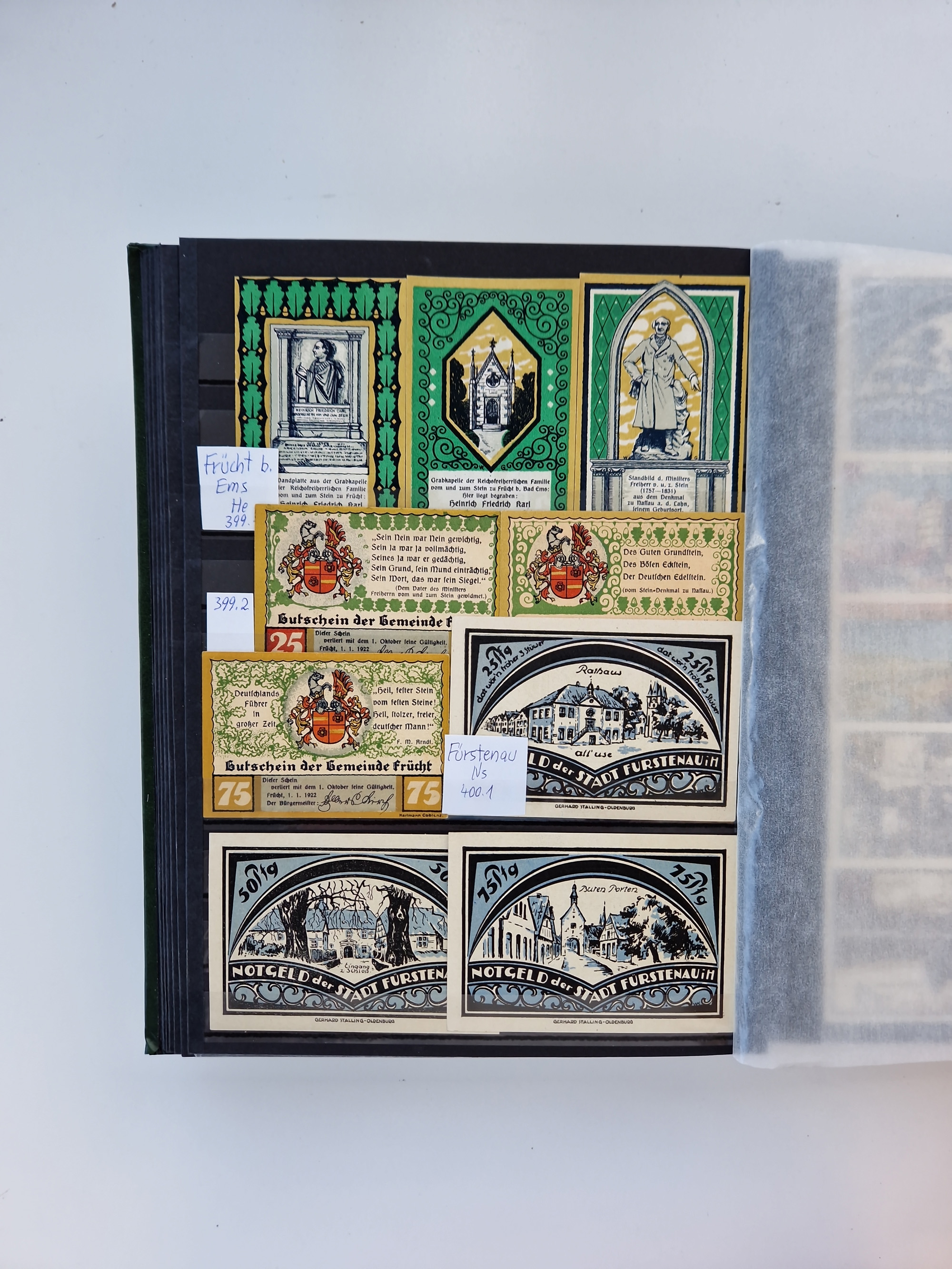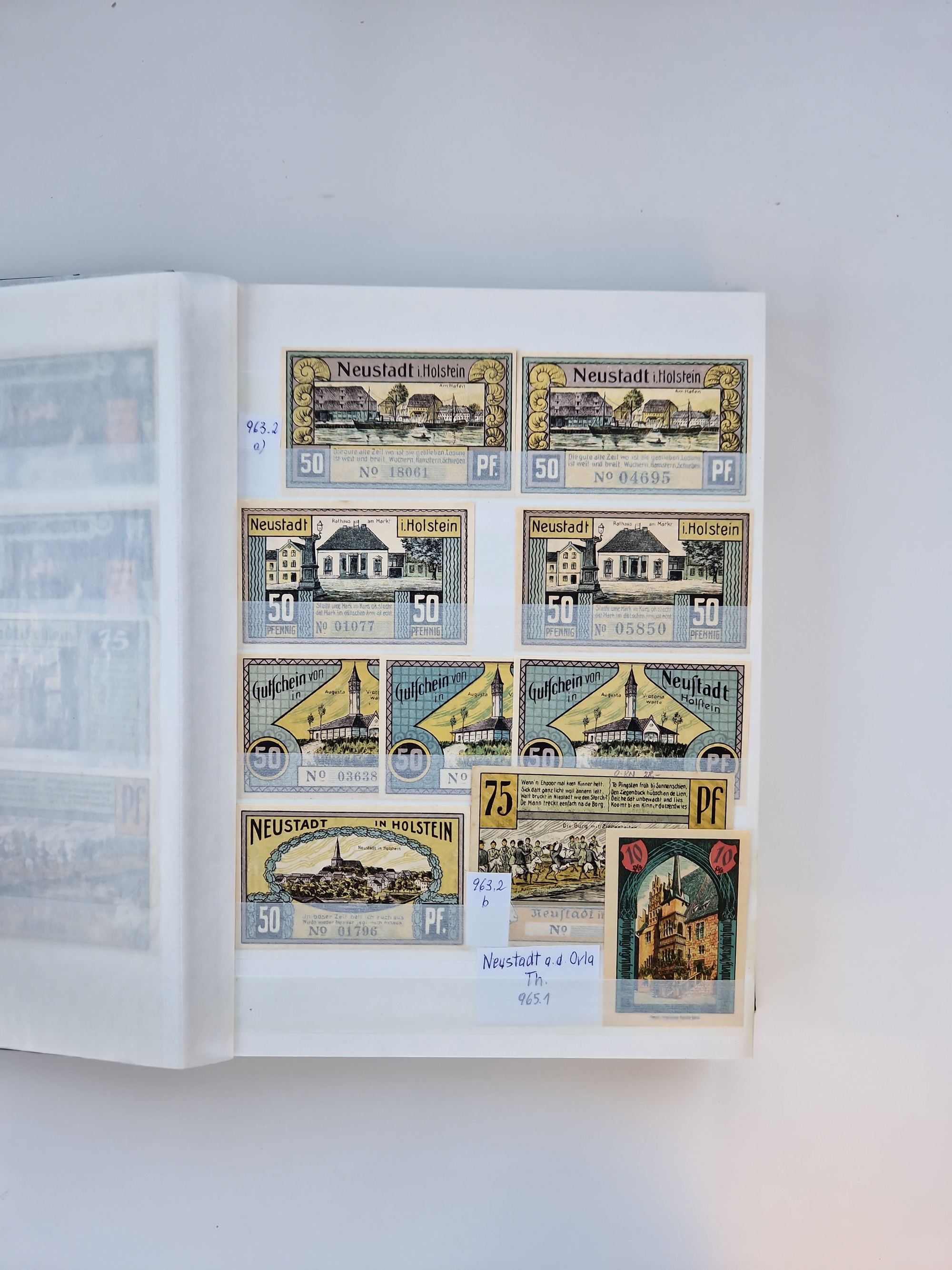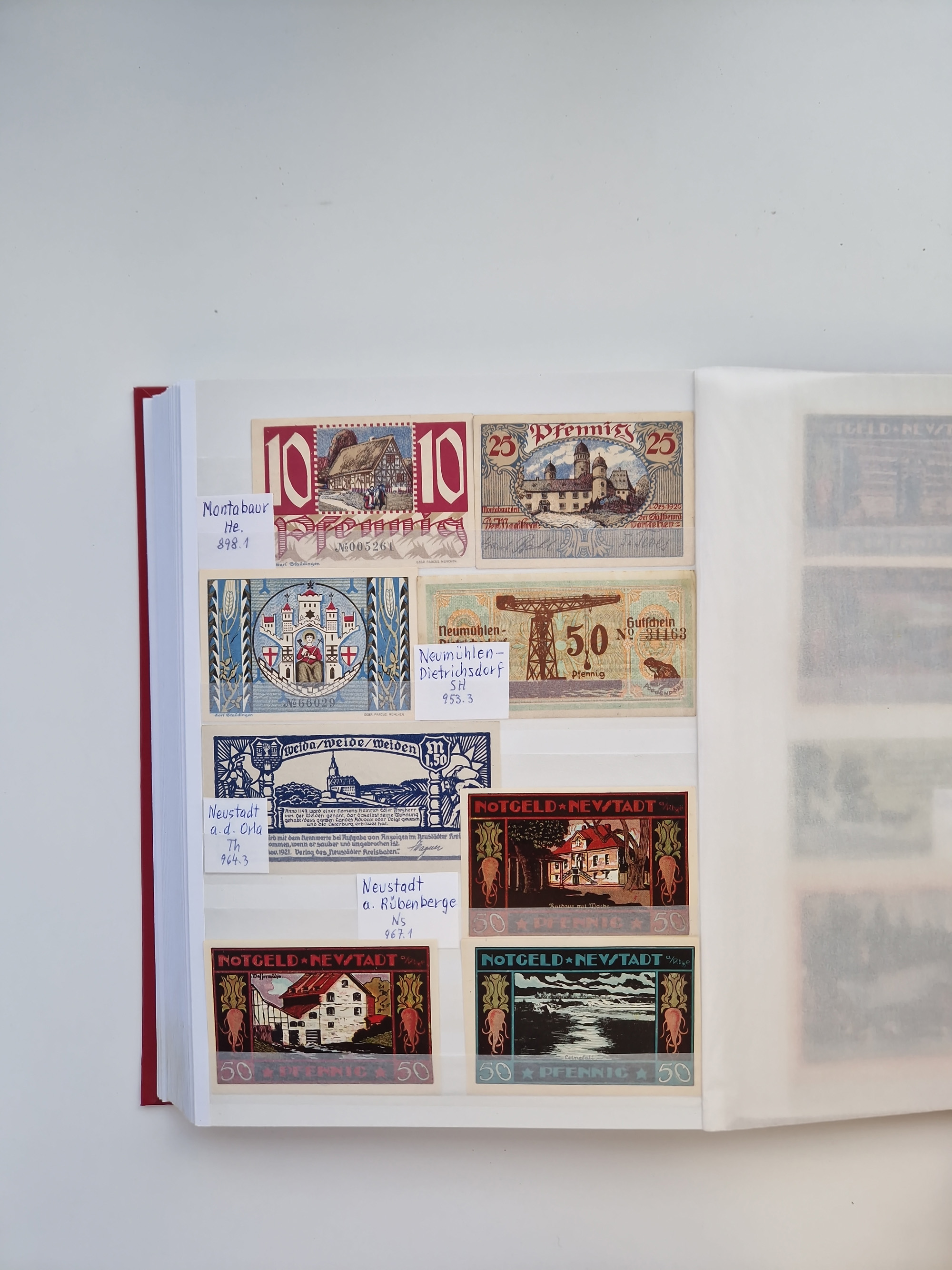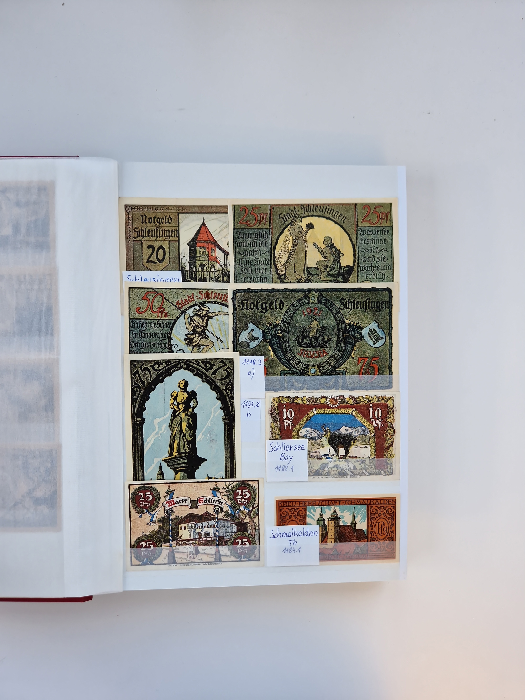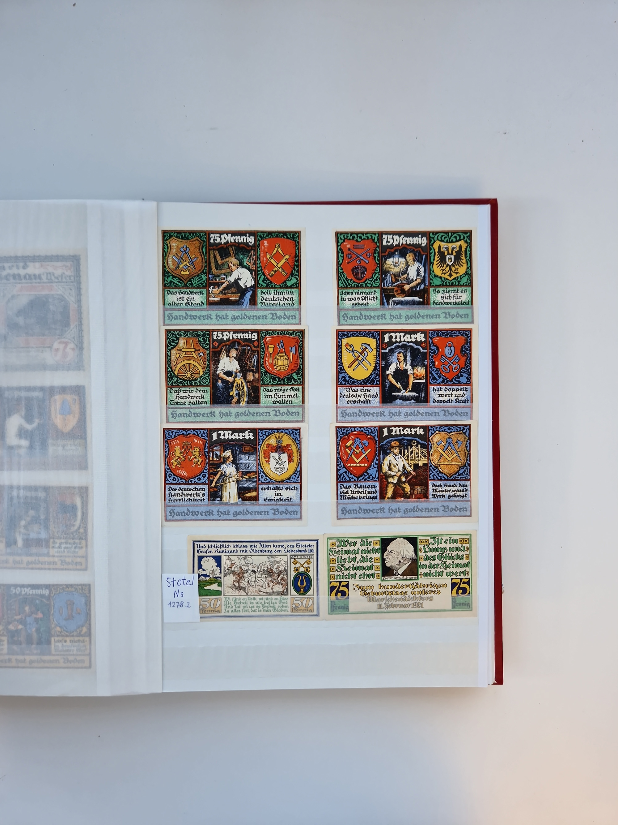Notgeld-Serienscheine, saubere Sammlung in 16 meist dicken Steckalben, sauber nach Orten und Serien sortiert, überschlägig etwa 7/8000 Stück, dazu 4 Kataloge