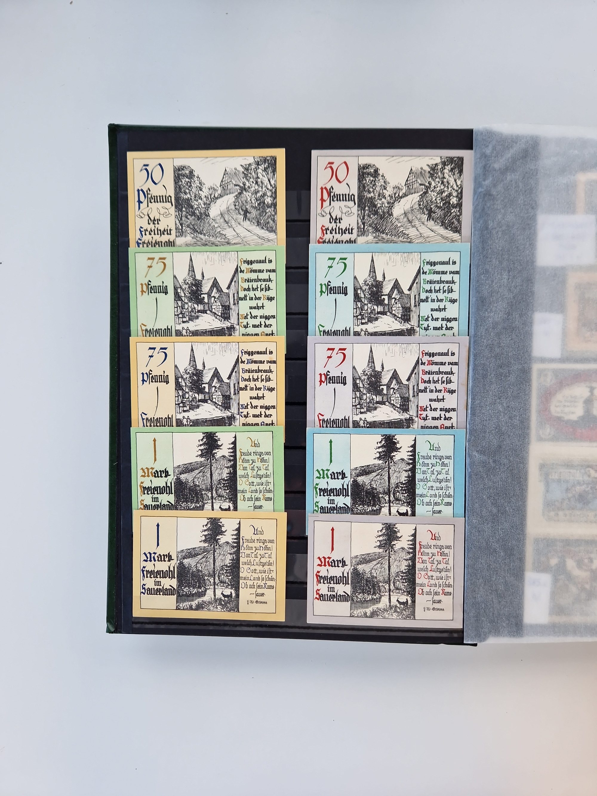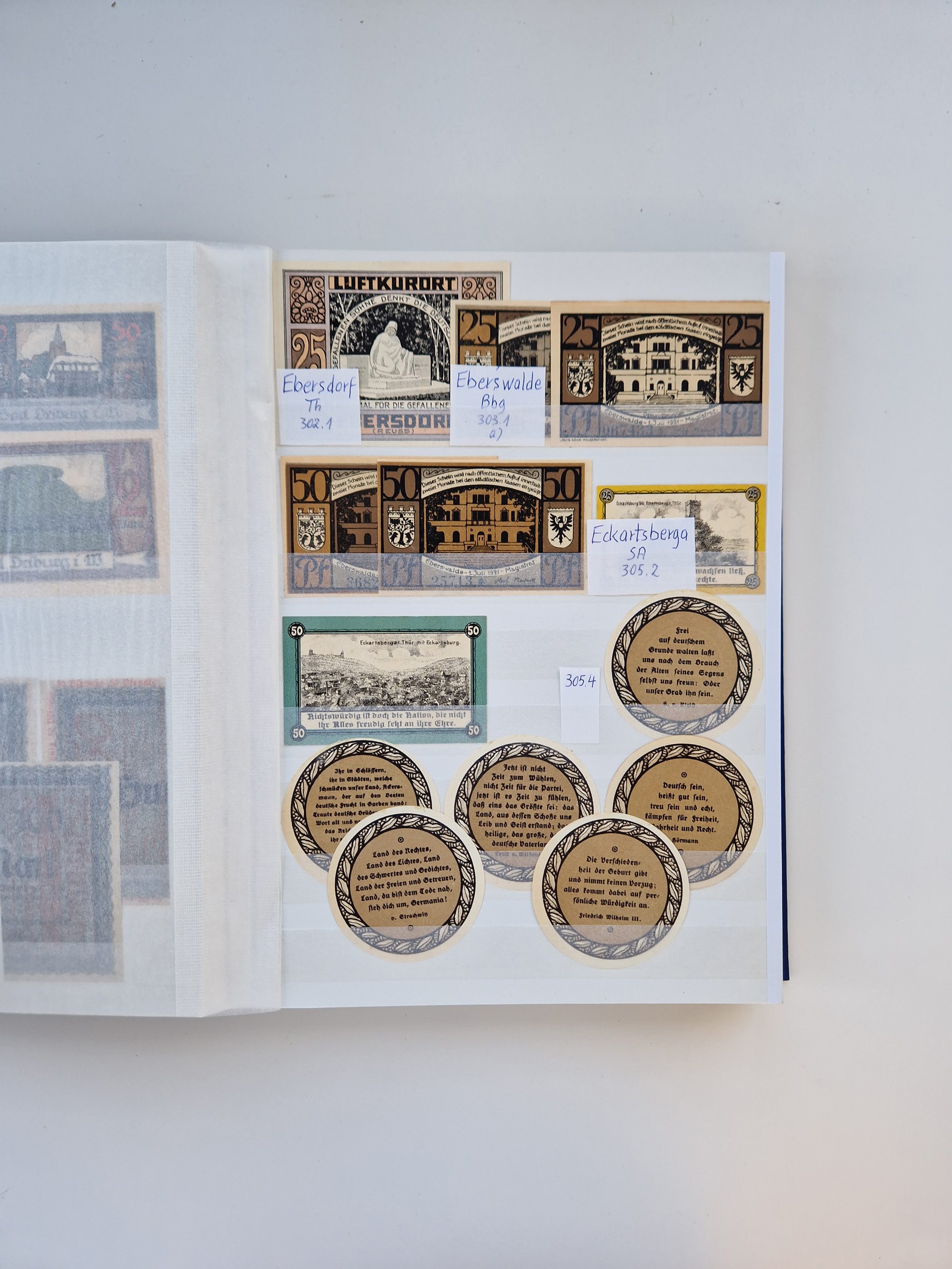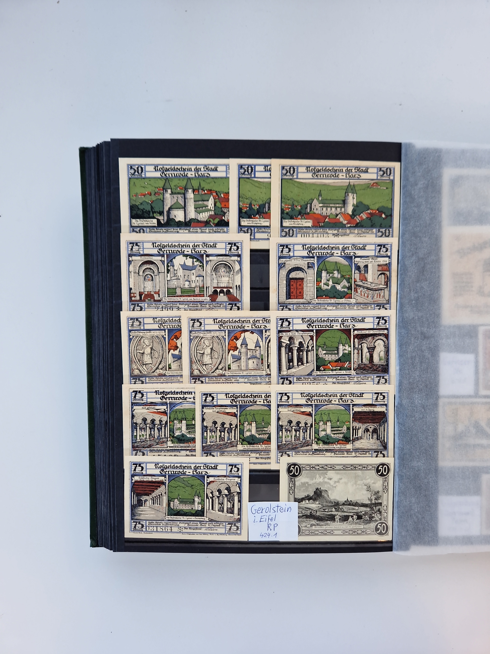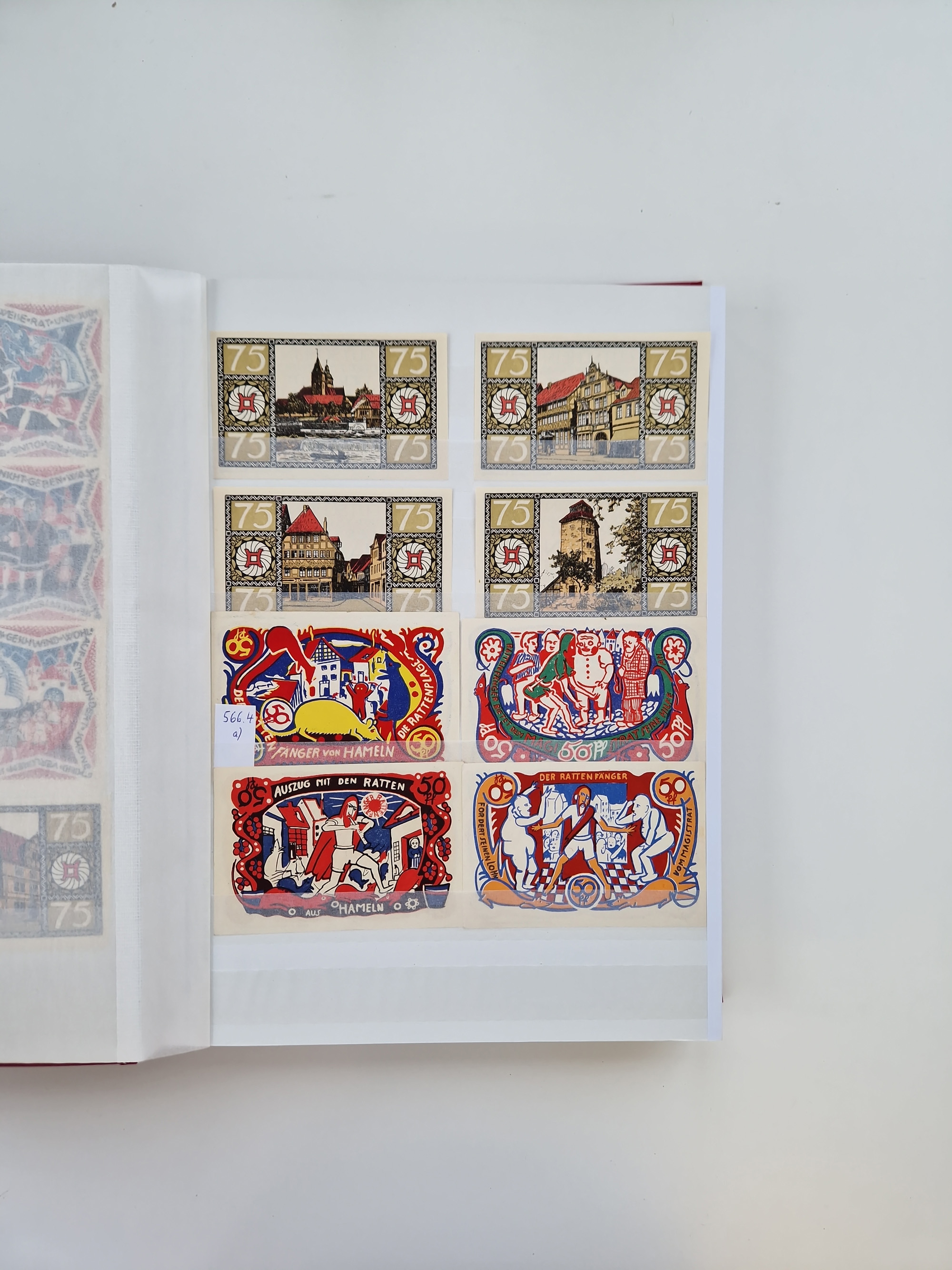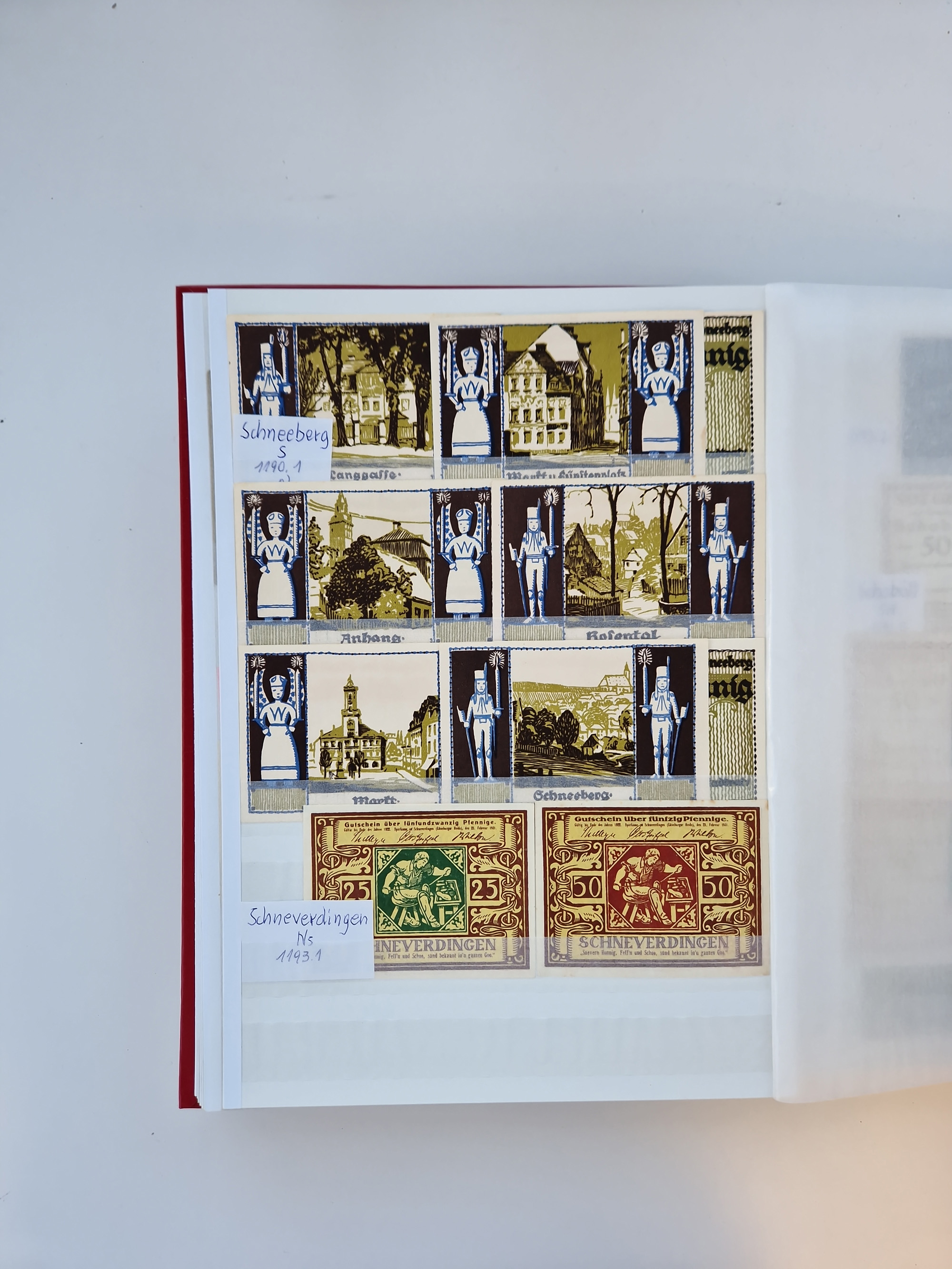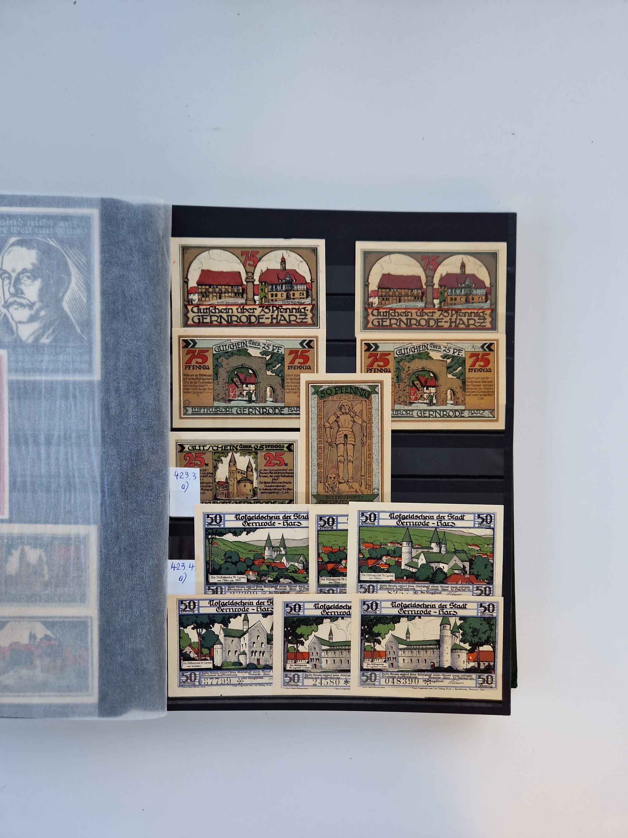 Notgeld-Serienscheine, saubere Sammlung in 16 meist dicken Steckalben, sauber nach Orten und Serien sortiert, überschlägig etwa 7/8000 Stück, dazu 4 Kataloge