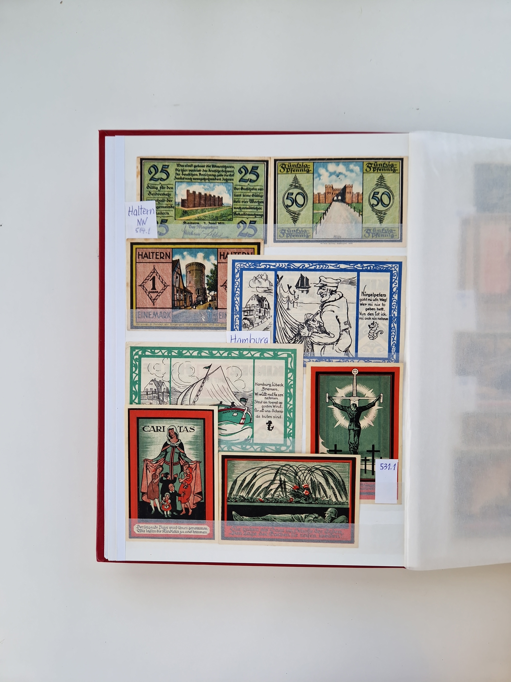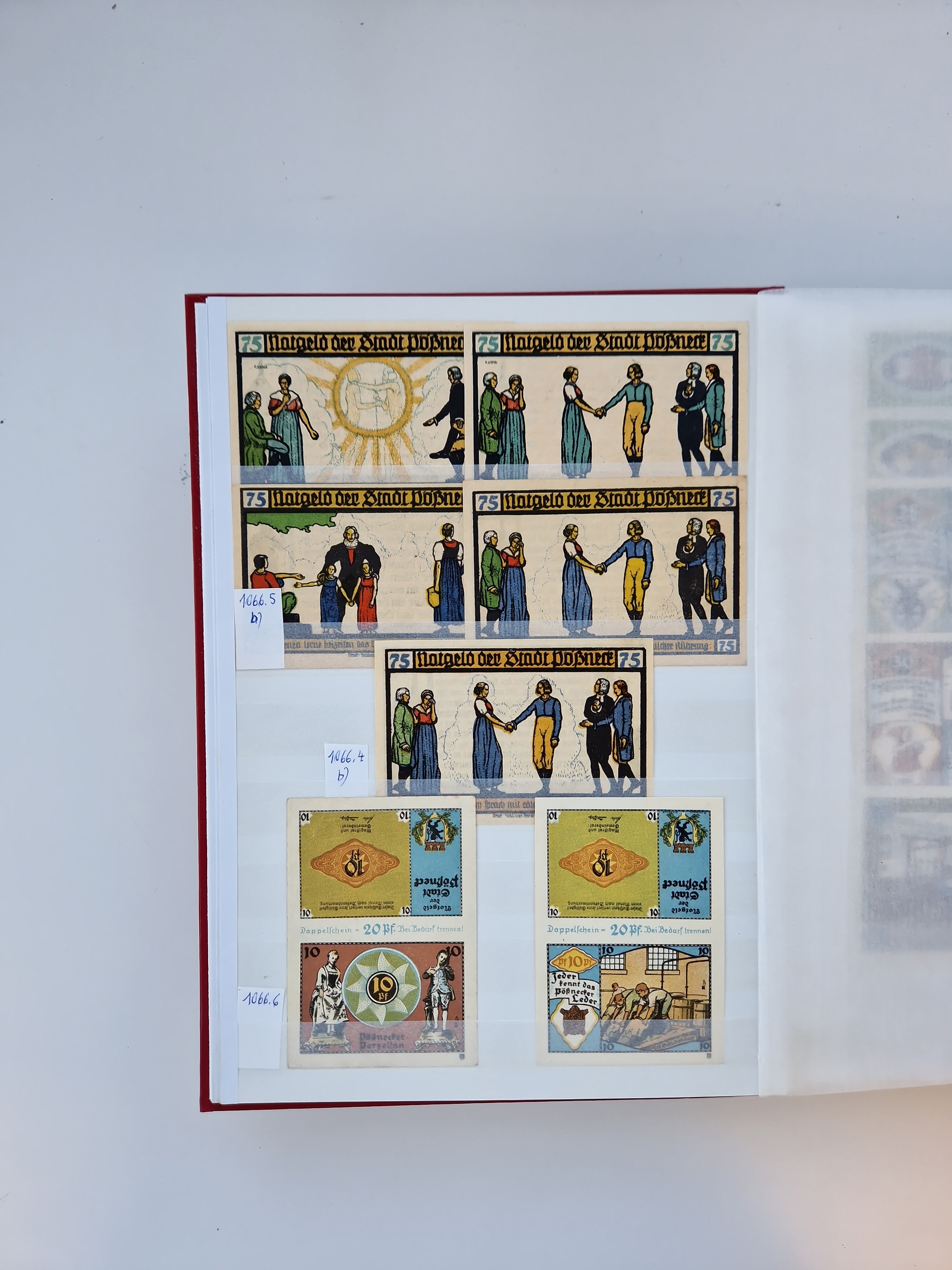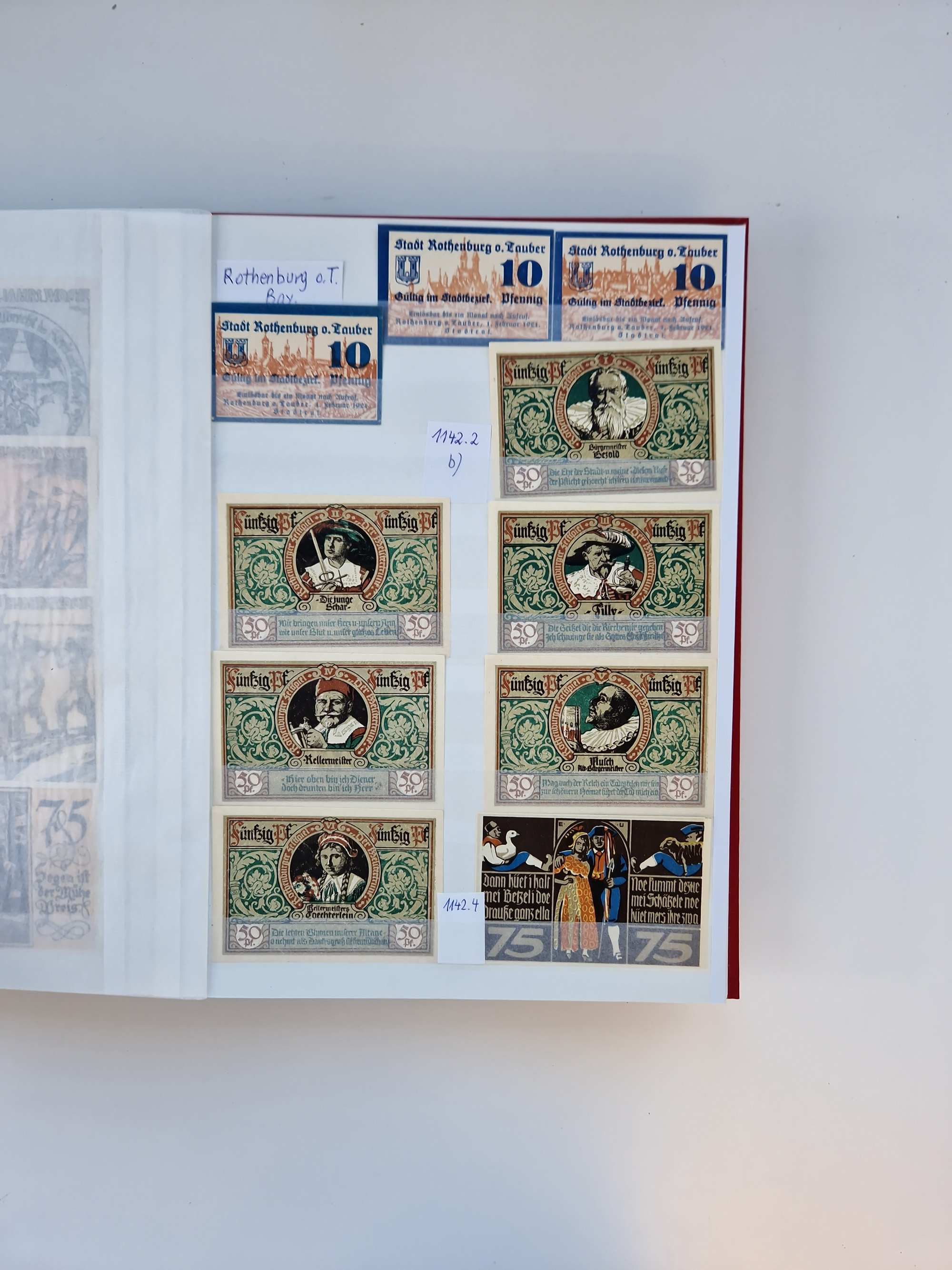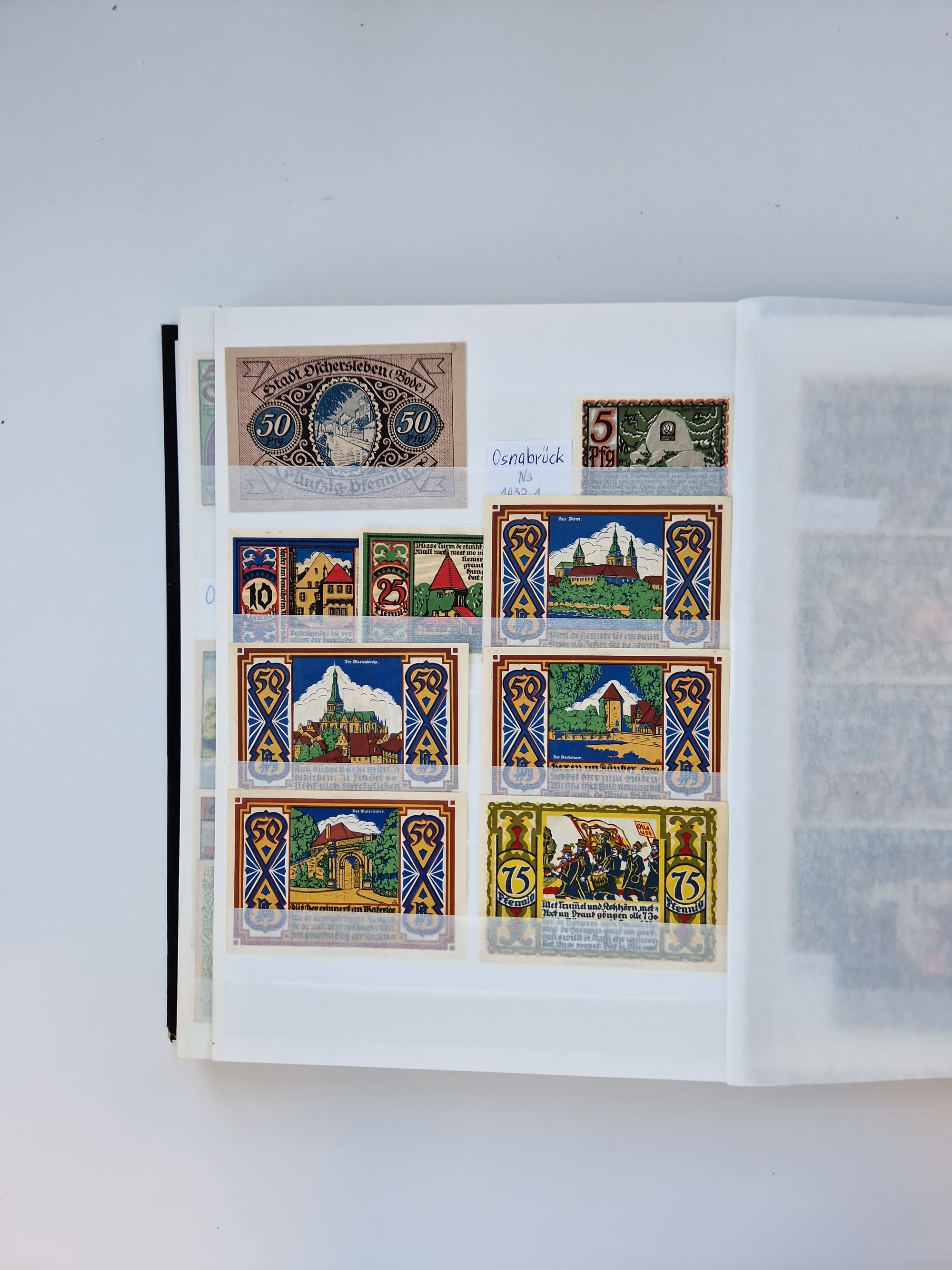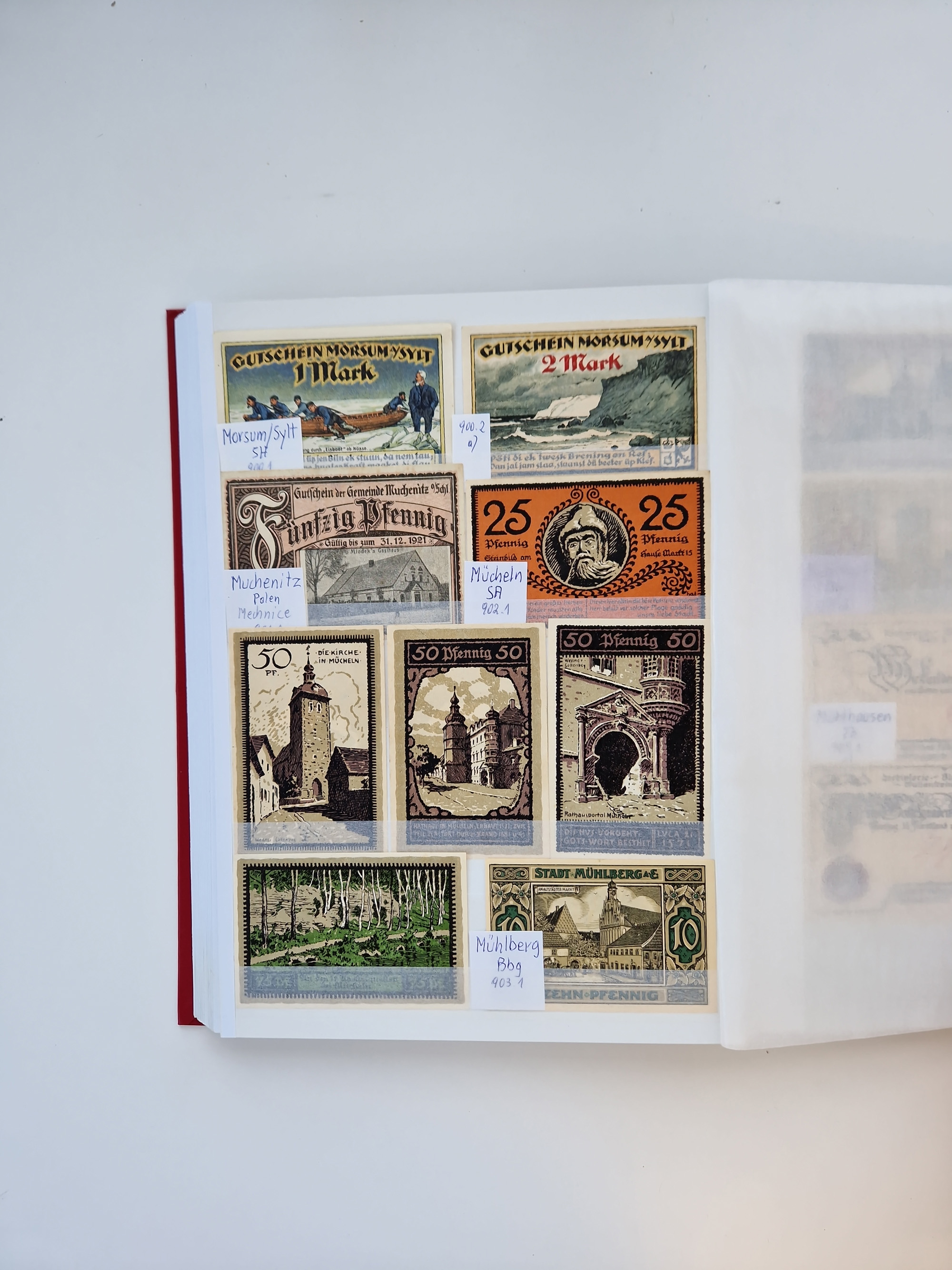 Notgeld-Serienscheine, saubere Sammlung in 16 meist dicken Steckalben, sauber nach Orten und Serien sortiert, überschlägig etwa 7/8000 Stück, dazu 4 Kataloge
