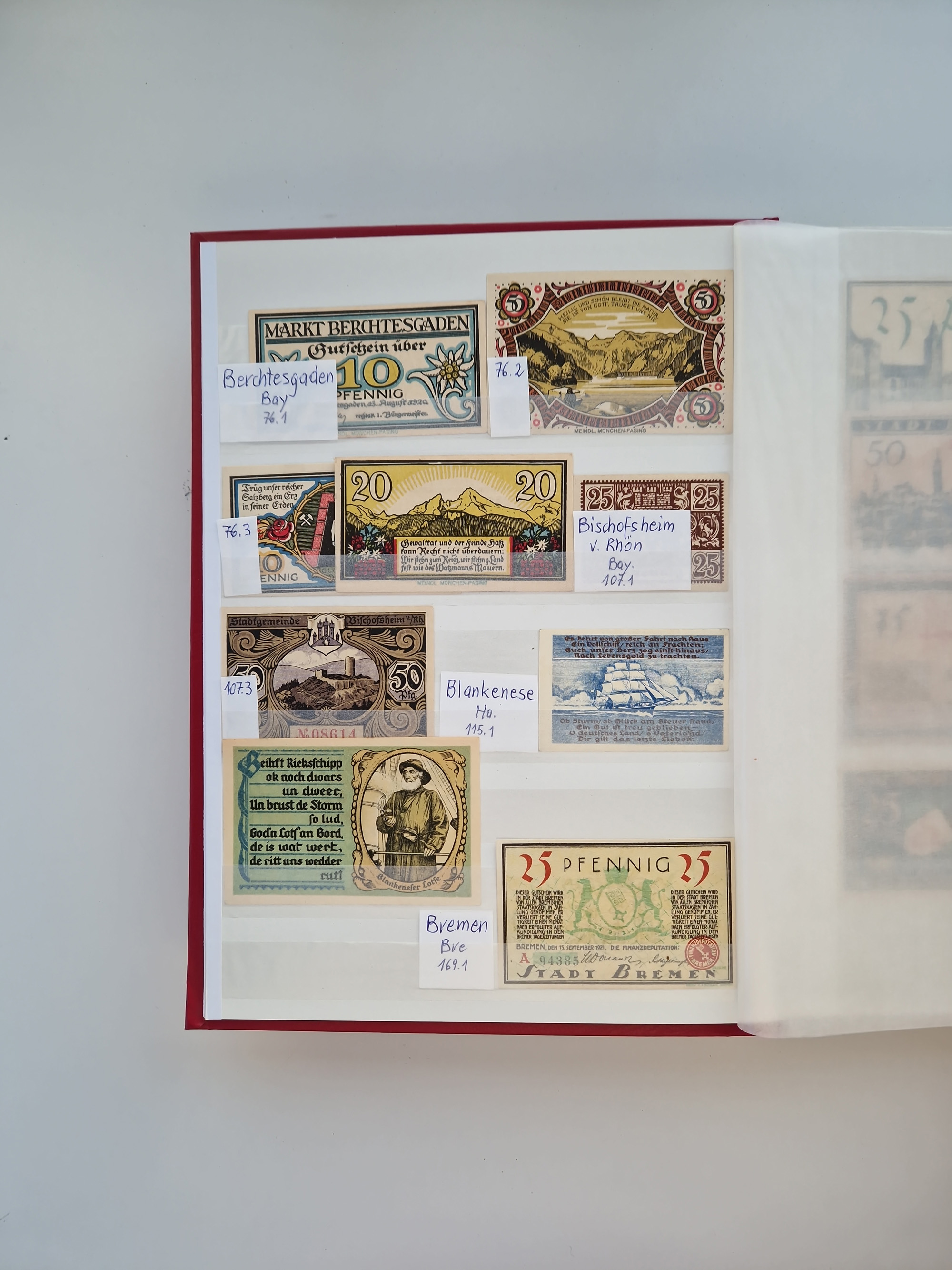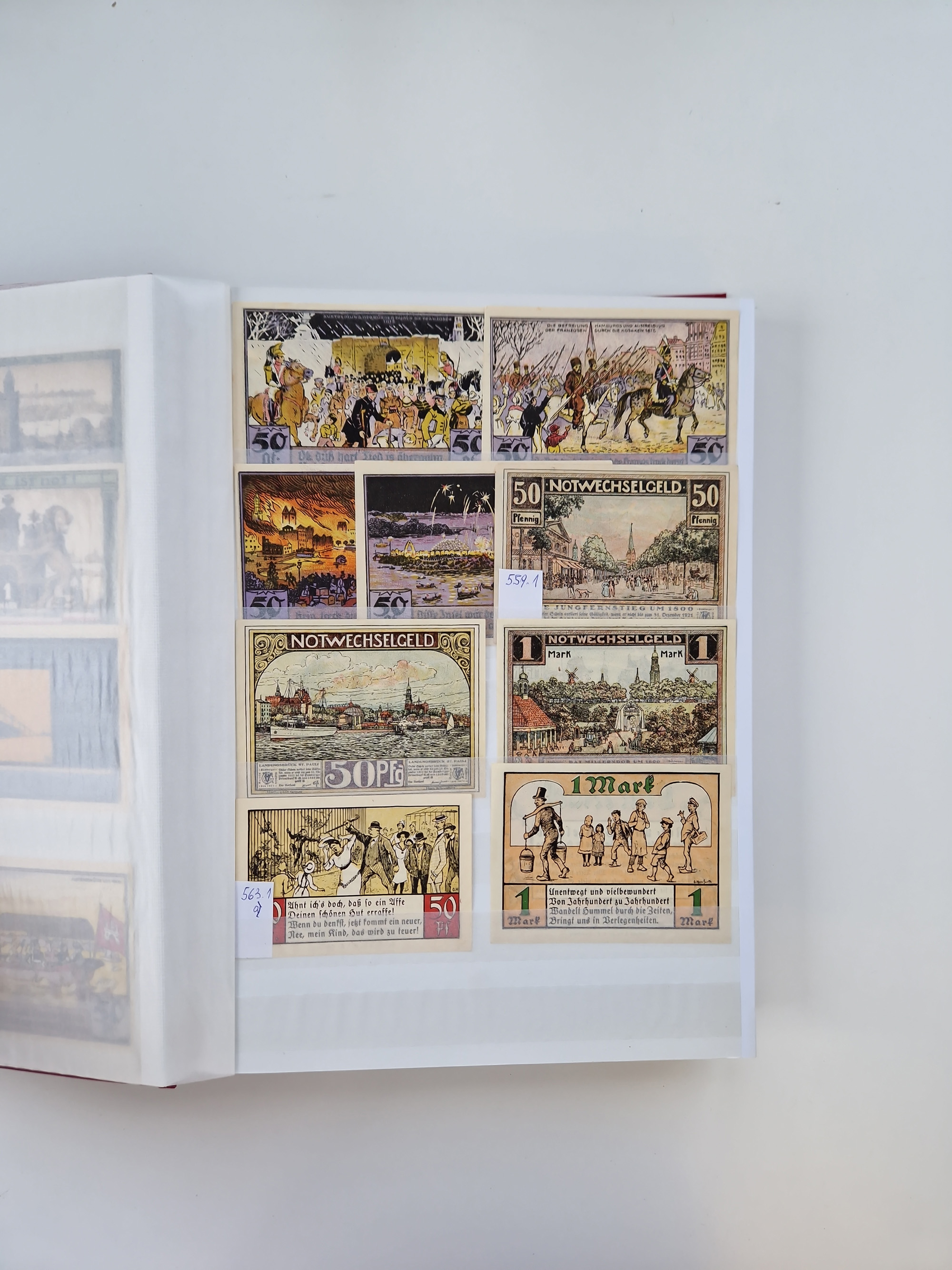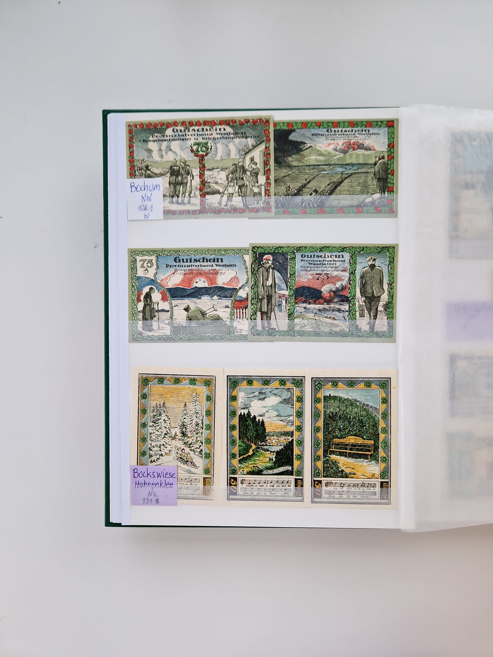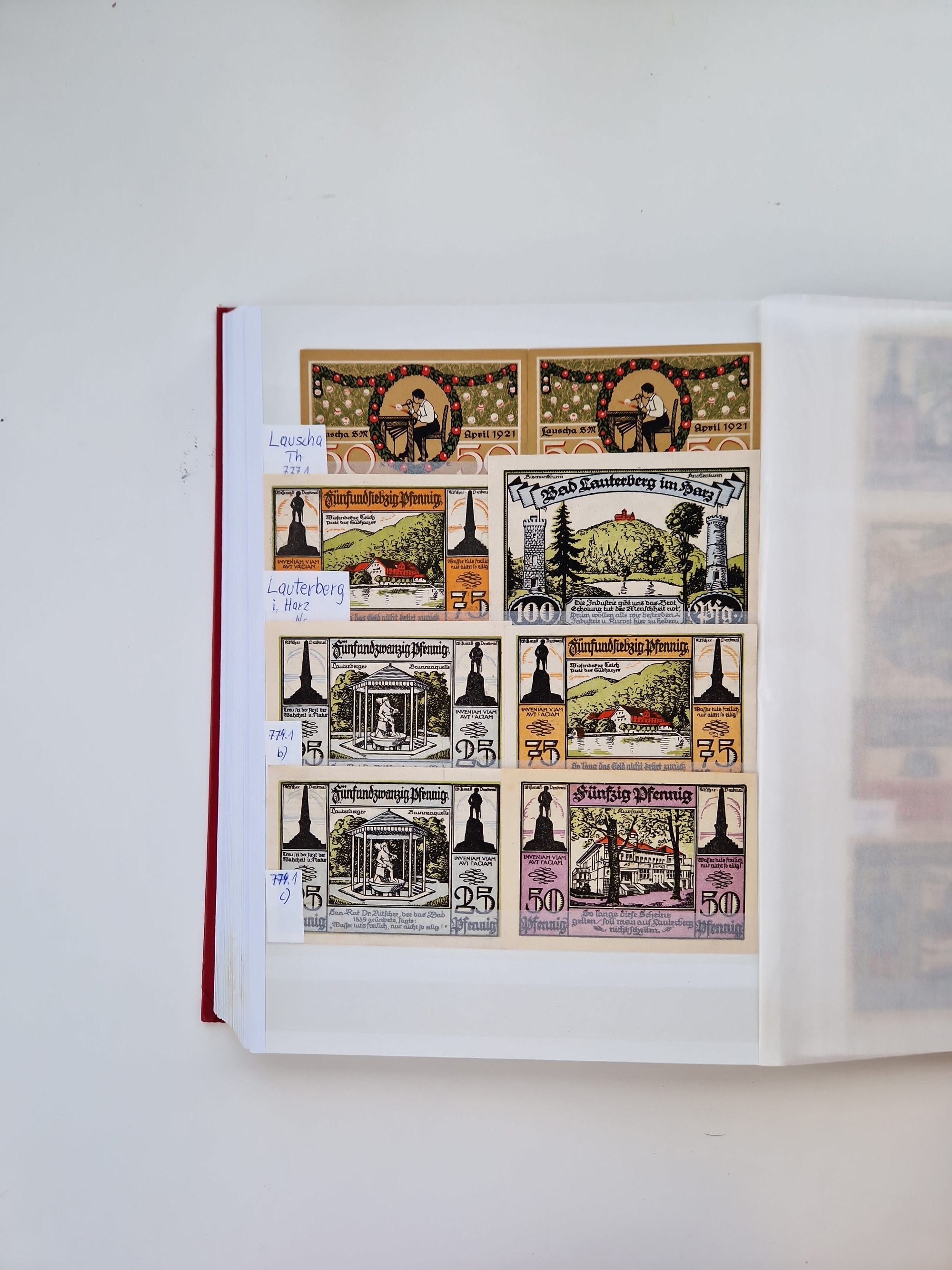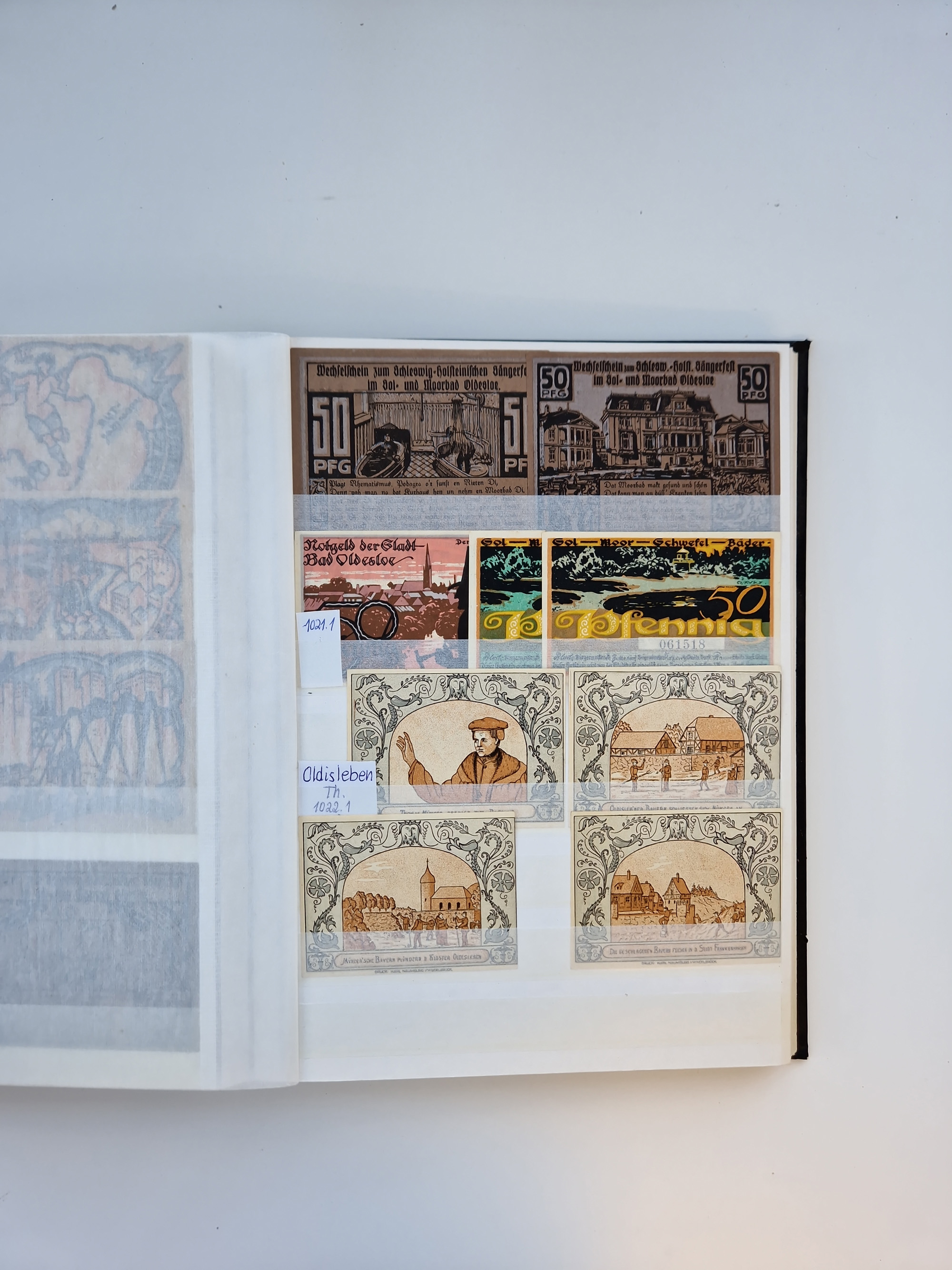 Notgeld-Serienscheine, saubere Sammlung in 16 meist dicken Steckalben, sauber nach Orten und Serien sortiert, überschlägig etwa 7/8000 Stück, dazu 4 Kataloge