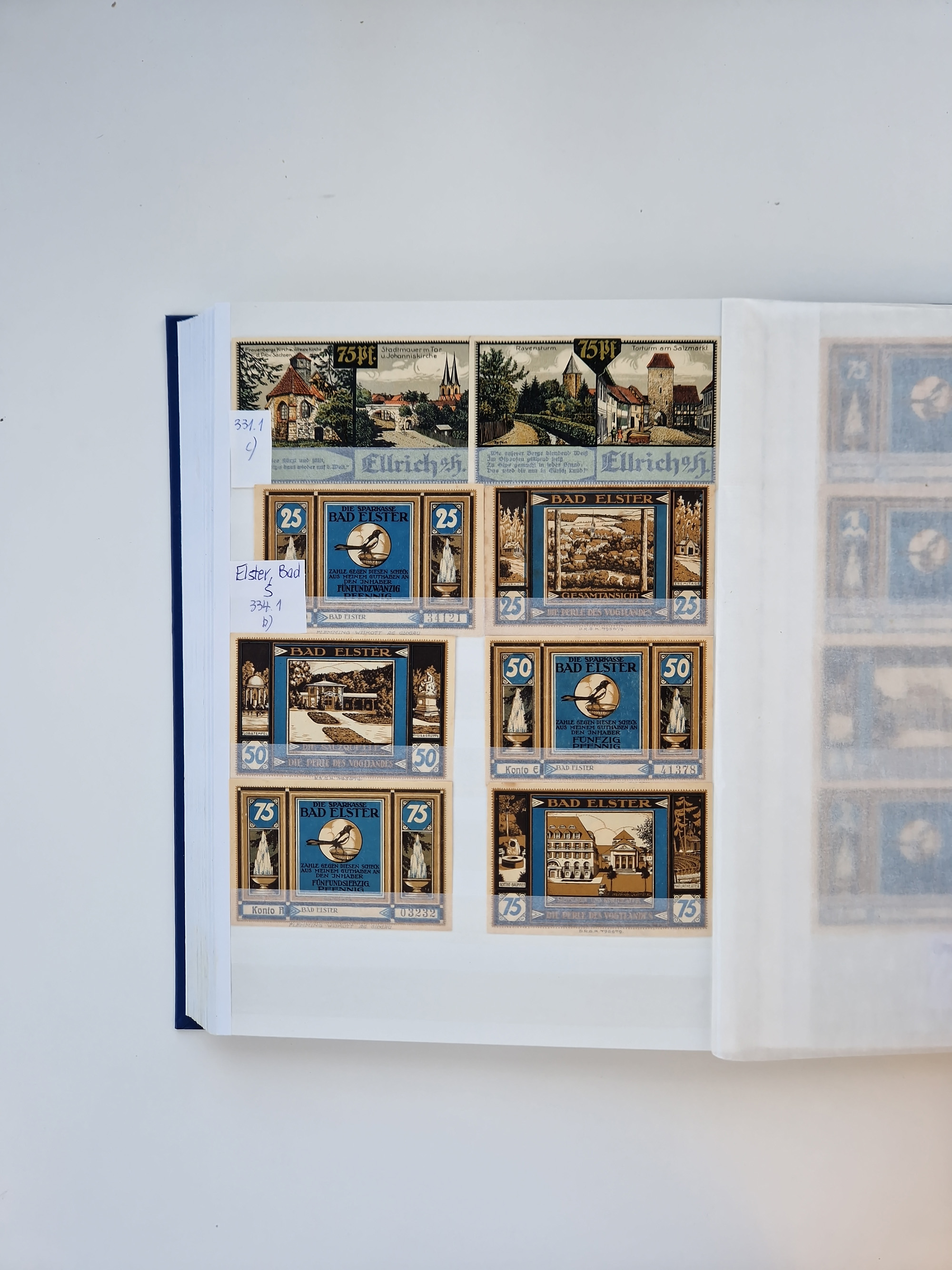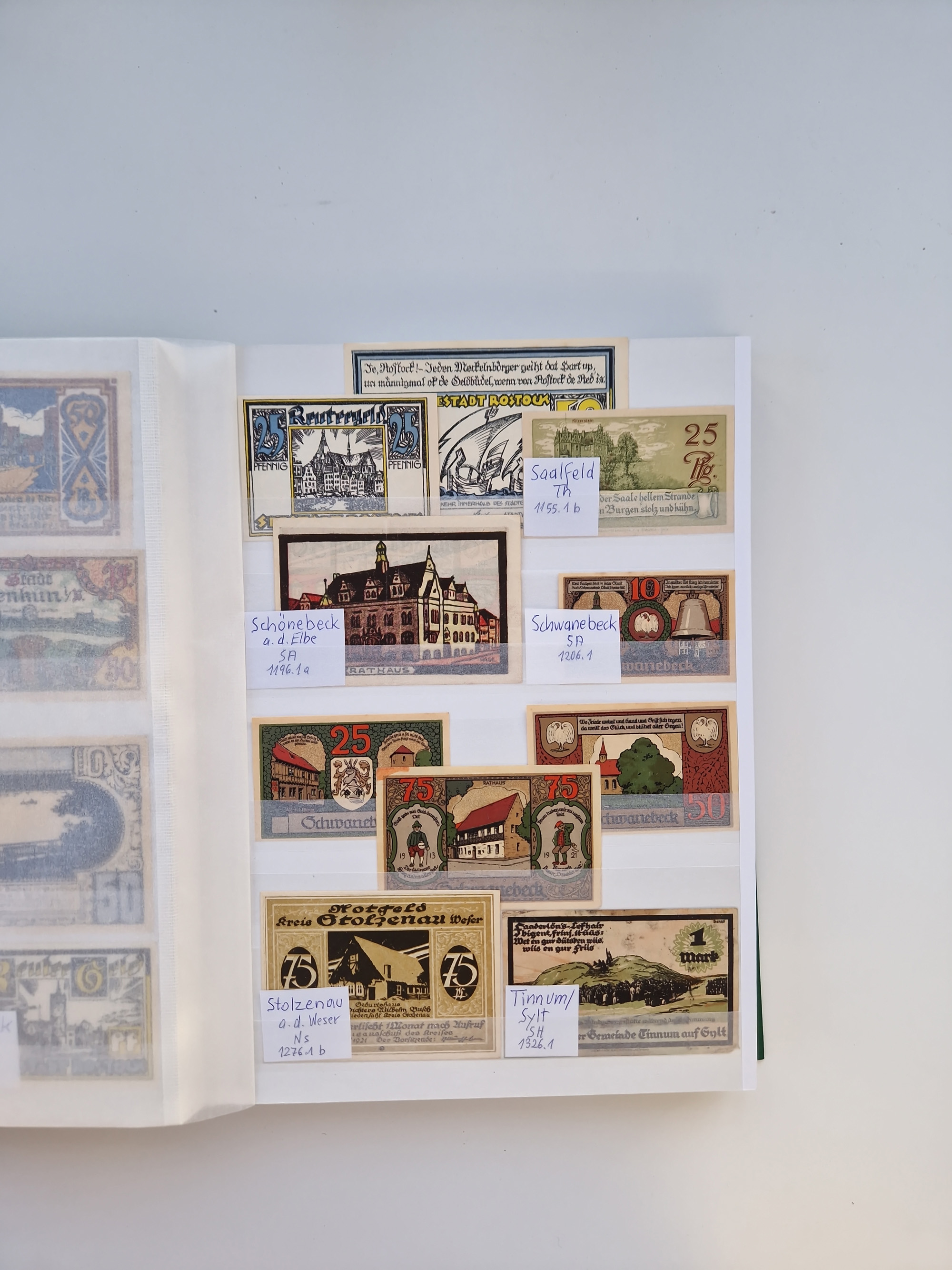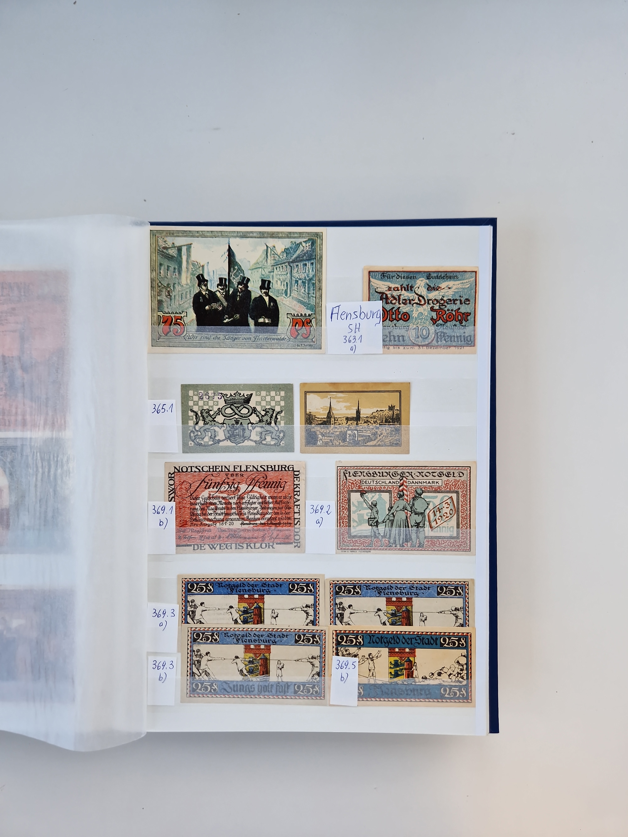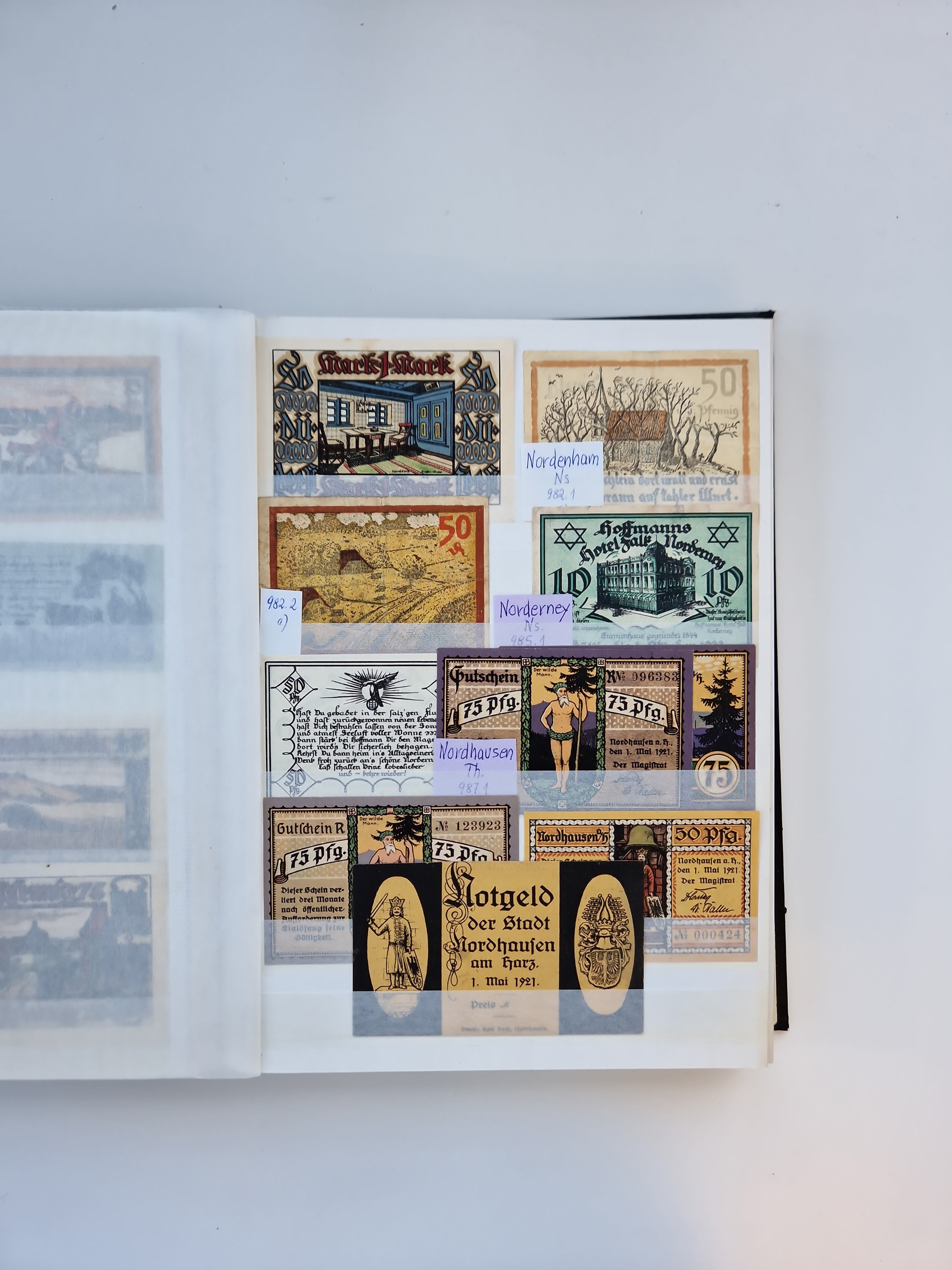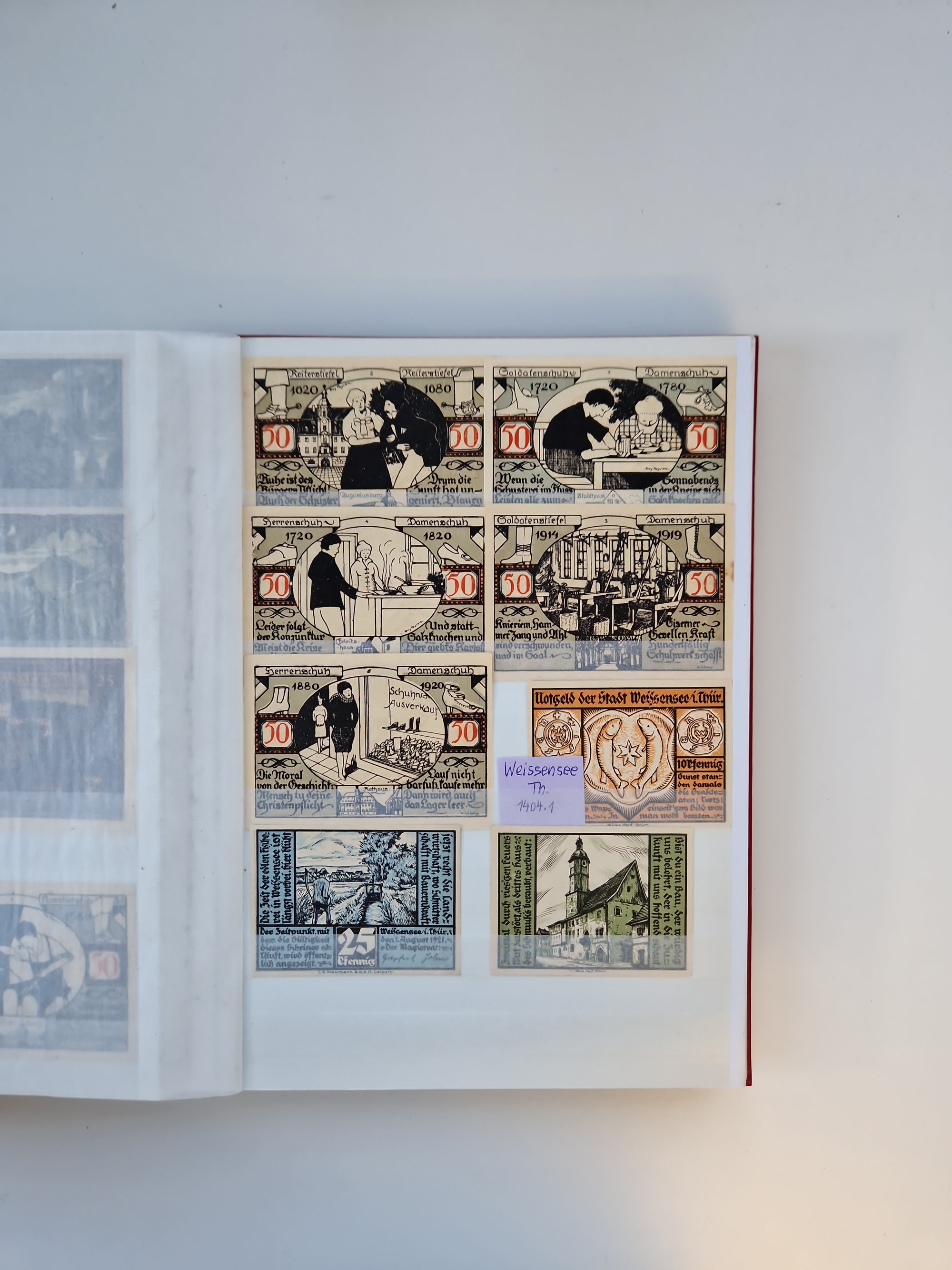 Notgeld-Serienscheine, saubere Sammlung in 16 meist dicken Steckalben, sauber nach Orten und Serien sortiert, überschlägig etwa 7/8000 Stück, dazu 4 Kataloge