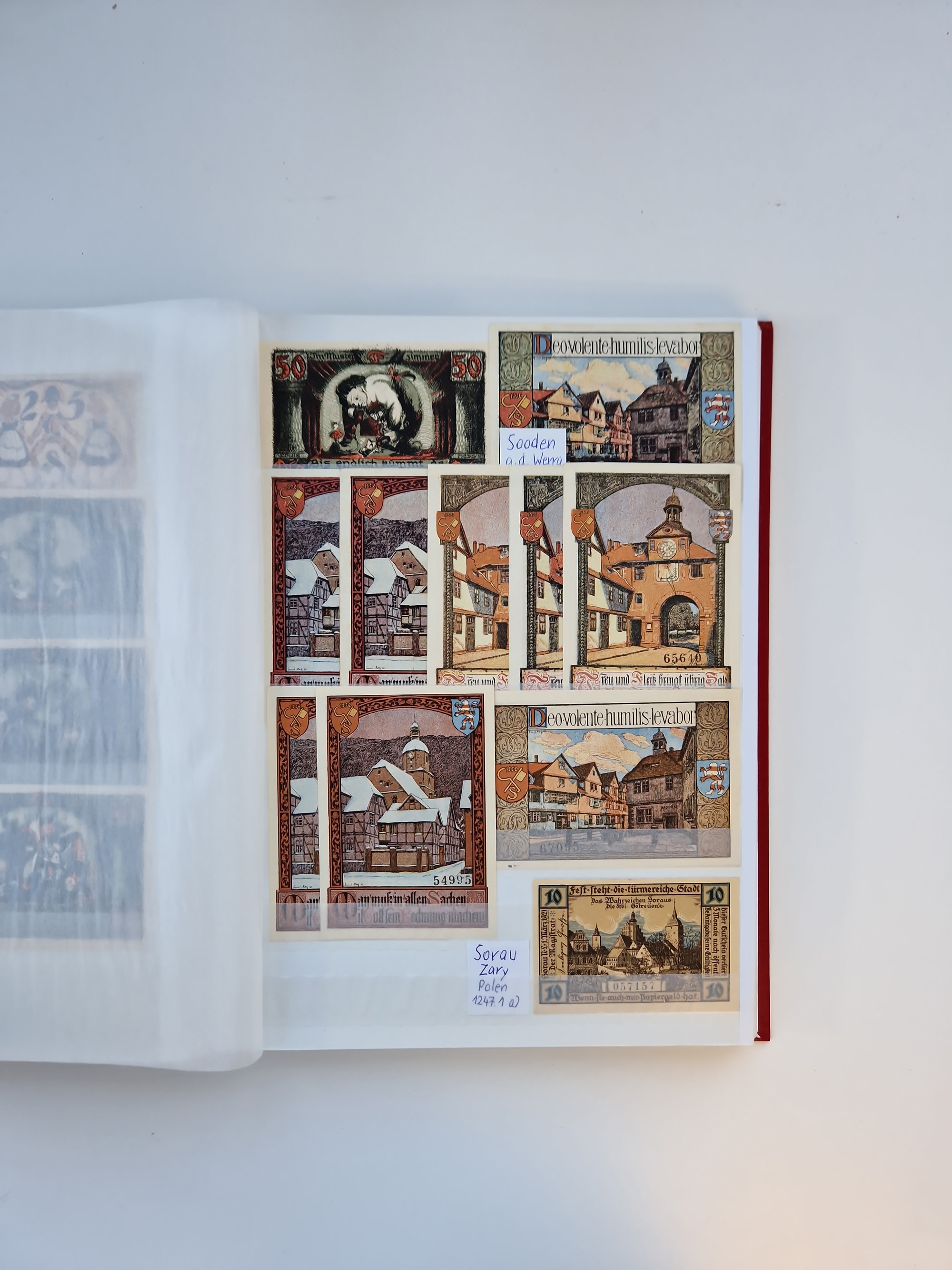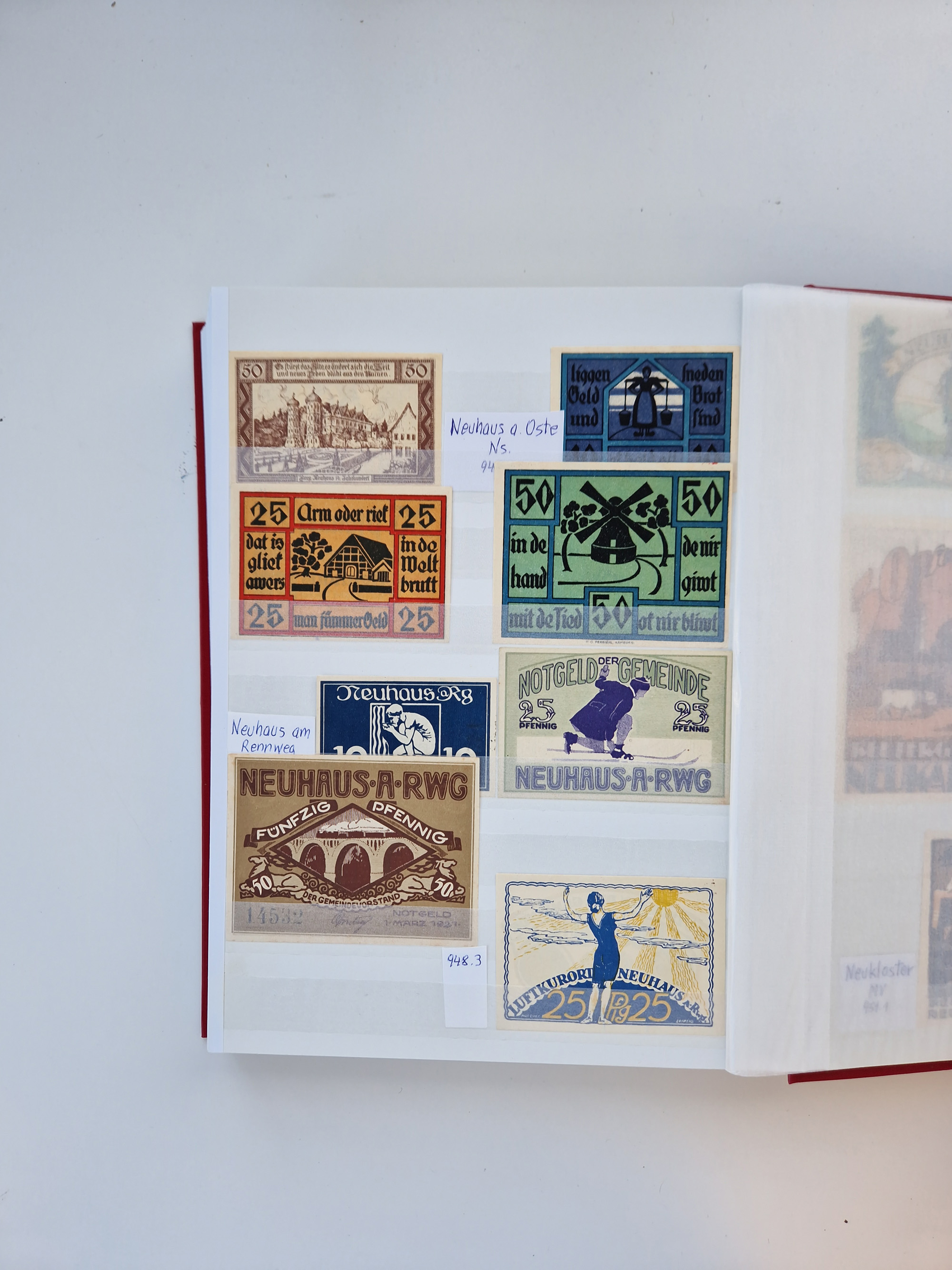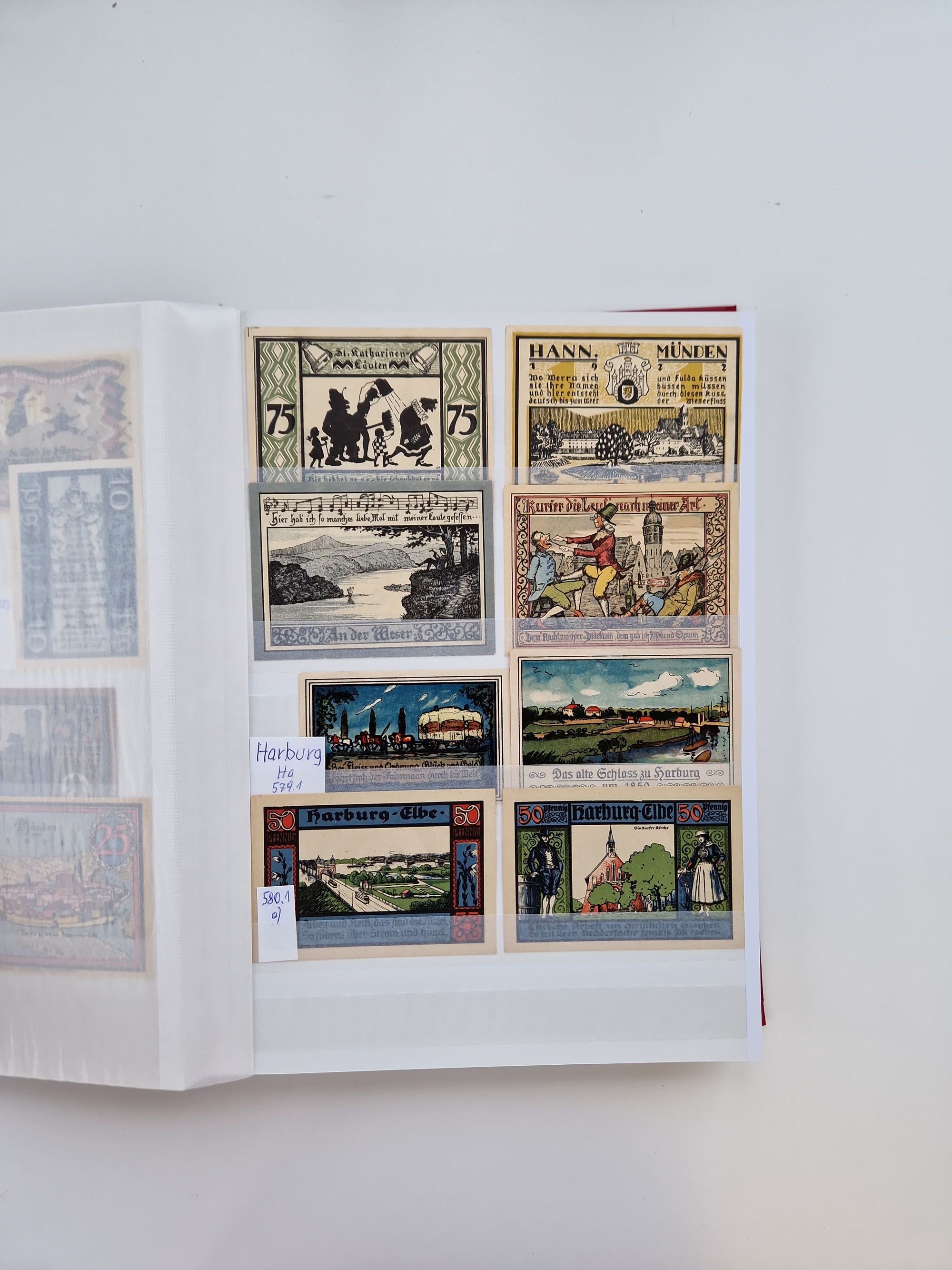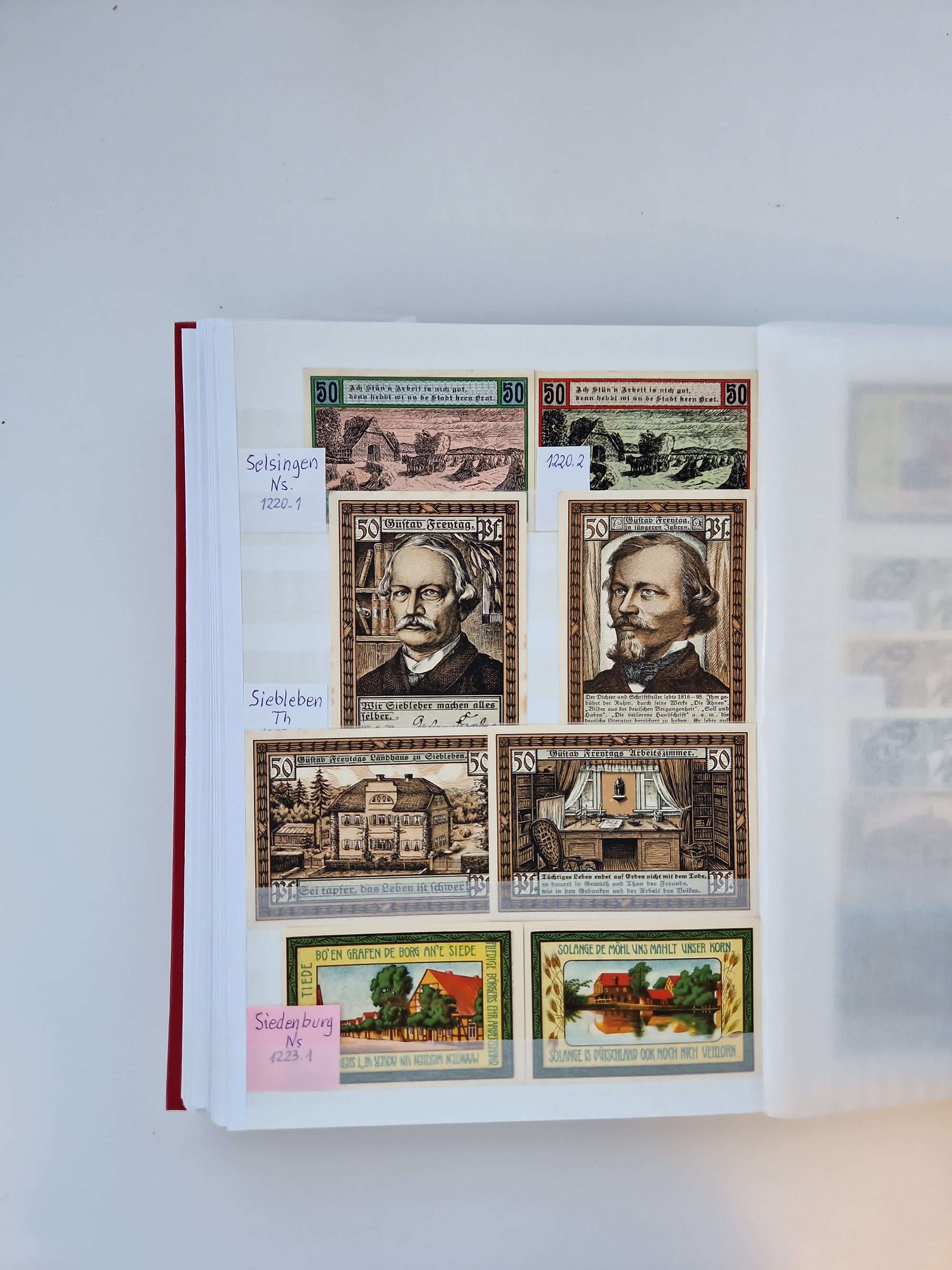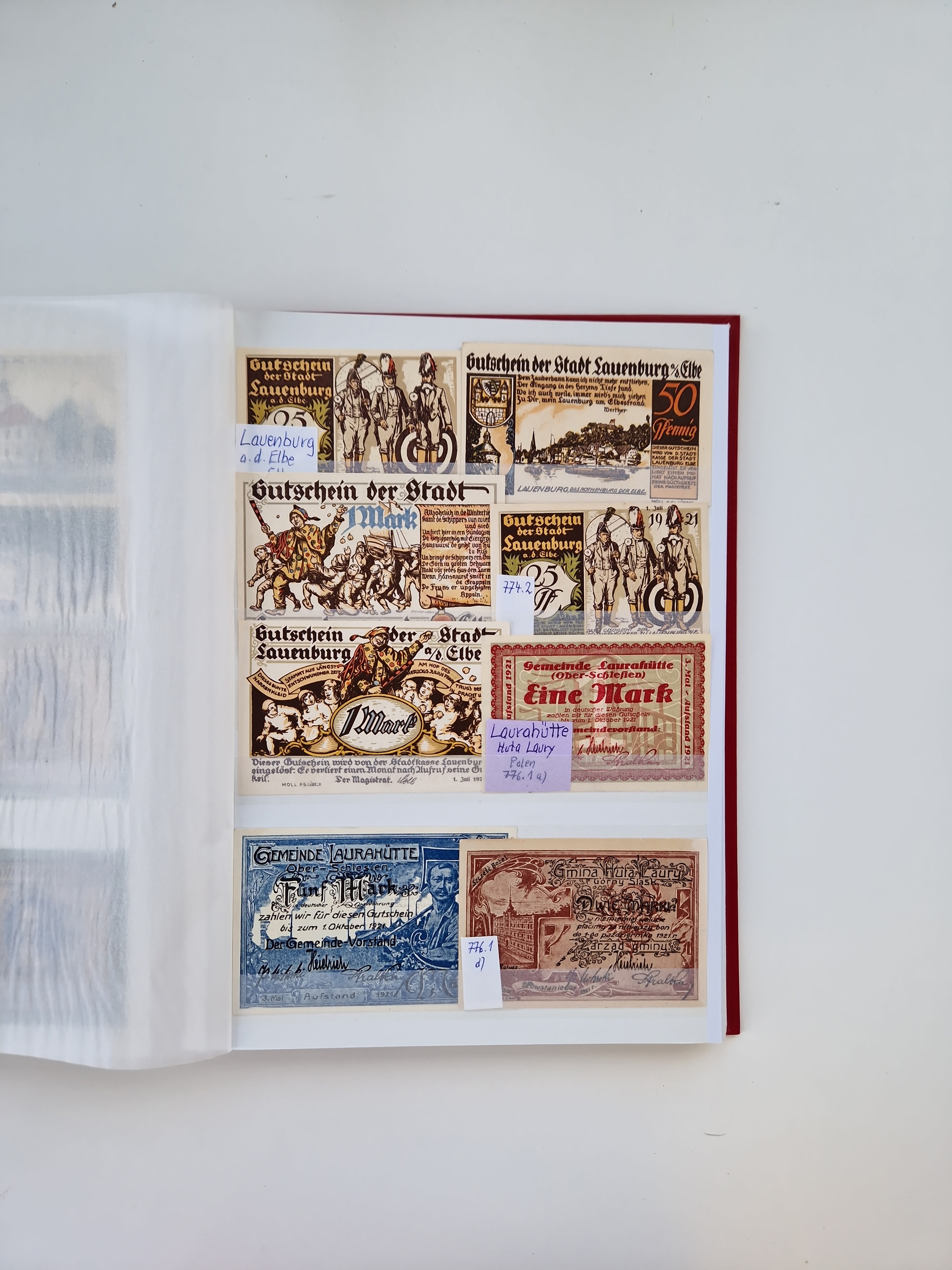 Notgeld-Serienscheine, saubere Sammlung in 16 meist dicken Steckalben, sauber nach Orten und Serien sortiert, überschlägig etwa 7/8000 Stück, dazu 4 Kataloge