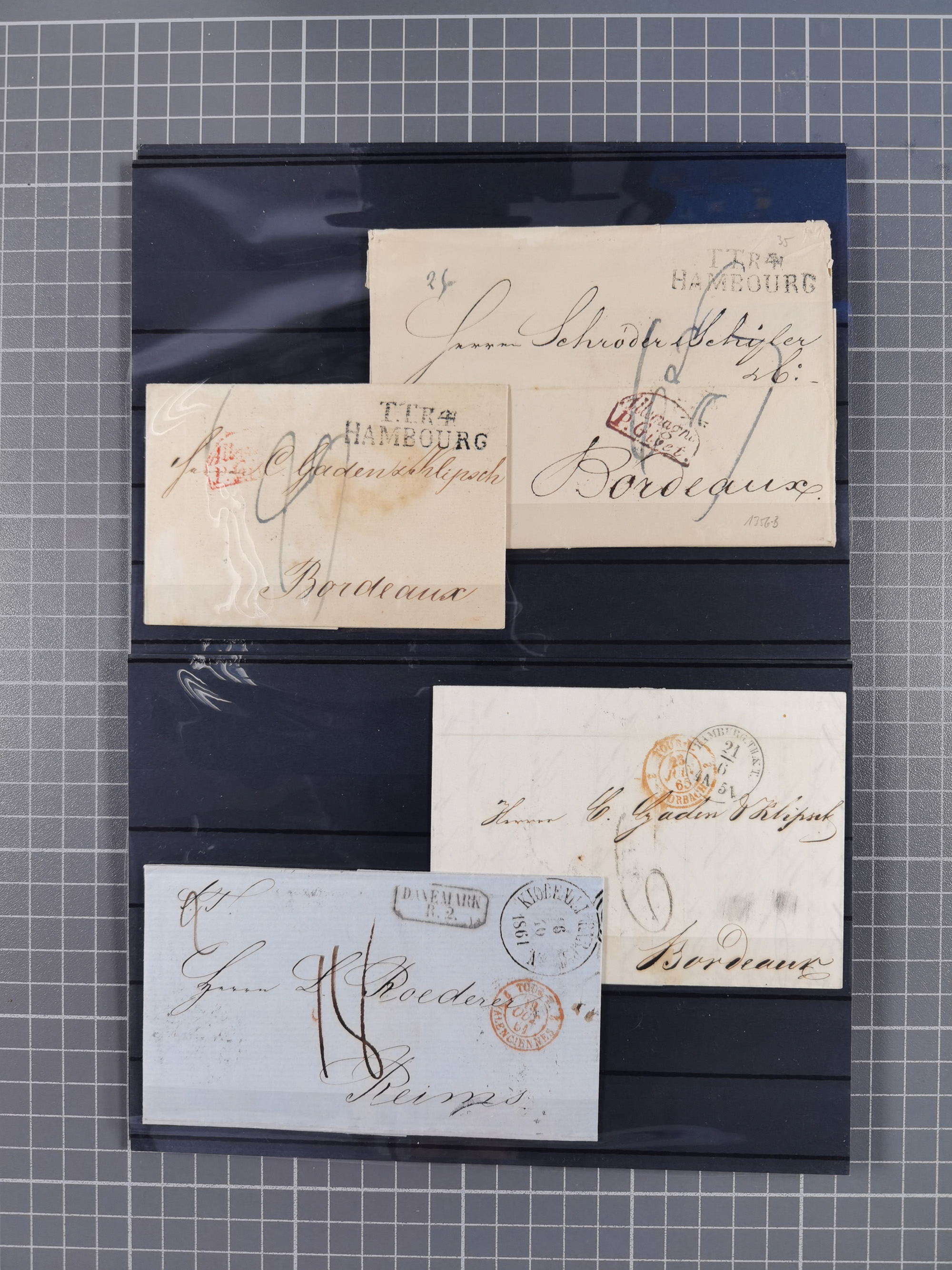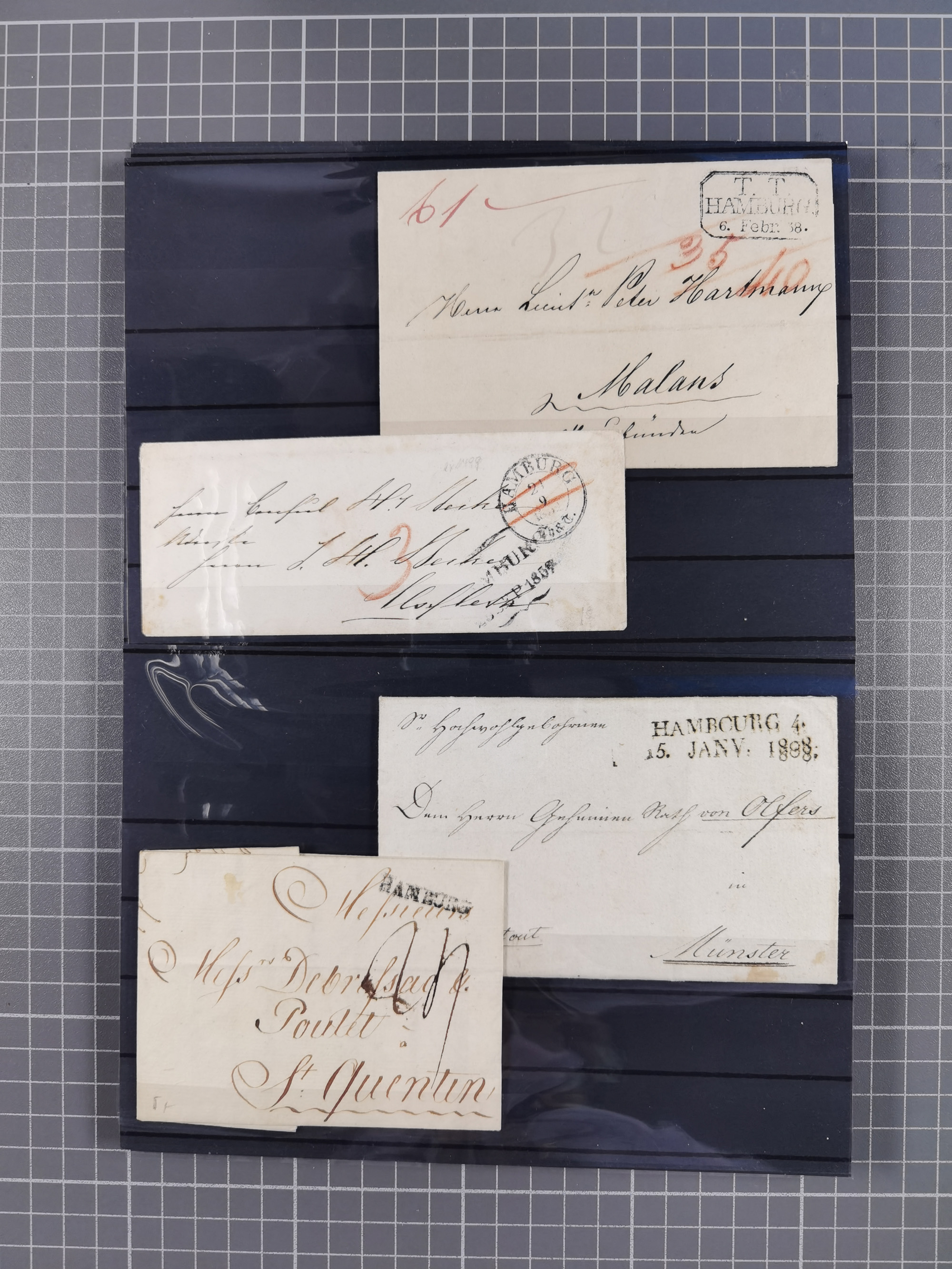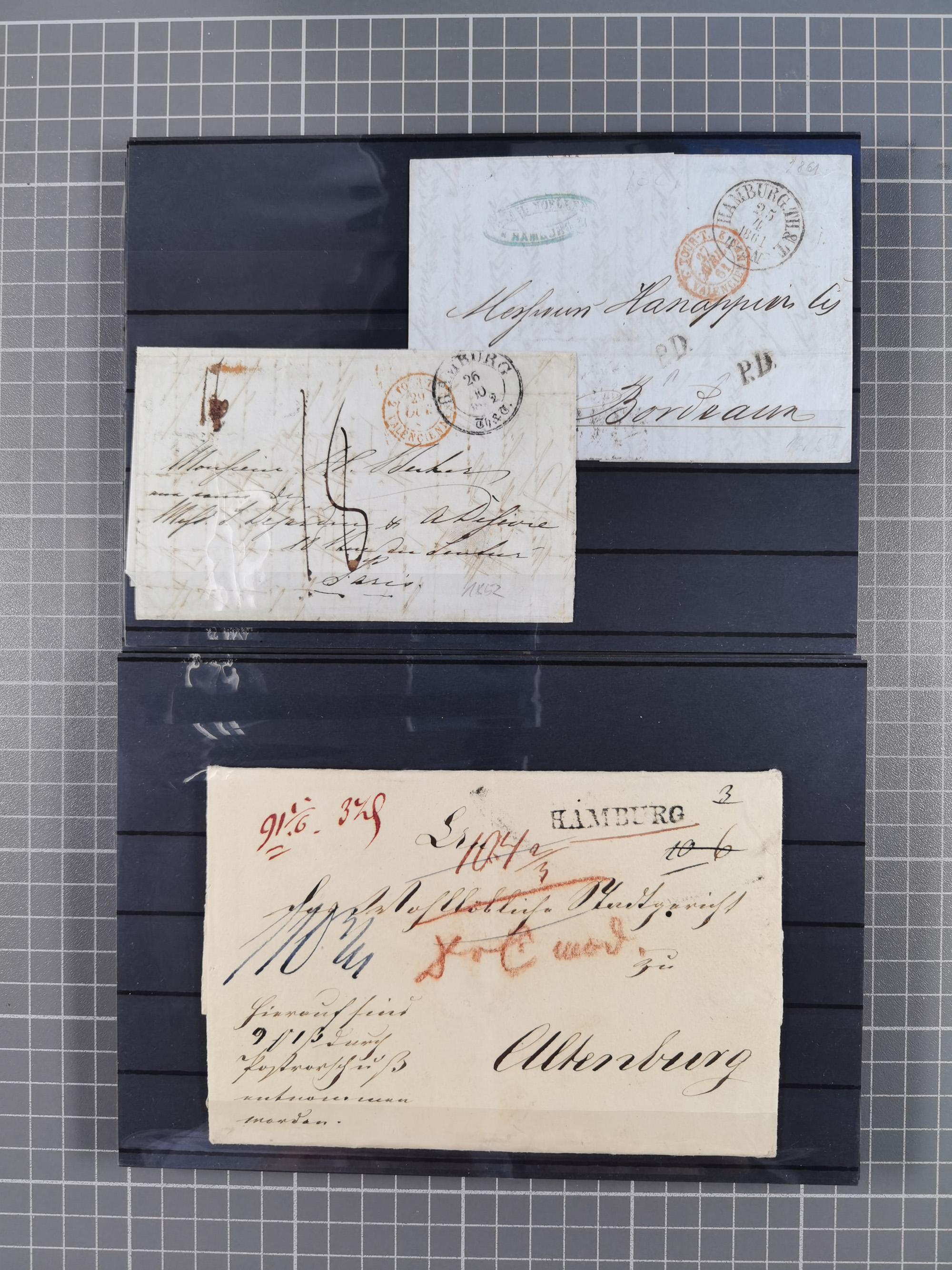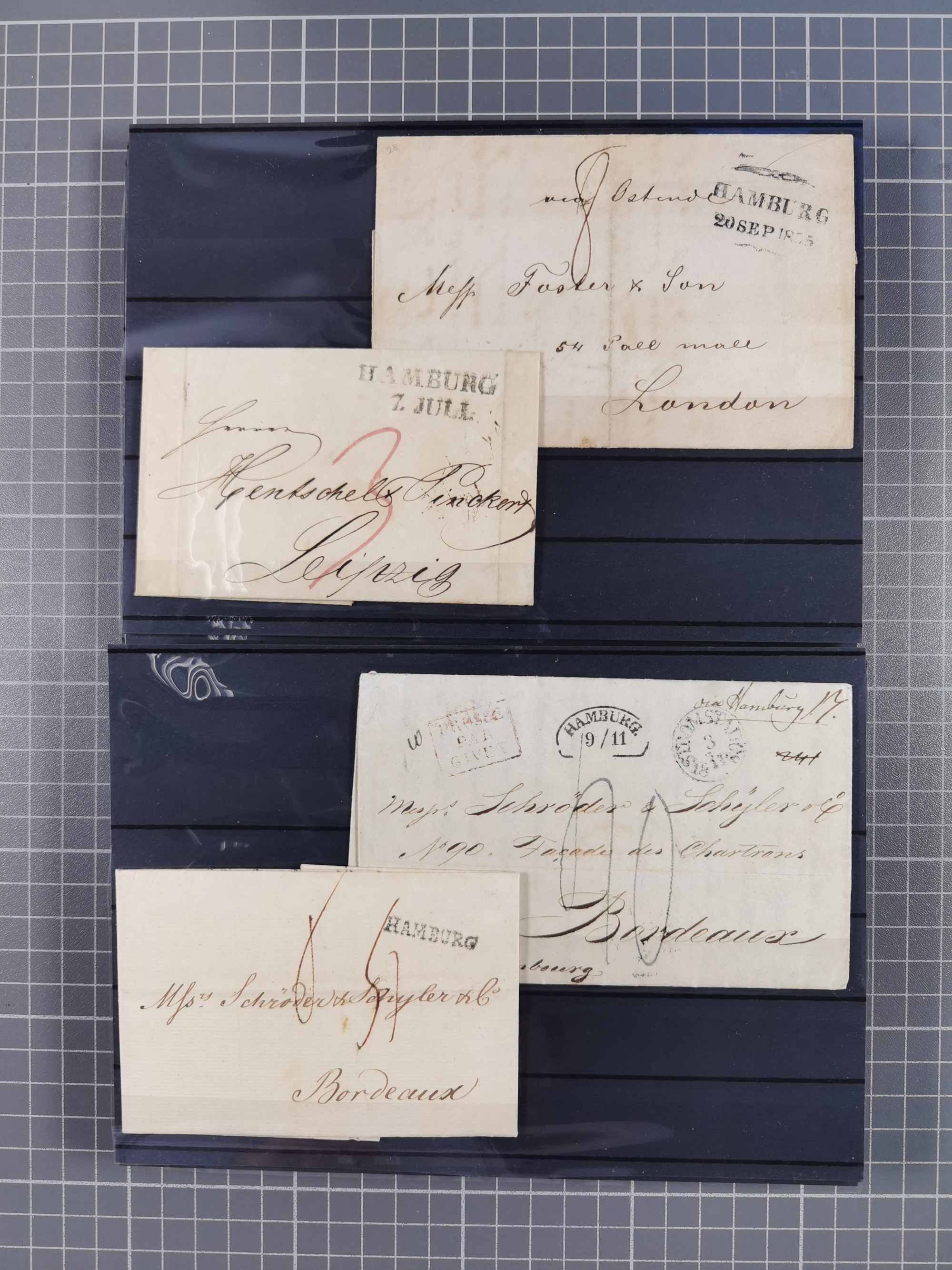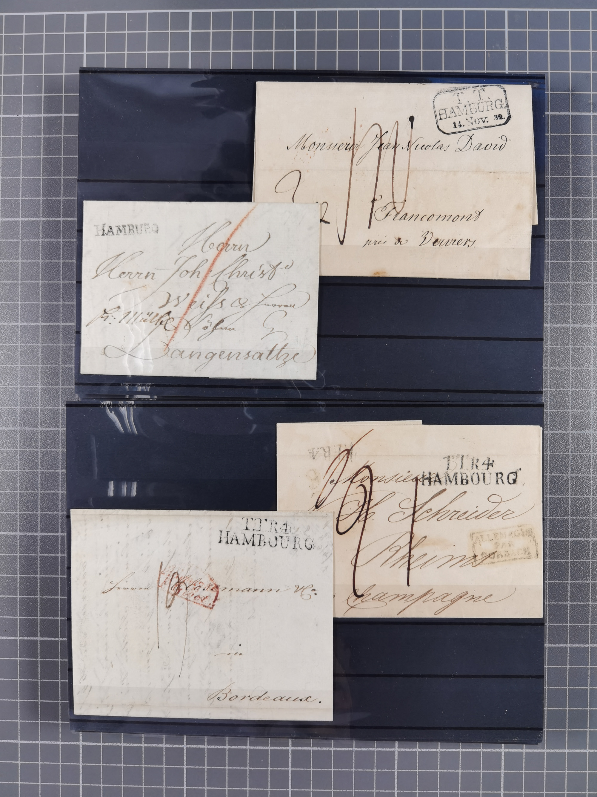 1785/1843 (ca.), kleine Partie mit 12 Vorphila-Briefe, dabei “128 HAMBURG” (x2), “T.T. HAMBURG 13 Dec.43.”, etc., meist in sehr guter Erhaltung