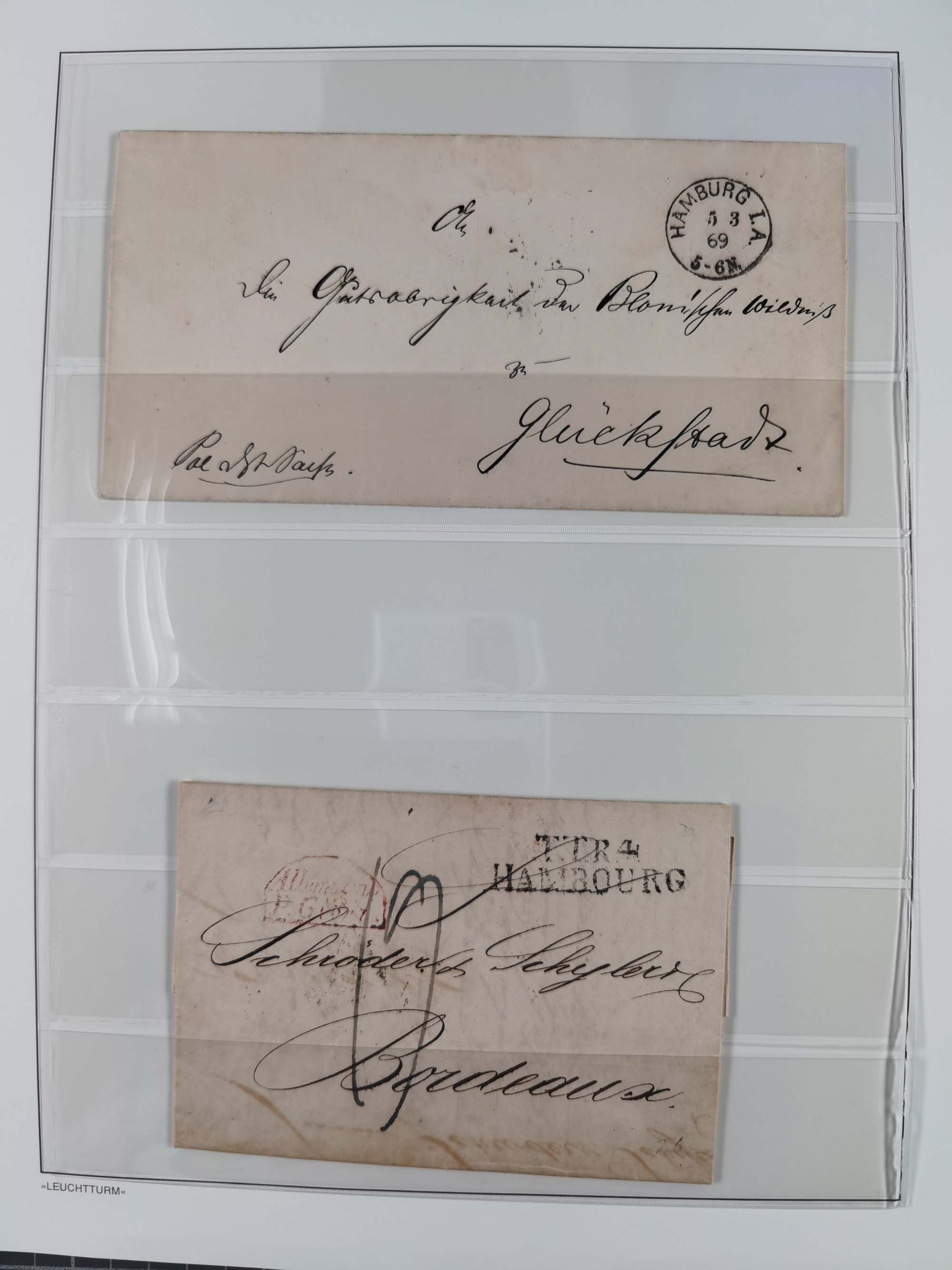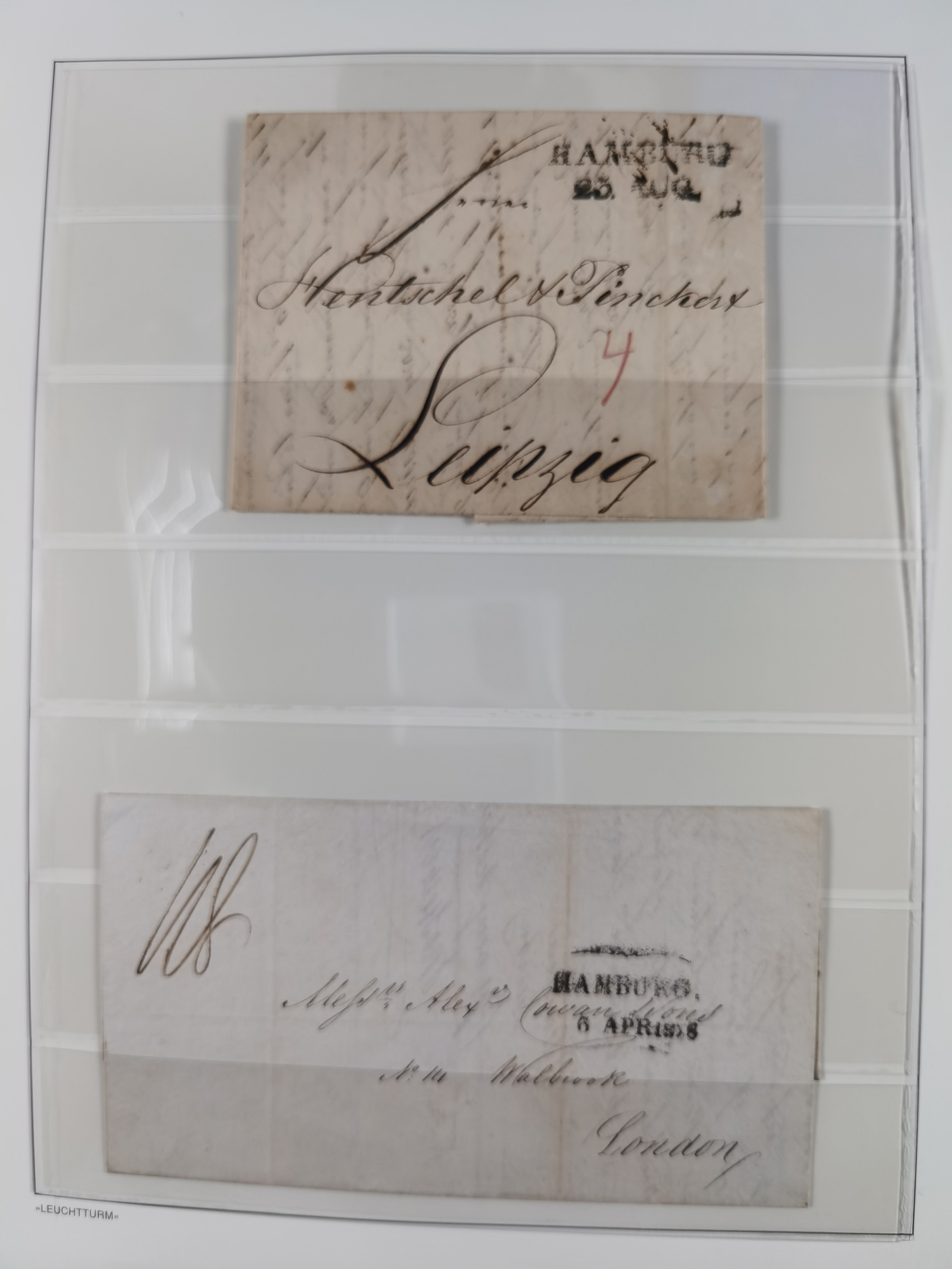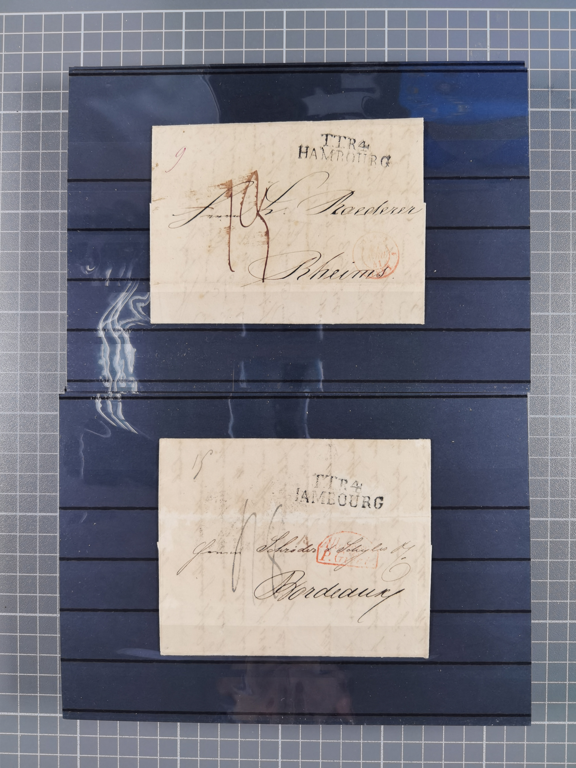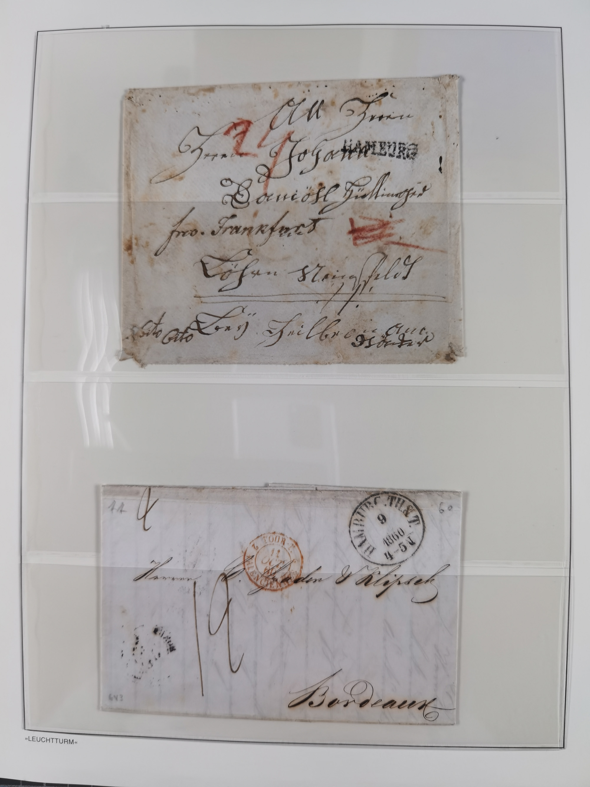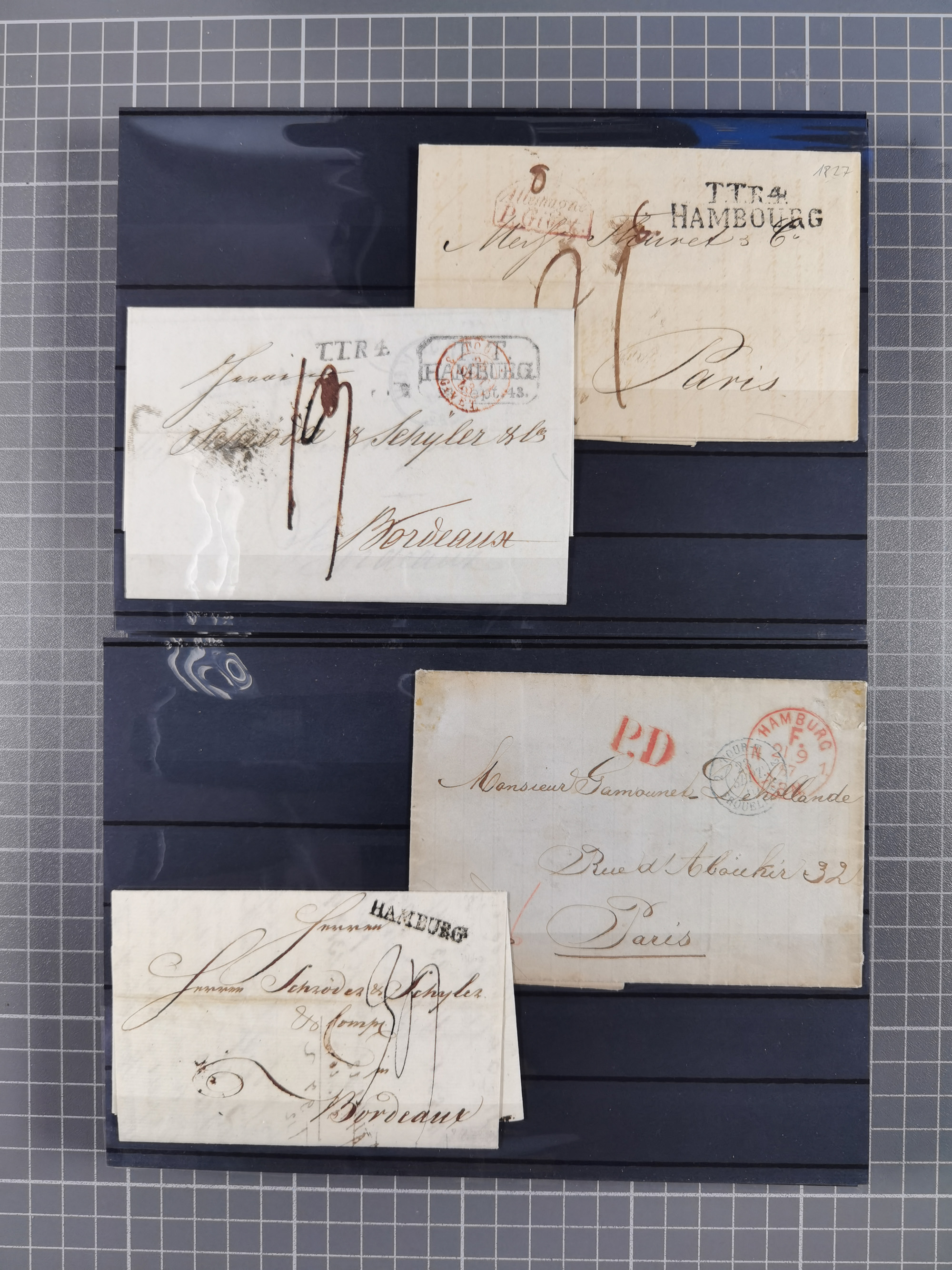 1785/1843 (ca.), kleine Partie mit 12 Vorphila-Briefe, dabei “128 HAMBURG” (x2), “T.T. HAMBURG 13 Dec.43.”, etc., meist in sehr guter Erhaltung