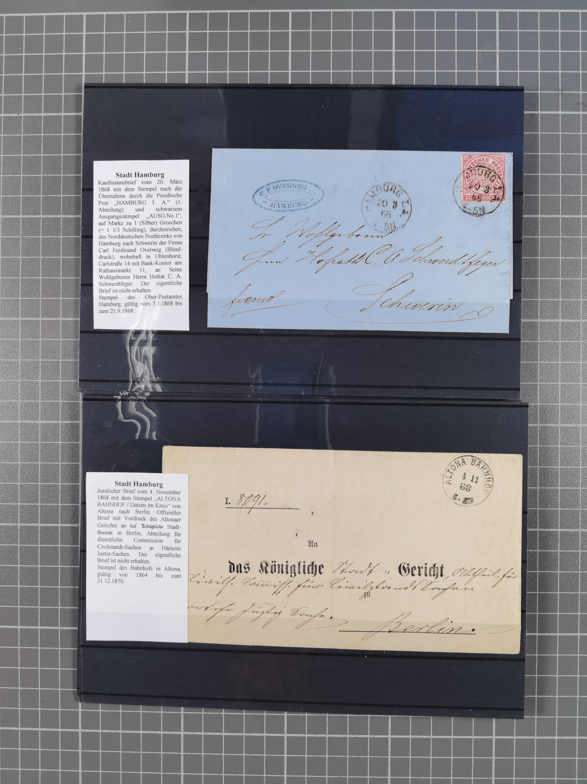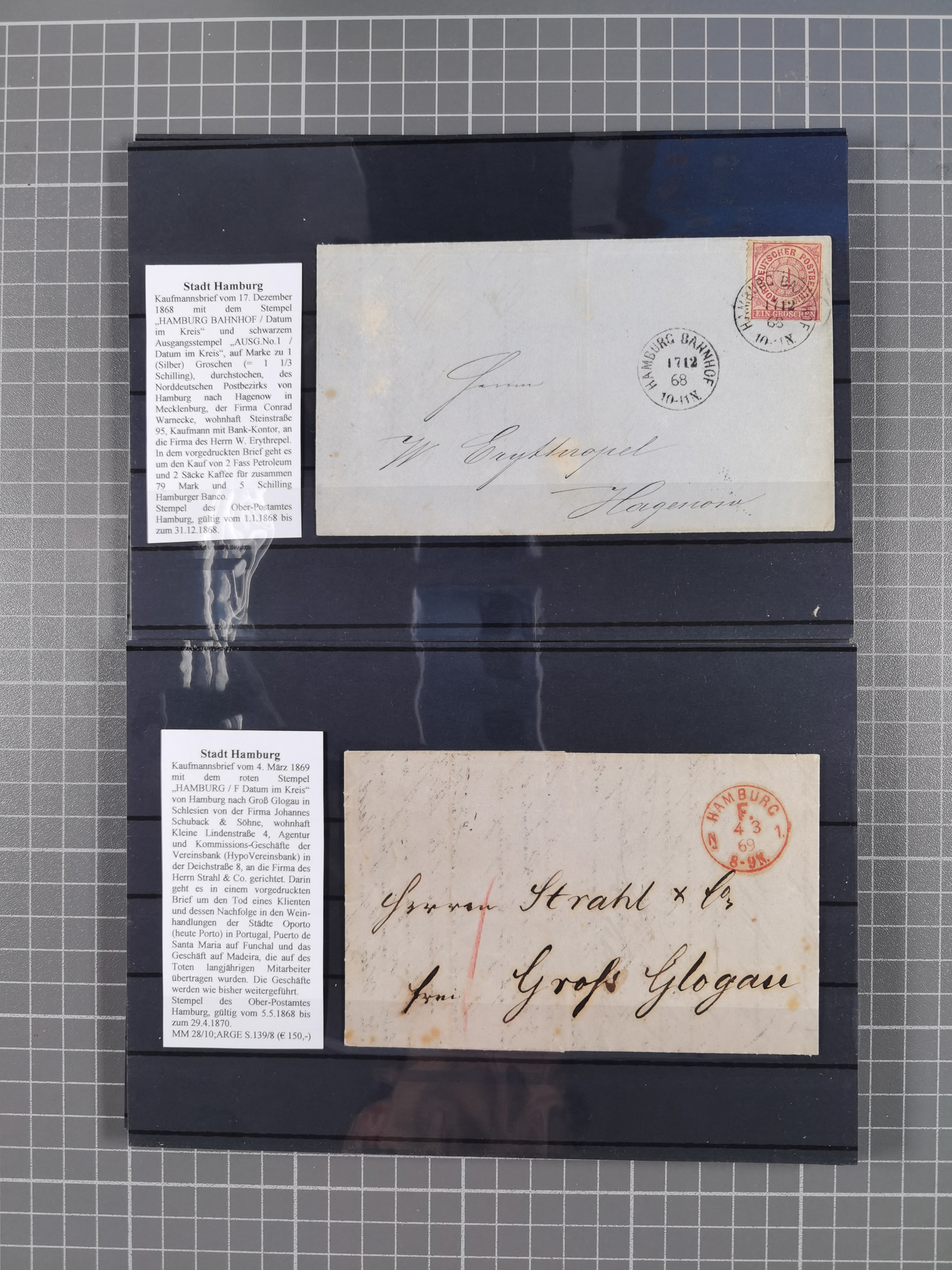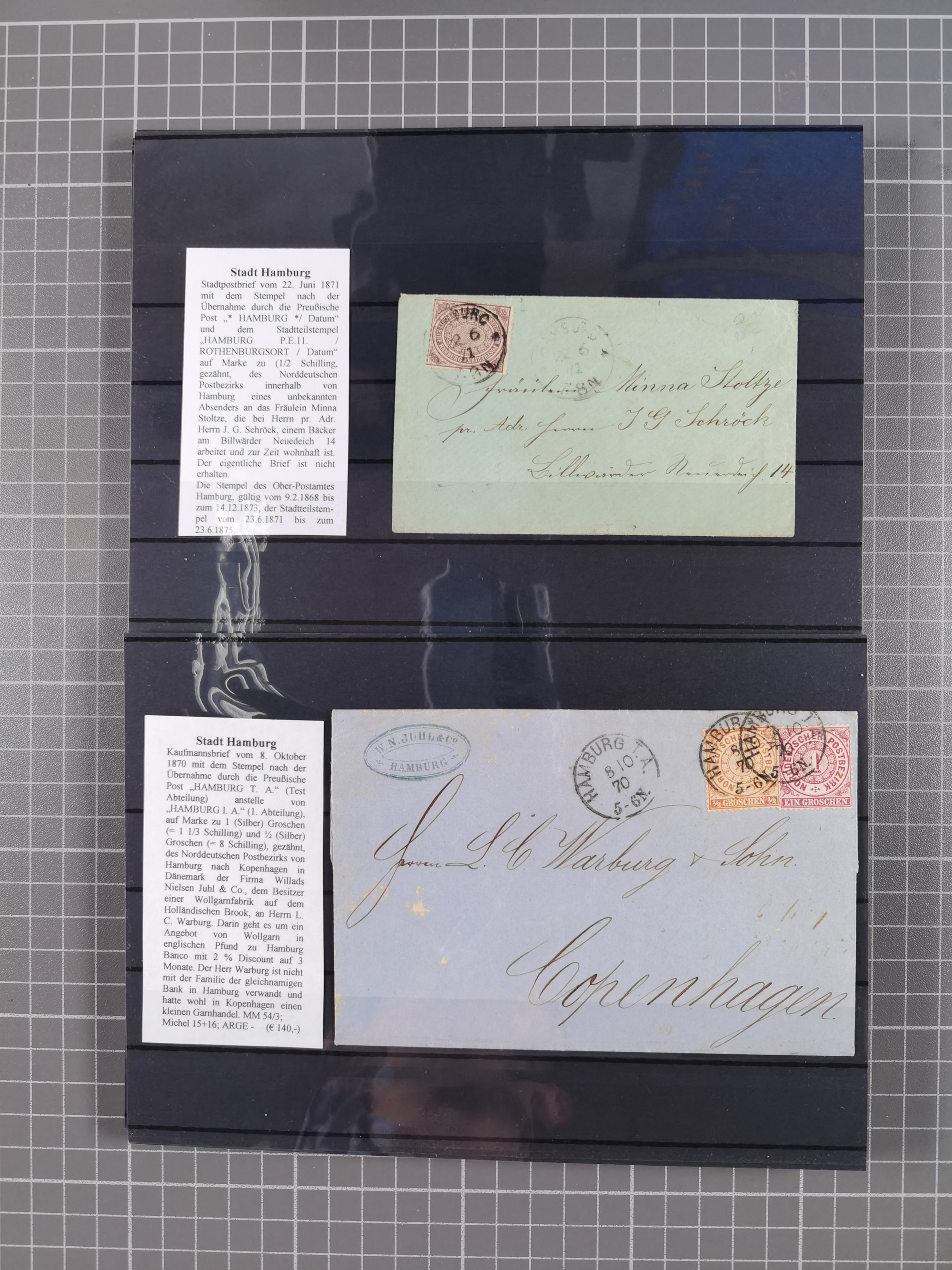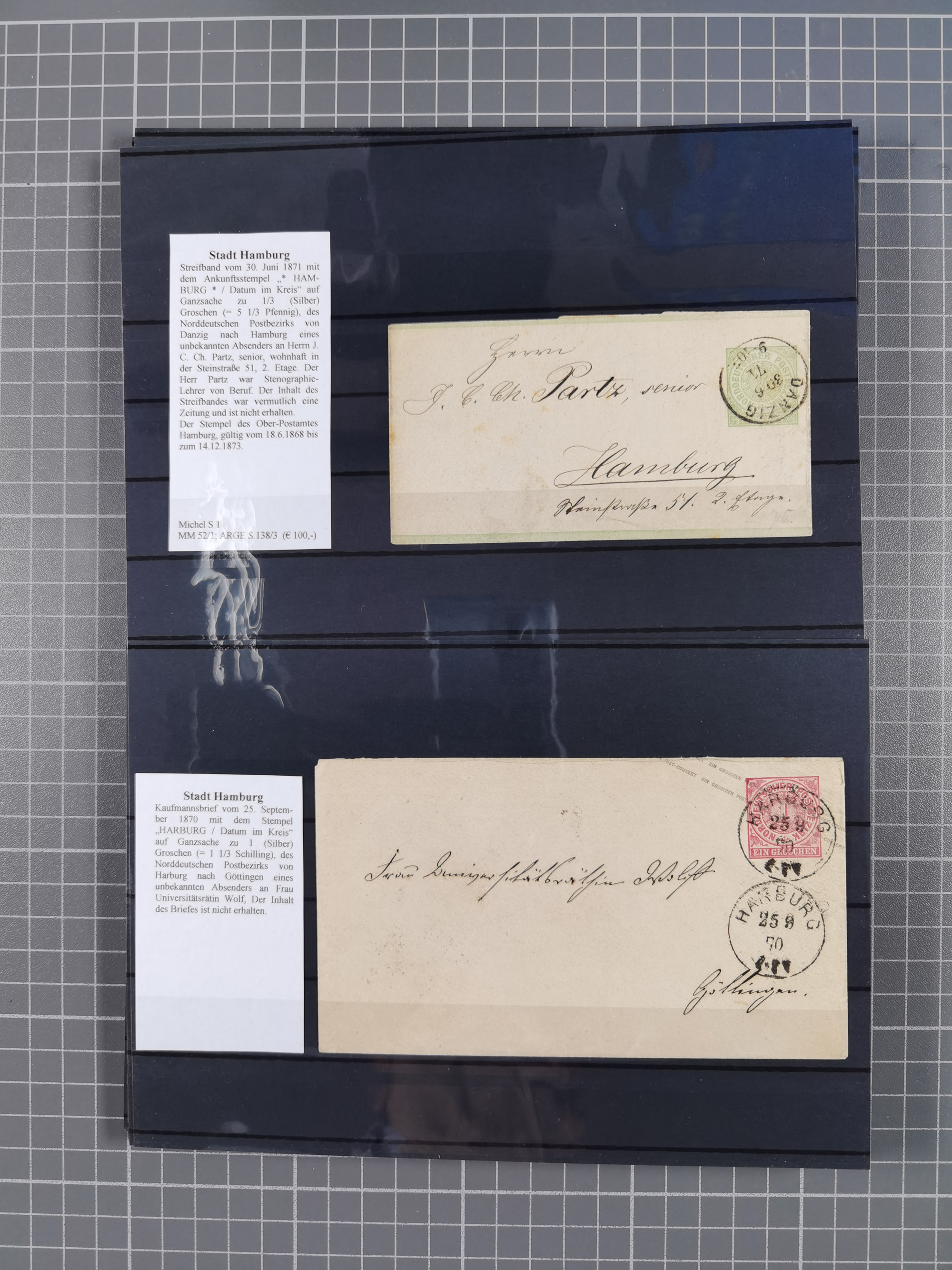 1867/79, ungebrauchte, wenig postfrische und gestempelte Sammlung, ab Mi.-Nr. 1I und 1II ungebraucht und gestempelt, Mi.-Nr. 2 mit verschiedenen Stempel inkl. blauem DKr. des Hamburger Stadtpostamtes, Mi.-Nr. 2 im Paar auf Briefstück, Mi.-Nr. 4 mit Kreisbogenstempel und L1 , Mi.-Nr. 6-7 diverse Auflagen/Farben ungebraucht und gestempelt, Mi.-Nr. 8F im ungebrauchten Viererblock, die nachfolgenden Ausgaben mit vielen guten Werten, teils in Einheiten, Mi.-Nr. 17-18 mit verschiedenen Auflagen ungebraucht und gestempelt, Mi.-Nr. 19B, außerdem ein guter Teil Ganzsachen, alles sauber aufgezogen und beschrieben, dabei die Falschstempel sowie diverse Neu- und Nachdrucke kompetent beschrieben, teils sign., üblich unterschiedliche Erhaltung