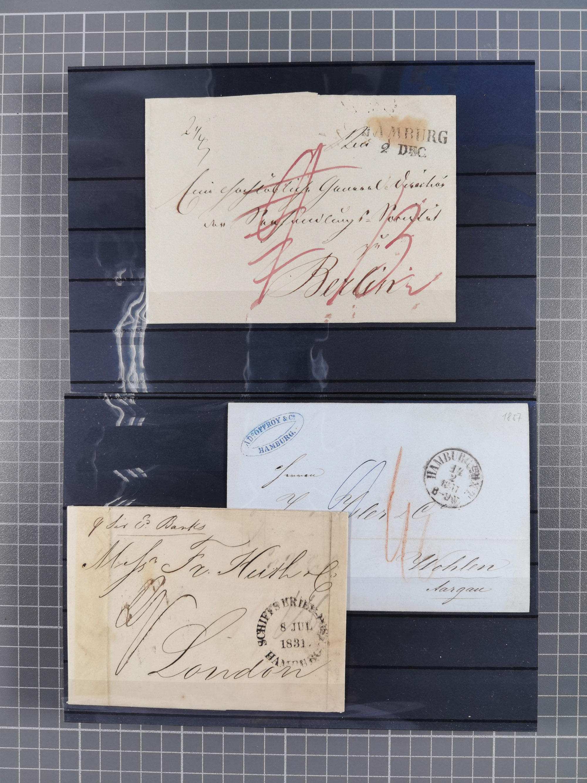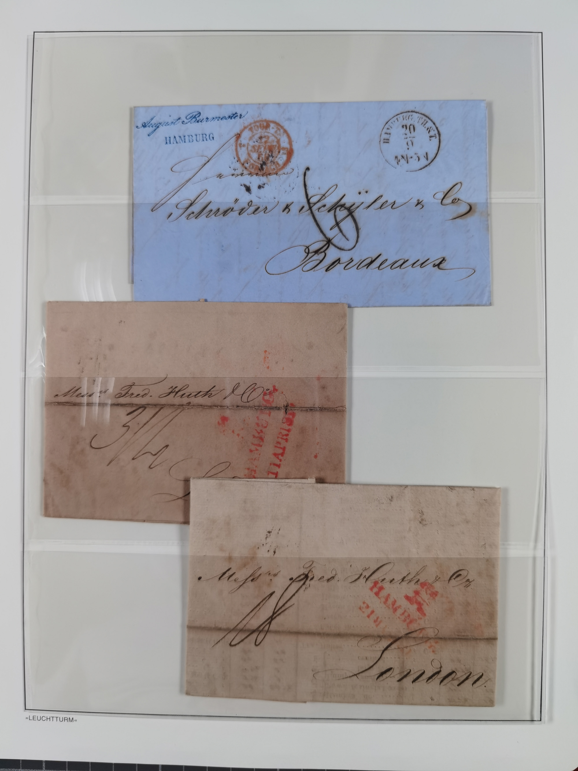 1751/1853, 3 Vorphila-Briefe: L1 "HAMBOURG" auf frühem Brief, Roter Fußpoststempel auf Brief von Bremen nach Altona und Brief mit Stempel der Bahnhofs-Expedition, 1853.