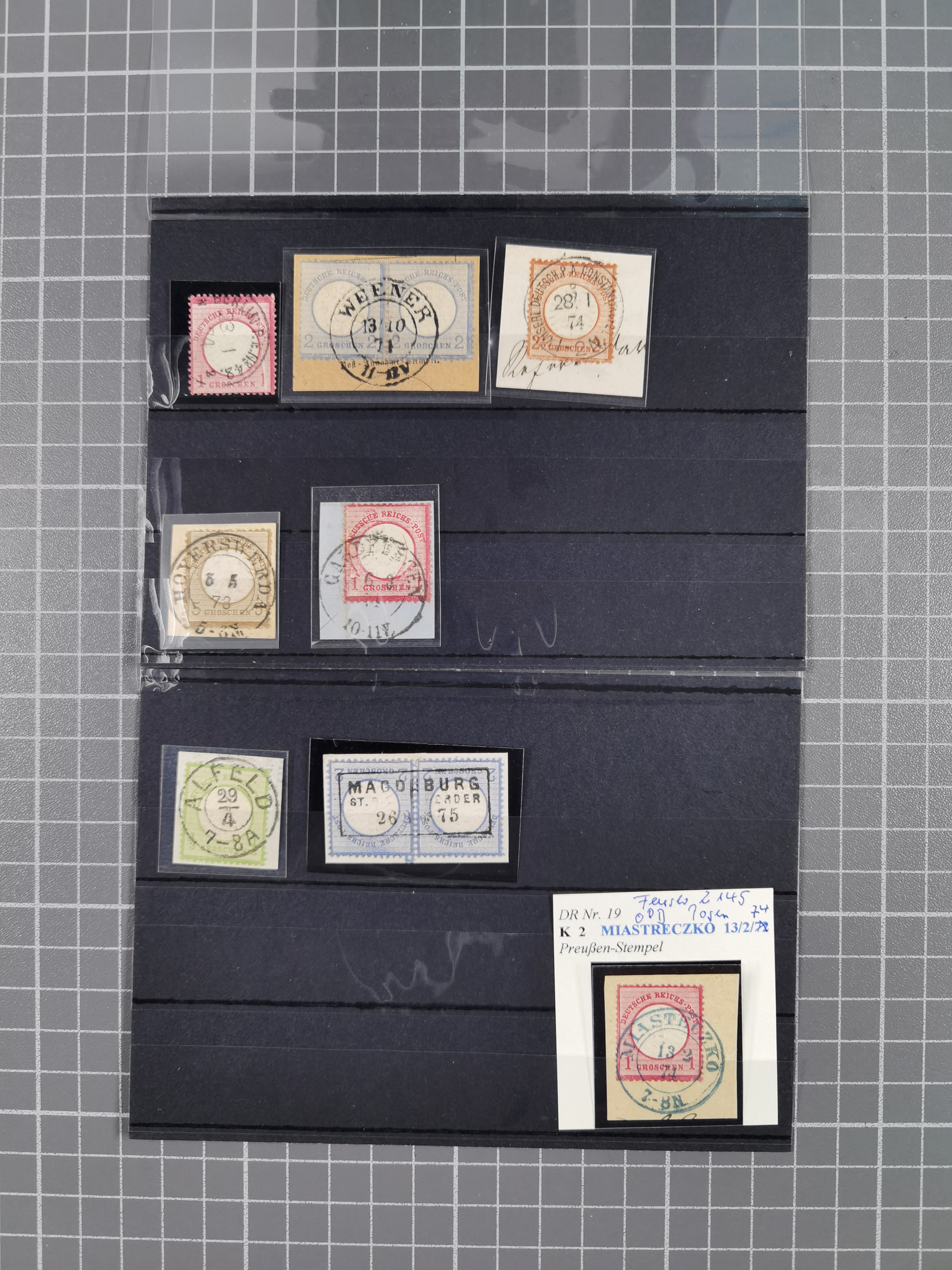 1872/74, 17 ausgesuchte Marken mit klaren Stempeln inkl. Bahnpost oder anderen Besonderheiten, meist auf Briefstücken mit u.a. Mi.-Nr. 19 mit blauem DKr. “MIASTECZKO” auf Briefstück (FB Sommer BPP) und Mi.-Nr. 18 mit EKr. “BEDENBOSTEL” auf Briefstück. Dazu u.a. V21 mit klarem EKr. “KAISERL. DEUTSCH. P.A. CONSTANTINOPEL” auf Briefstück, Mi.-Nr. 20 im Paar auf Postanweisungs-Briefstück (Postschule), Mi.-Nr. 19 mit leichter Papierfalte (FB Krug BPP) und Mi.-Nr. 6 mit rauer Zähnung auf Briefstück (KB Sommer BPP), durchgehend in guter Erhaltung