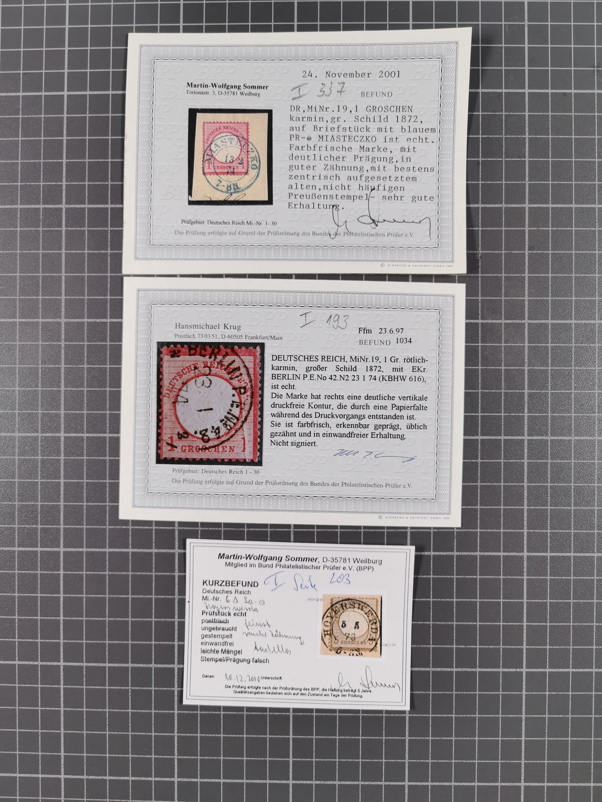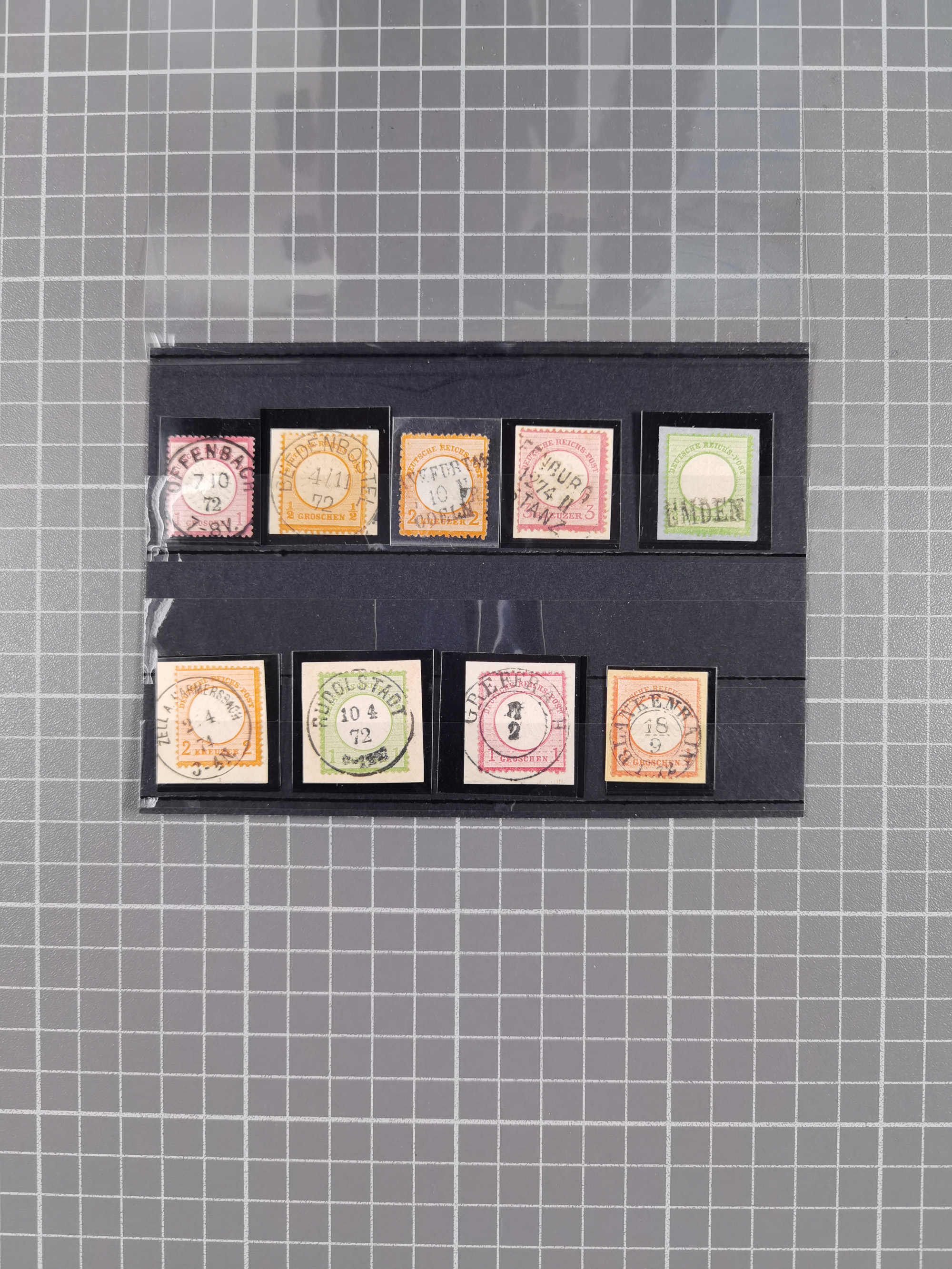 1872/74, Partie mit praktisch nur klaren, oft zentrischen “Stempel-Schönheiten” auf 28 losen Marken und Briefstücken sowie einen Brief mit 1 Gr. karmin und klarem EKr. “HOHENLEUBEN 6.8.” (sign. Sommer BPP), dabei u.a. Mi.-Nr. 8 mit DKr. “SCHILTACH 2.MRZ.” auf Briefstück, Mi.-Nr. 15 mit EKr. “DIEBURG 1.11” auf Briefstück, Mi.-Nr. 16 mit DKr. “BRAUNSCHWEIG “26,JUNI.1874” auf Briefstück und Mi.-Nr. 20 mit EKr. ”MÜNCHENERBERNDORF 19.1.1873" auf Briefstück. Fast nur ausgesuchte Marken in guter Erhaltung, zum Teil signiert bzw. mit einem KB