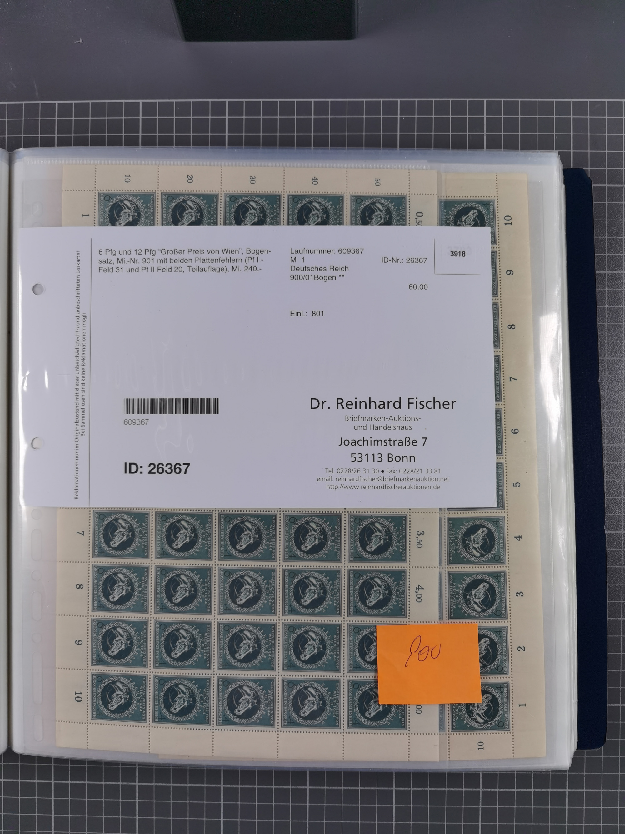 1900/23, reichhaltige und umfangreiche Bogensammlung in 9 Alben, vielfach spezialisiert nach Plattennummern, Farben und Typen, dabei u.a. Mi. 115d, 116II, 118a + b, 152P+W, 154-57, 178, 194c, 199b, 203b, 208z, 213b, 238z, 246c, 248b + c, 258-60, 309AY, 319Ab, 325Wb, etc. etc., vieles signiert. Teils übliche kleine Randmängel und einige gefaltet, aber insgesamt sehr saubere und sicherlich überdurchschnittliche Erhaltung. Ein ganz außergewöhnliches Objekt.