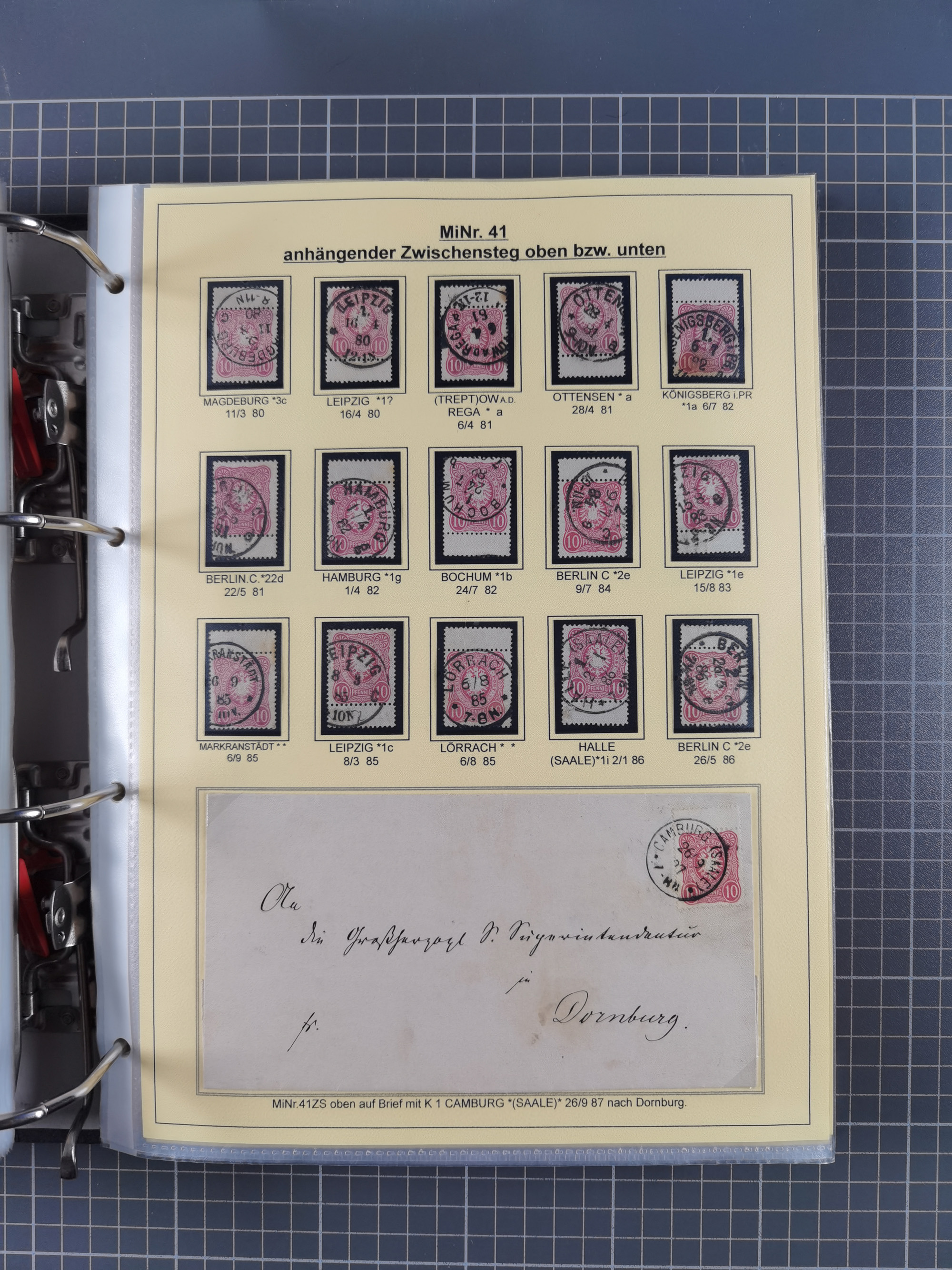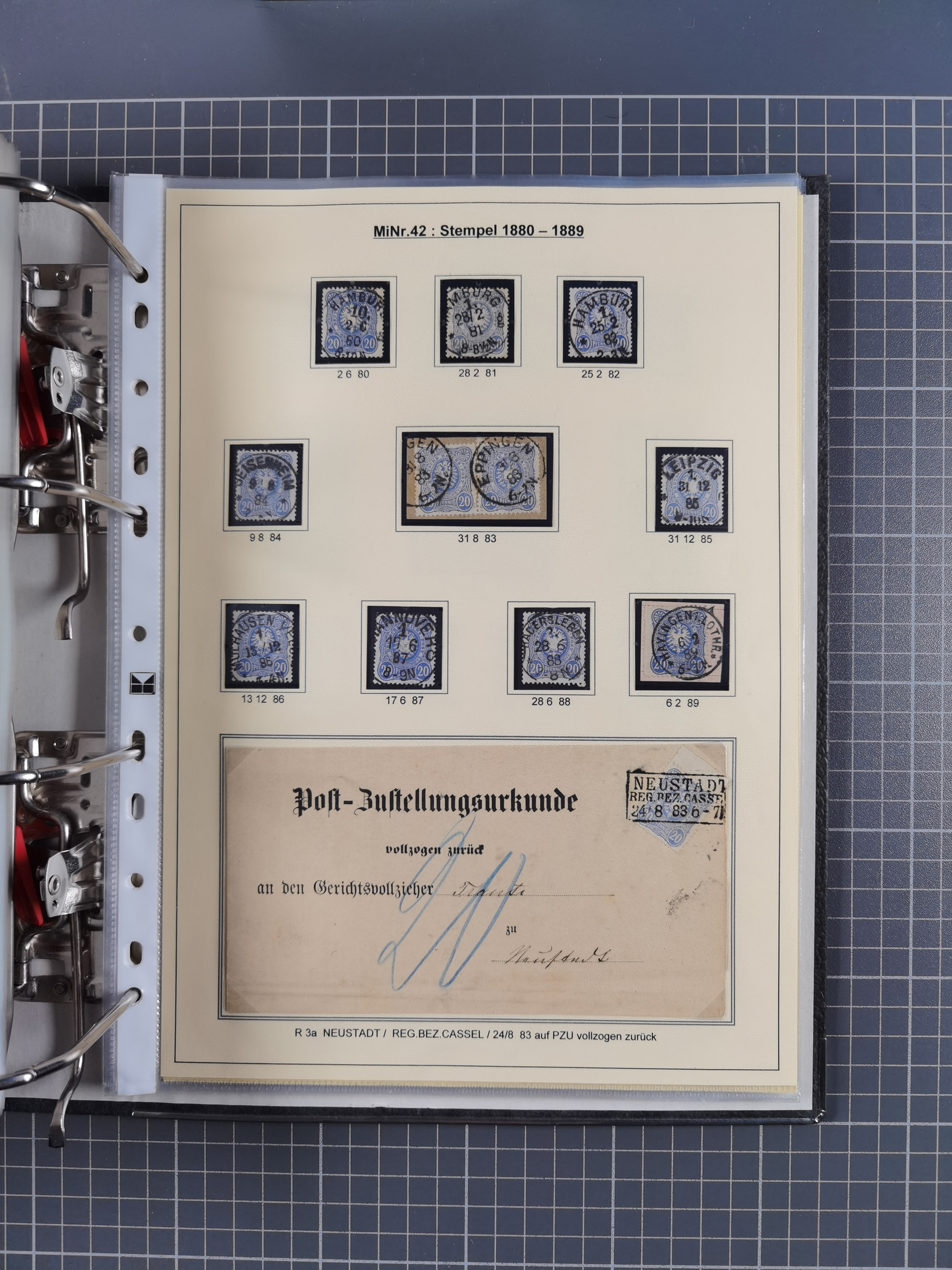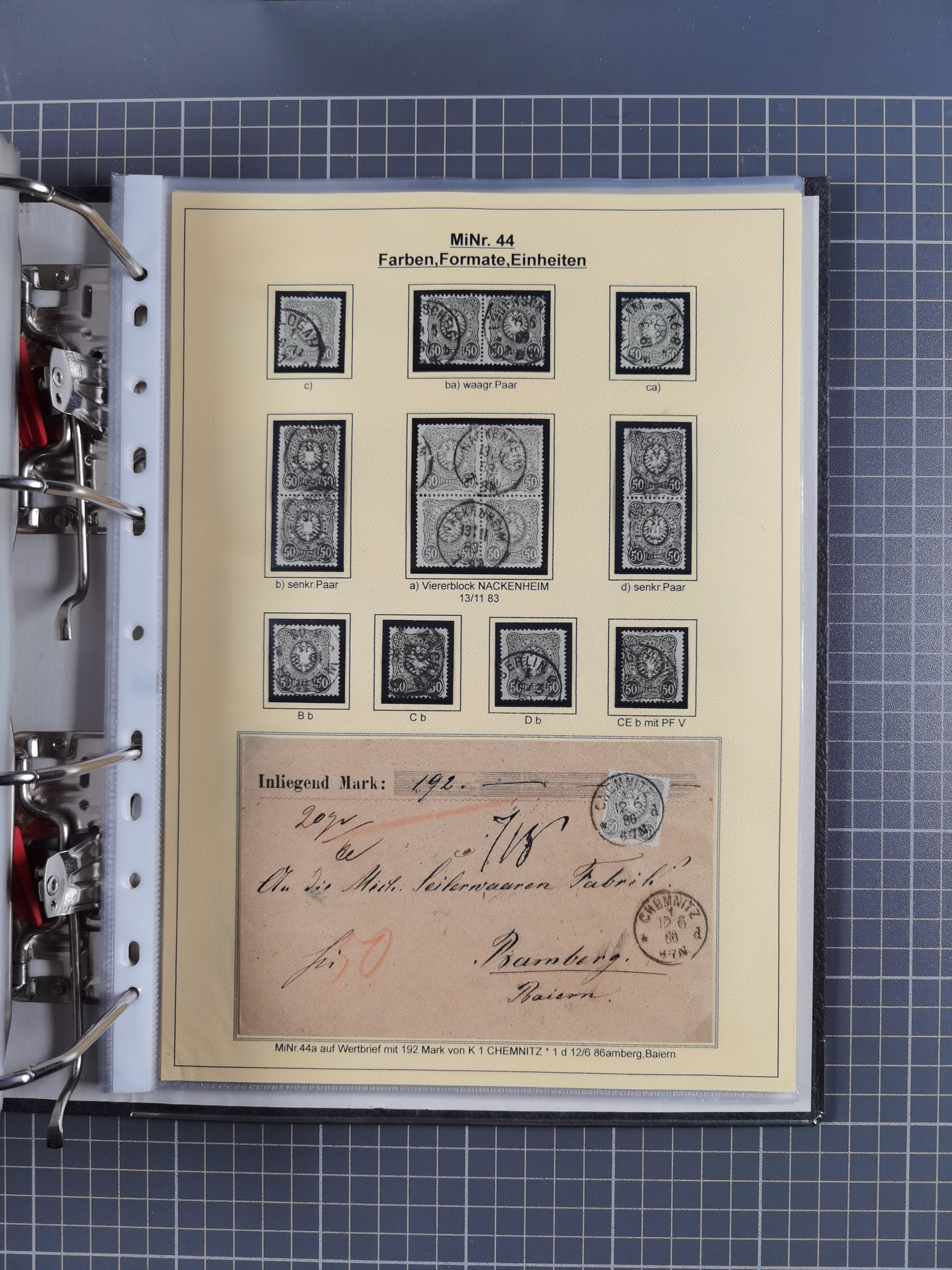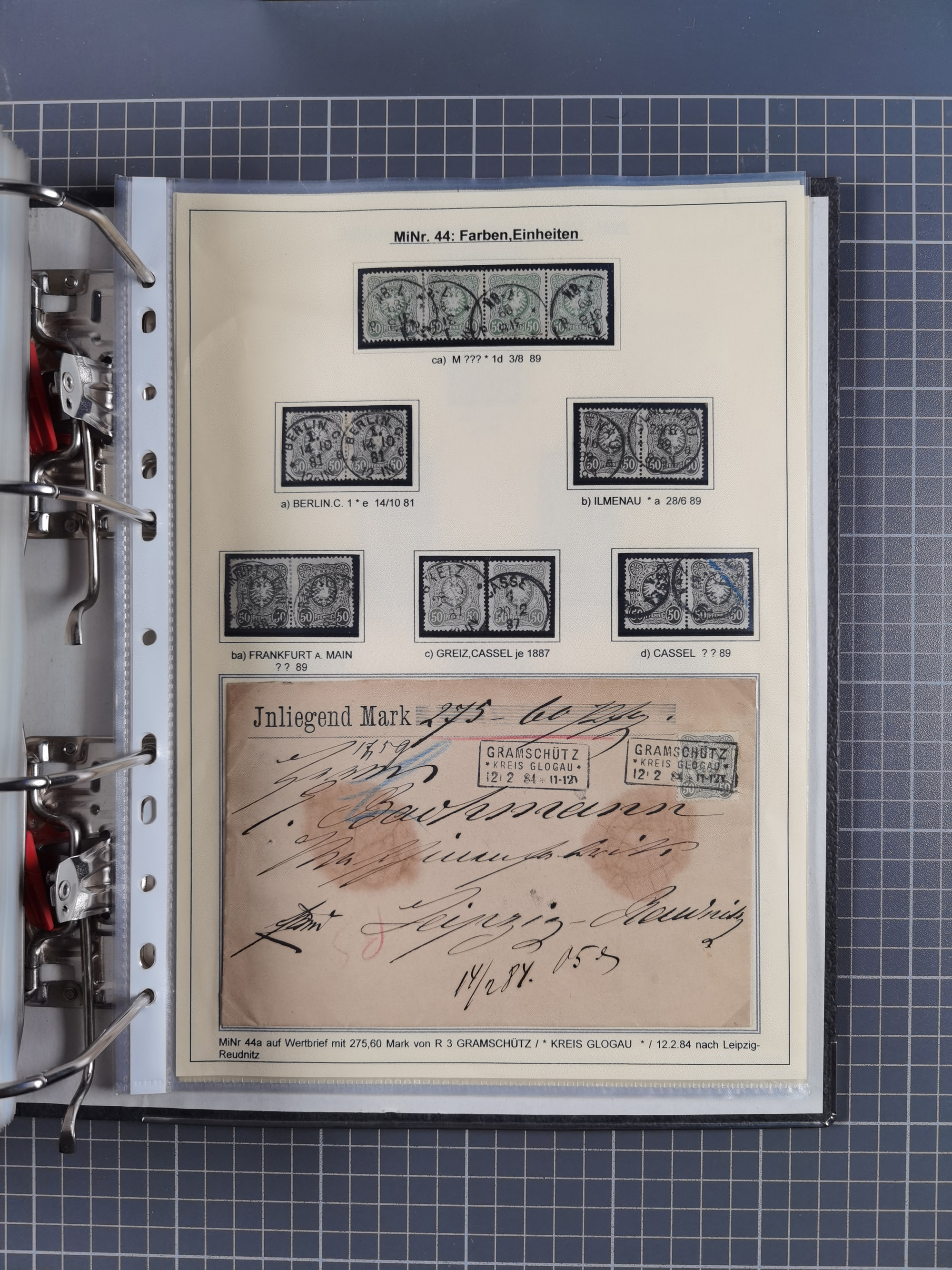 1889/1900, gestempelte Spezialsammlung “Krone/Adler”, mit Marken und über 150 Briefen, Karten und Formularen, dabei u.a. lose Zwischenstegpaare, Farbnuancen, dabei u.a. Postzustellungsurkunde, Auslandsrückschein mit 20 Pfg., Bücherzettel, Wertbriefe, Rohrpost, Ganzsachenausschnitte auf Briefen verwendet, Abarten mit u.a. Mi.-Nr. 50I-IV, etc., teils signiert, meist gute Erhaltung