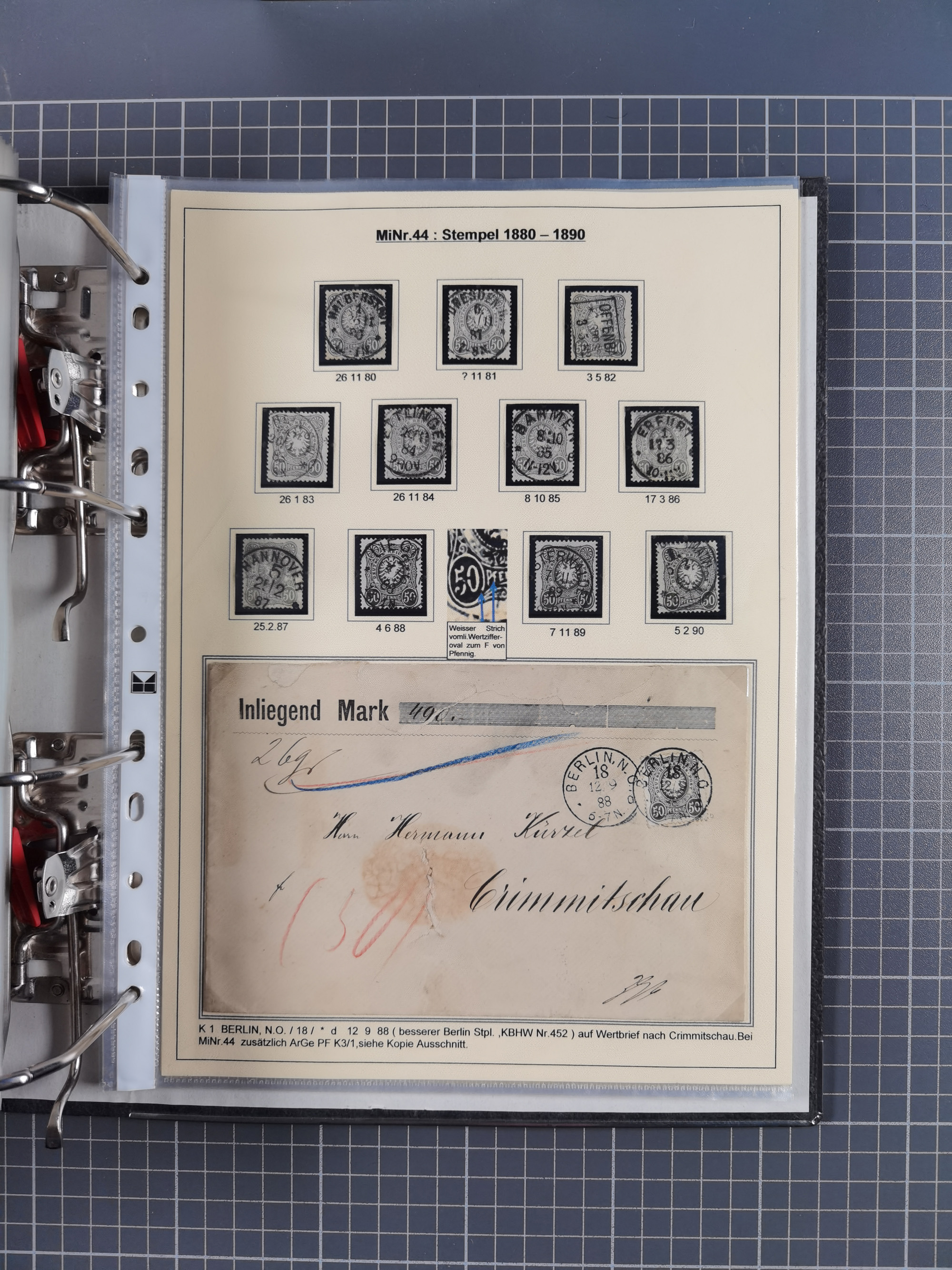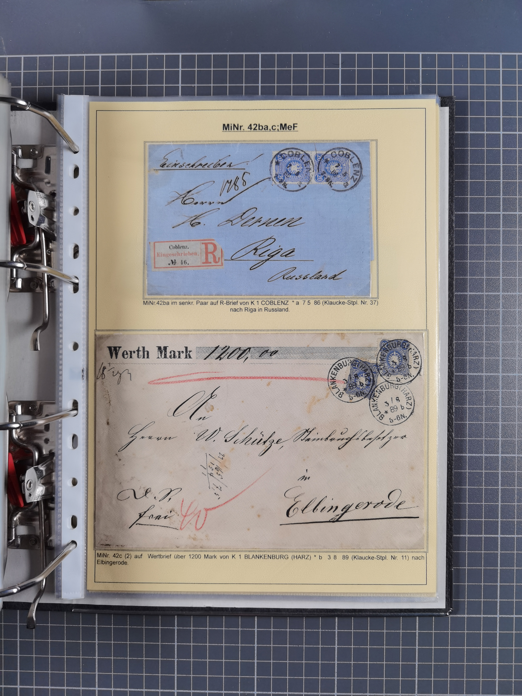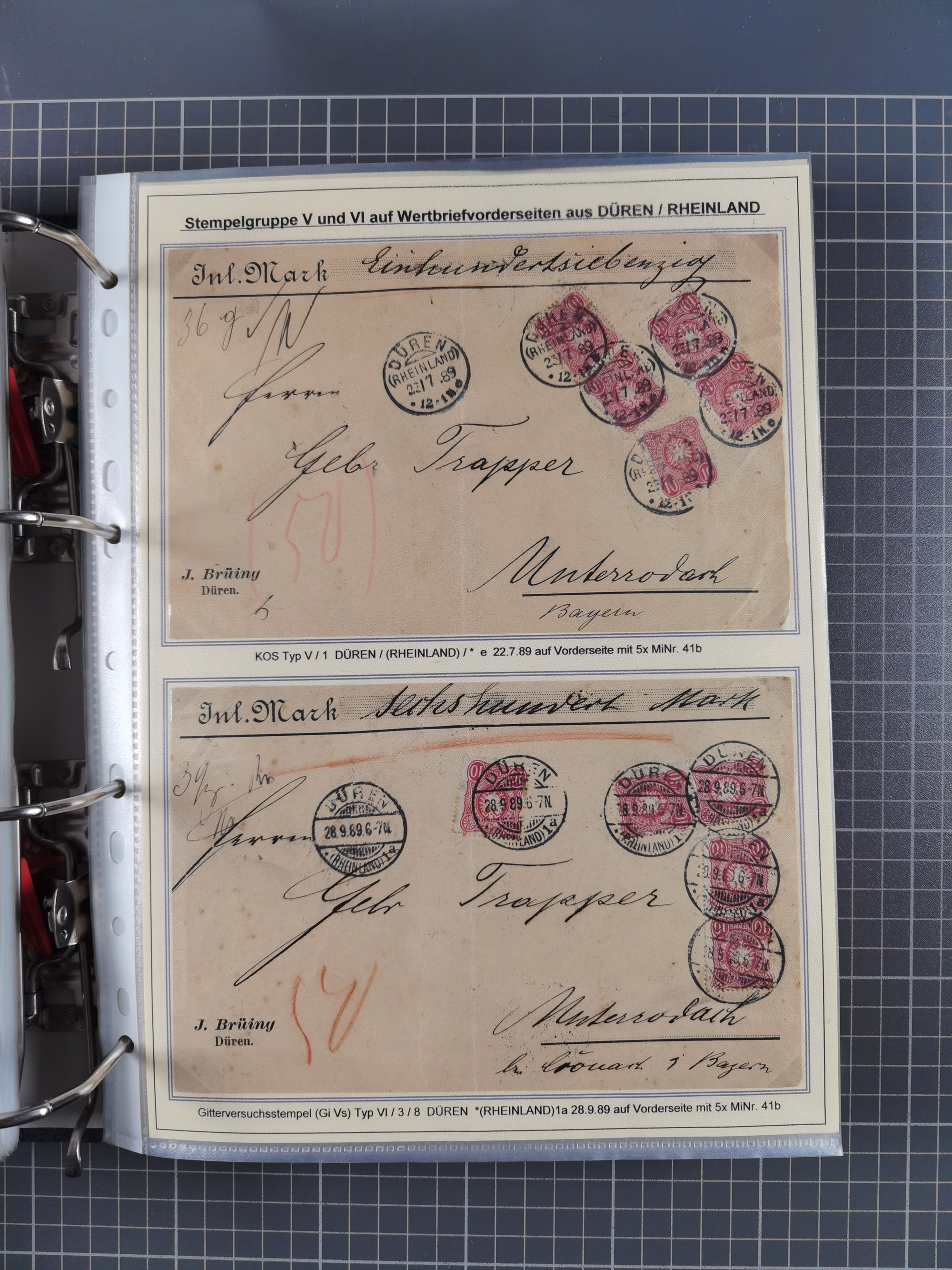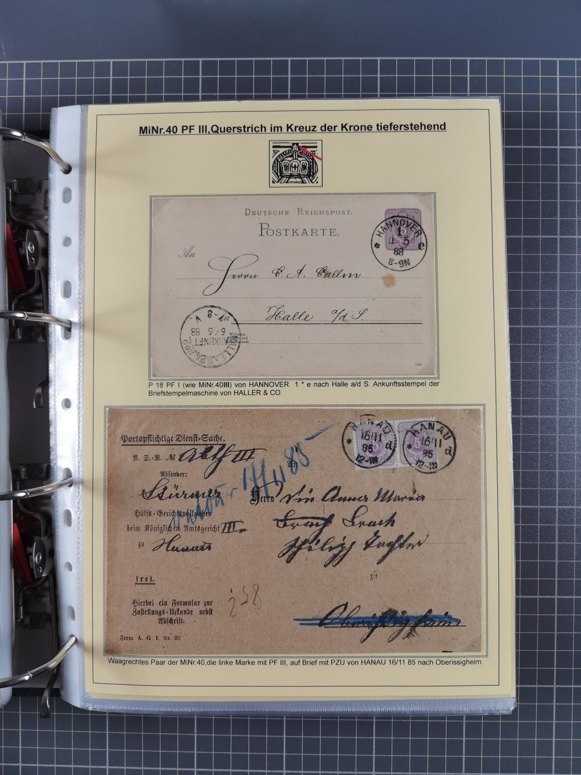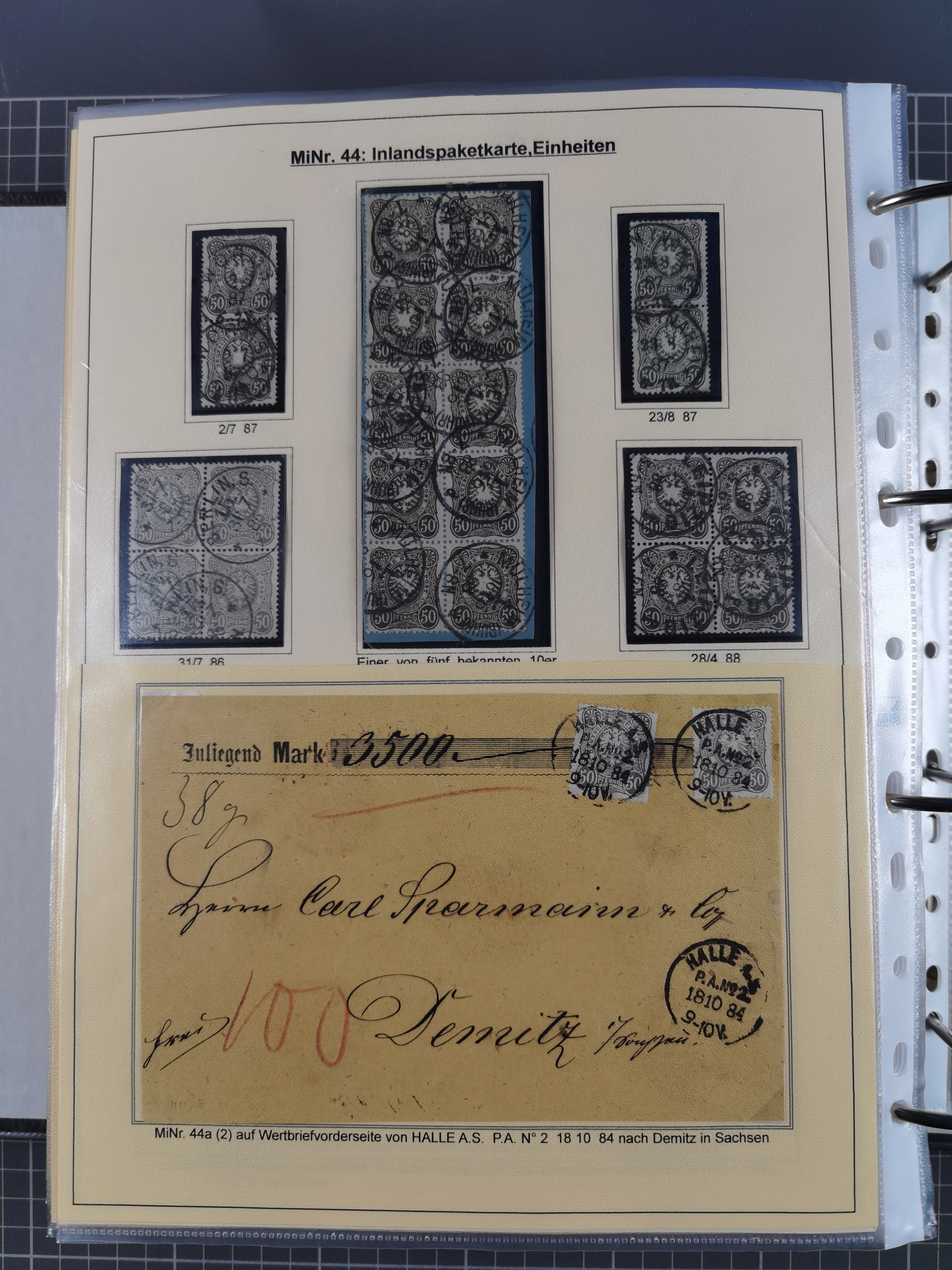 1889/1900, gestempelte Spezialsammlung “Krone/Adler”, mit Marken und über 150 Briefen, Karten und Formularen, dabei u.a. lose Zwischenstegpaare, Farbnuancen, dabei u.a. Postzustellungsurkunde, Auslandsrückschein mit 20 Pfg., Bücherzettel, Wertbriefe, Rohrpost, Ganzsachenausschnitte auf Briefen verwendet, Abarten mit u.a. Mi.-Nr. 50I-IV, etc., teils signiert, meist gute Erhaltung