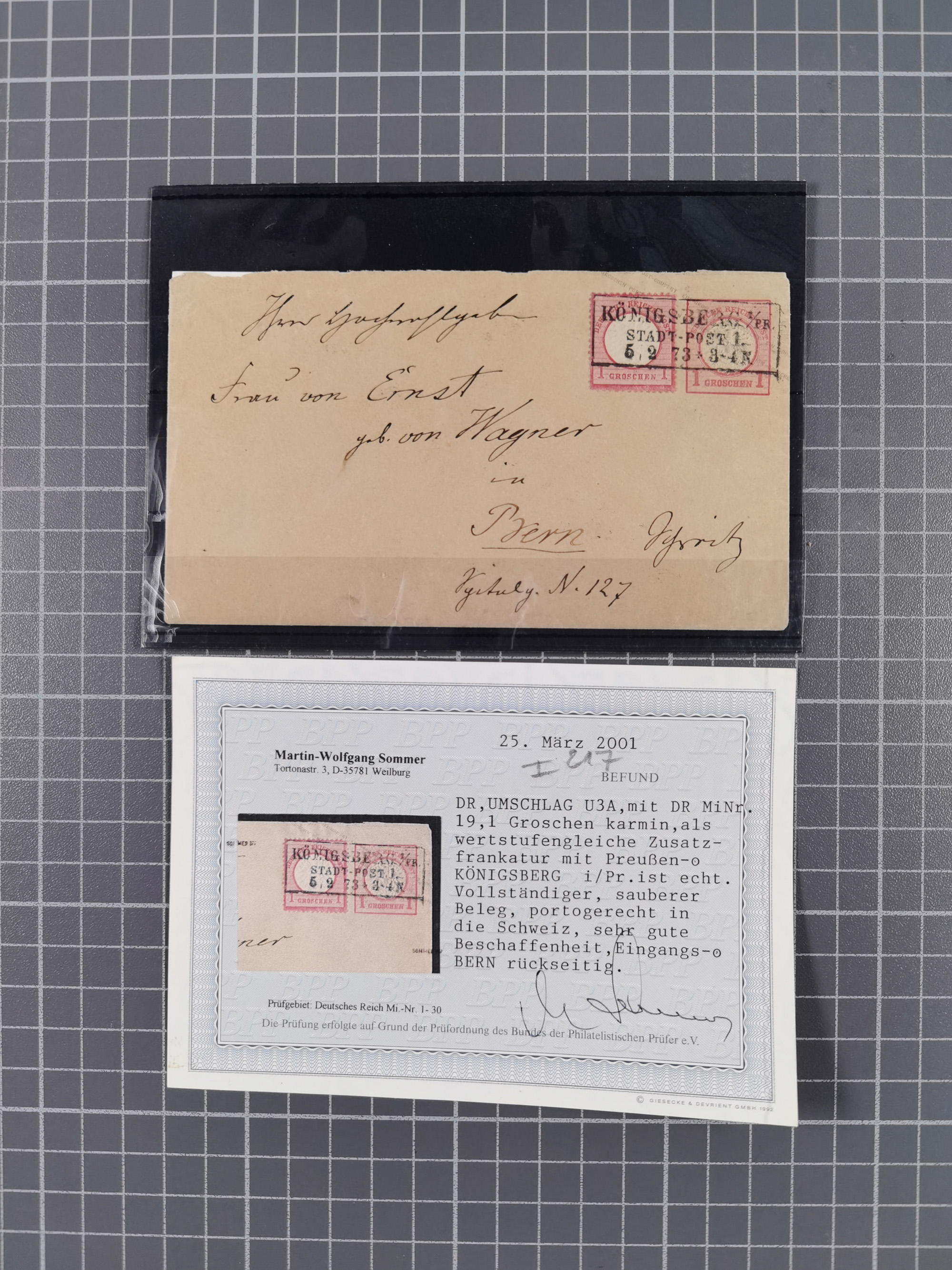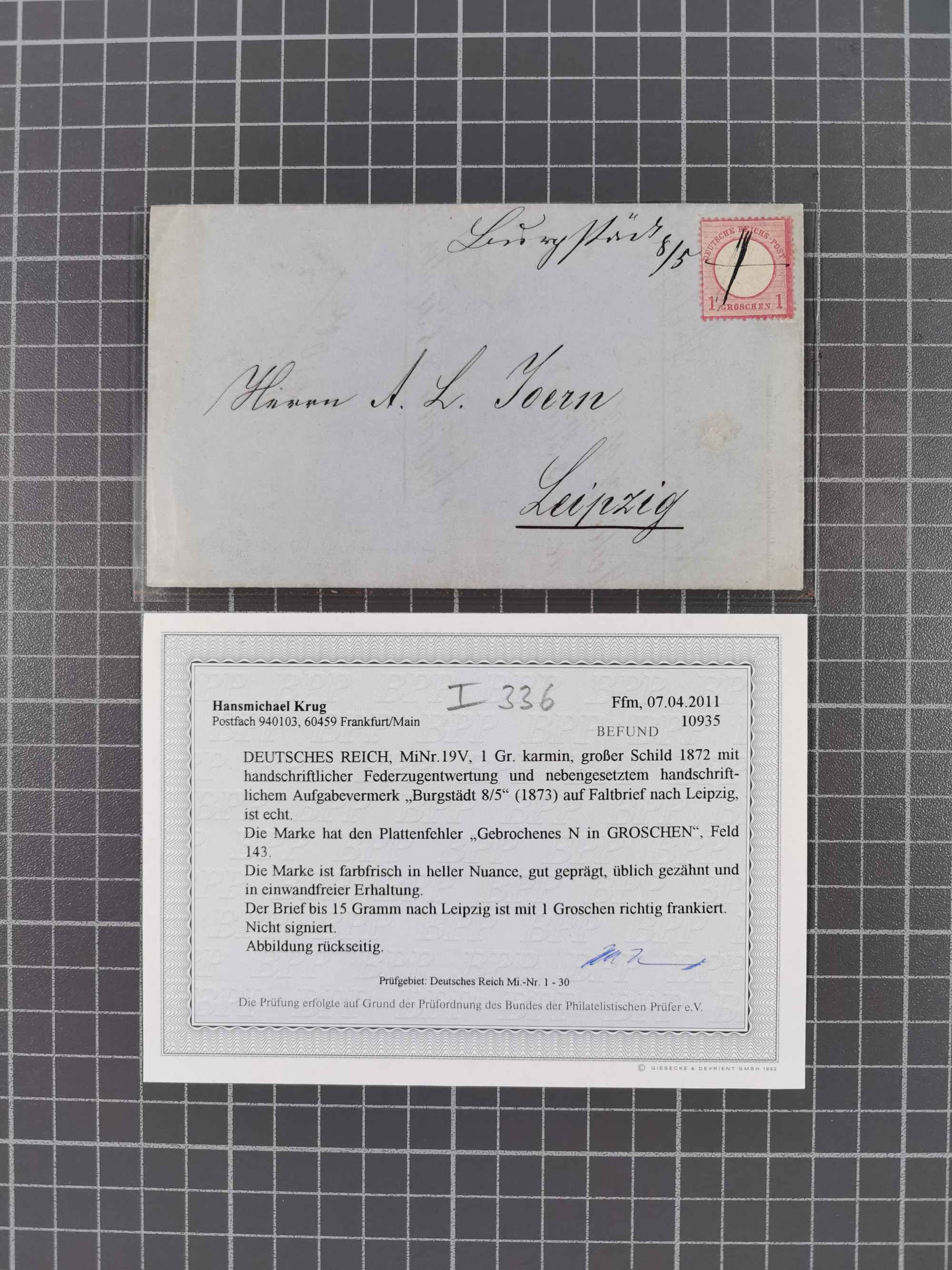1872/75, Groschenbezirk, rund 60 Briefe und Ganzsachen, dabei viele interessante Belege, u.a. 1 (3) auf Drucksache nach Amsterdam, Express-Soldaten Brief, Orts-R-Brief von Berlin, Mi. 6 EF auf R-Brief nach Frankreich, 16 EF (2), 16 +18 auf Auslandsdrucksache, 16 (3) auf Auslandsdrucksache, 17 b auf Letzttag-Brief, 18 +19 auf eingeschriebenem Ortsbrief von Dresden, 19 mit bayerischem Stempel, 19 + 20 auf R-Brief in den Grenzrayon, etc. etc. Ein sehr interessantes Objekt, Alles signiert BPP bzw. 27 Atteste und 30 Befunde.