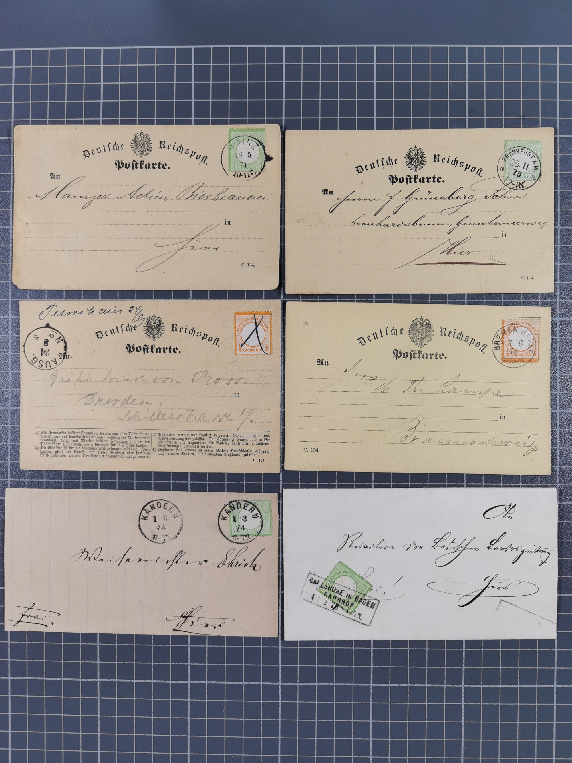 1872/74, sechs ausgesuchte Einzelfrankaturen Mi.-Nr. 18 (2x) und 23a (4x), dabei u.a. zwei amtliche Postkarten-Formulare als Ortskarten von Frankfurt und Mainz bzw. zwei Ortsbriefe von Carlsruhe und Kandern (je mit 1 Kr.), in guter Erhaltung