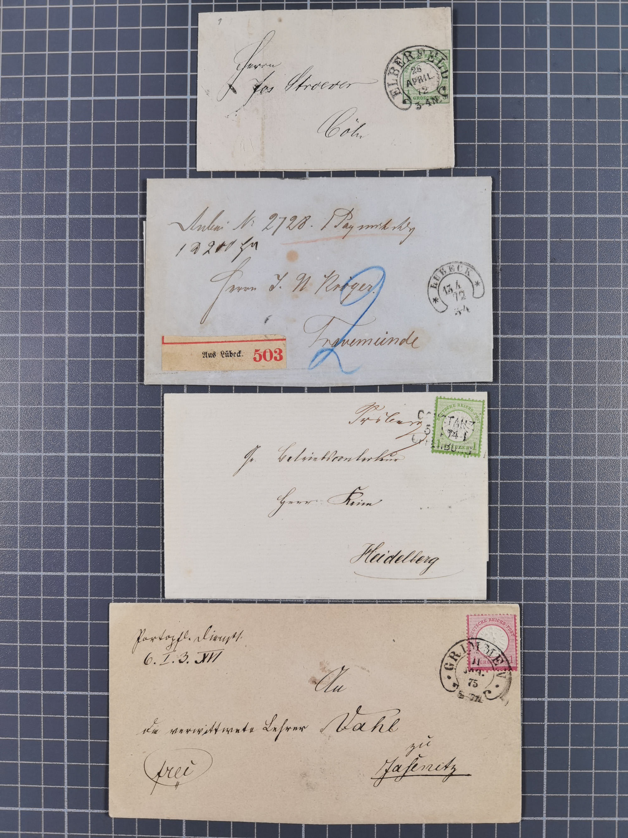 1872/74, fünf interessante Stempel auf Briefen und einer Ganzsache mit Hufeisenstempeln von “ELBERFELD”, “GRIMMEN” und “LÜBECK”, eine Drucksache mit Bahnpost L3 “CONSTANZ 5.1.74 I OFFENBURG” mit hds. Aufgabevermerk “Freiburg” (sign. Sommer BPP) und Mi.-Nr. 19 PF V auf Brief mit Federstrich-Entwertung und handschriftlich “Burgstädt” (FB Krug BPP), in guter Erhaltung