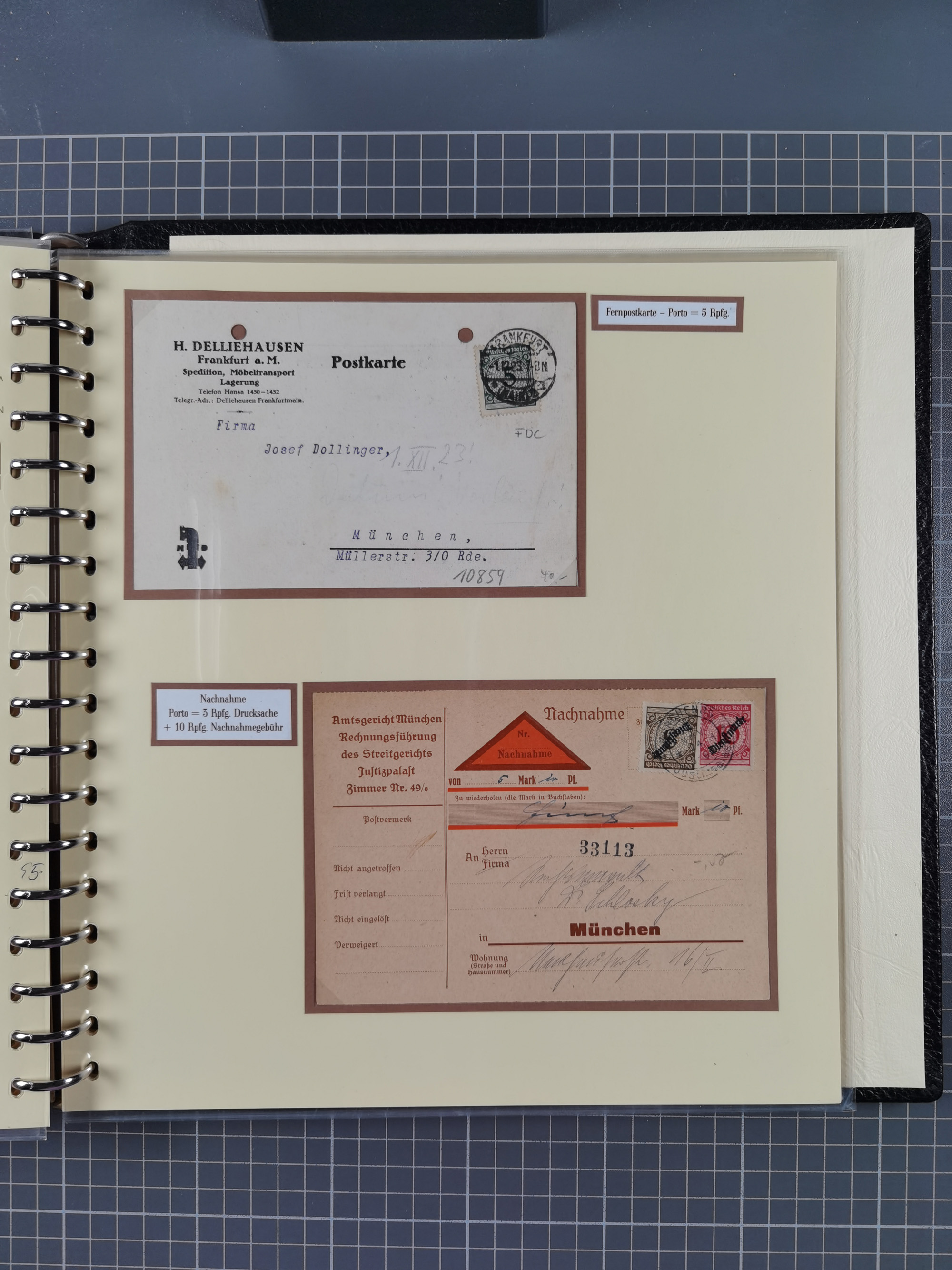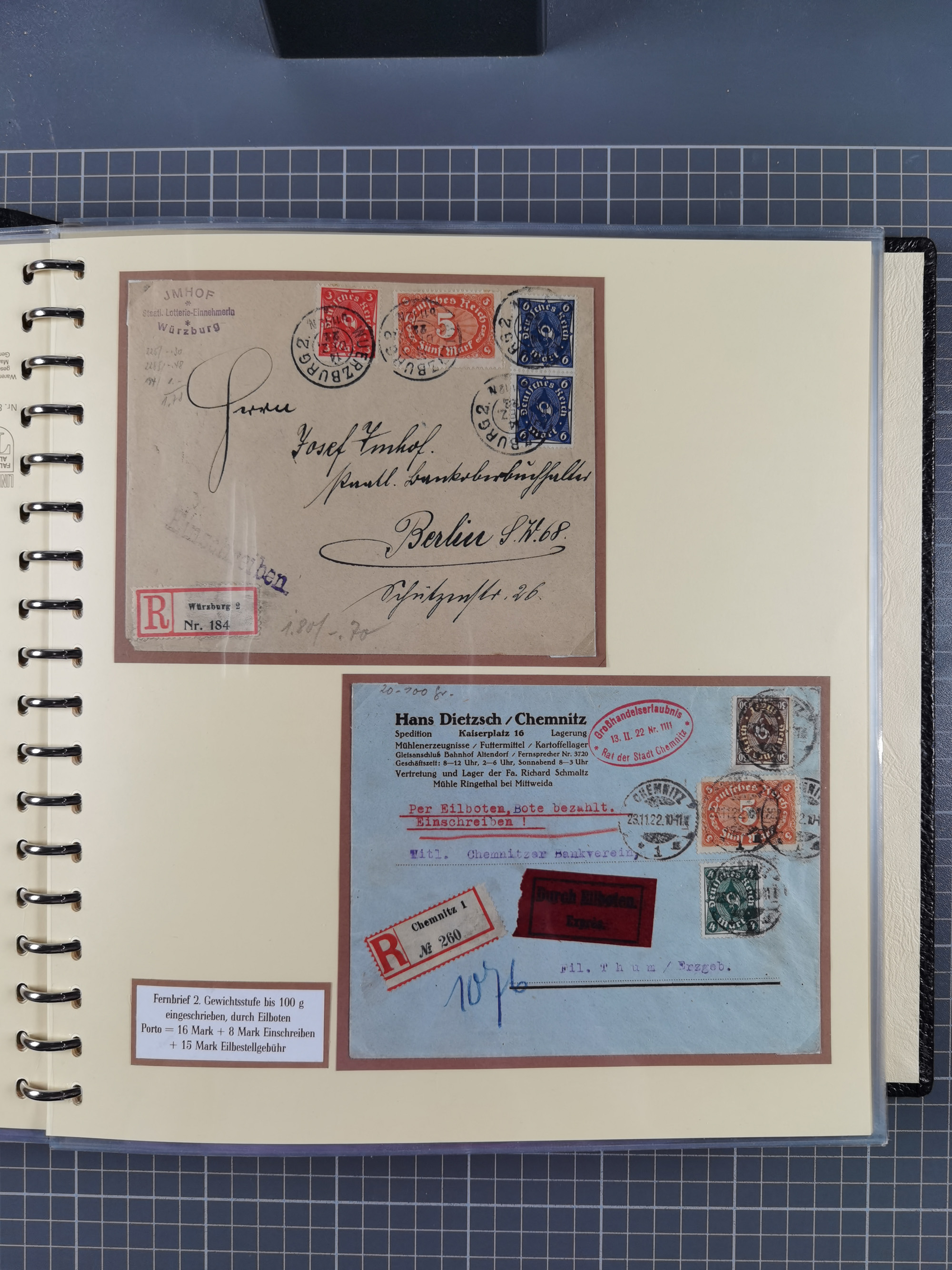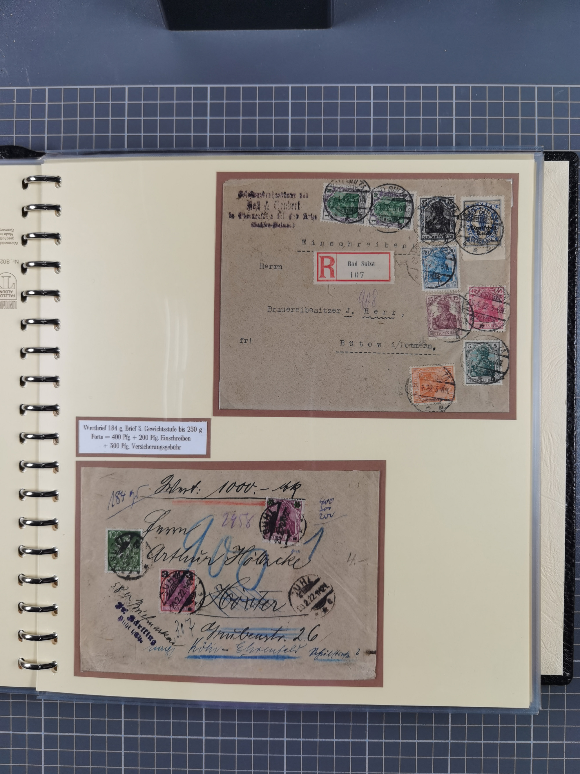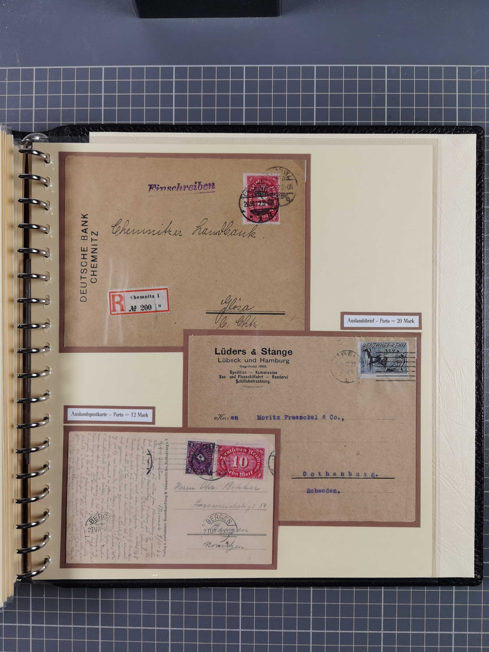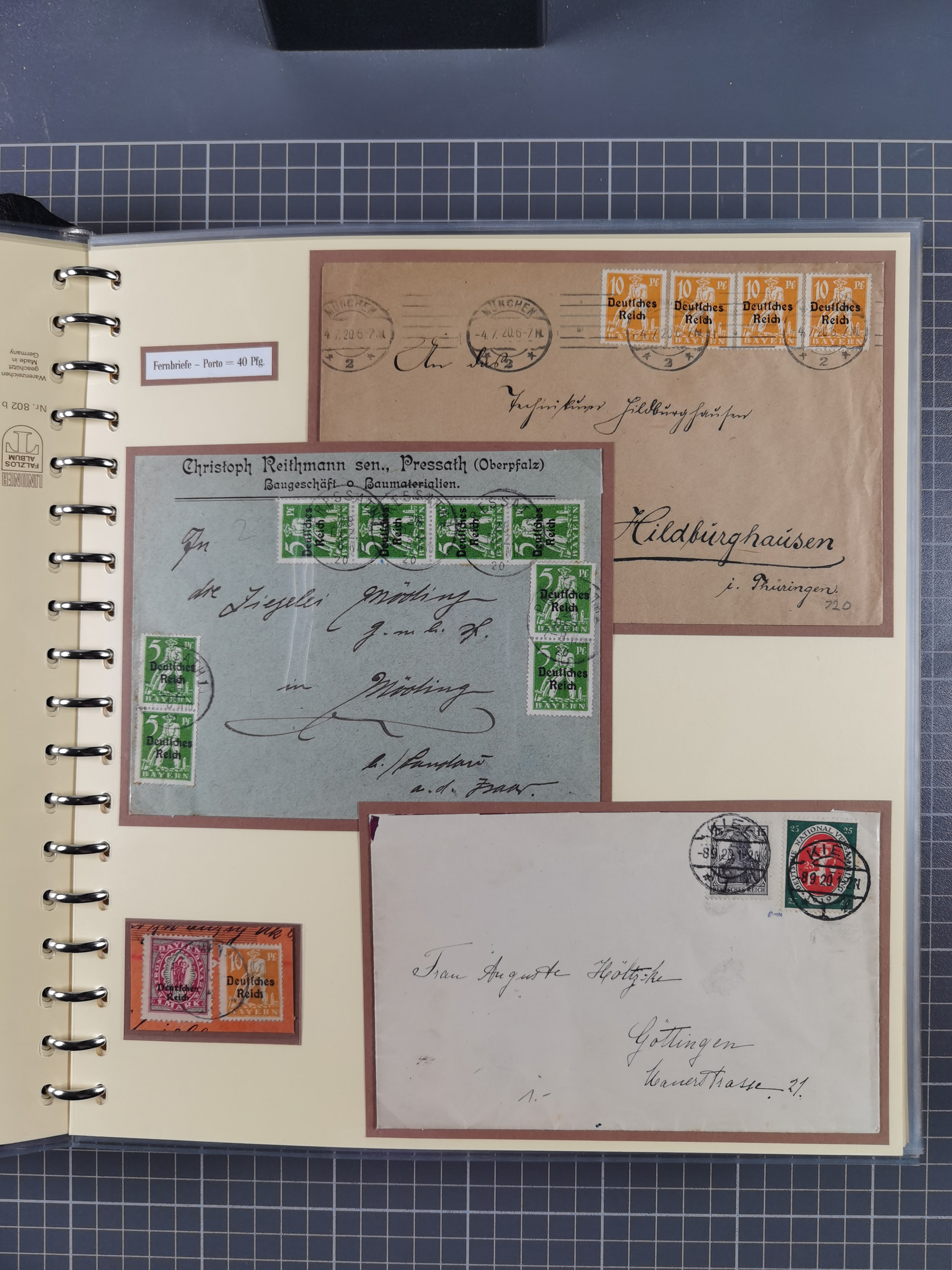 1872/1923, umfangreiche Sammlung mit ca. 800 Briefen,Karten und Ganzsachen. Am Anfang mit kleinem Teil “Hufeisentstempel”, ansonsten liegt der Schwerpunkt bei Infla mit Einzel- und Mehrfachfrankaturen, R-Briefen, Auslandspost, viel Hochinflation mit Dezember-Briefen und Portostufen. Alles auf selbst gestalteten Albenblättern in10 Alben