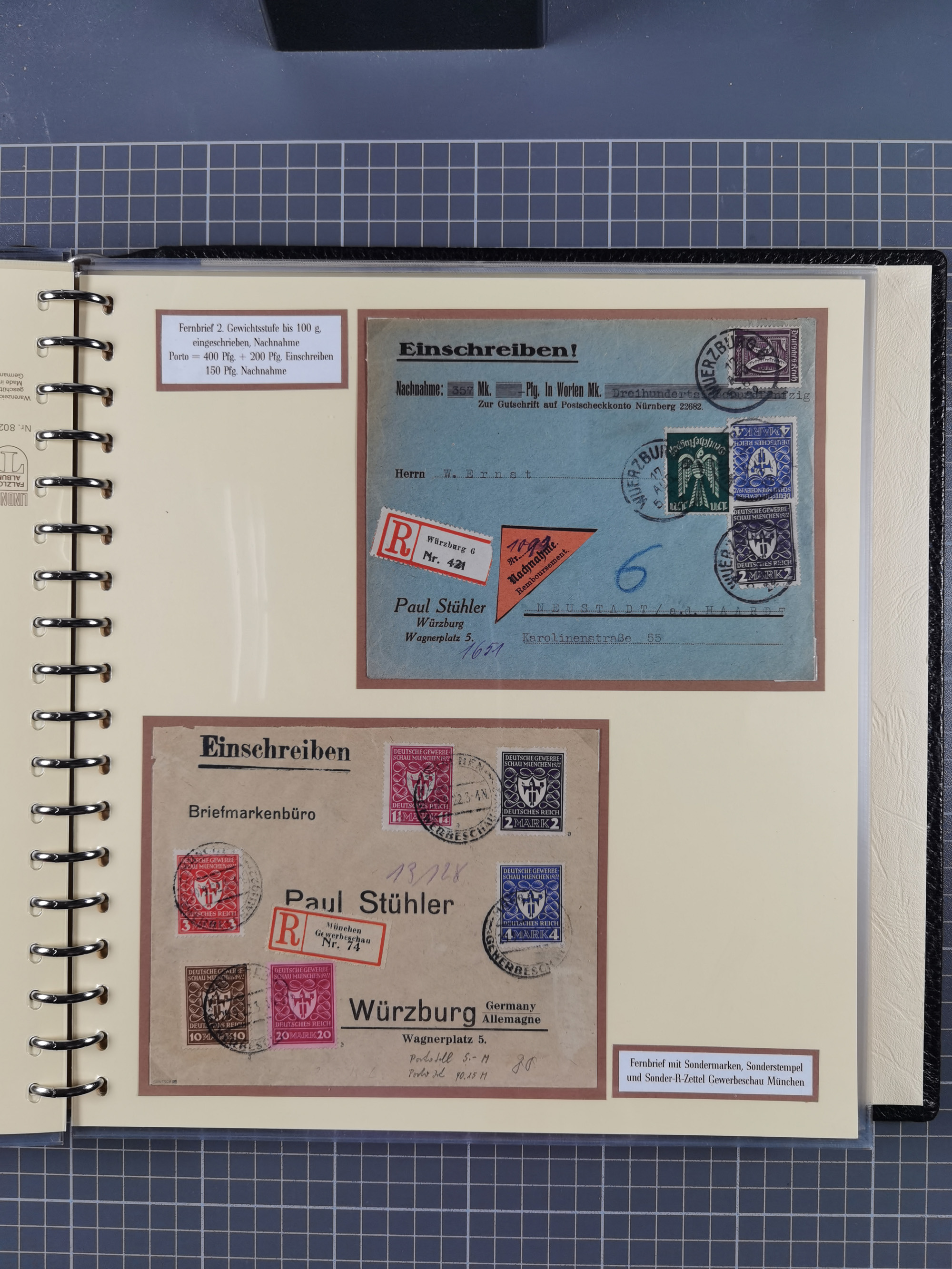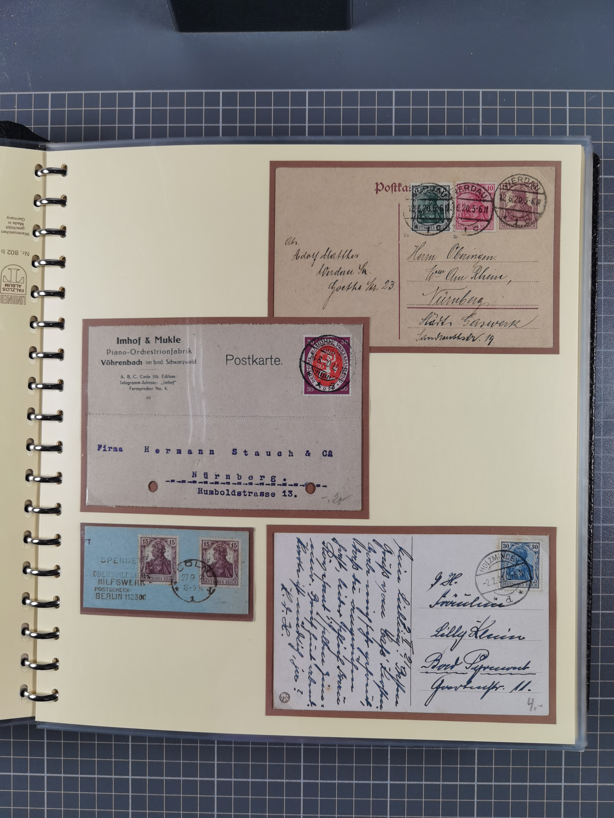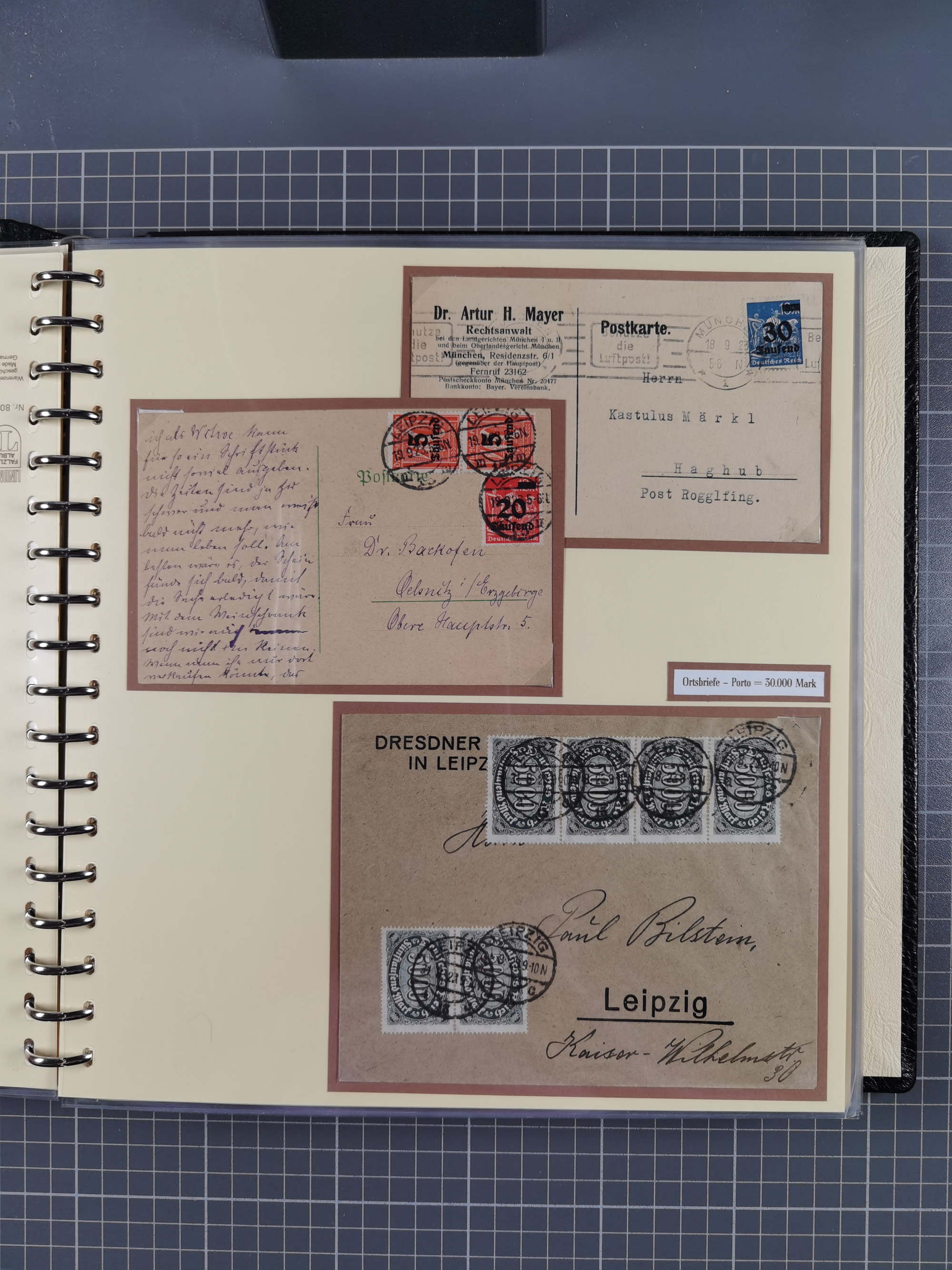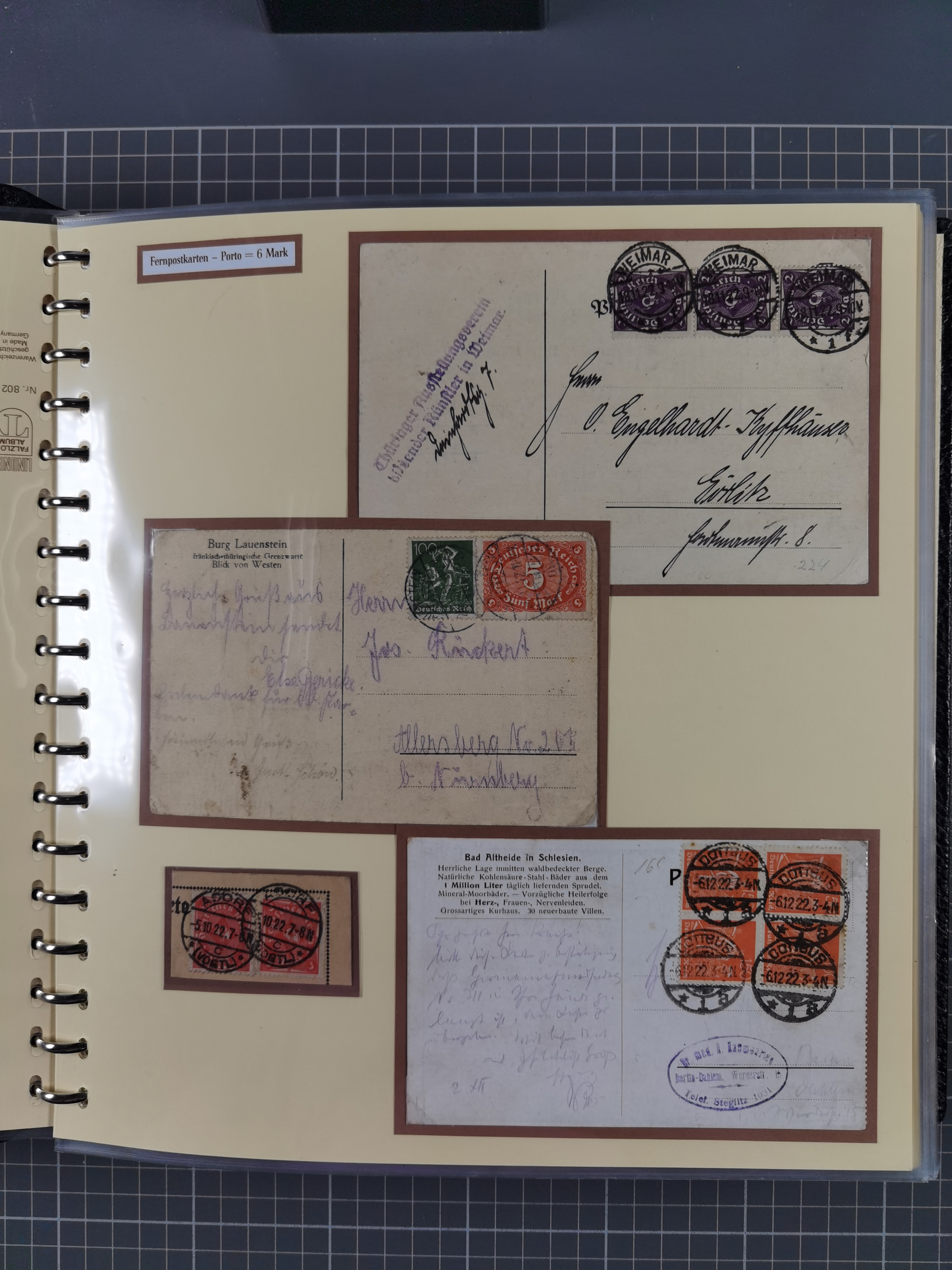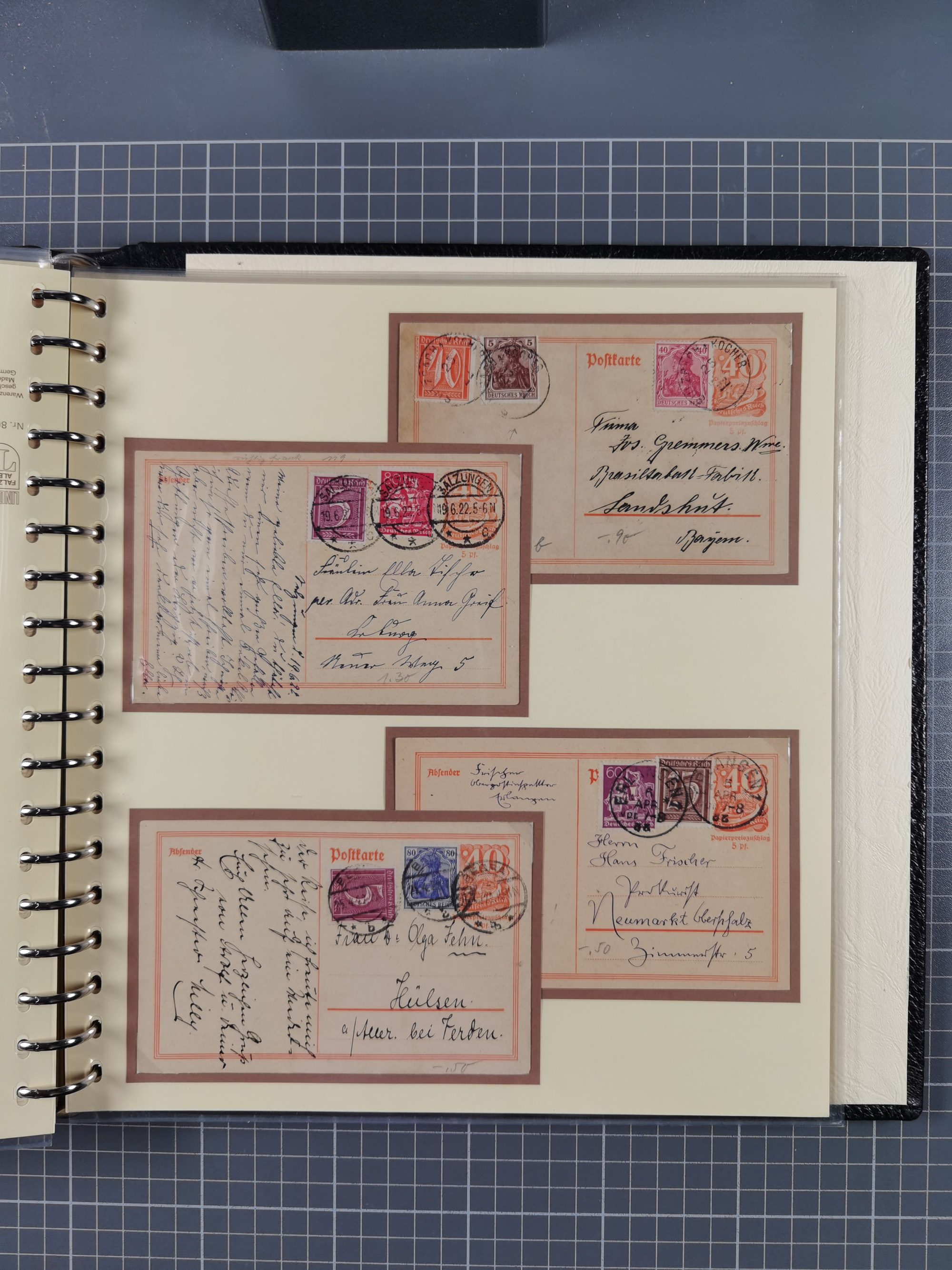 1872/1923, umfangreiche Sammlung mit ca. 800 Briefen,Karten und Ganzsachen. Am Anfang mit kleinem Teil “Hufeisentstempel”, ansonsten liegt der Schwerpunkt bei Infla mit Einzel- und Mehrfachfrankaturen, R-Briefen, Auslandspost, viel Hochinflation mit Dezember-Briefen und Portostufen. Alles auf selbst gestalteten Albenblättern in10 Alben