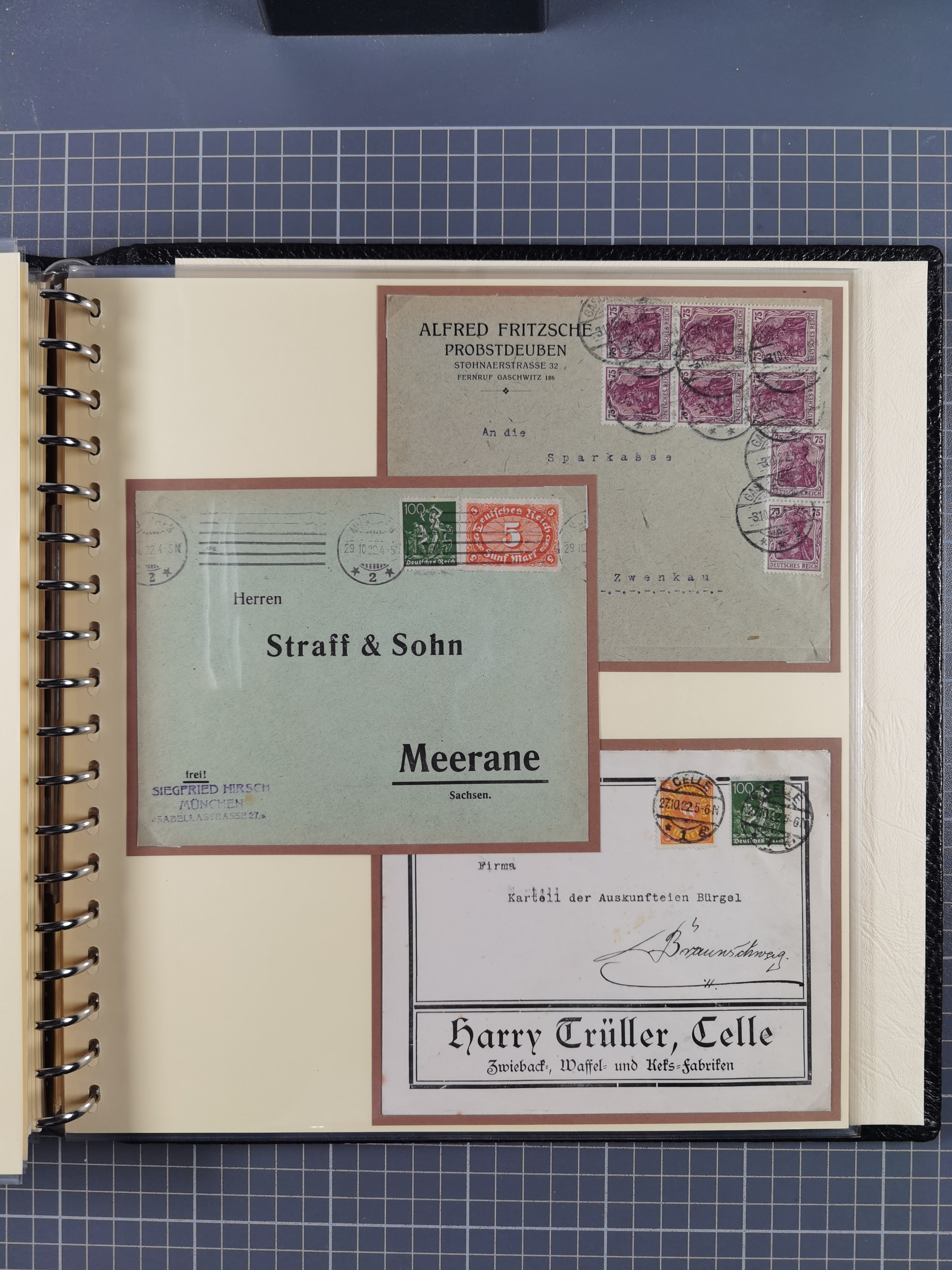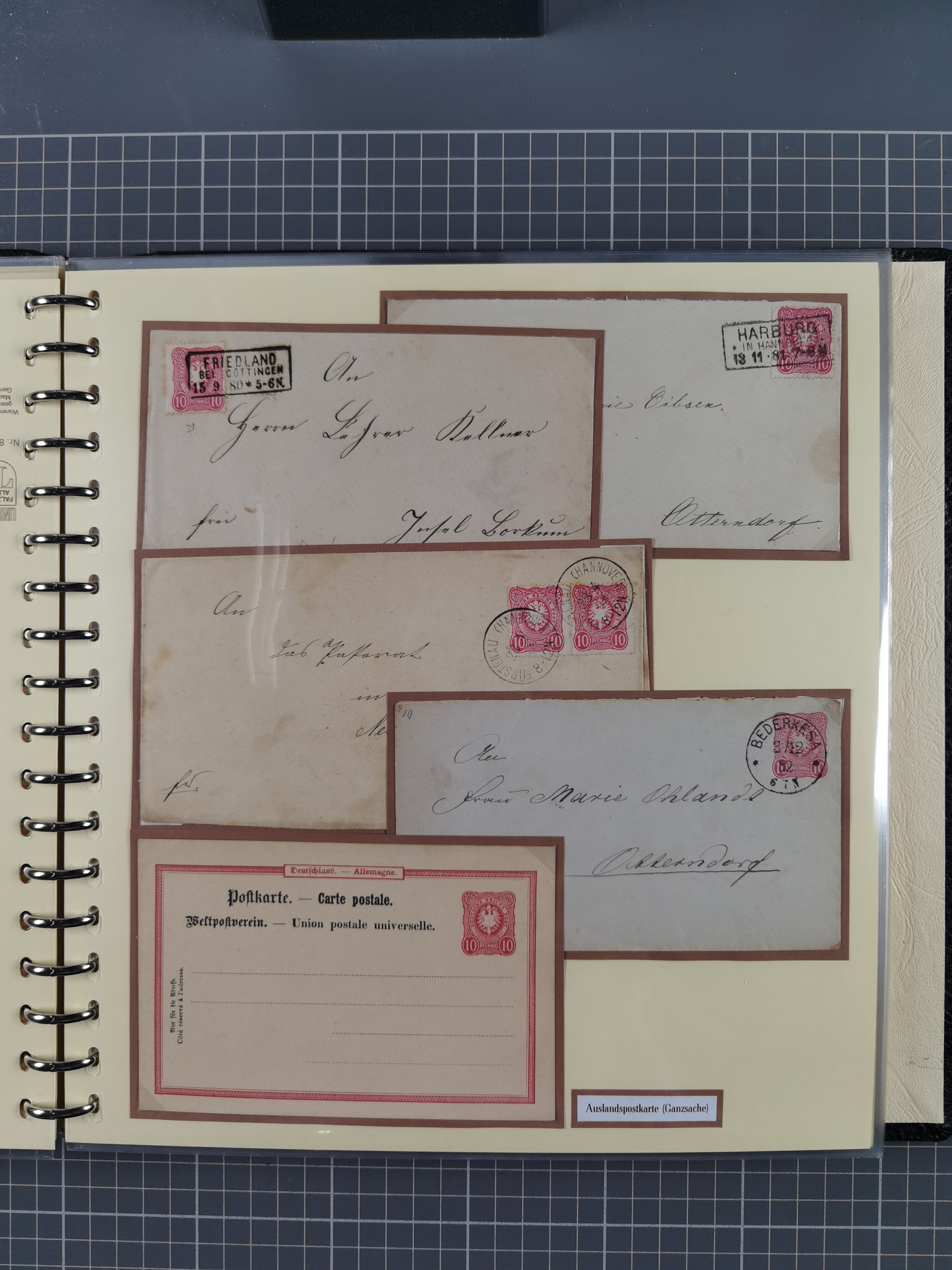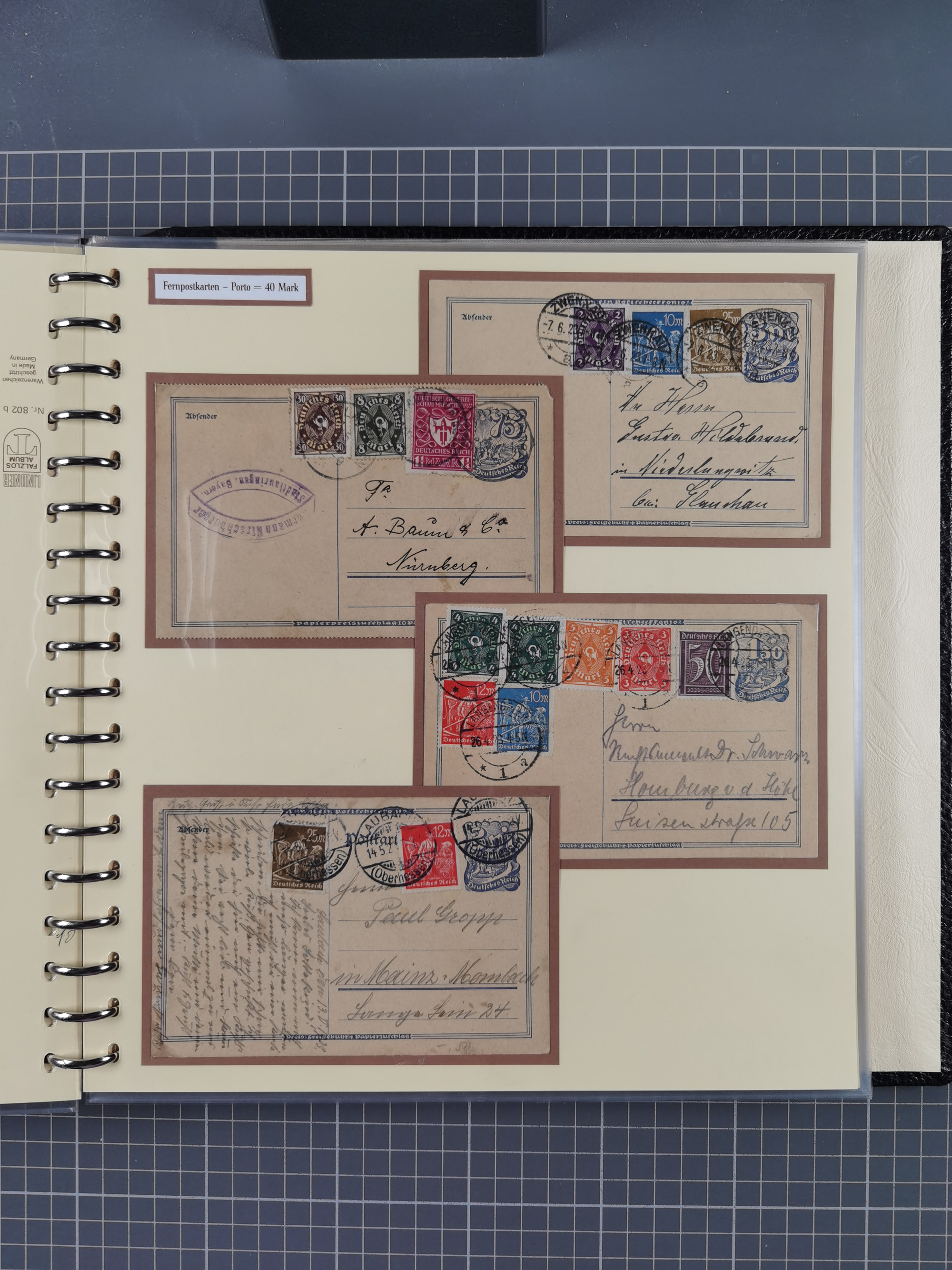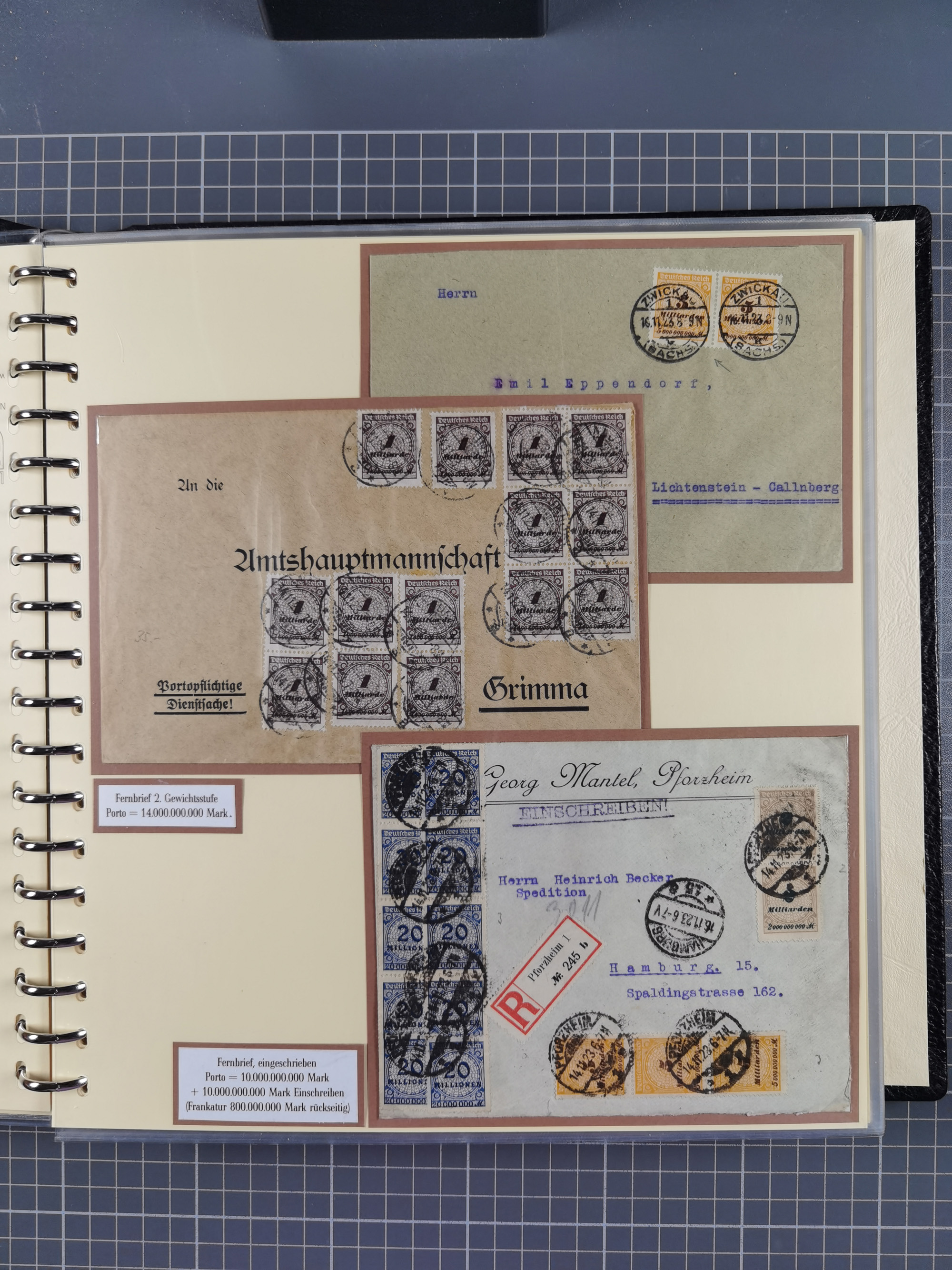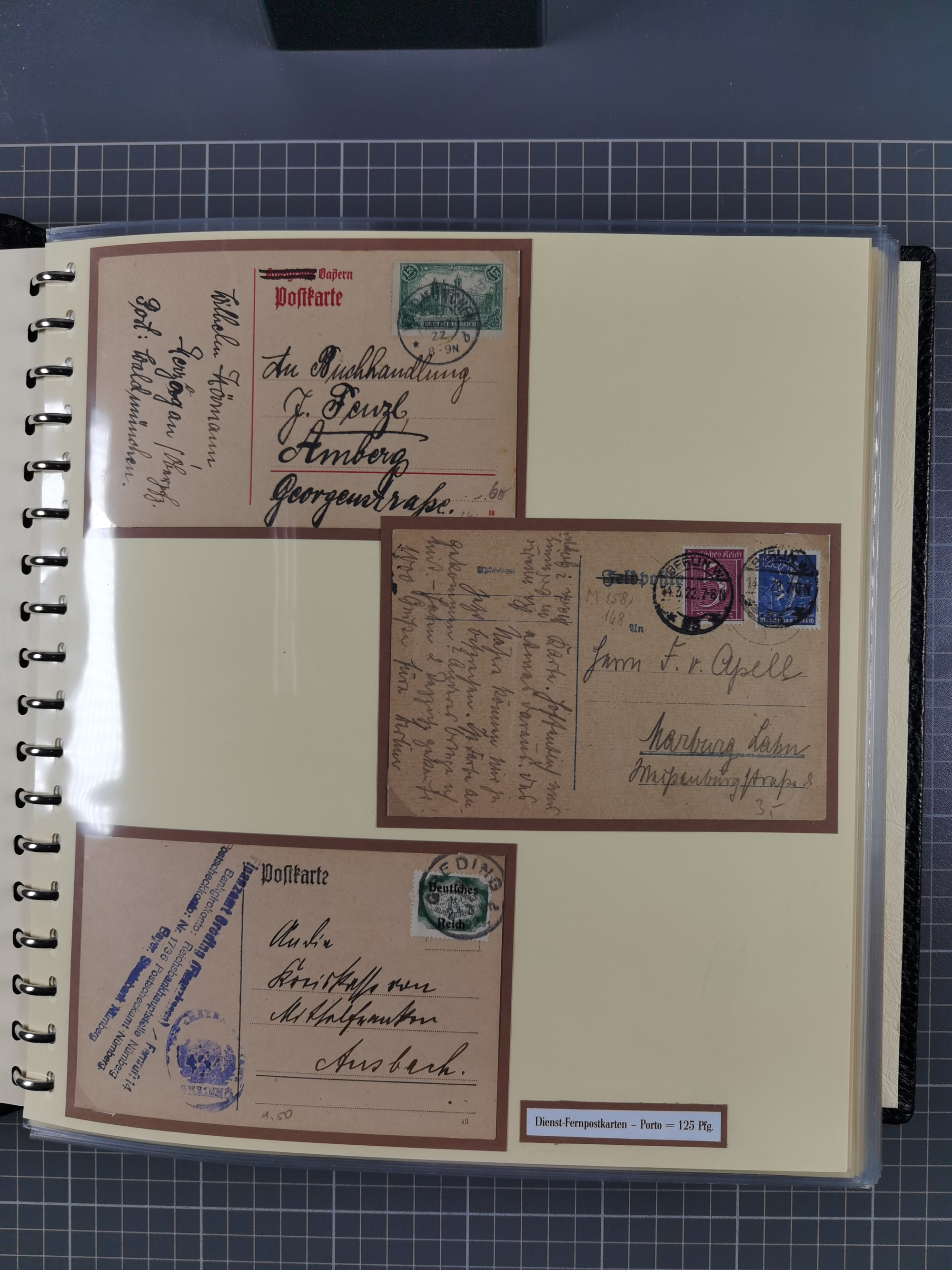 1872/1923, umfangreiche Sammlung mit ca. 800 Briefen,Karten und Ganzsachen. Am Anfang mit kleinem Teil “Hufeisentstempel”, ansonsten liegt der Schwerpunkt bei Infla mit Einzel- und Mehrfachfrankaturen, R-Briefen, Auslandspost, viel Hochinflation mit Dezember-Briefen und Portostufen. Alles auf selbst gestalteten Albenblättern in10 Alben