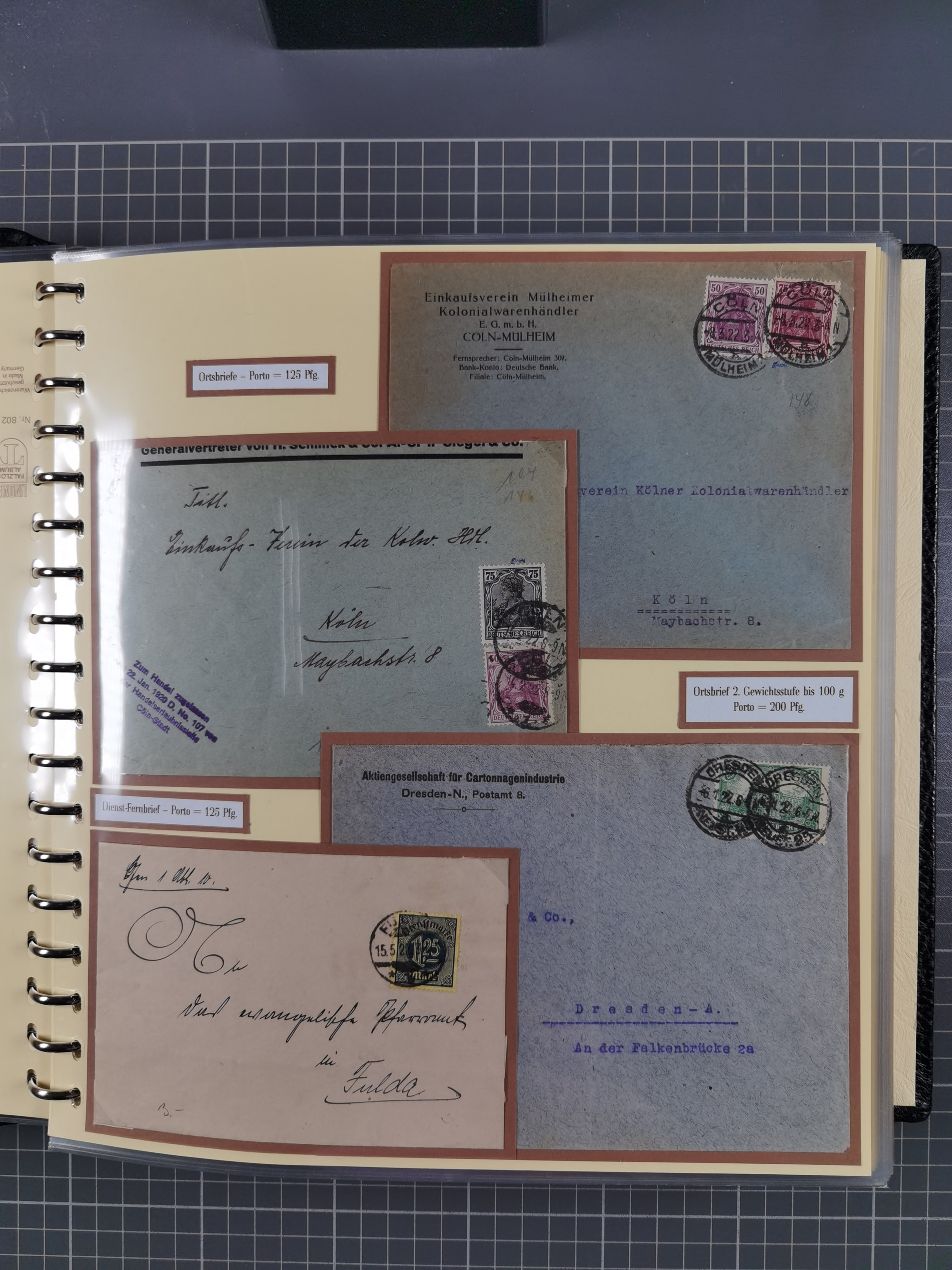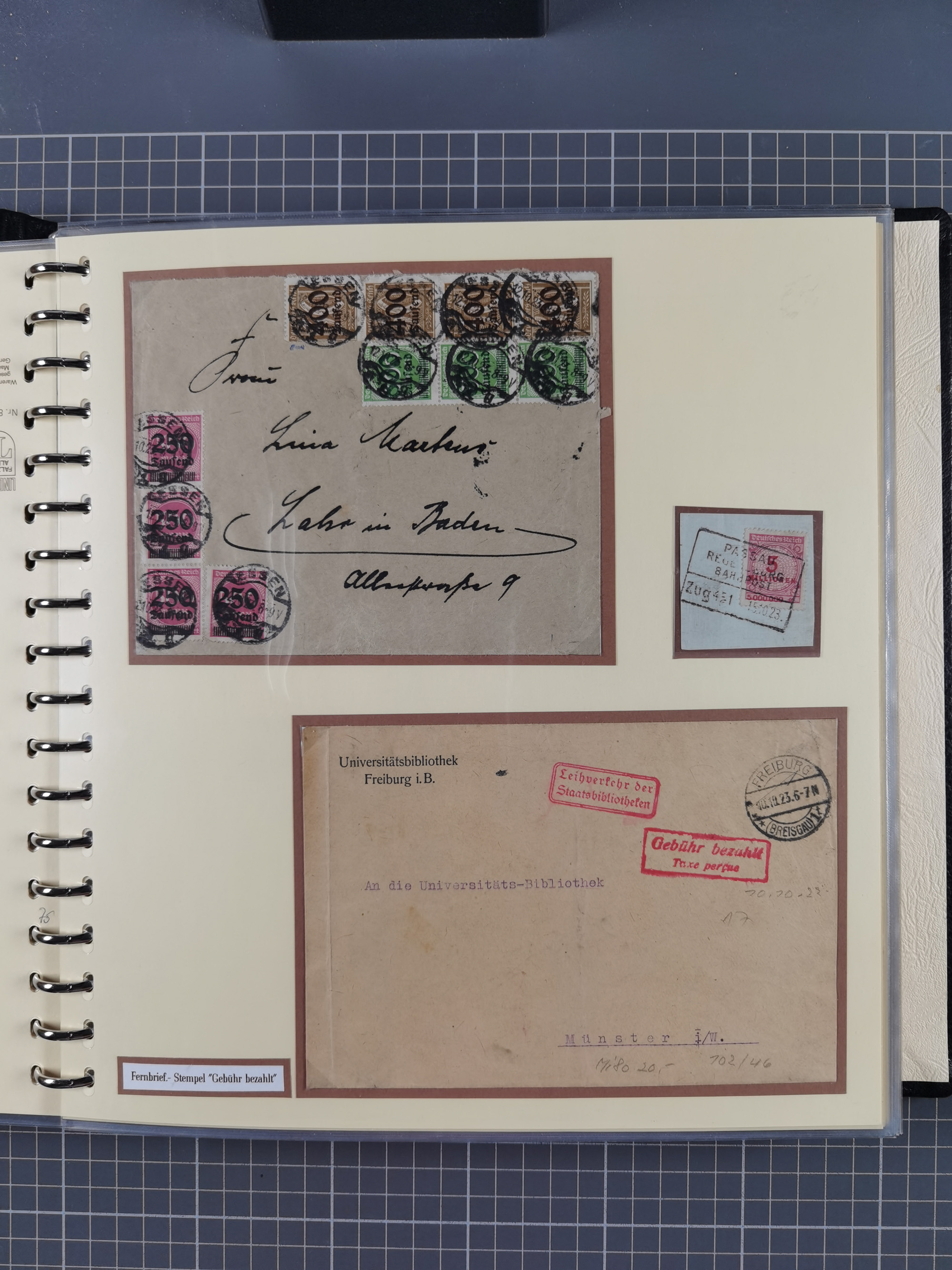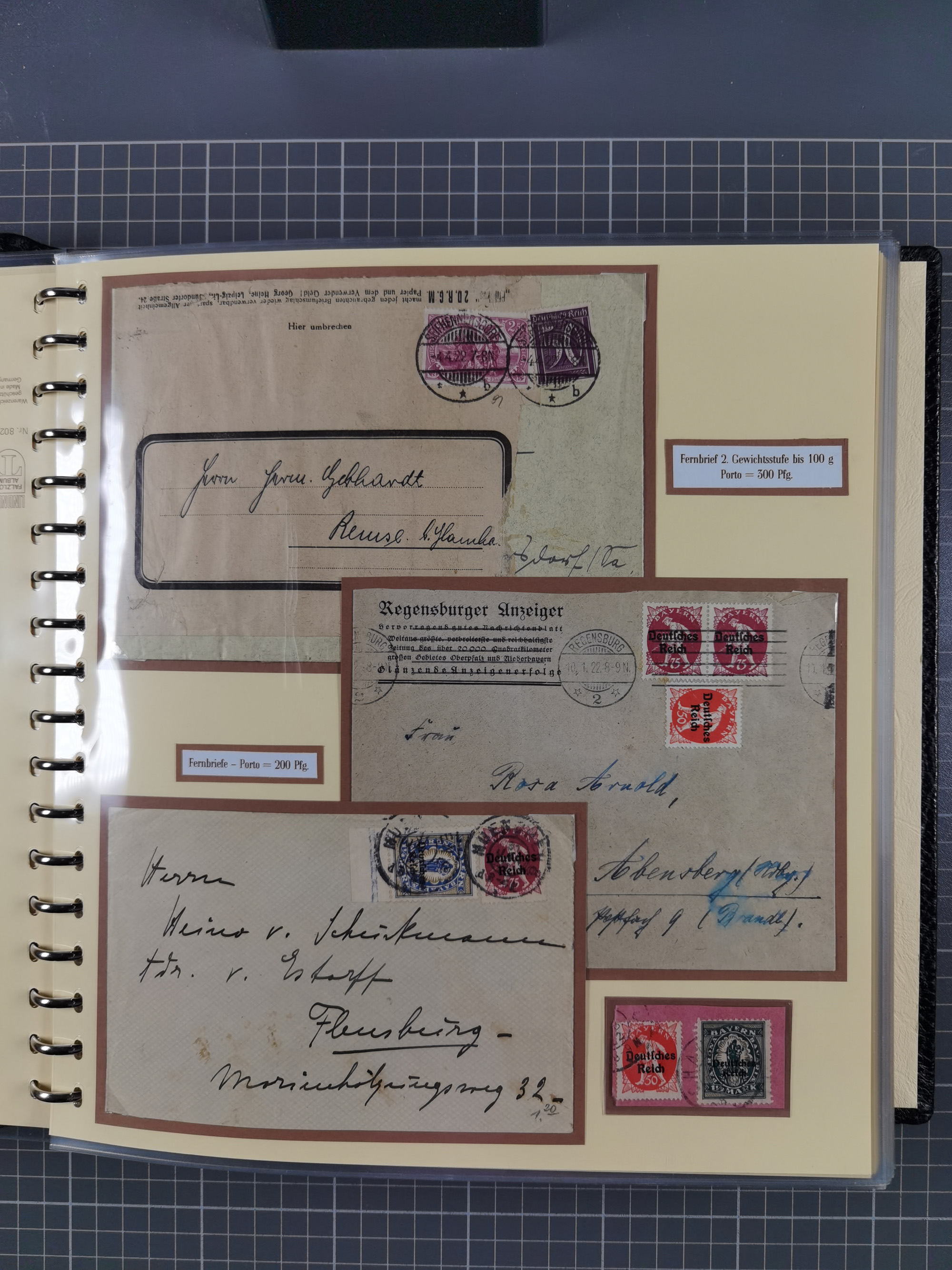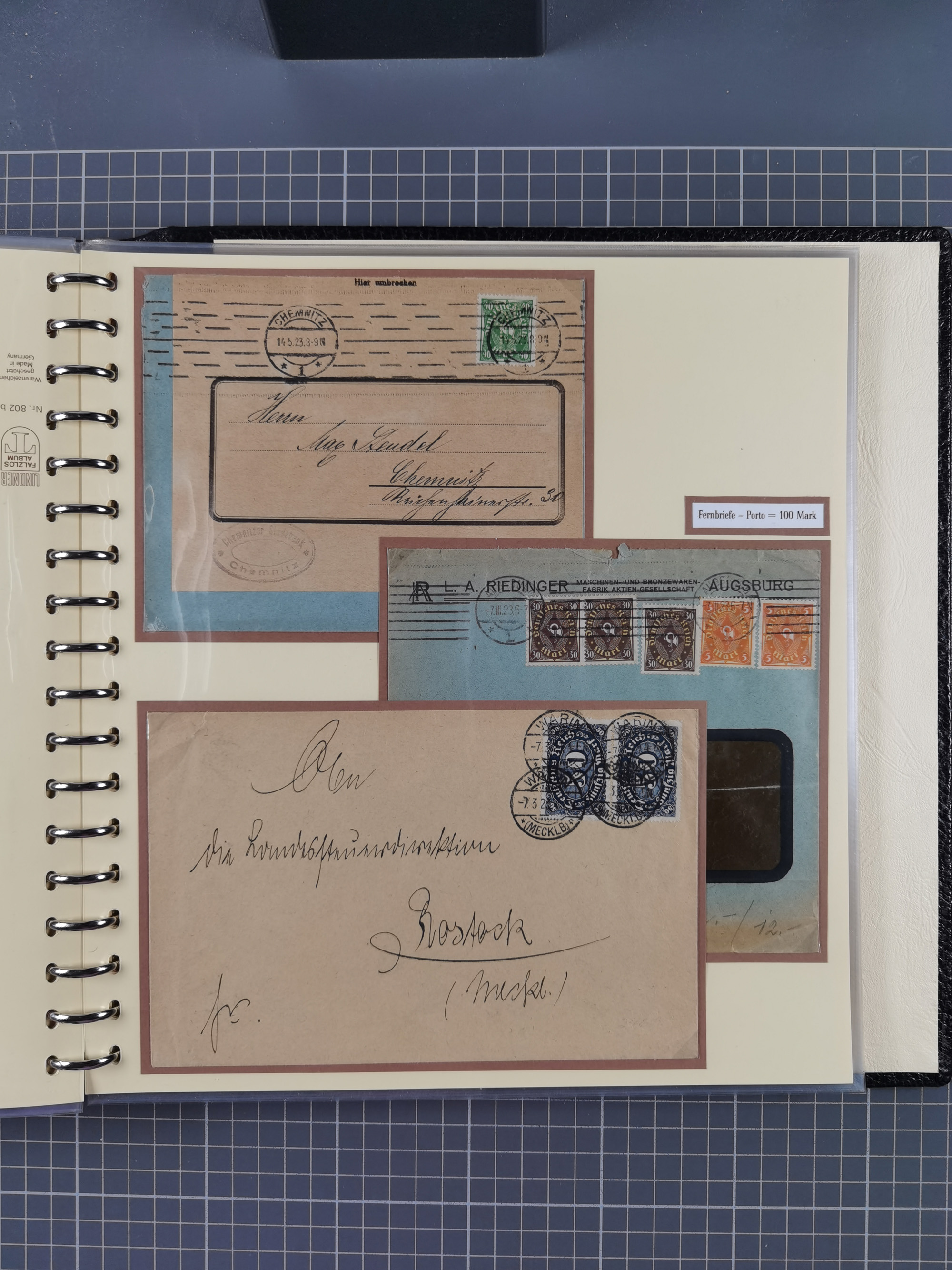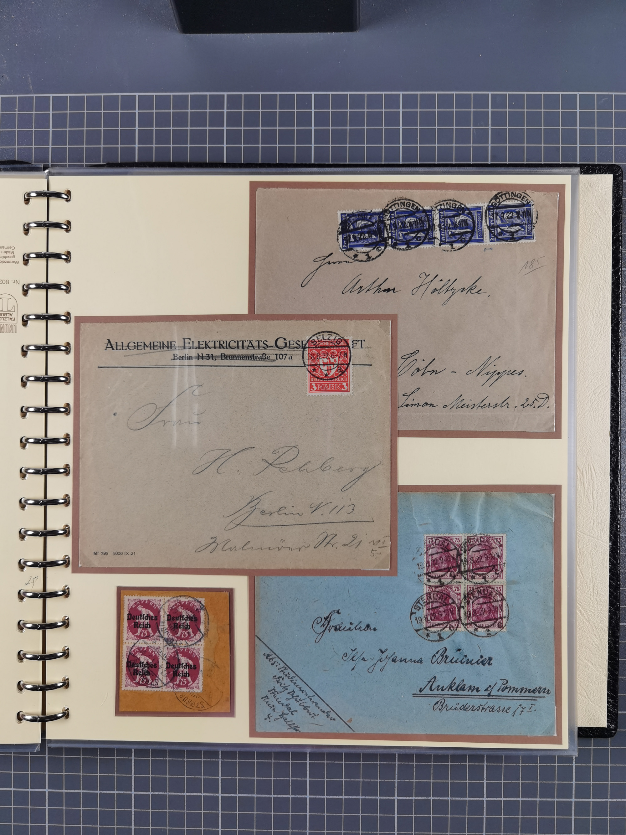 1872/1923, umfangreiche Sammlung mit ca. 800 Briefen,Karten und Ganzsachen. Am Anfang mit kleinem Teil “Hufeisentstempel”, ansonsten liegt der Schwerpunkt bei Infla mit Einzel- und Mehrfachfrankaturen, R-Briefen, Auslandspost, viel Hochinflation mit Dezember-Briefen und Portostufen. Alles auf selbst gestalteten Albenblättern in10 Alben