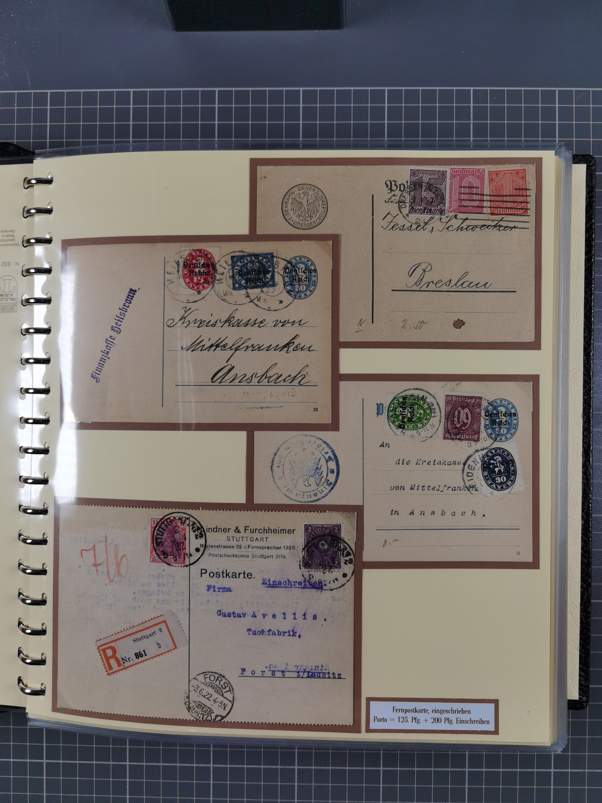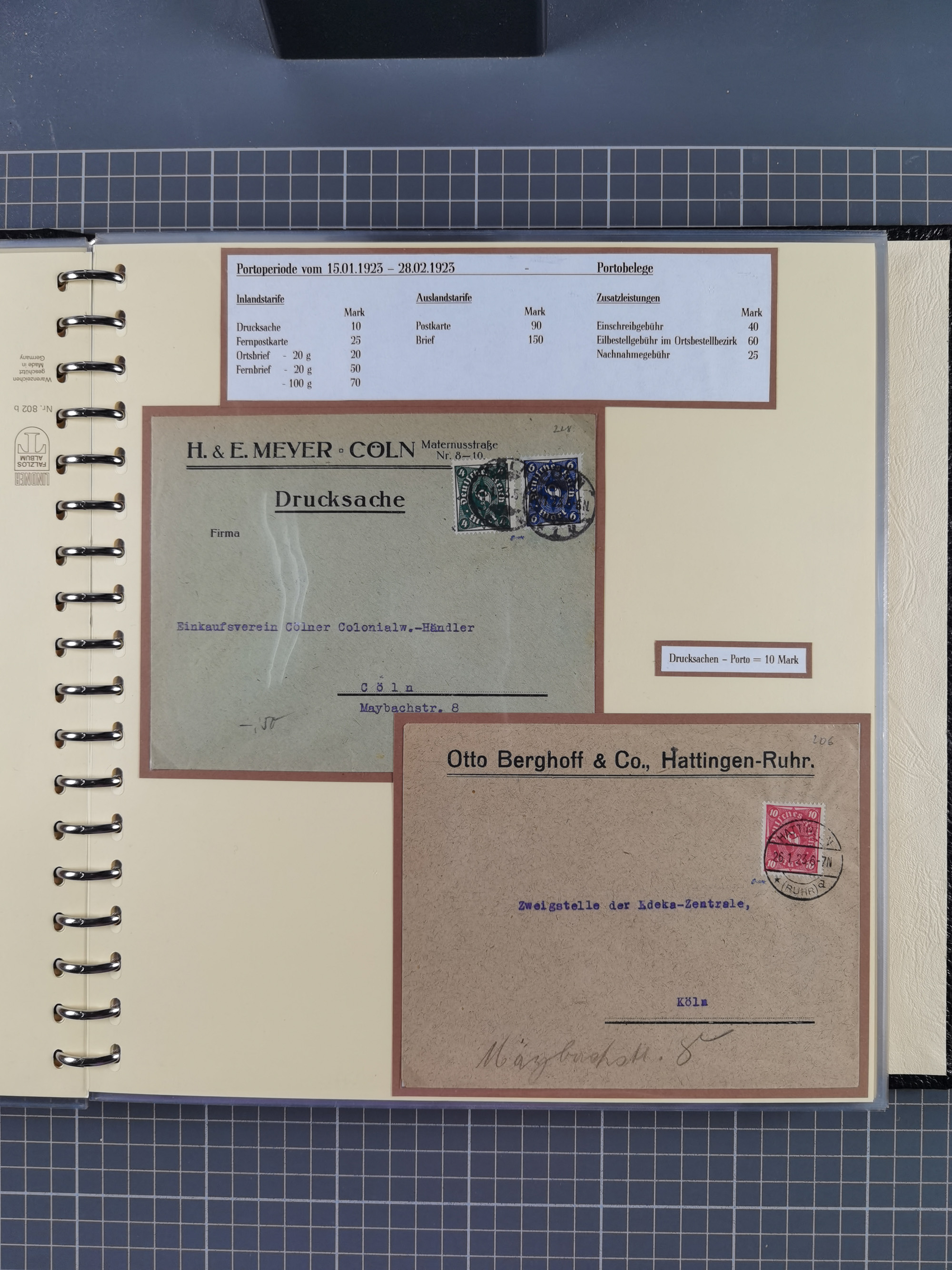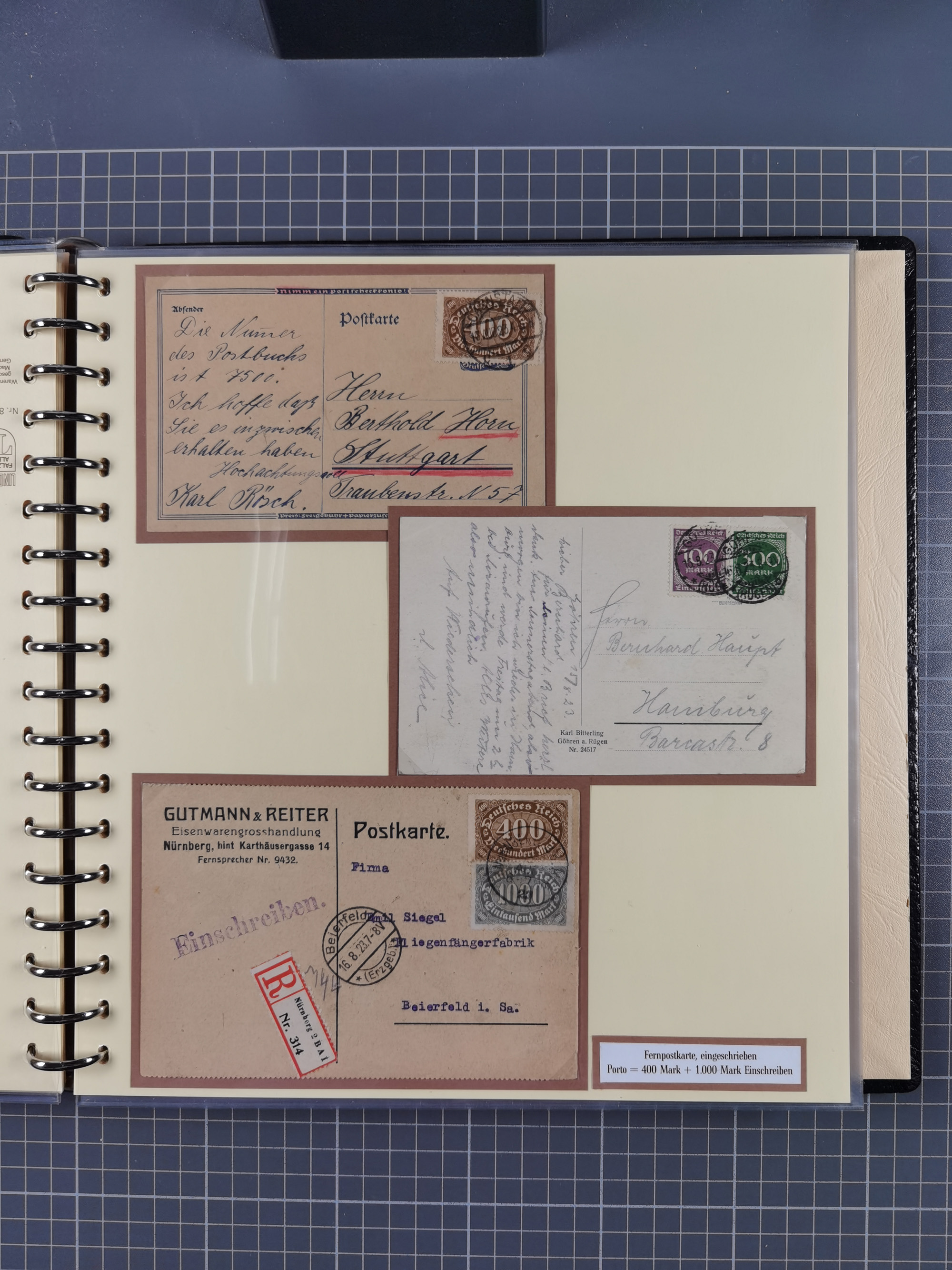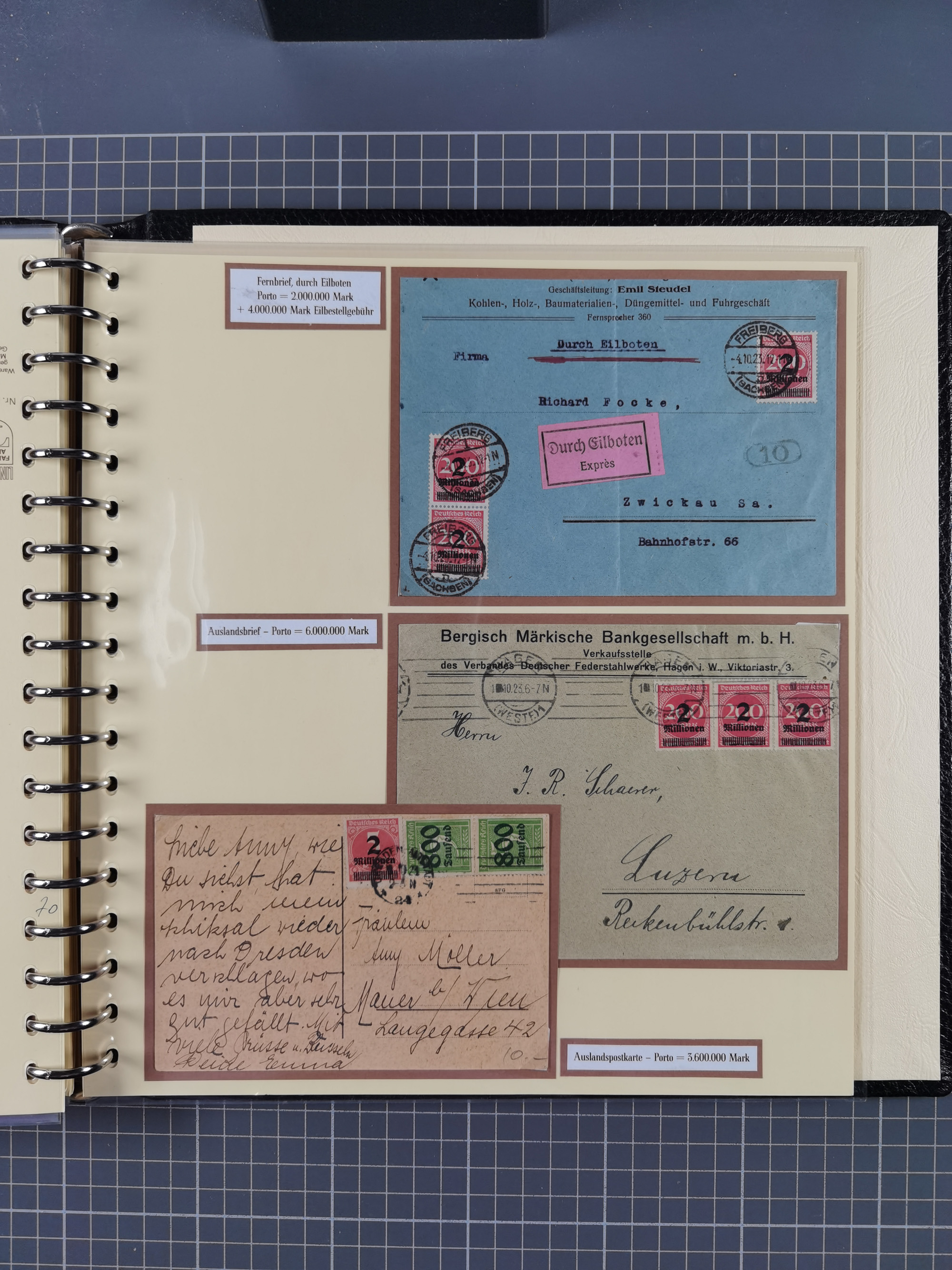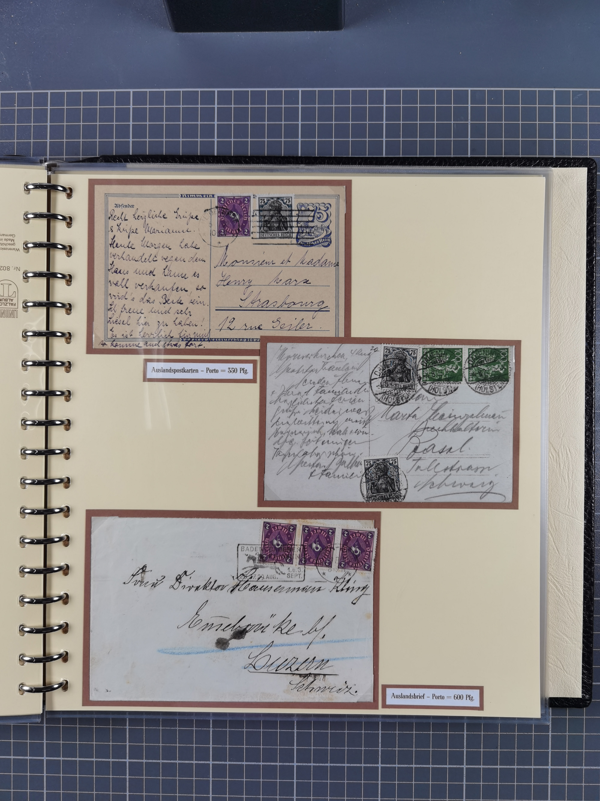 1872/1923, umfangreiche Sammlung mit ca. 800 Briefen,Karten und Ganzsachen. Am Anfang mit kleinem Teil “Hufeisentstempel”, ansonsten liegt der Schwerpunkt bei Infla mit Einzel- und Mehrfachfrankaturen, R-Briefen, Auslandspost, viel Hochinflation mit Dezember-Briefen und Portostufen. Alles auf selbst gestalteten Albenblättern in10 Alben
