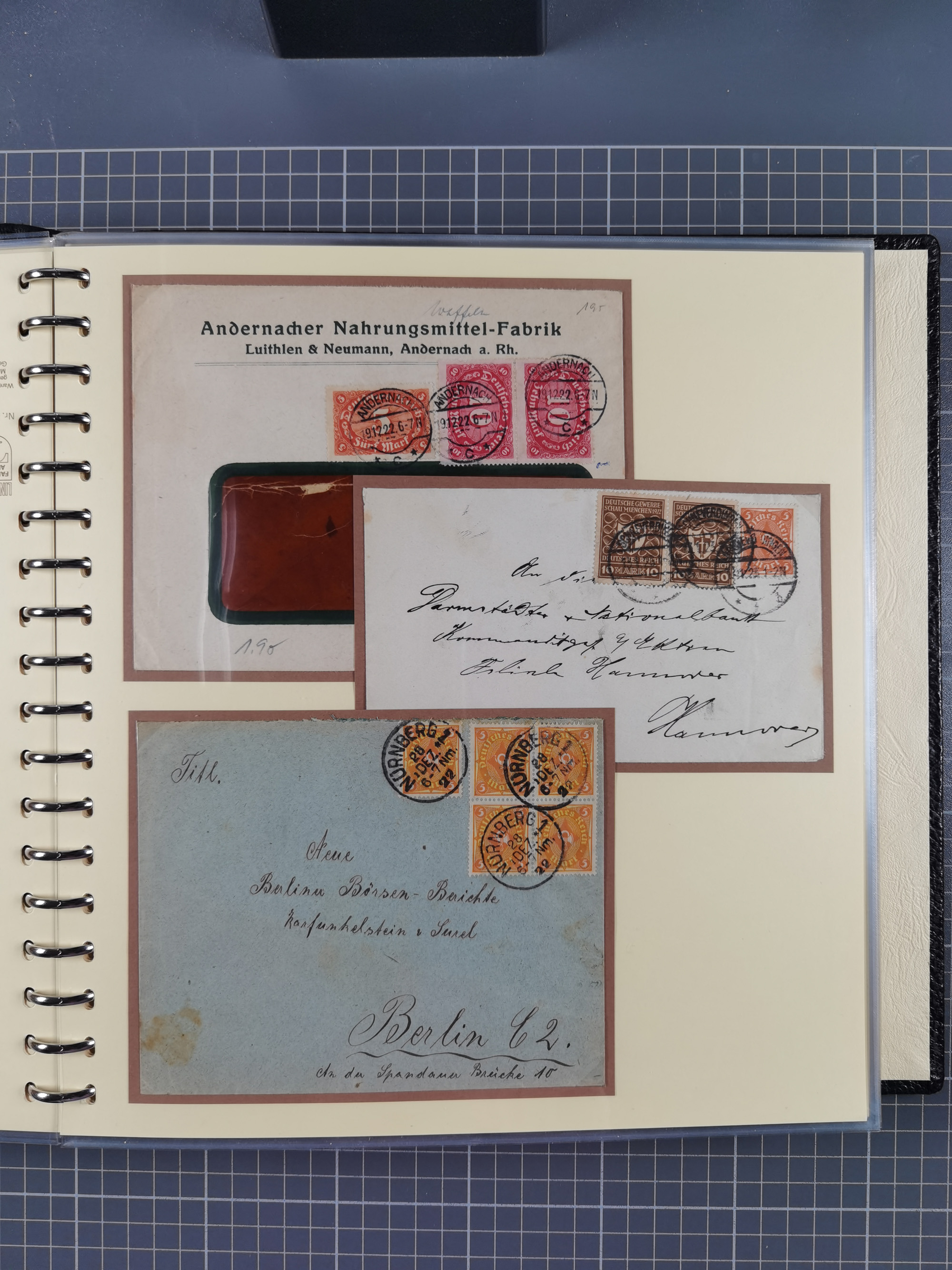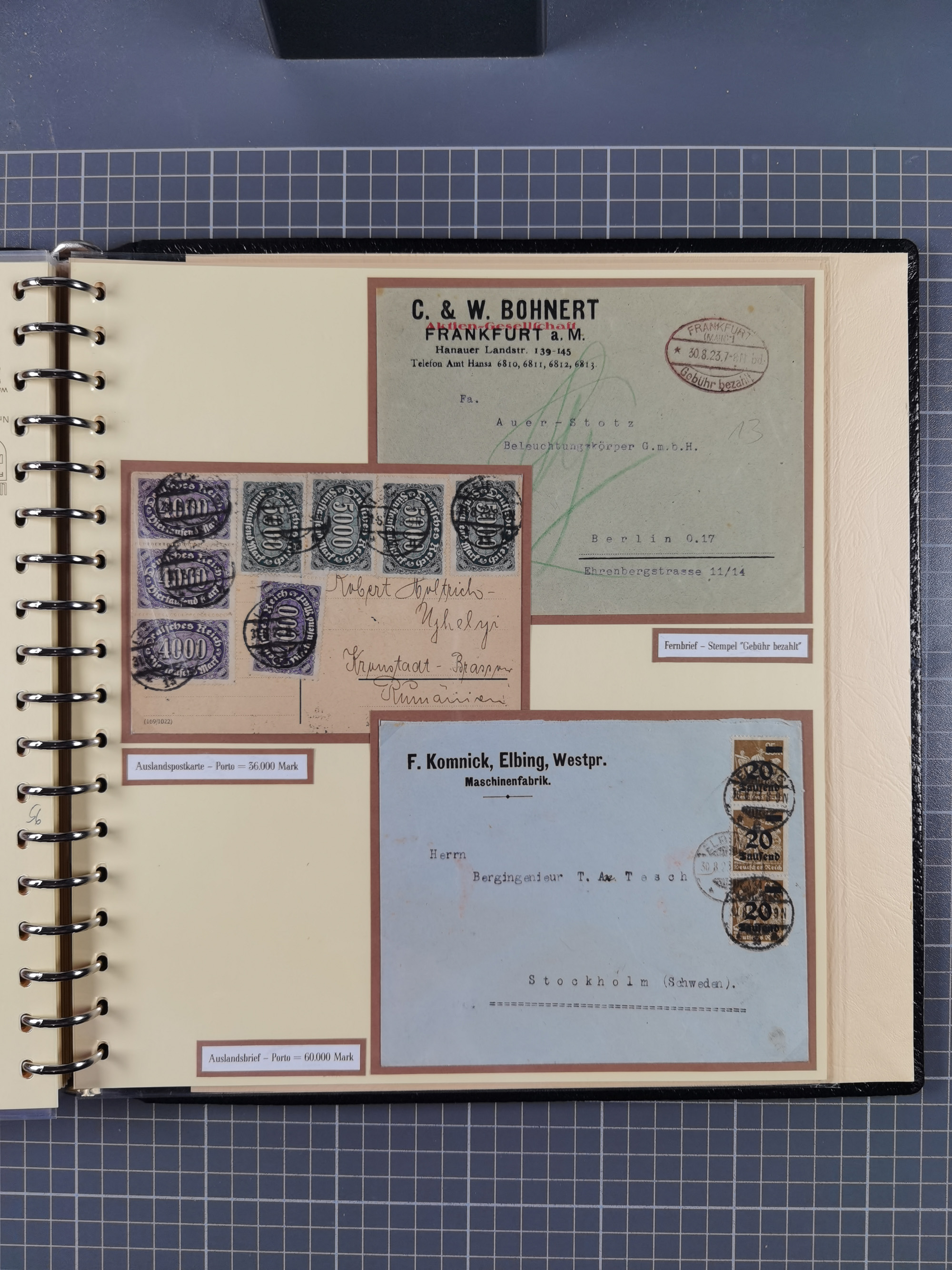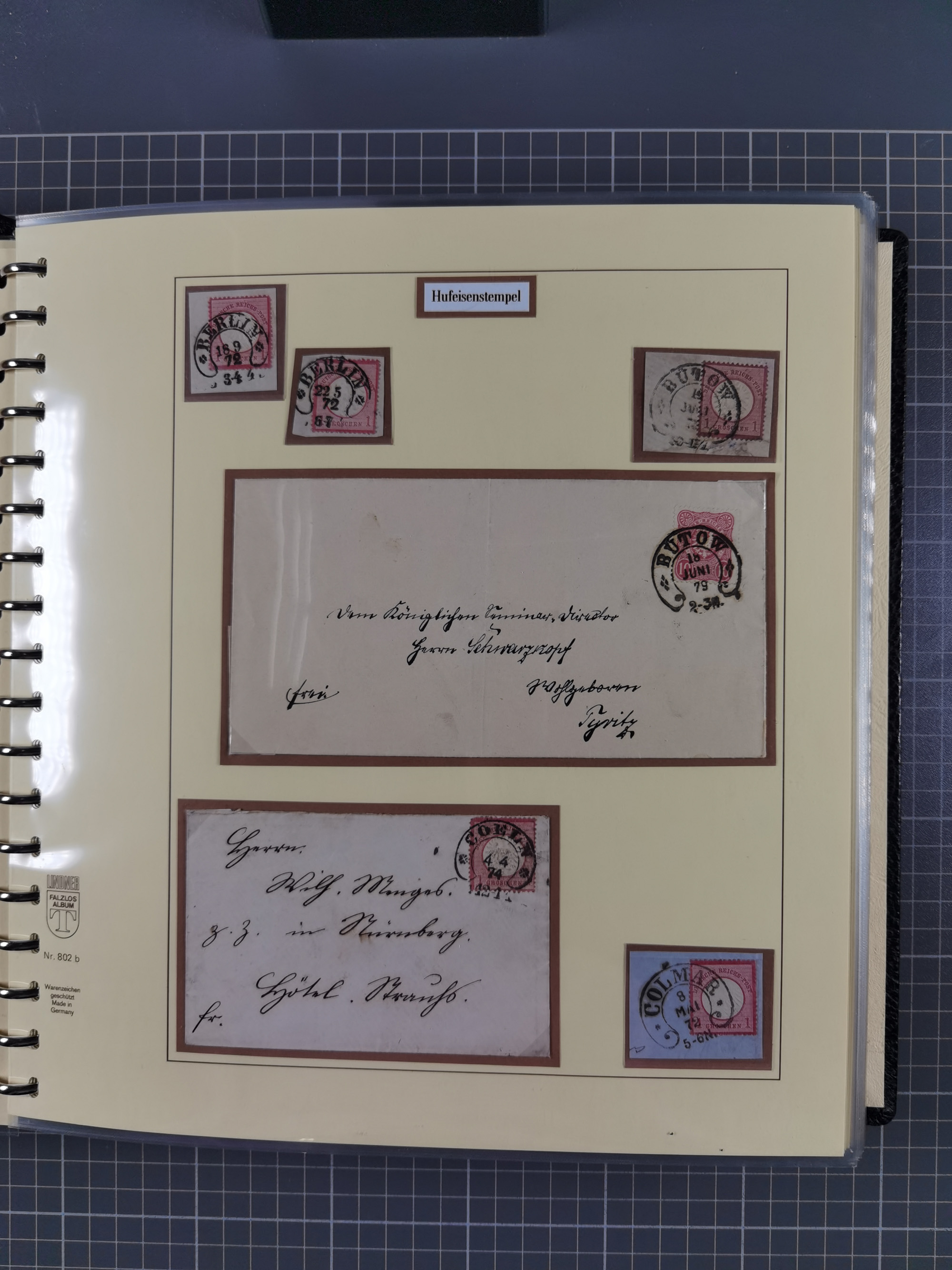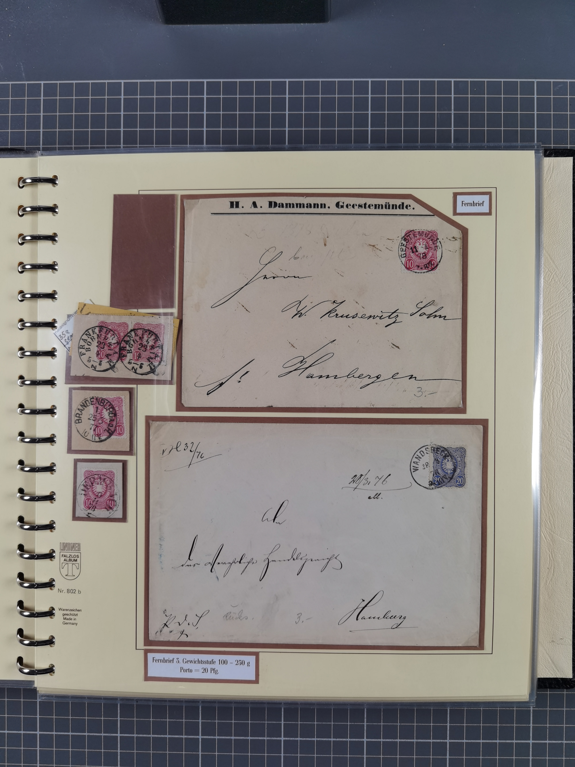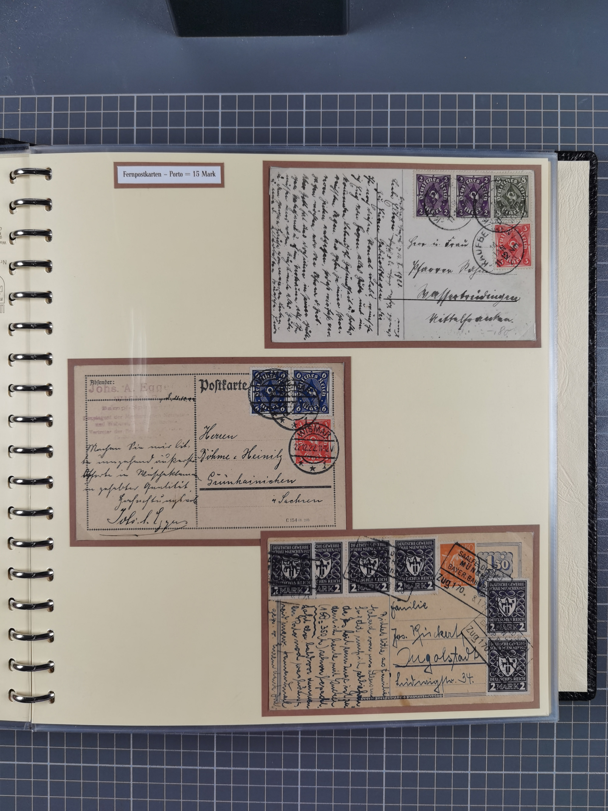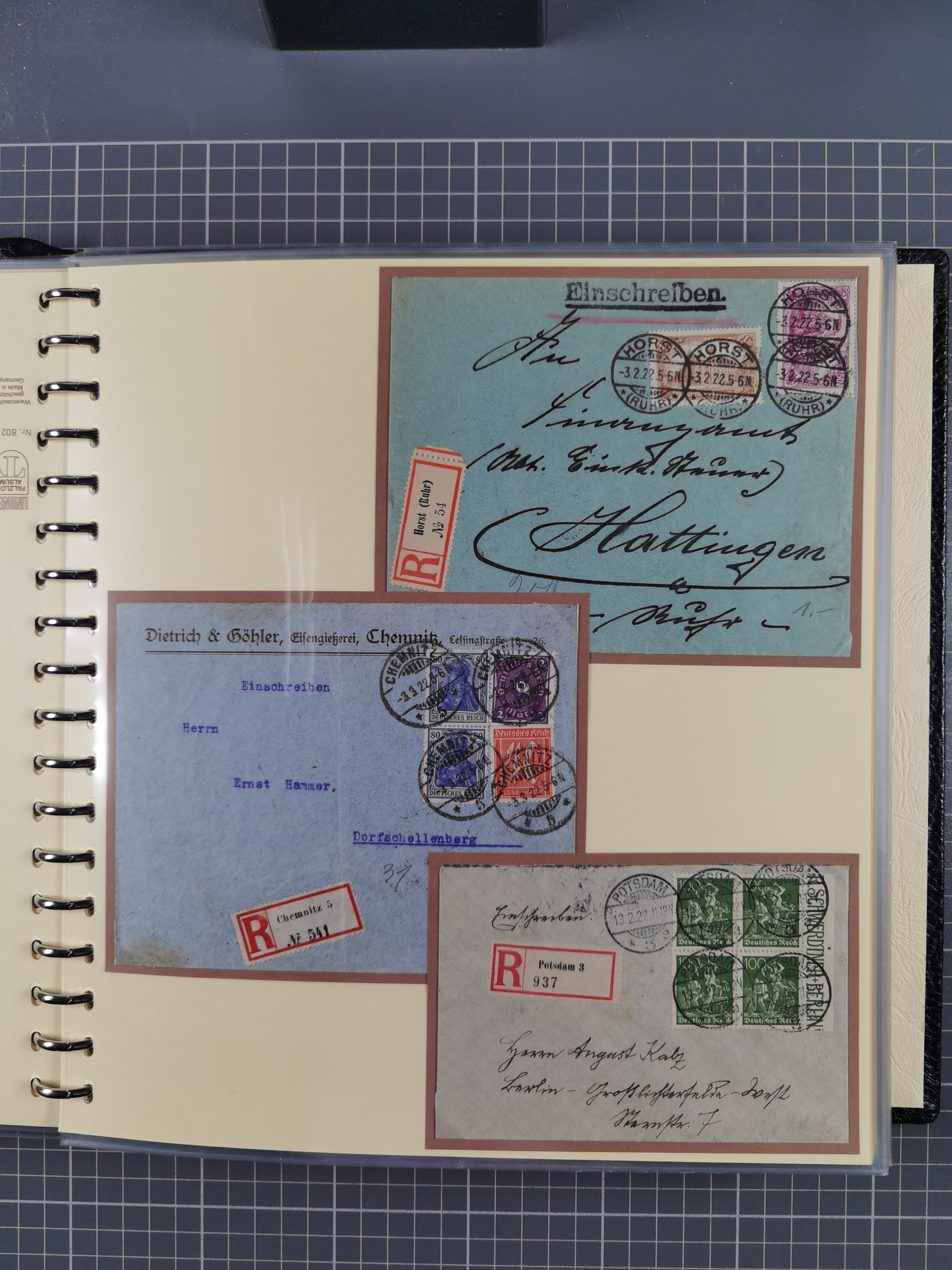 1872/1923, umfangreiche Sammlung mit ca. 800 Briefen,Karten und Ganzsachen. Am Anfang mit kleinem Teil “Hufeisentstempel”, ansonsten liegt der Schwerpunkt bei Infla mit Einzel- und Mehrfachfrankaturen, R-Briefen, Auslandspost, viel Hochinflation mit Dezember-Briefen und Portostufen. Alles auf selbst gestalteten Albenblättern in10 Alben