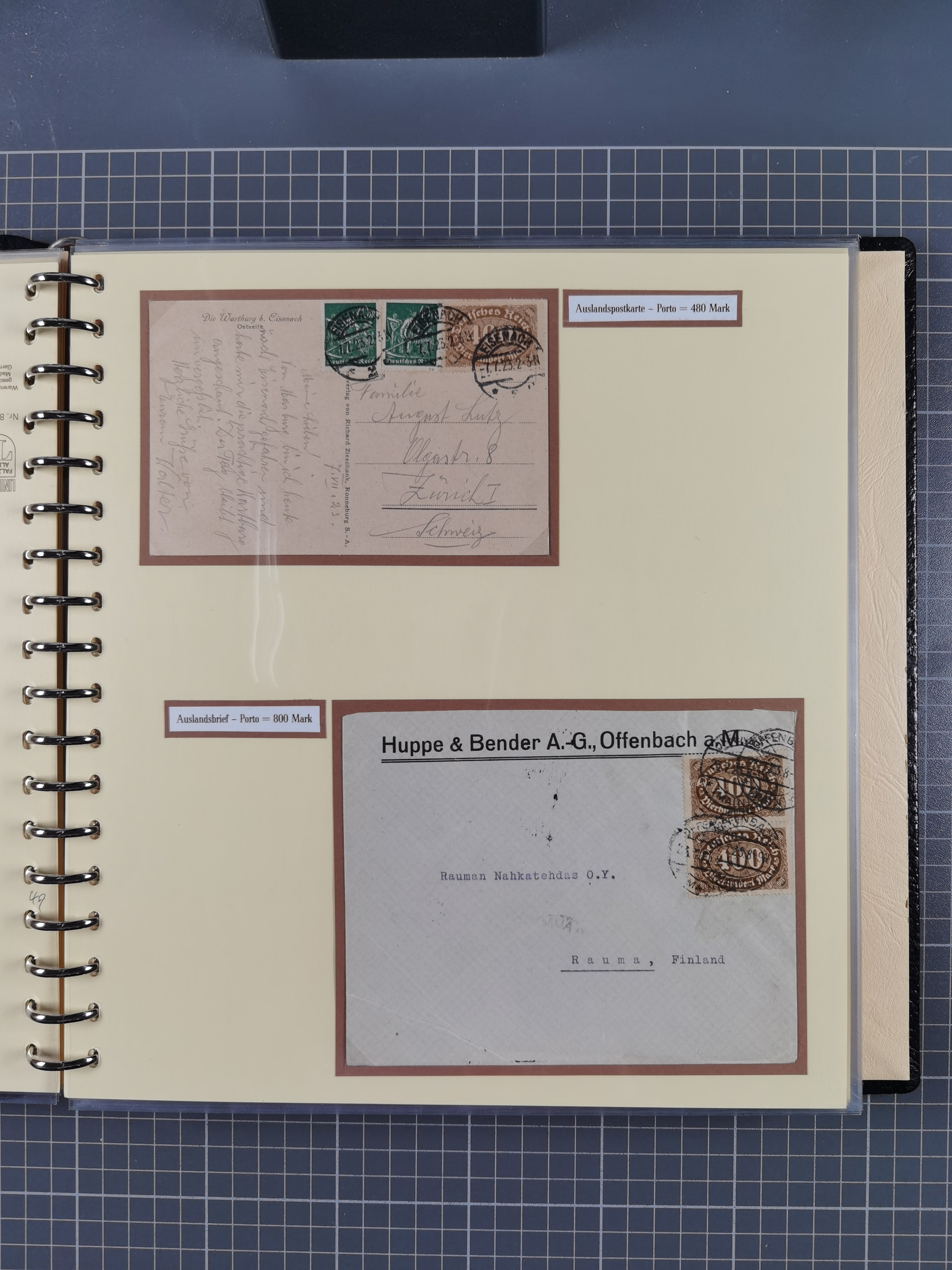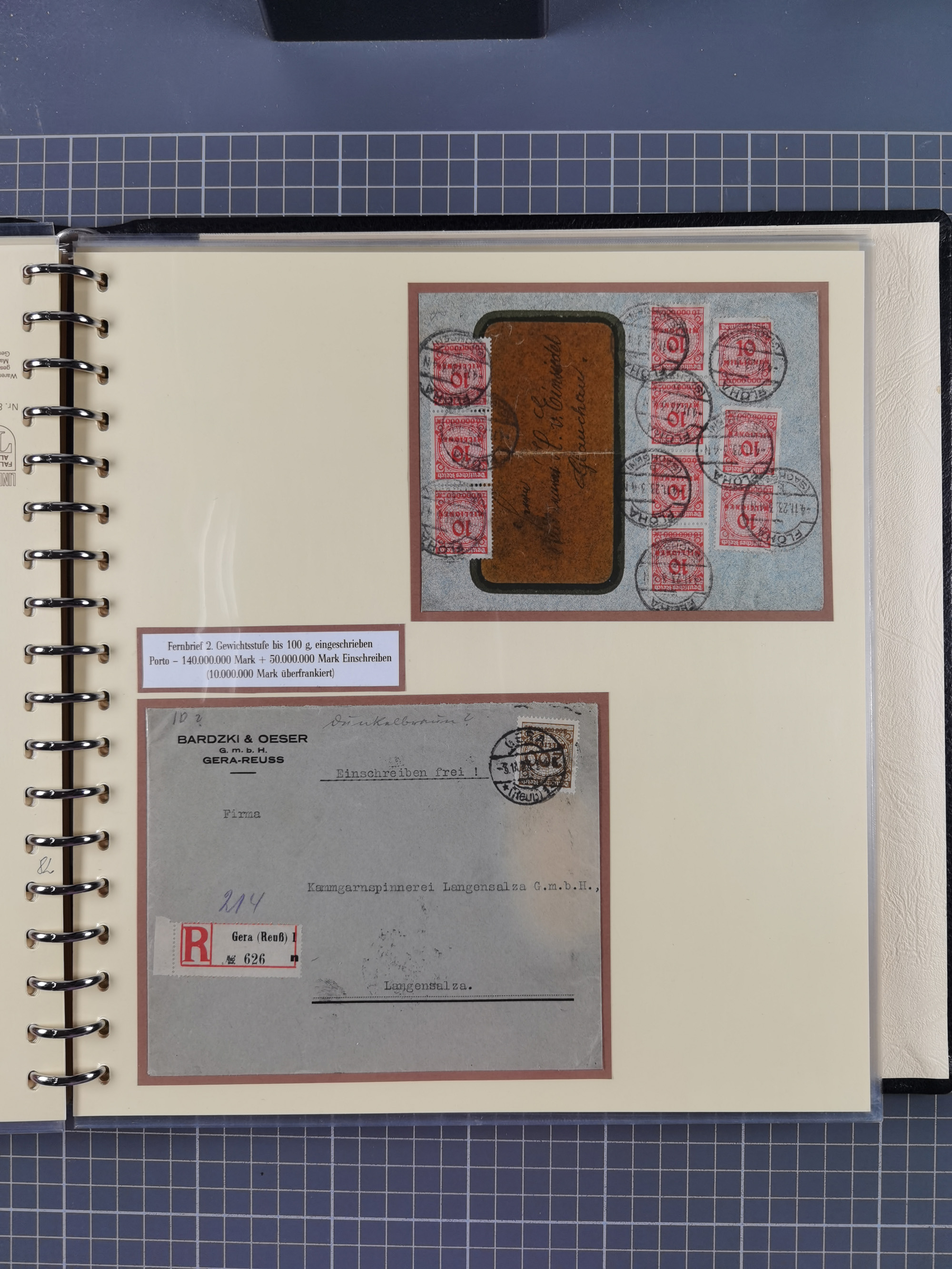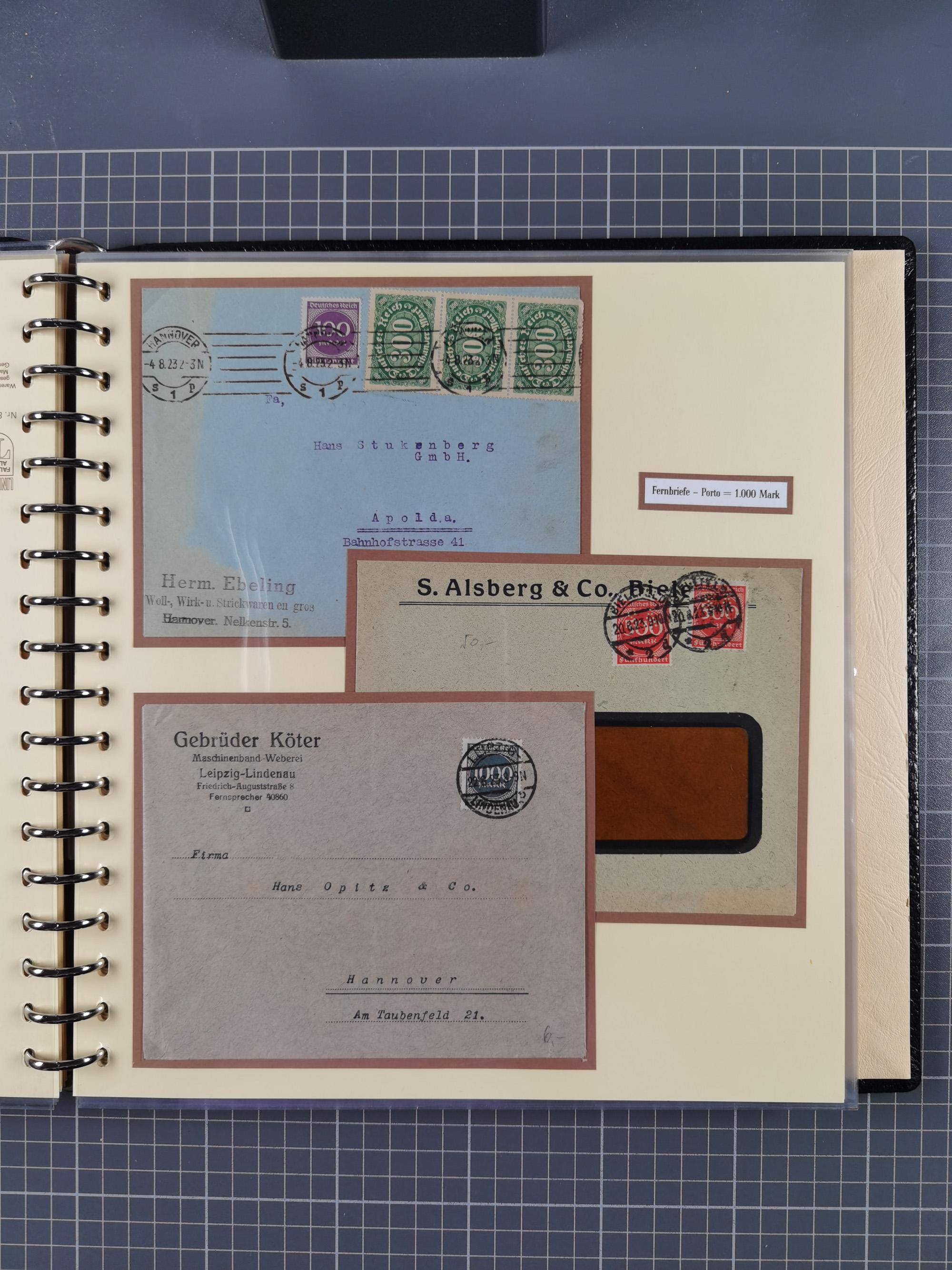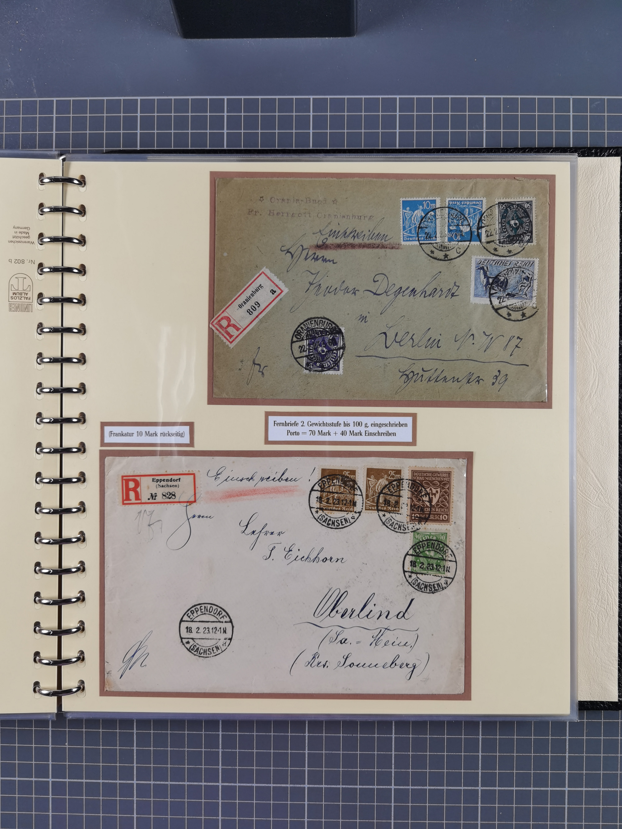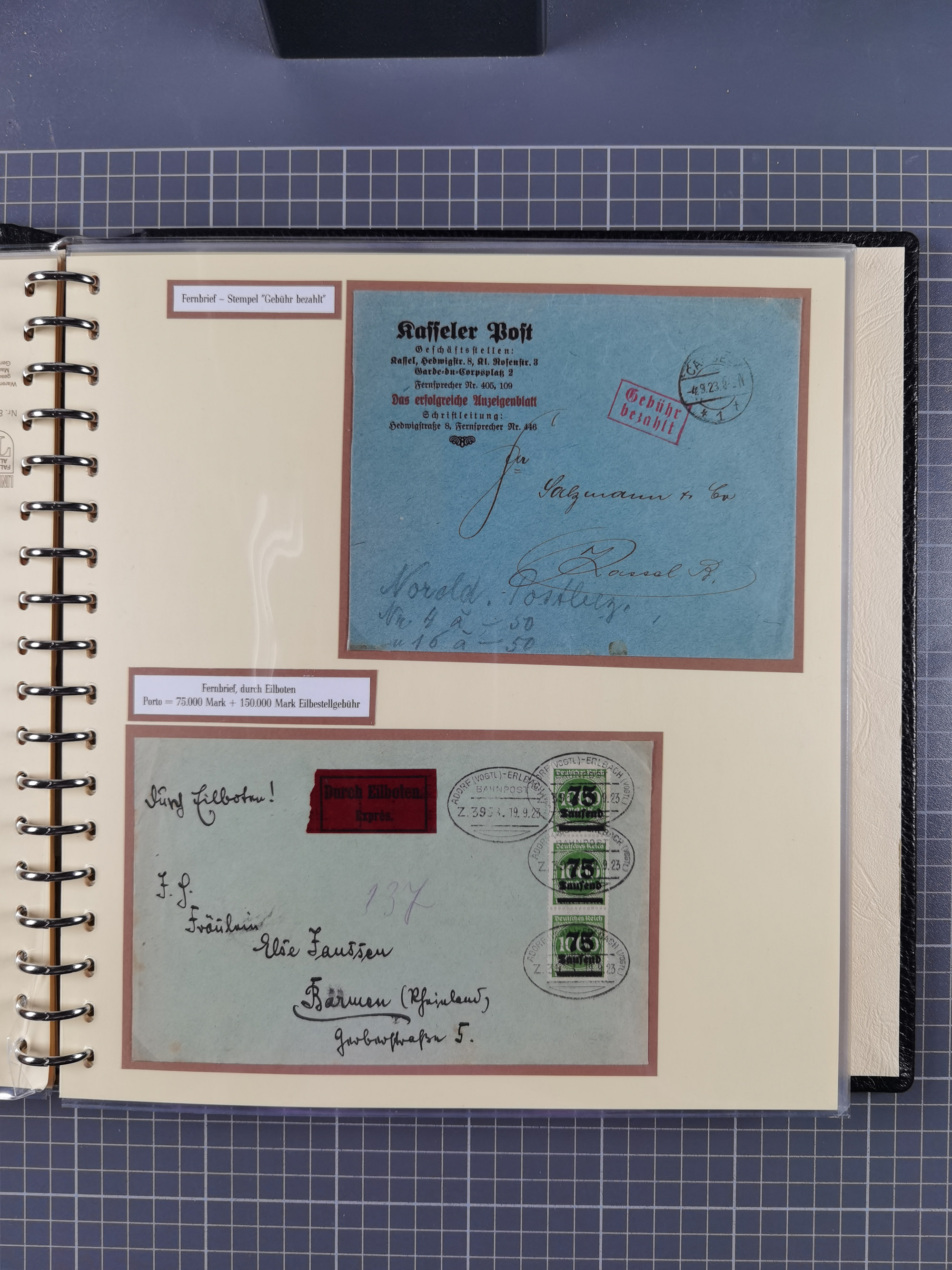 1872/1923, umfangreiche Sammlung mit ca. 800 Briefen,Karten und Ganzsachen. Am Anfang mit kleinem Teil “Hufeisentstempel”, ansonsten liegt der Schwerpunkt bei Infla mit Einzel- und Mehrfachfrankaturen, R-Briefen, Auslandspost, viel Hochinflation mit Dezember-Briefen und Portostufen. Alles auf selbst gestalteten Albenblättern in10 Alben