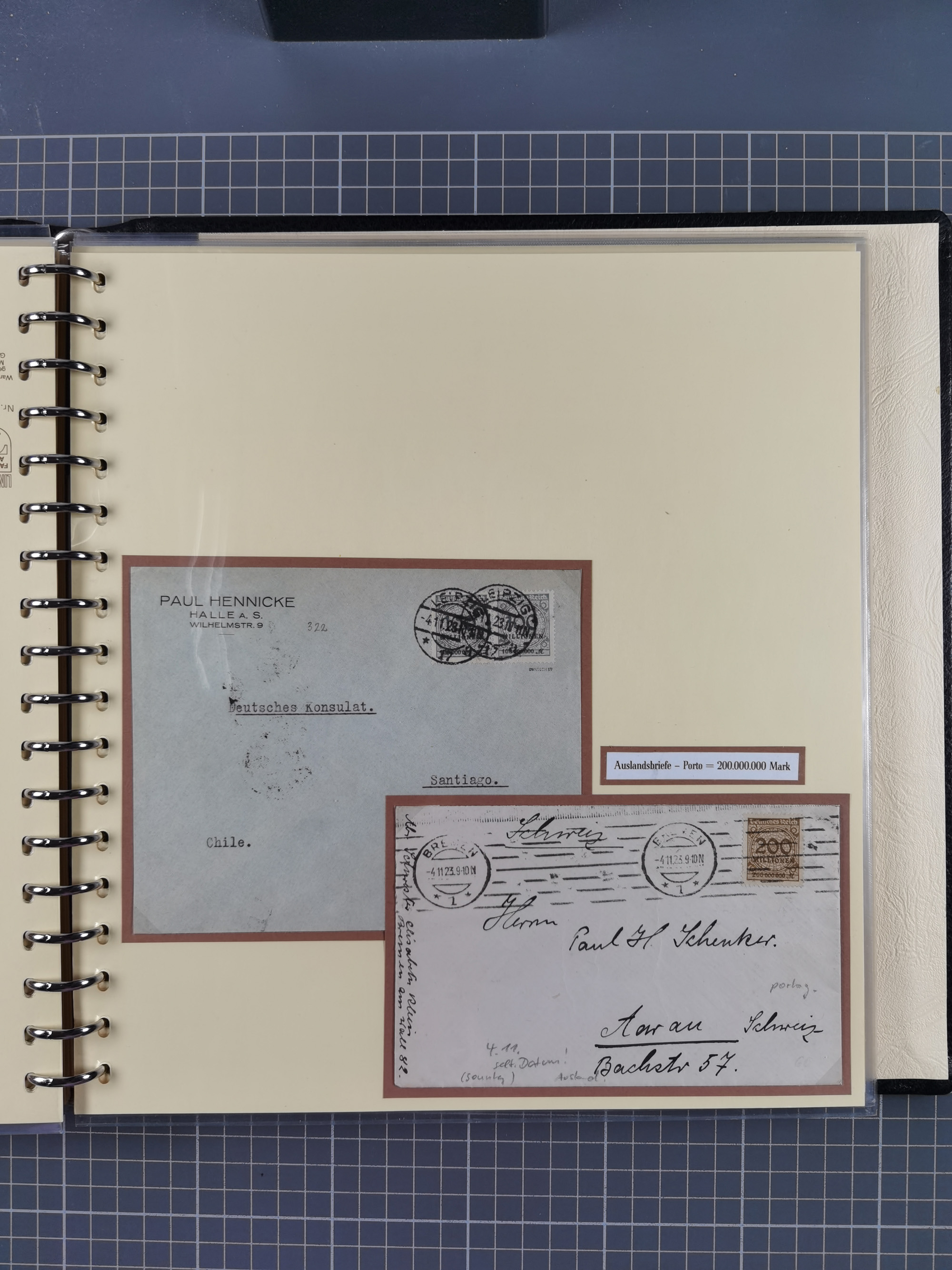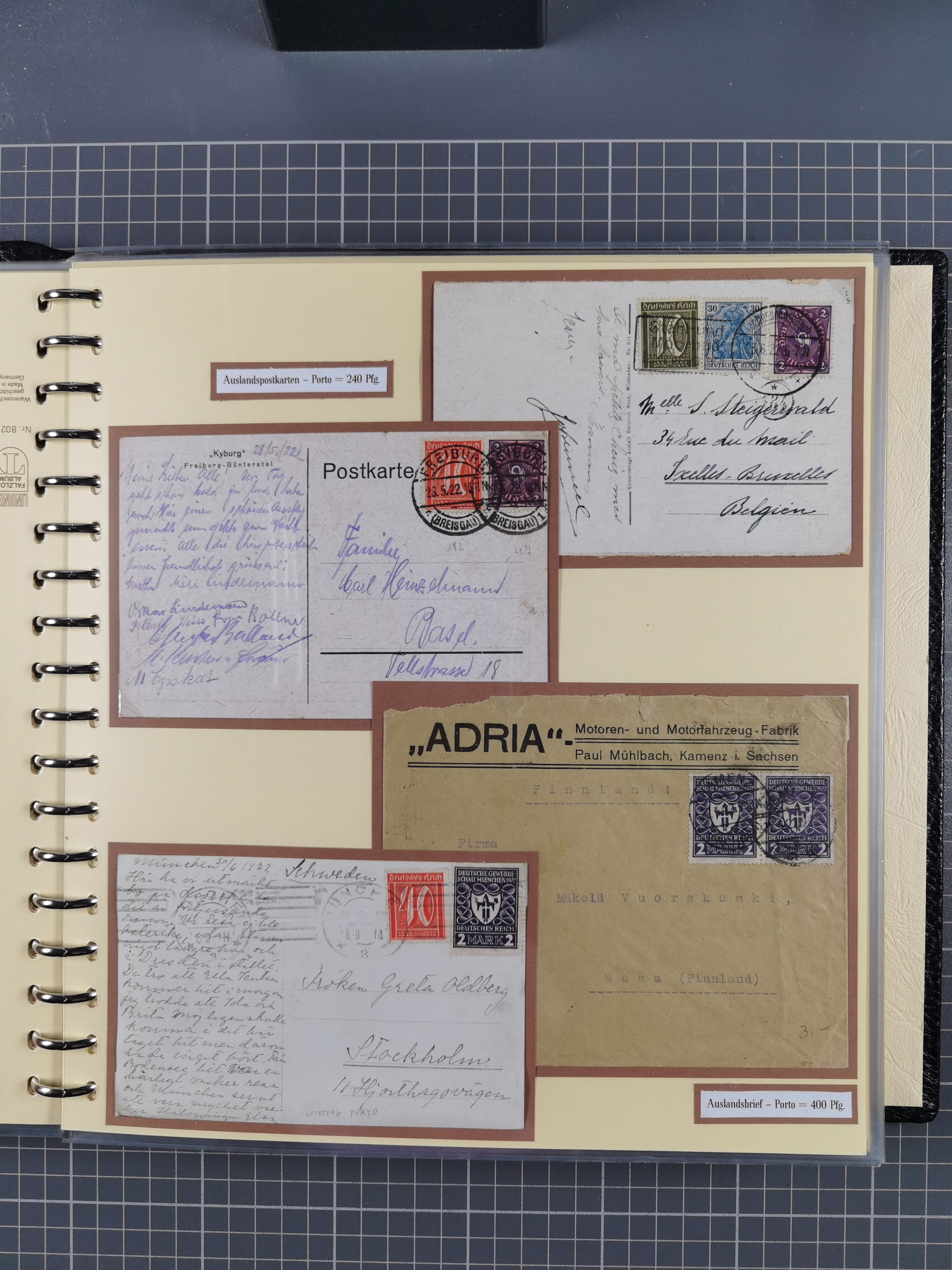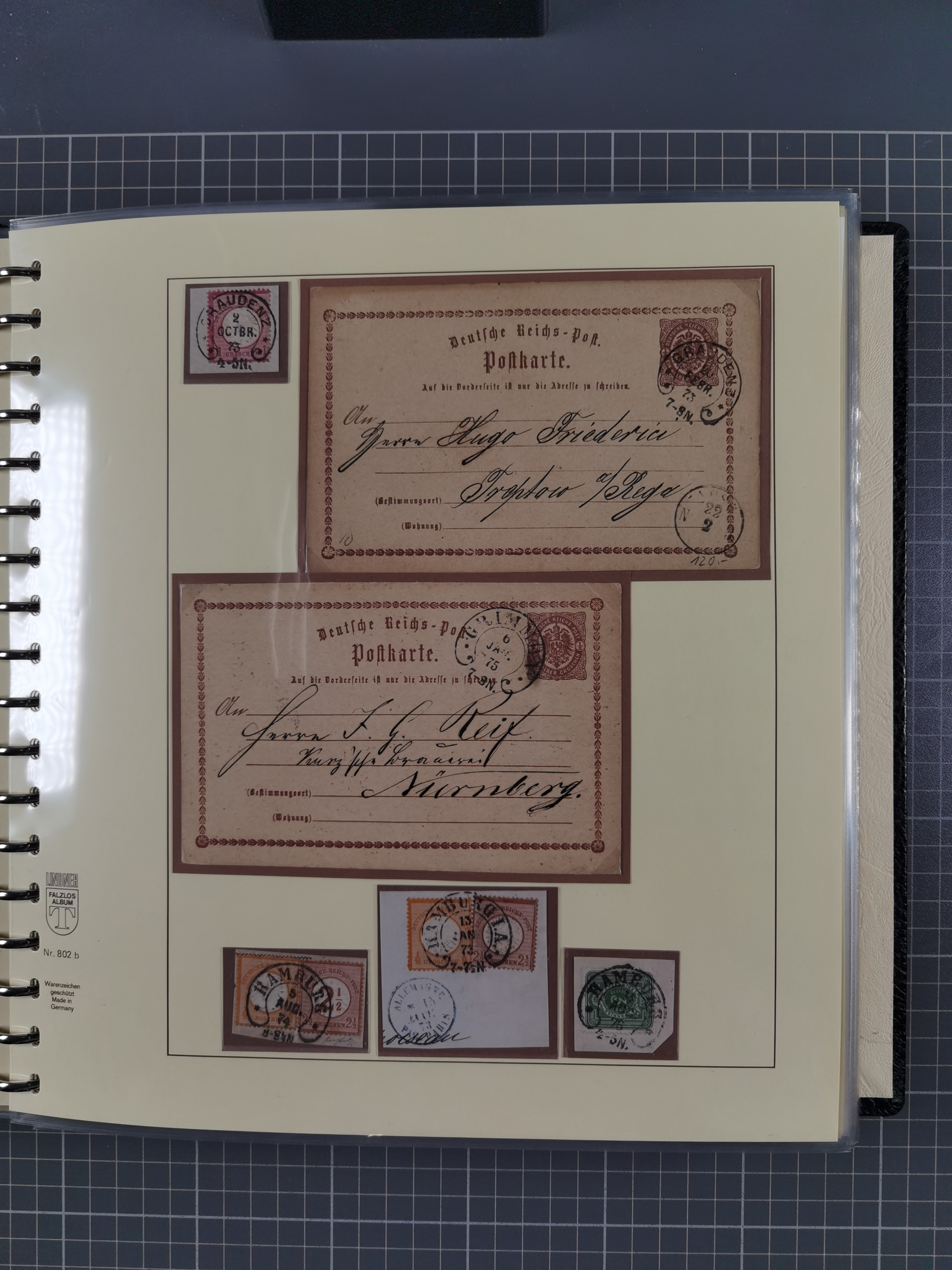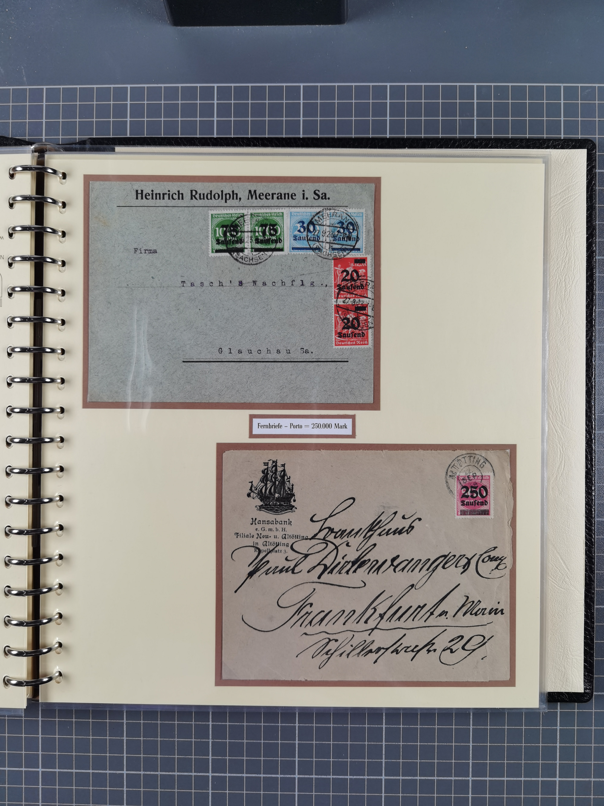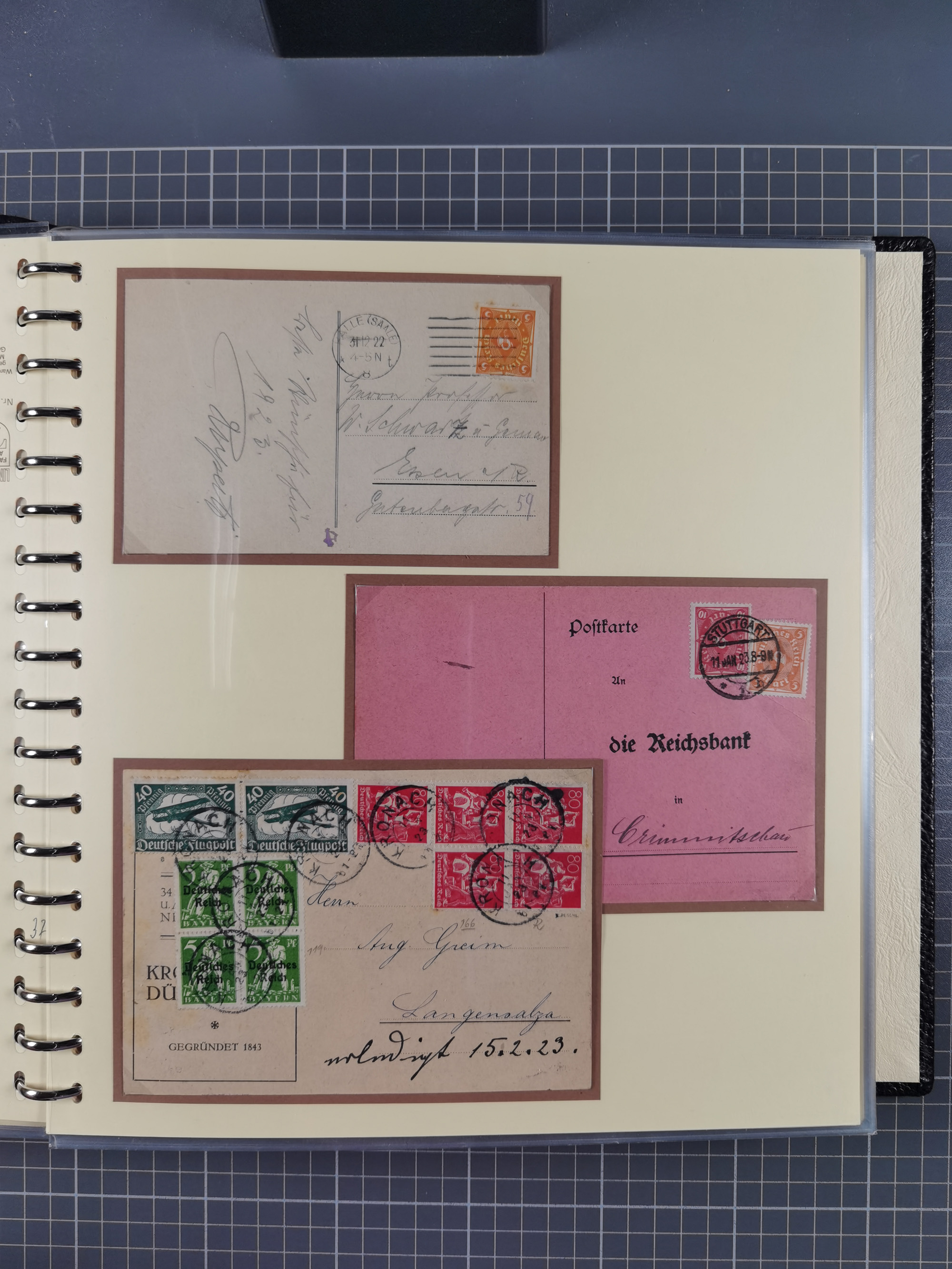 1872/1923, umfangreiche Sammlung mit ca. 800 Briefen,Karten und Ganzsachen. Am Anfang mit kleinem Teil “Hufeisentstempel”, ansonsten liegt der Schwerpunkt bei Infla mit Einzel- und Mehrfachfrankaturen, R-Briefen, Auslandspost, viel Hochinflation mit Dezember-Briefen und Portostufen. Alles auf selbst gestalteten Albenblättern in10 Alben