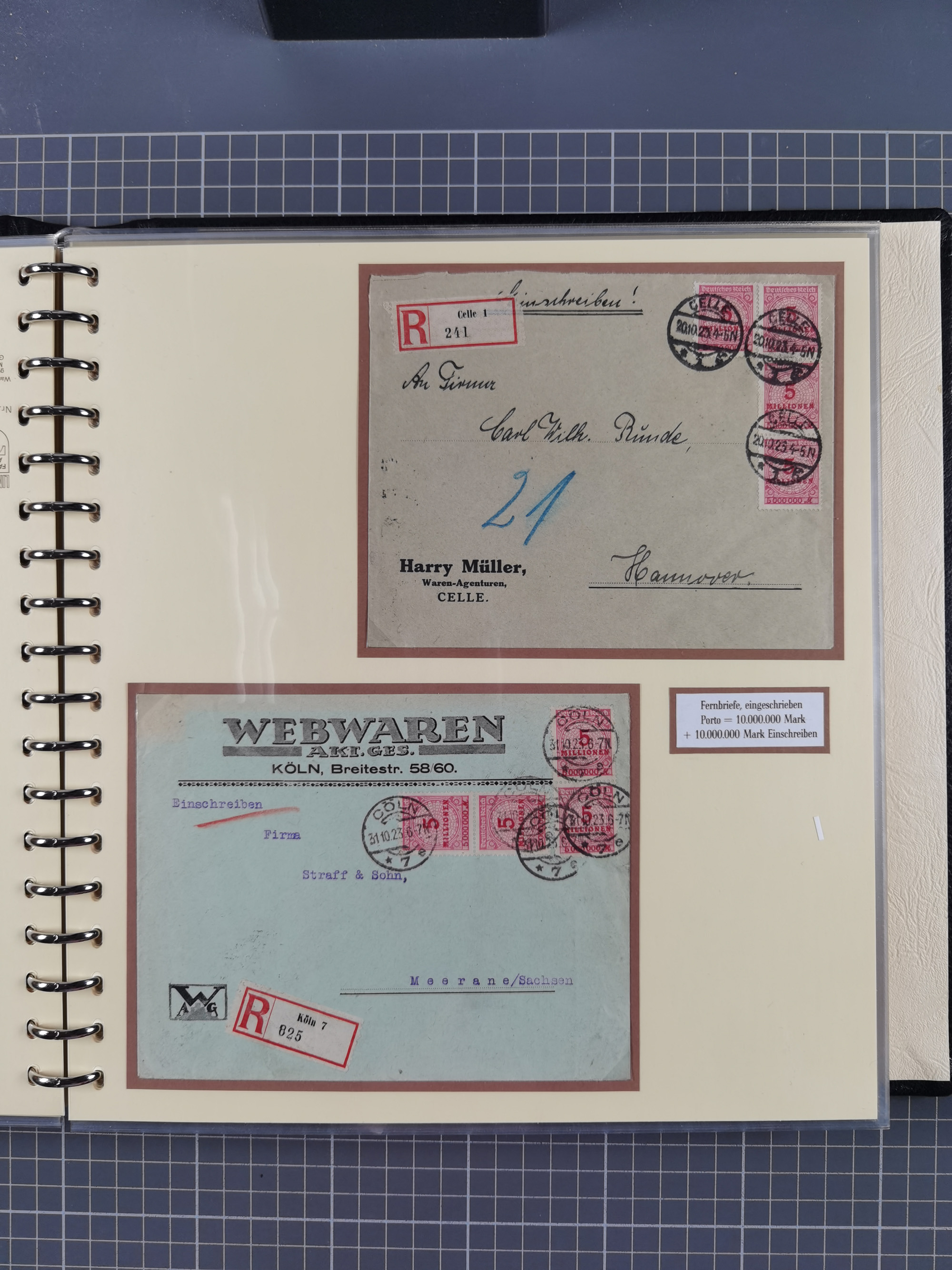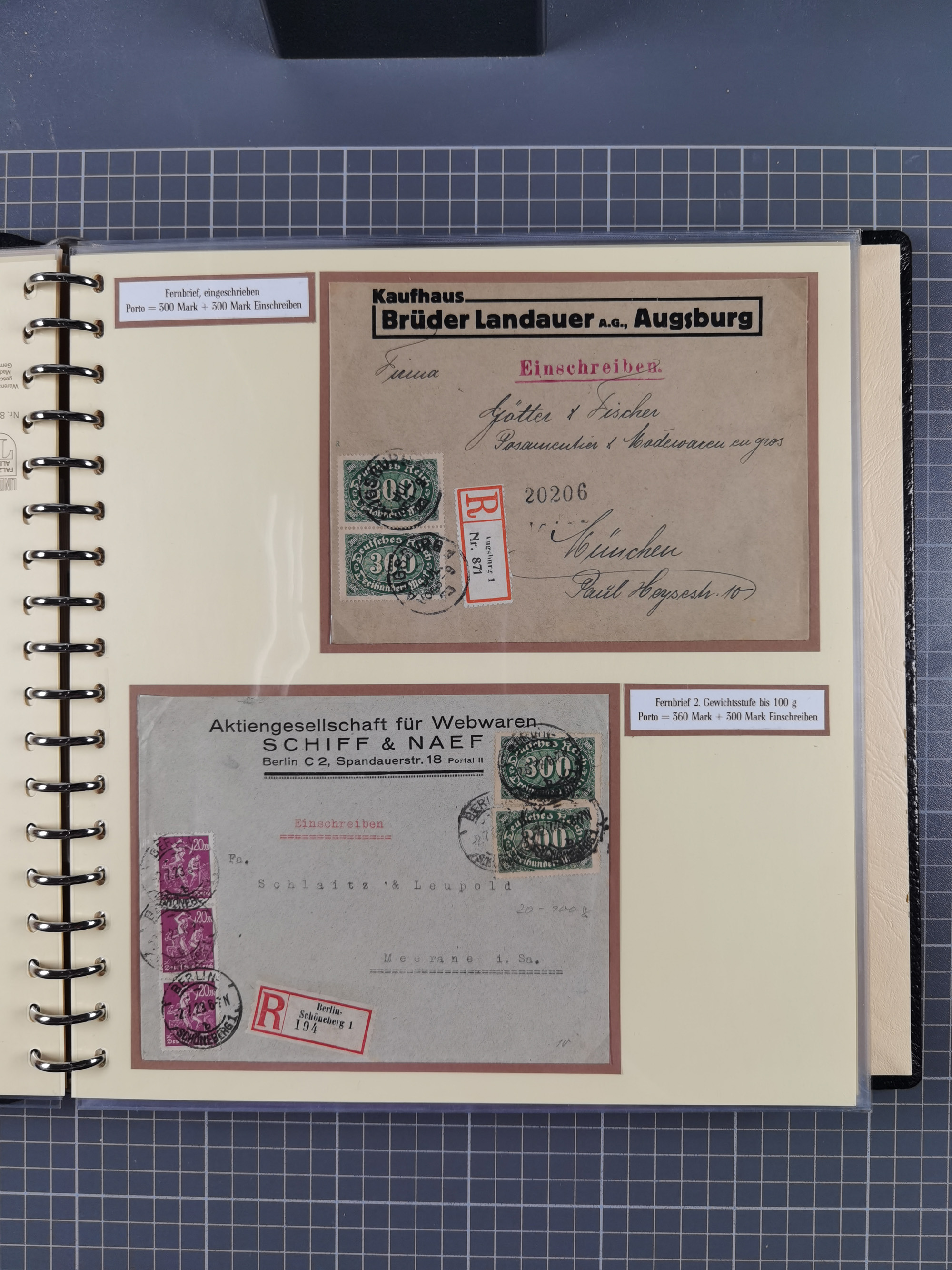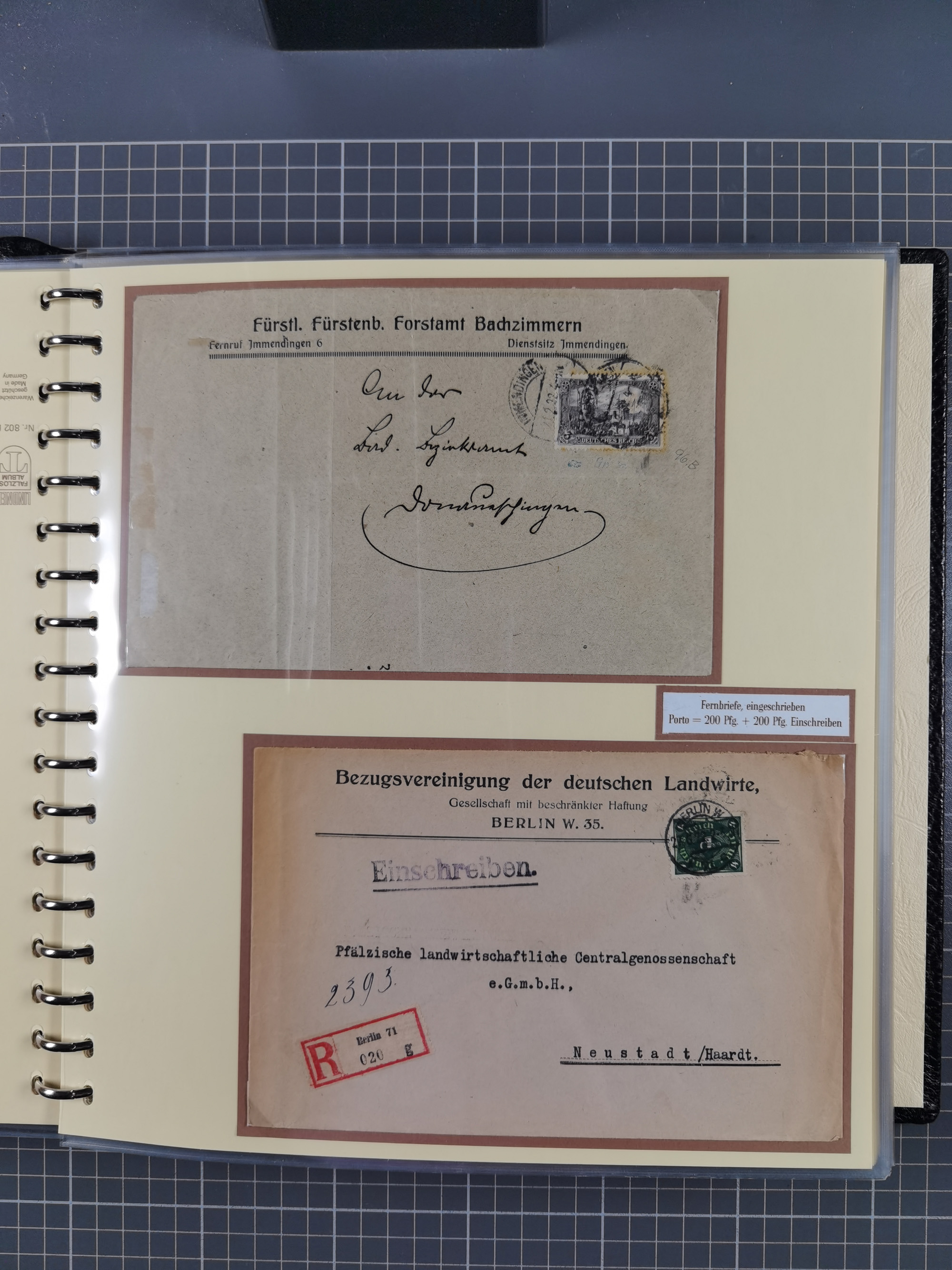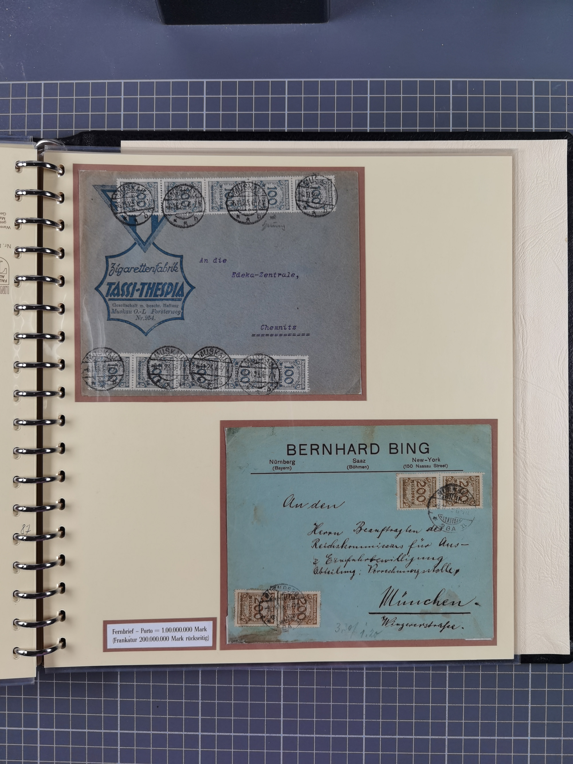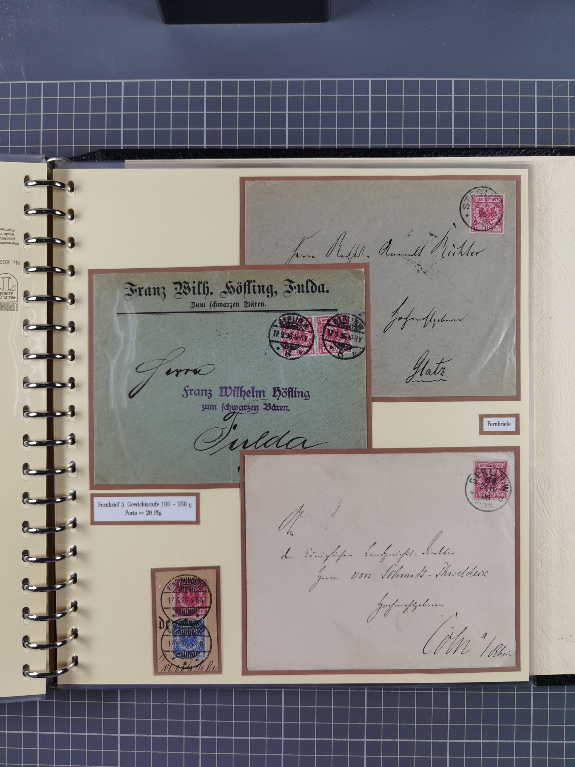 1872/1923, umfangreiche Sammlung mit ca. 800 Briefen,Karten und Ganzsachen. Am Anfang mit kleinem Teil “Hufeisentstempel”, ansonsten liegt der Schwerpunkt bei Infla mit Einzel- und Mehrfachfrankaturen, R-Briefen, Auslandspost, viel Hochinflation mit Dezember-Briefen und Portostufen. Alles auf selbst gestalteten Albenblättern in10 Alben