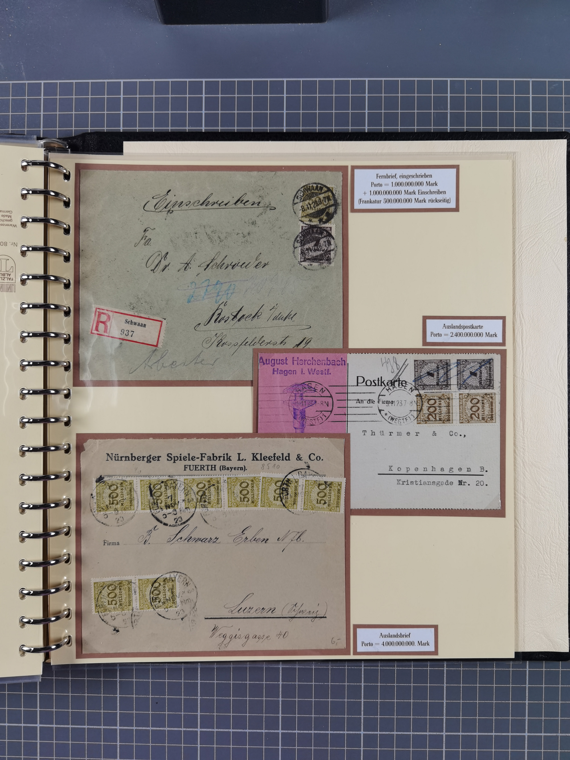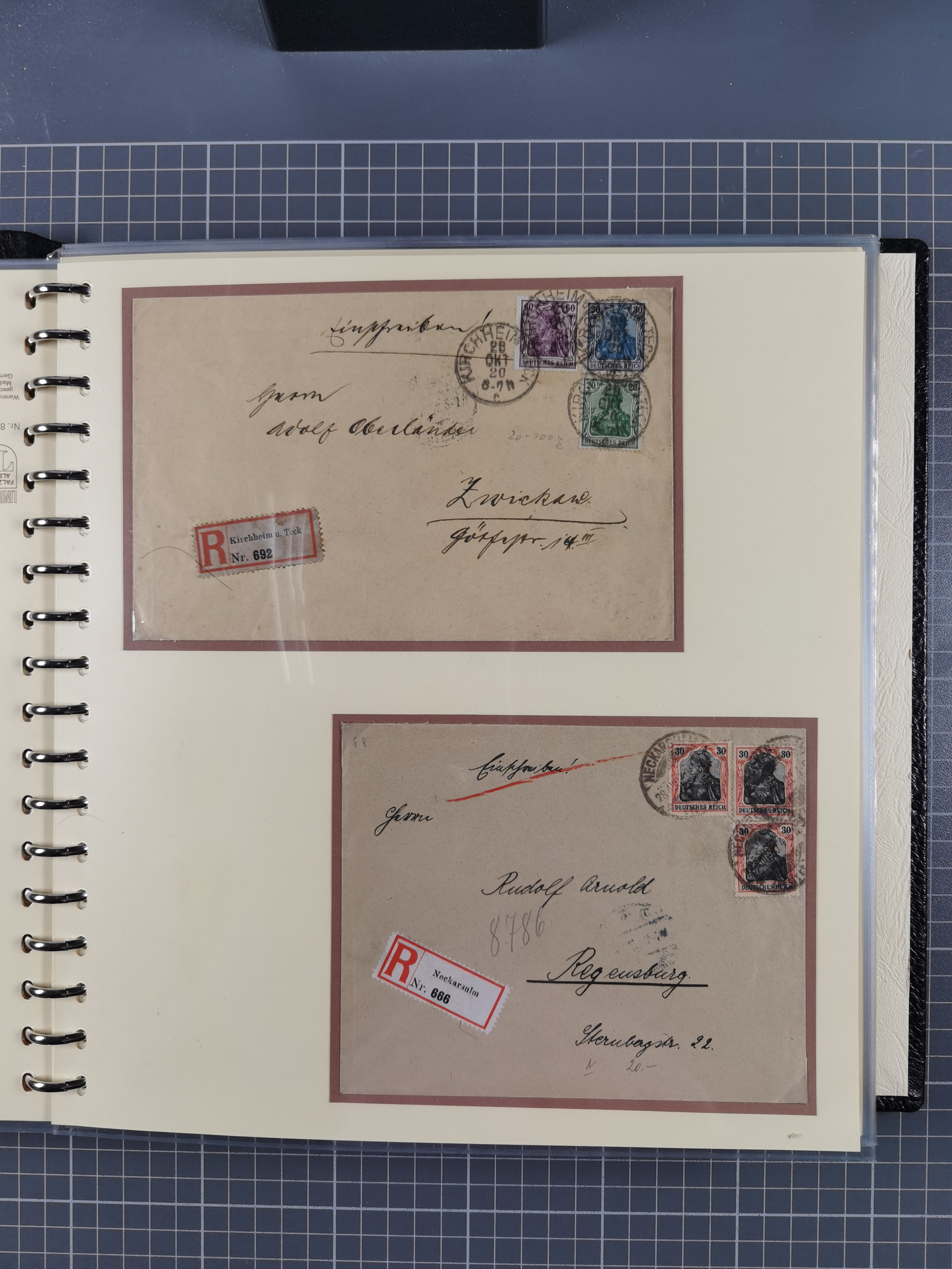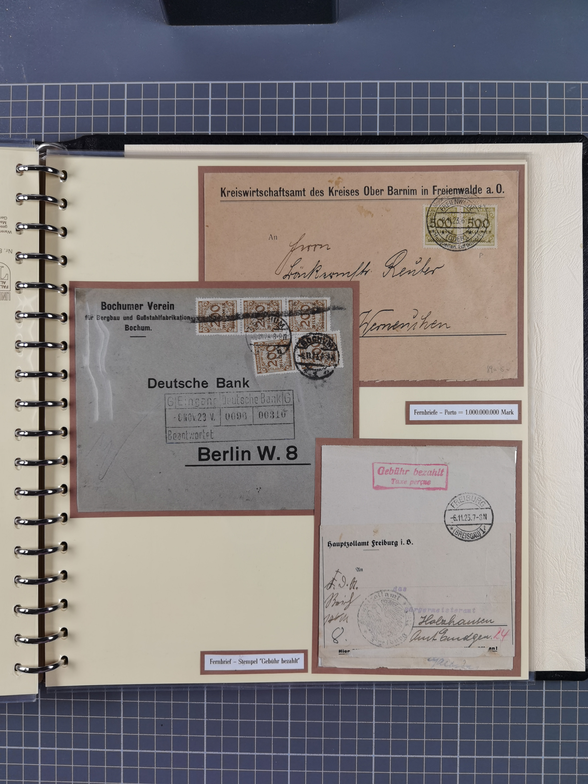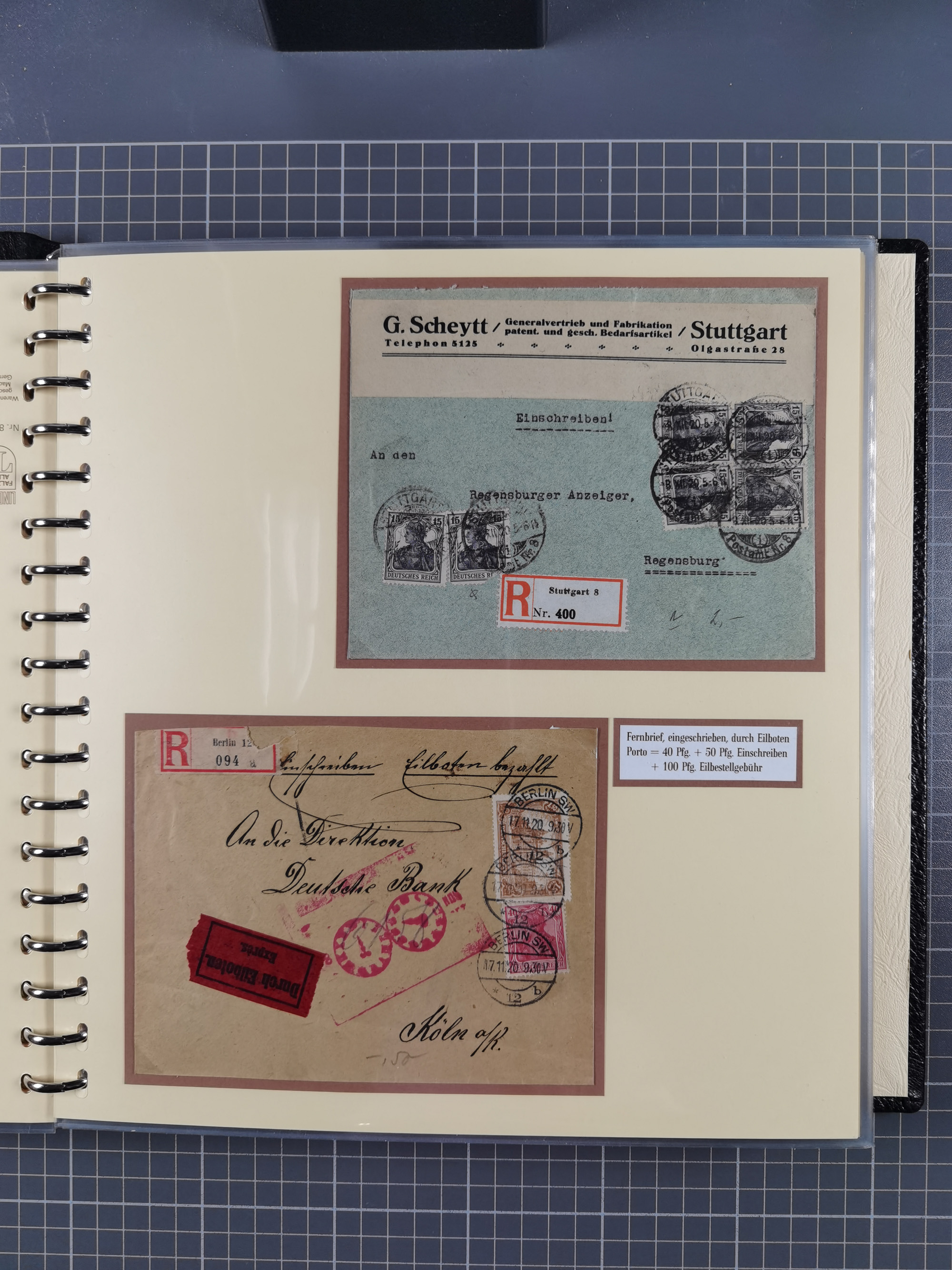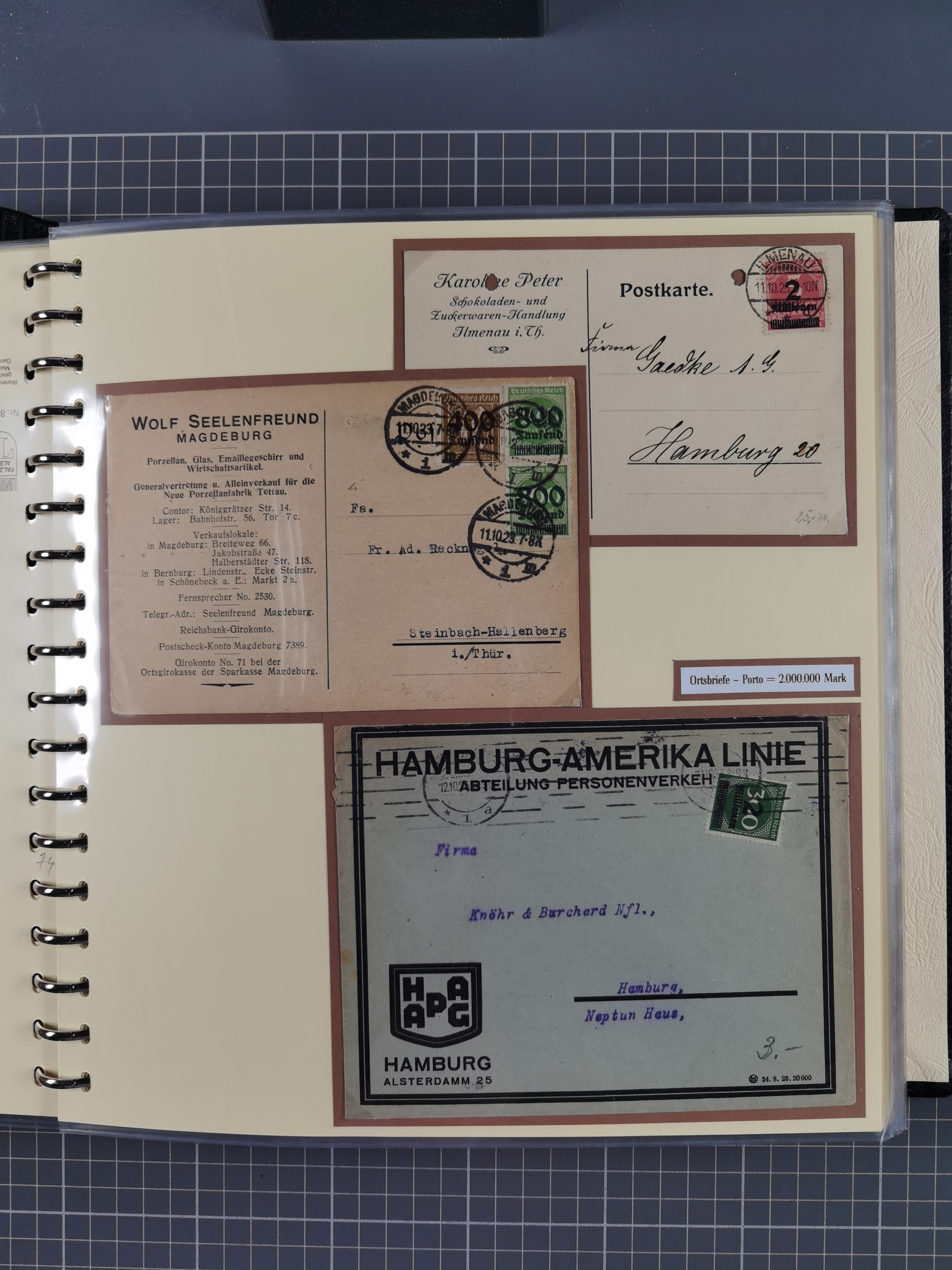 1872/1923, umfangreiche Sammlung mit ca. 800 Briefen,Karten und Ganzsachen. Am Anfang mit kleinem Teil “Hufeisentstempel”, ansonsten liegt der Schwerpunkt bei Infla mit Einzel- und Mehrfachfrankaturen, R-Briefen, Auslandspost, viel Hochinflation mit Dezember-Briefen und Portostufen. Alles auf selbst gestalteten Albenblättern in10 Alben