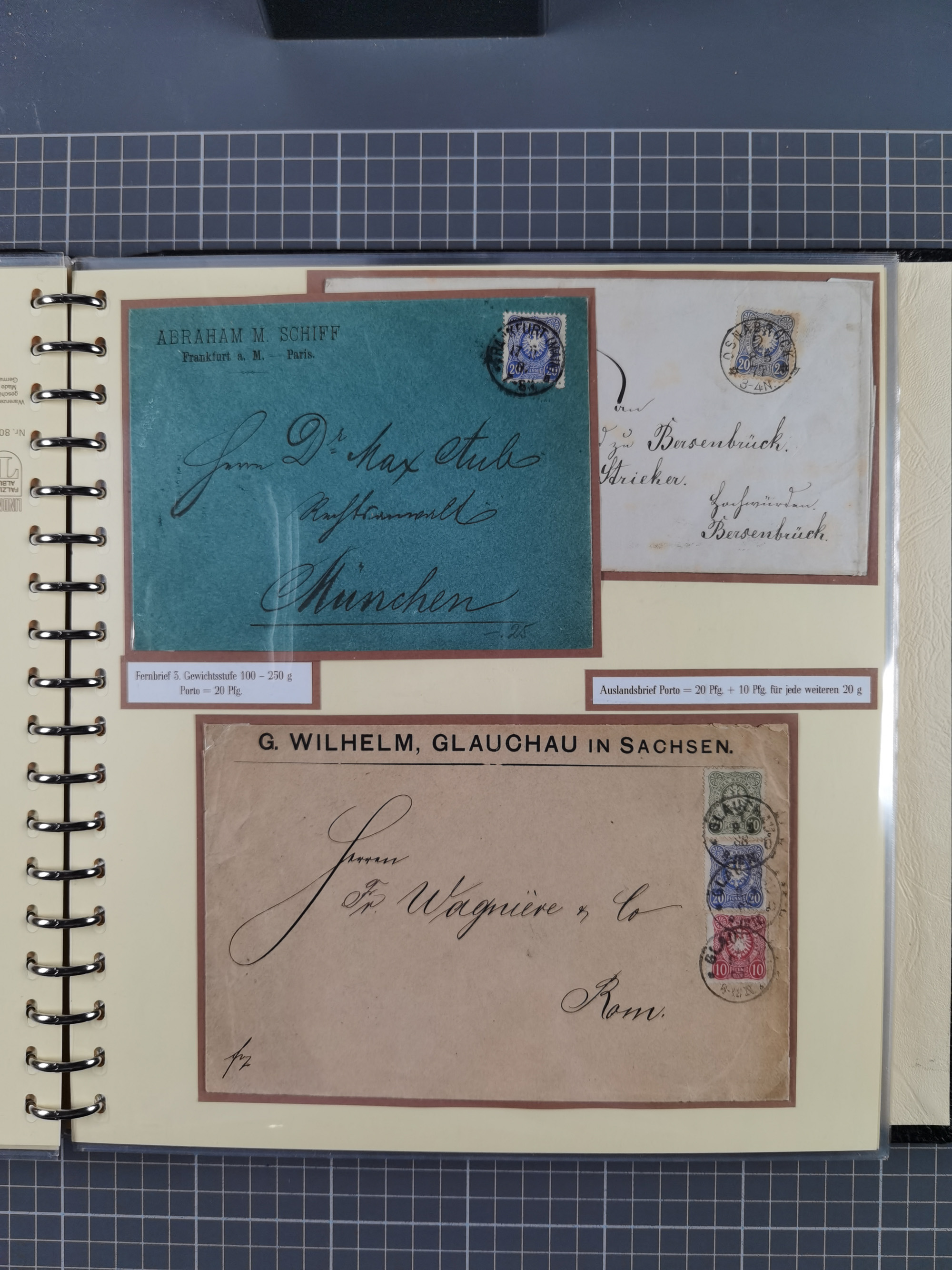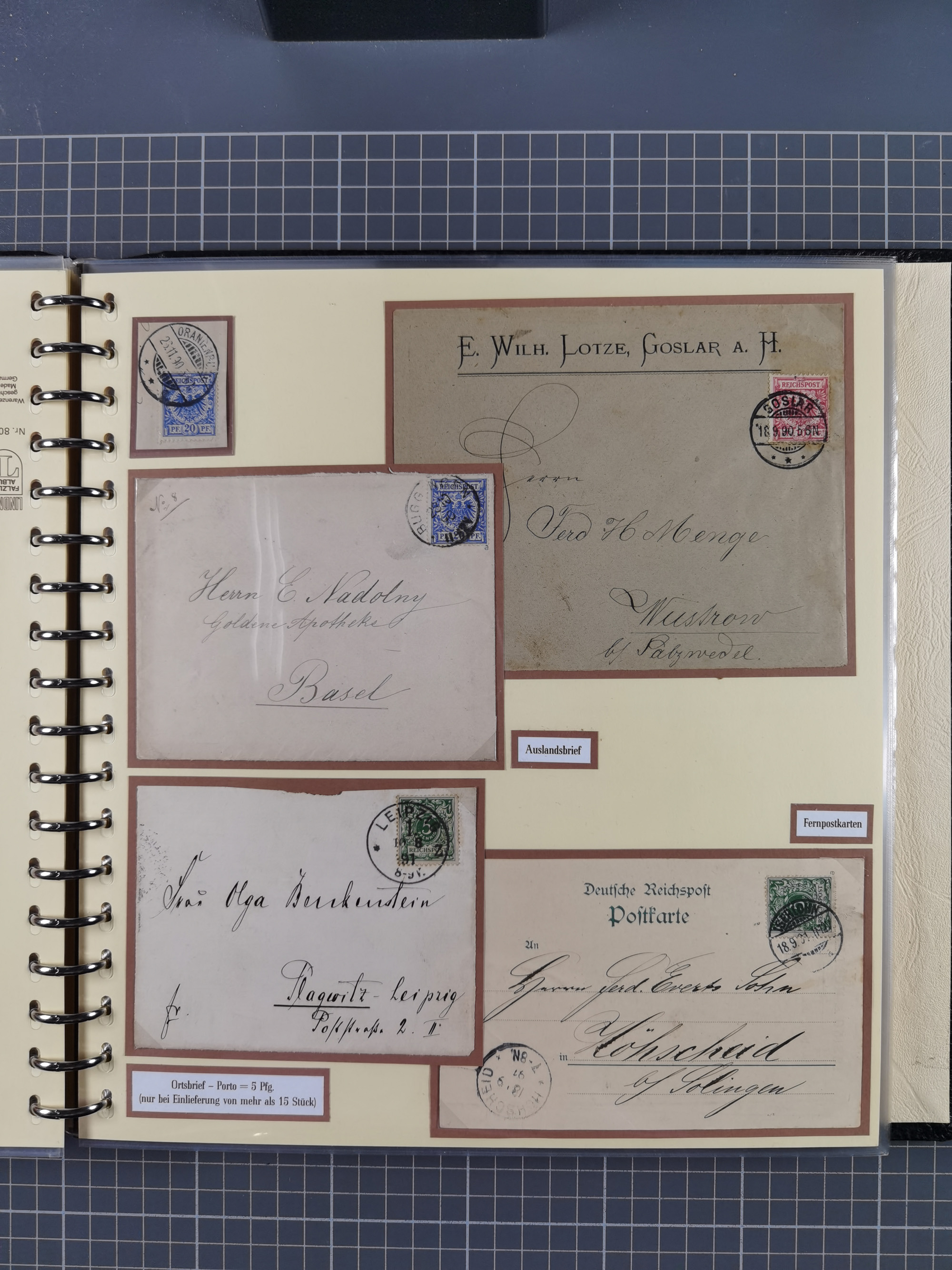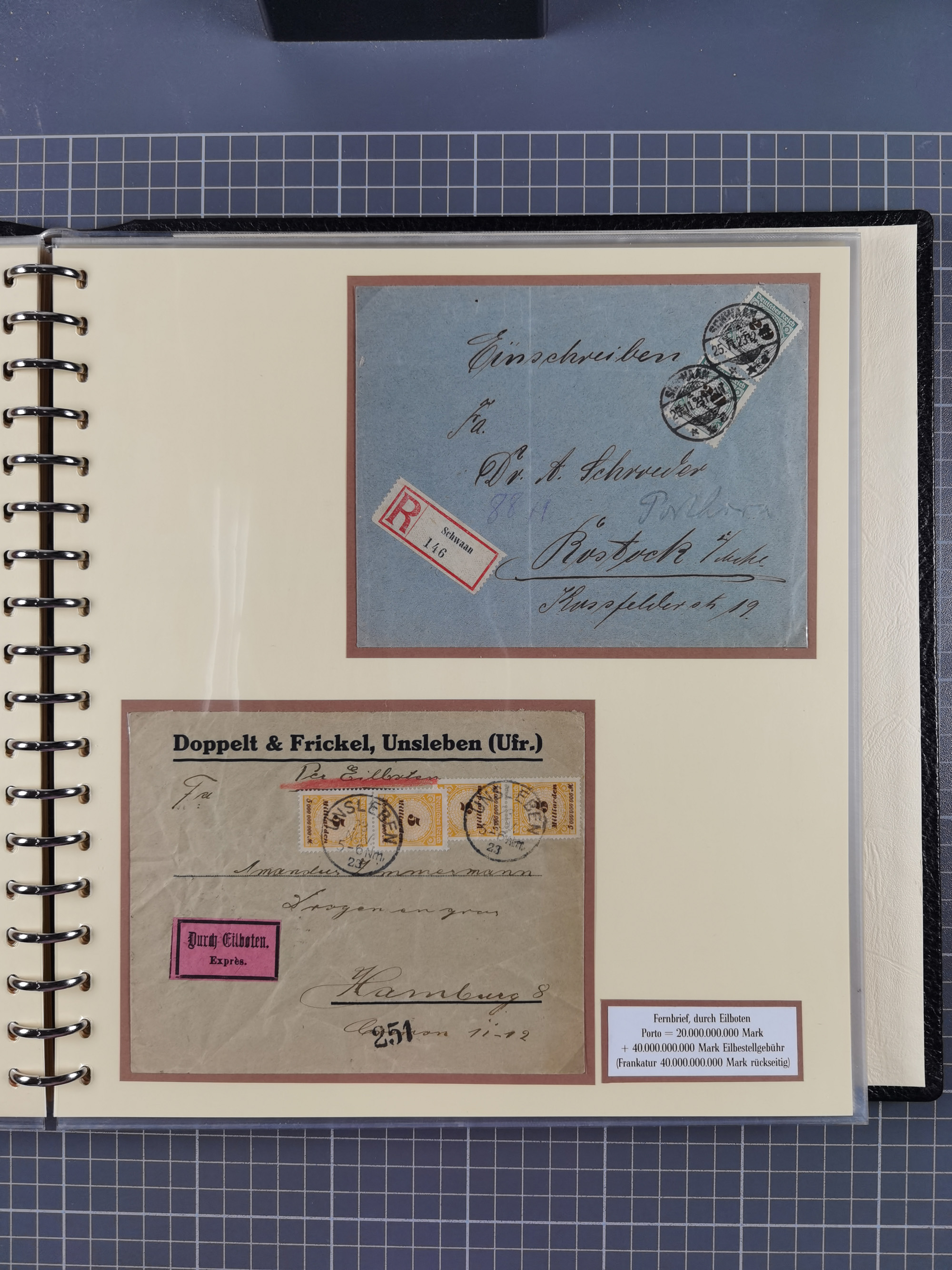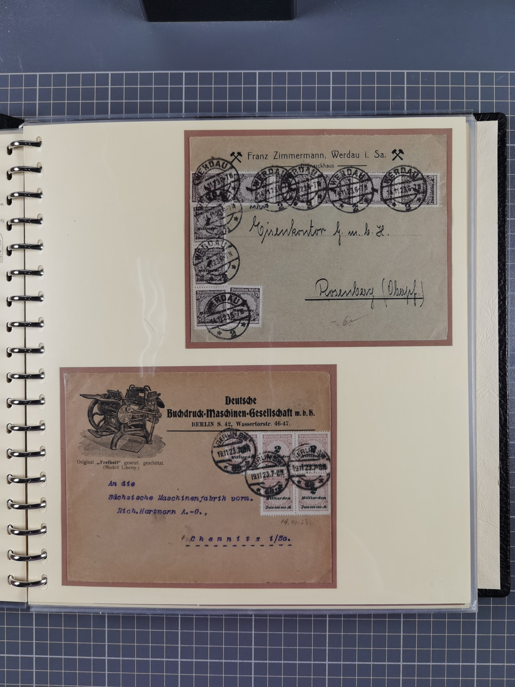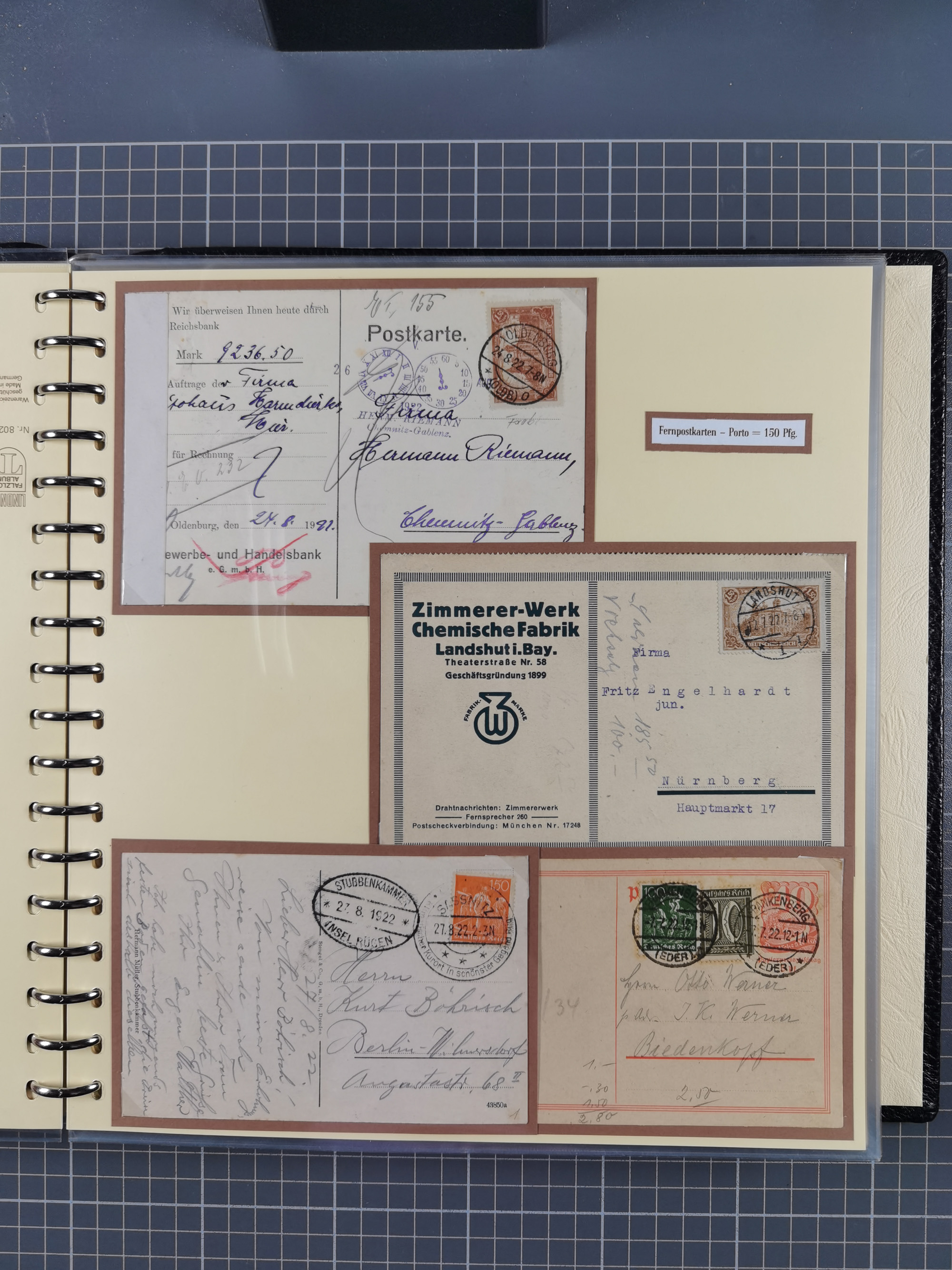 1872/1923, umfangreiche Sammlung mit ca. 800 Briefen,Karten und Ganzsachen. Am Anfang mit kleinem Teil “Hufeisentstempel”, ansonsten liegt der Schwerpunkt bei Infla mit Einzel- und Mehrfachfrankaturen, R-Briefen, Auslandspost, viel Hochinflation mit Dezember-Briefen und Portostufen. Alles auf selbst gestalteten Albenblättern in10 Alben