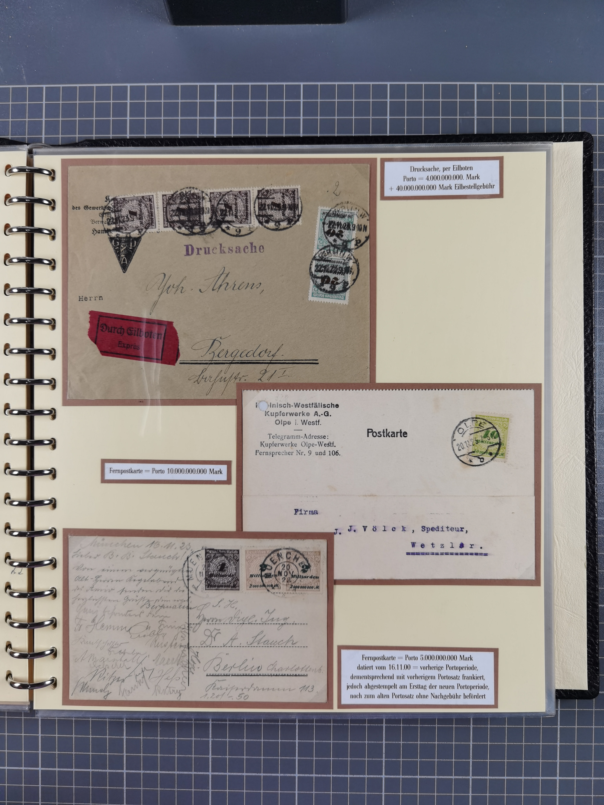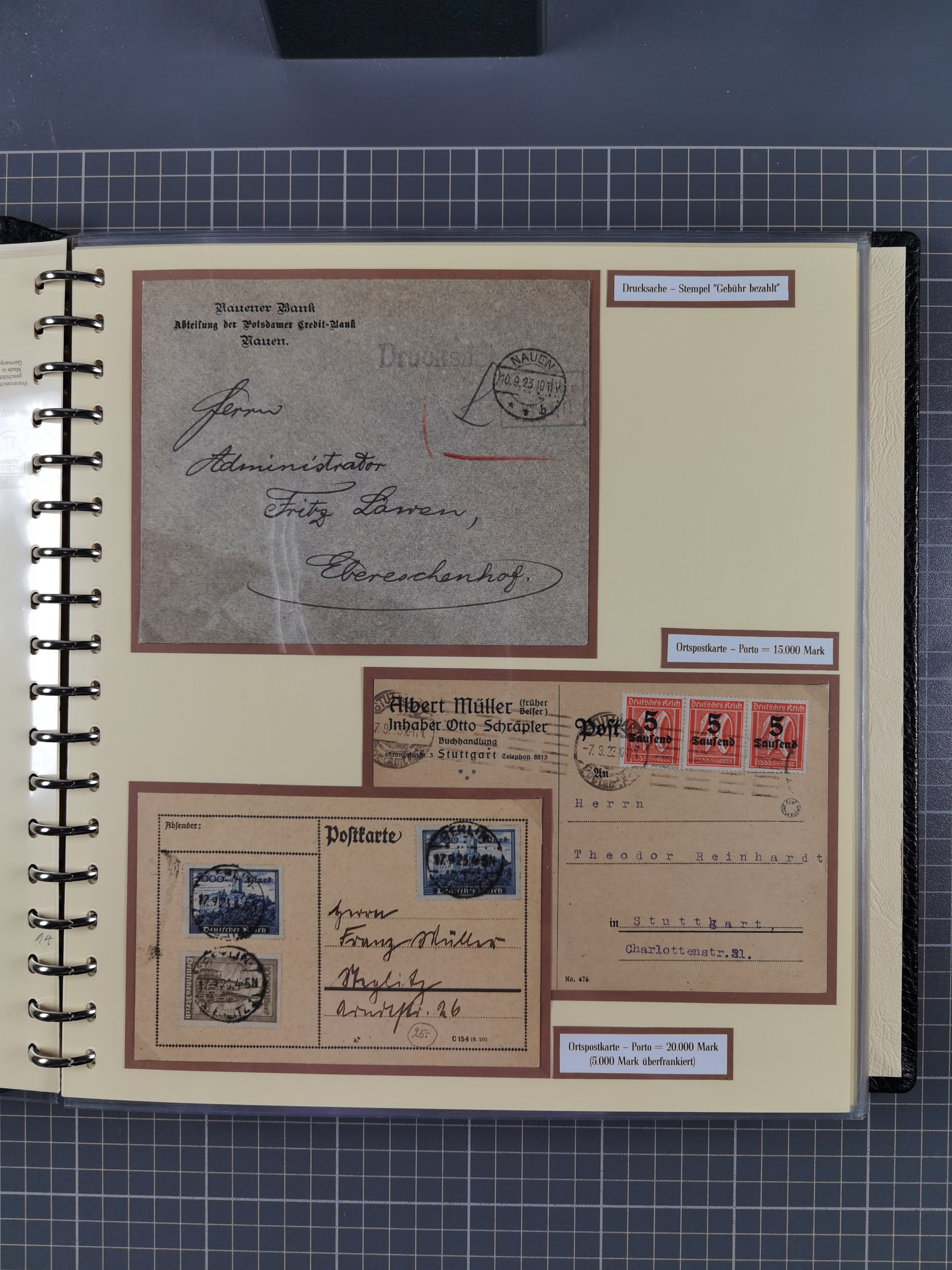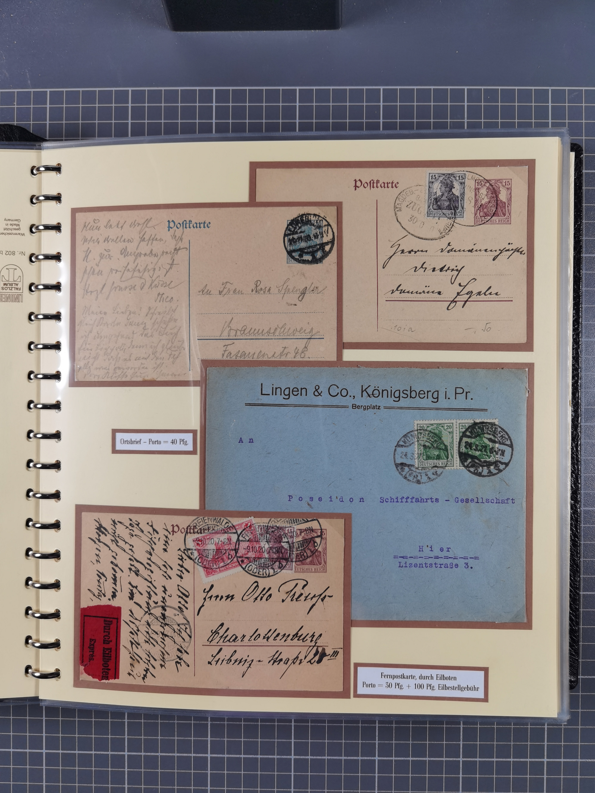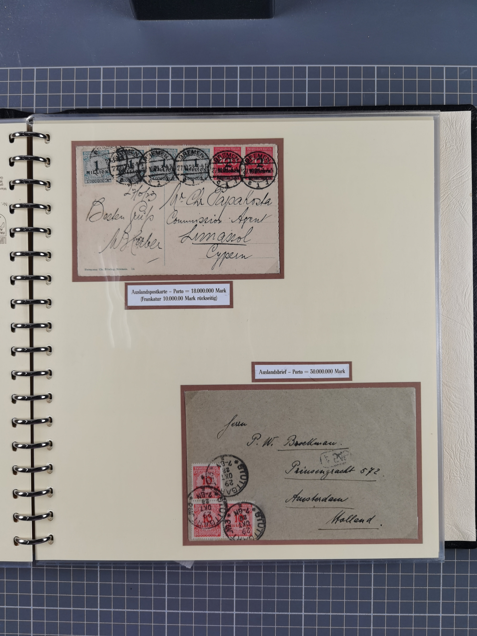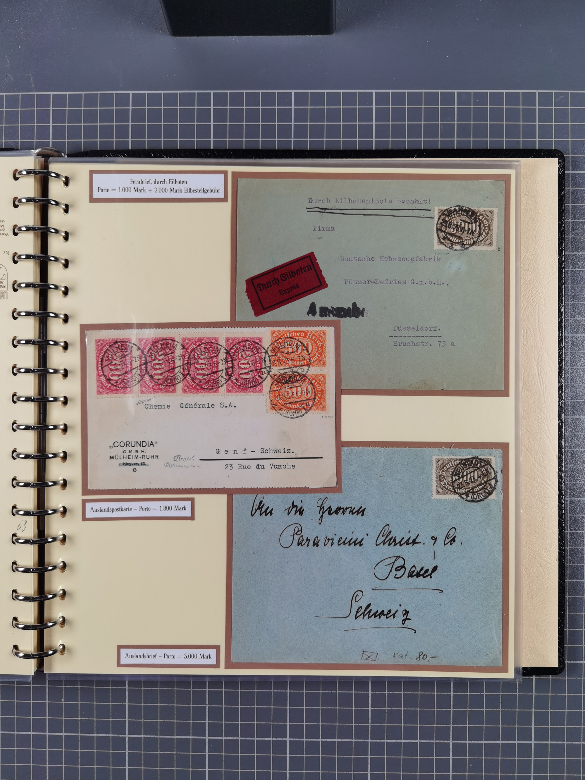 1872/1923, umfangreiche Sammlung mit ca. 800 Briefen,Karten und Ganzsachen. Am Anfang mit kleinem Teil “Hufeisentstempel”, ansonsten liegt der Schwerpunkt bei Infla mit Einzel- und Mehrfachfrankaturen, R-Briefen, Auslandspost, viel Hochinflation mit Dezember-Briefen und Portostufen. Alles auf selbst gestalteten Albenblättern in10 Alben
