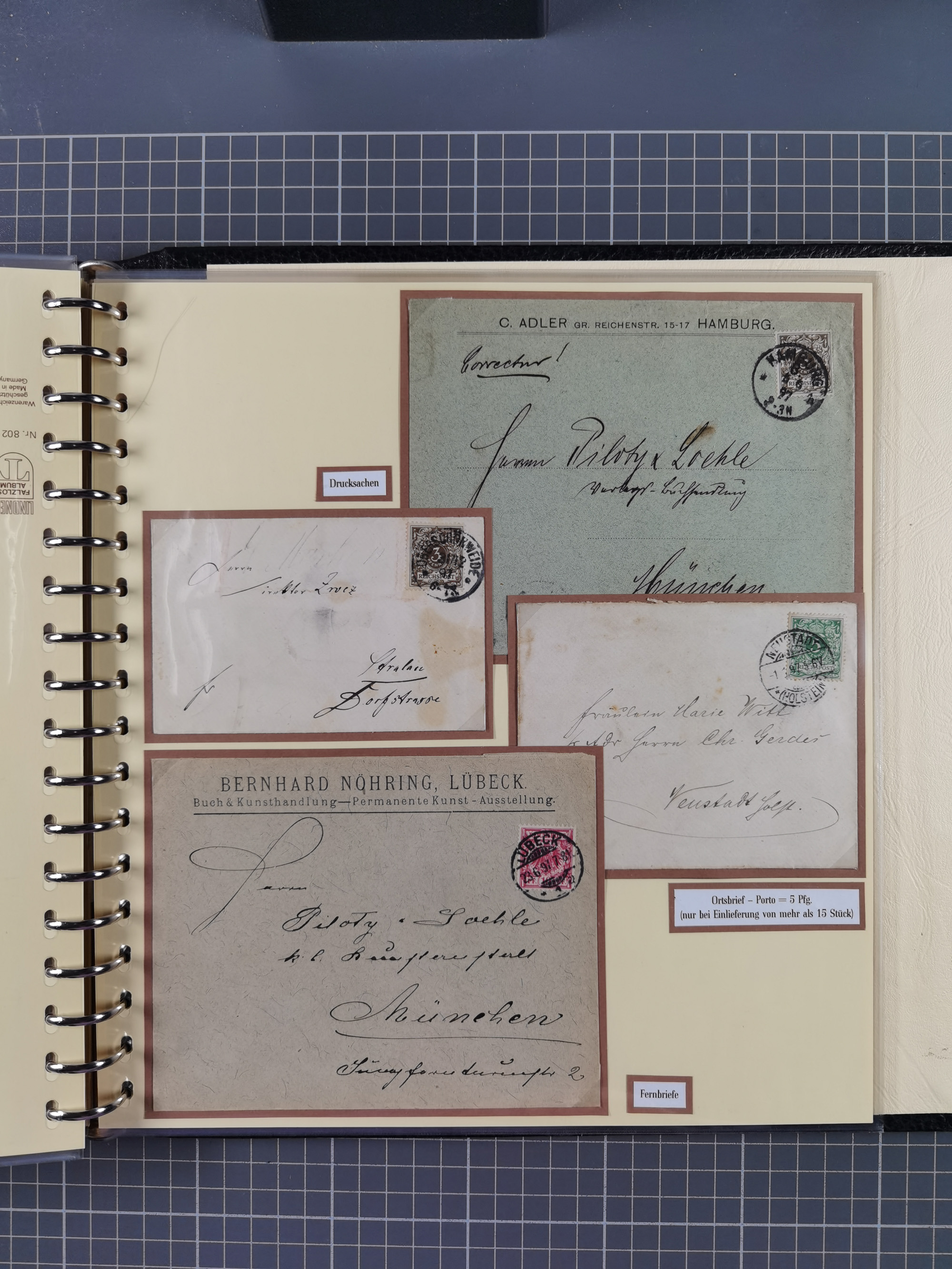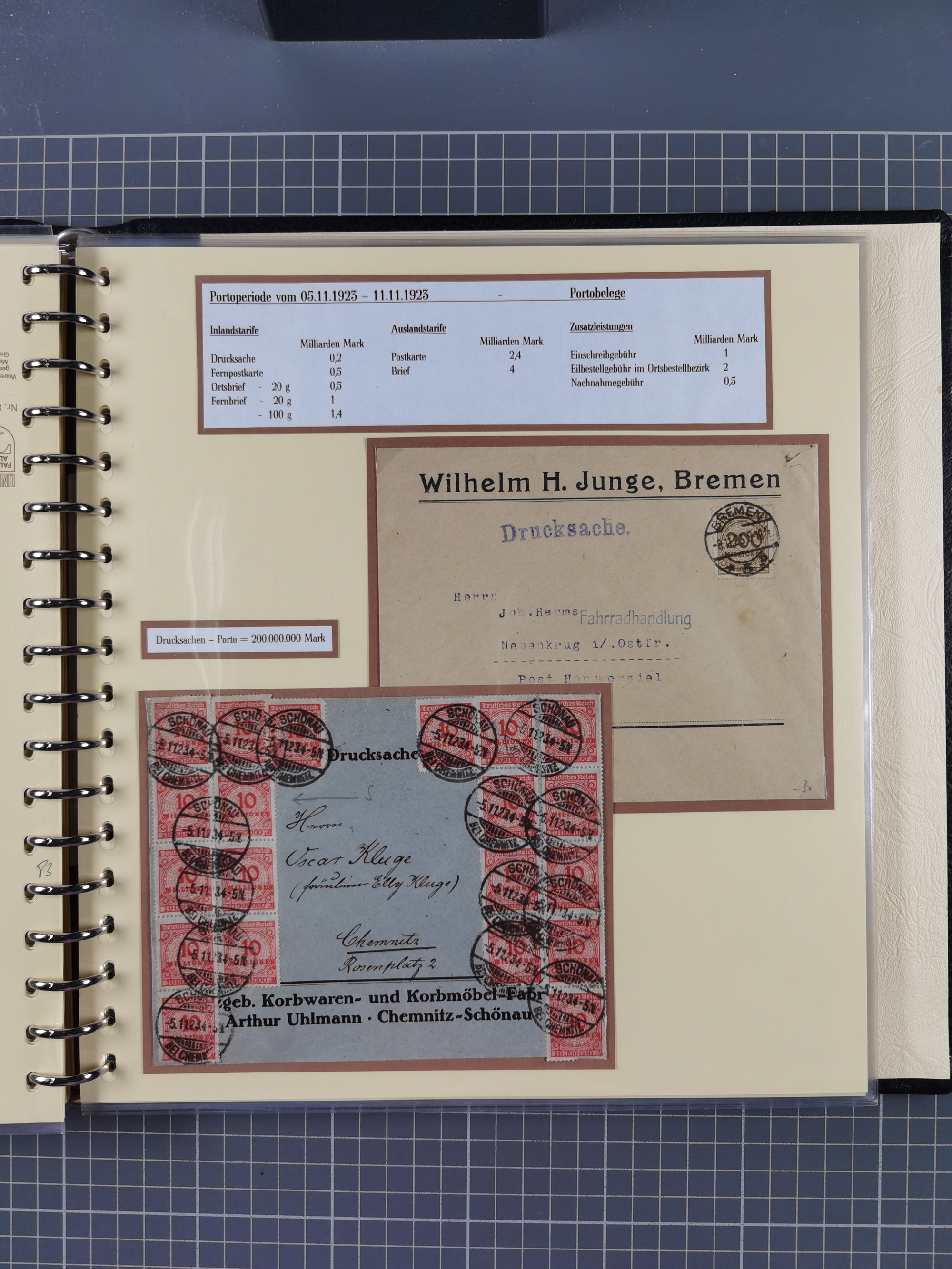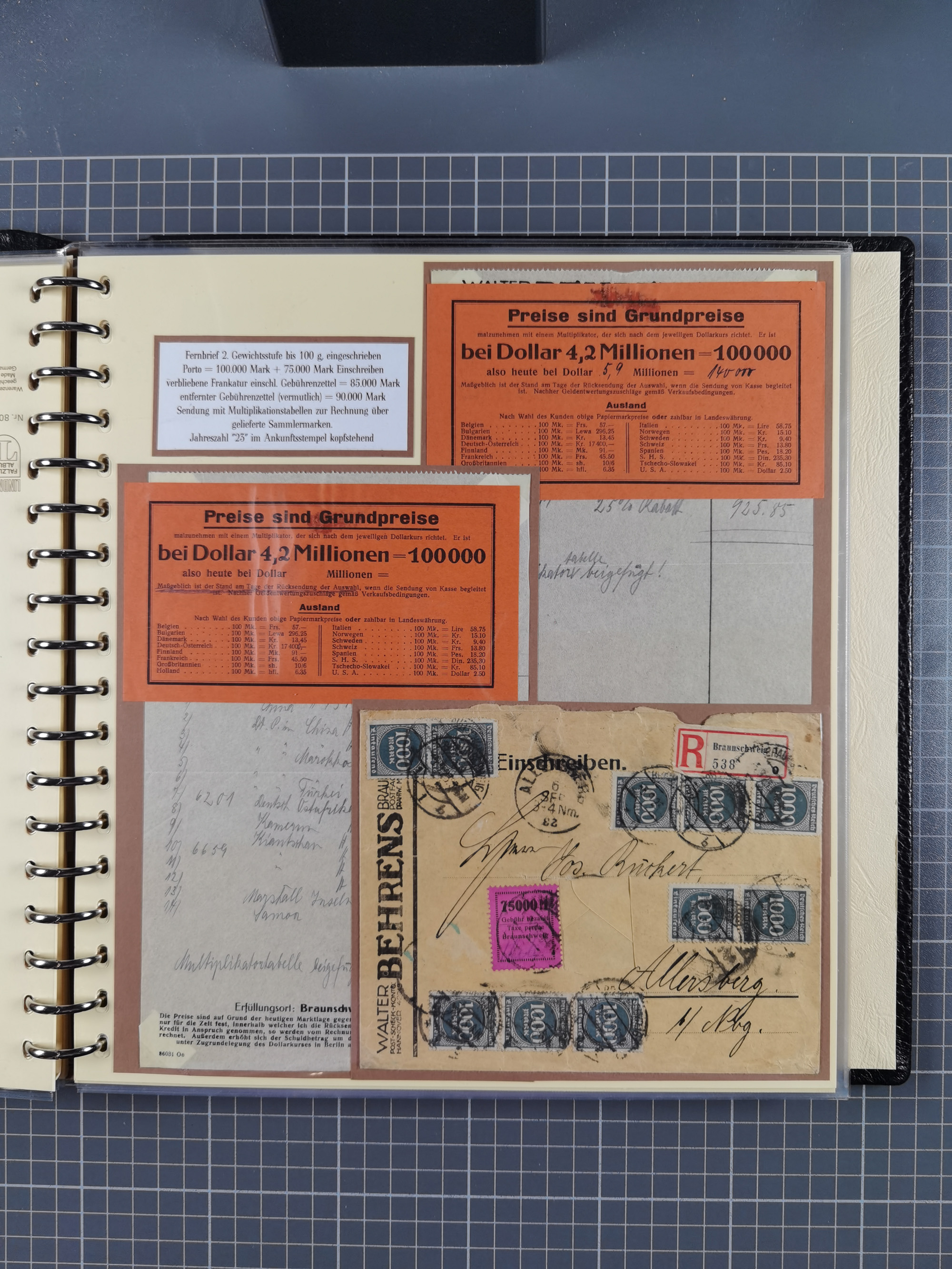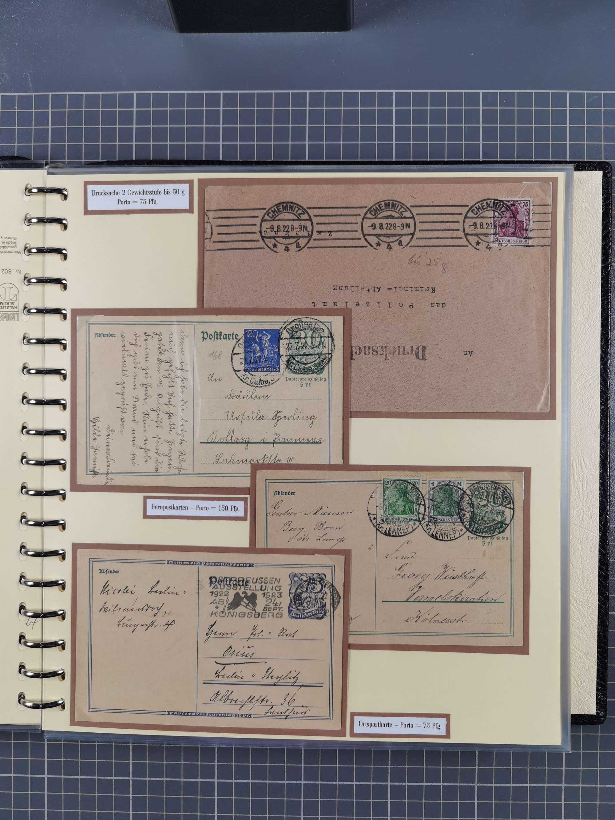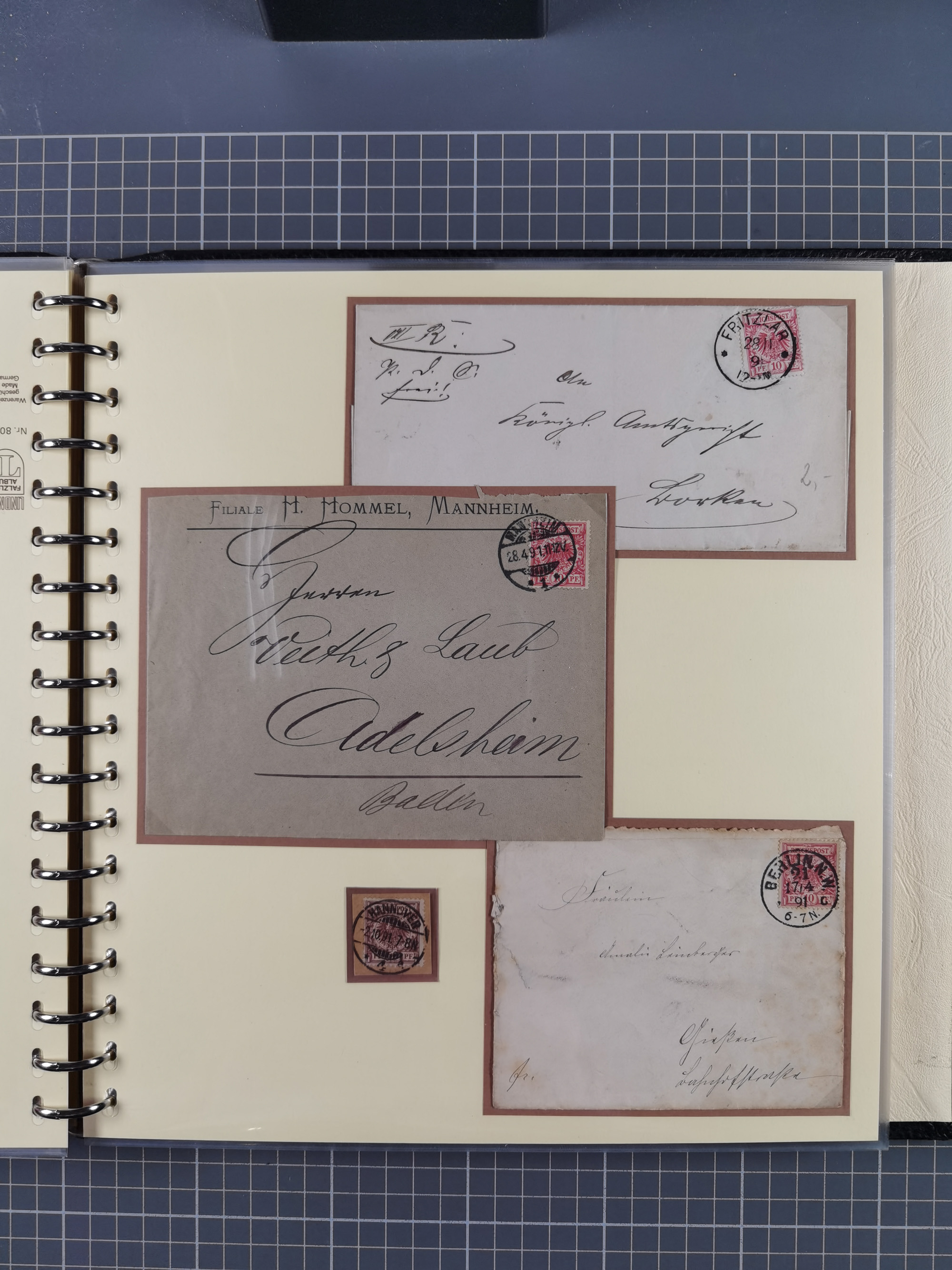 1872/1923, umfangreiche Sammlung mit ca. 800 Briefen,Karten und Ganzsachen. Am Anfang mit kleinem Teil “Hufeisentstempel”, ansonsten liegt der Schwerpunkt bei Infla mit Einzel- und Mehrfachfrankaturen, R-Briefen, Auslandspost, viel Hochinflation mit Dezember-Briefen und Portostufen. Alles auf selbst gestalteten Albenblättern in10 Alben