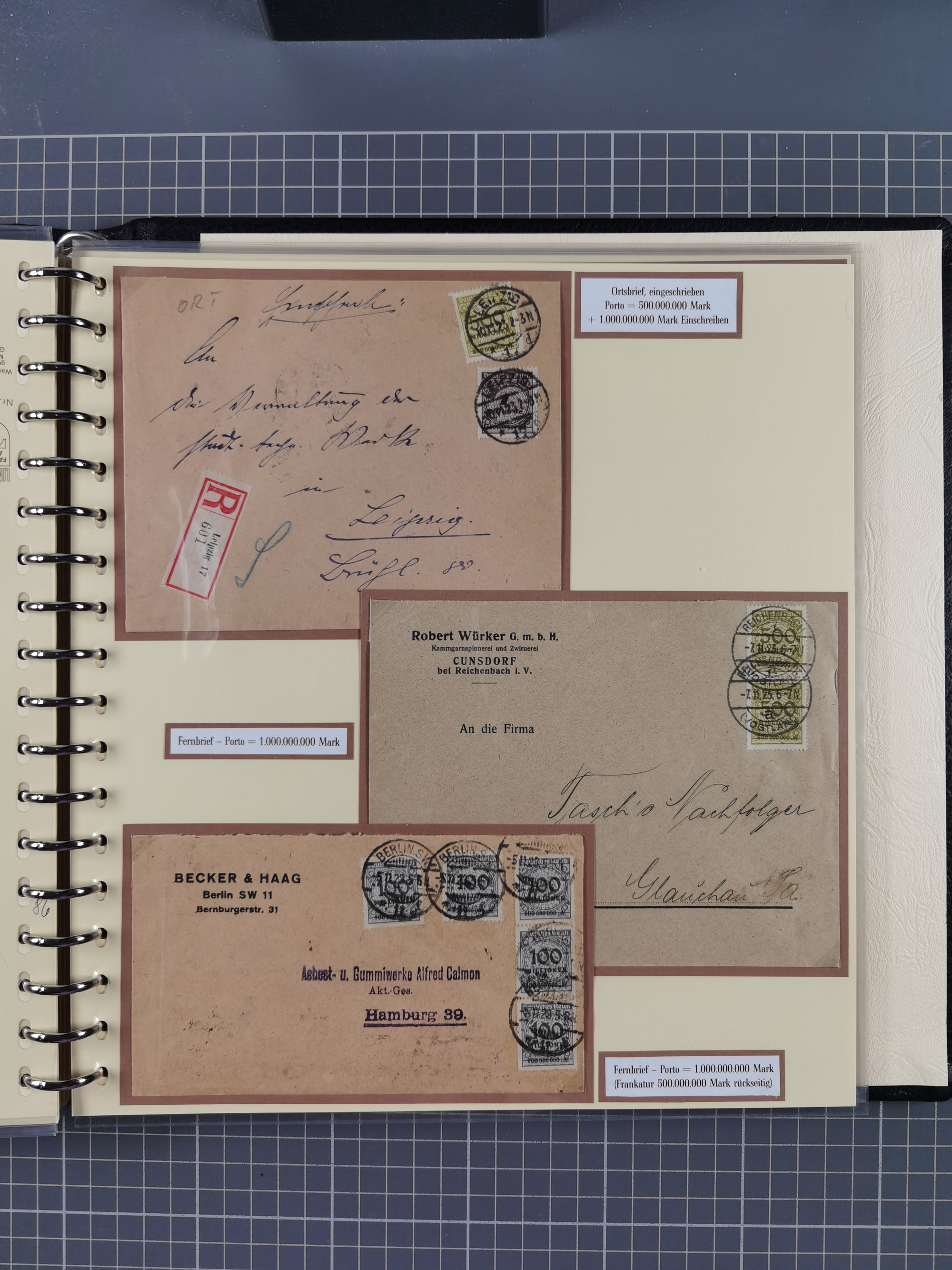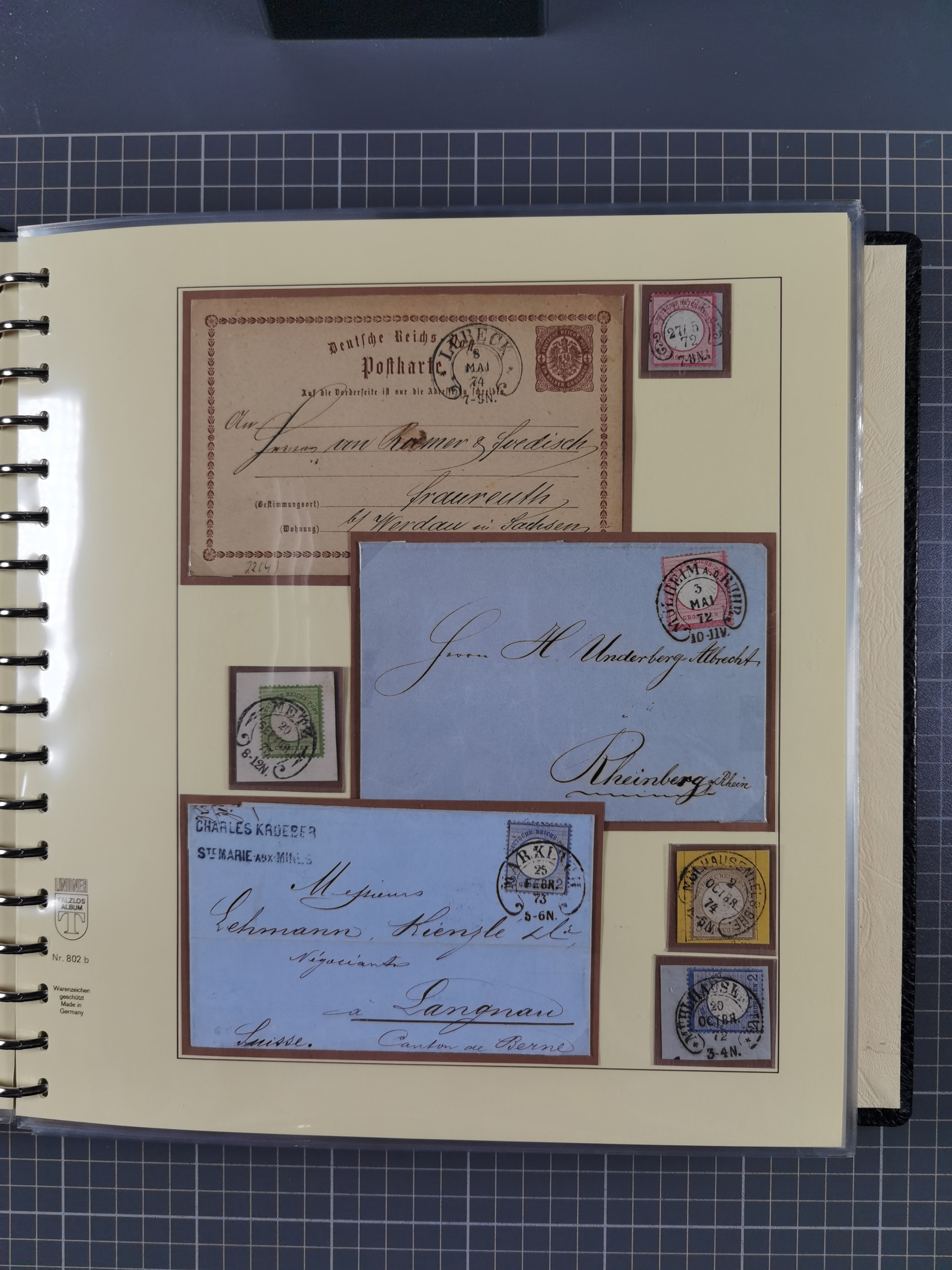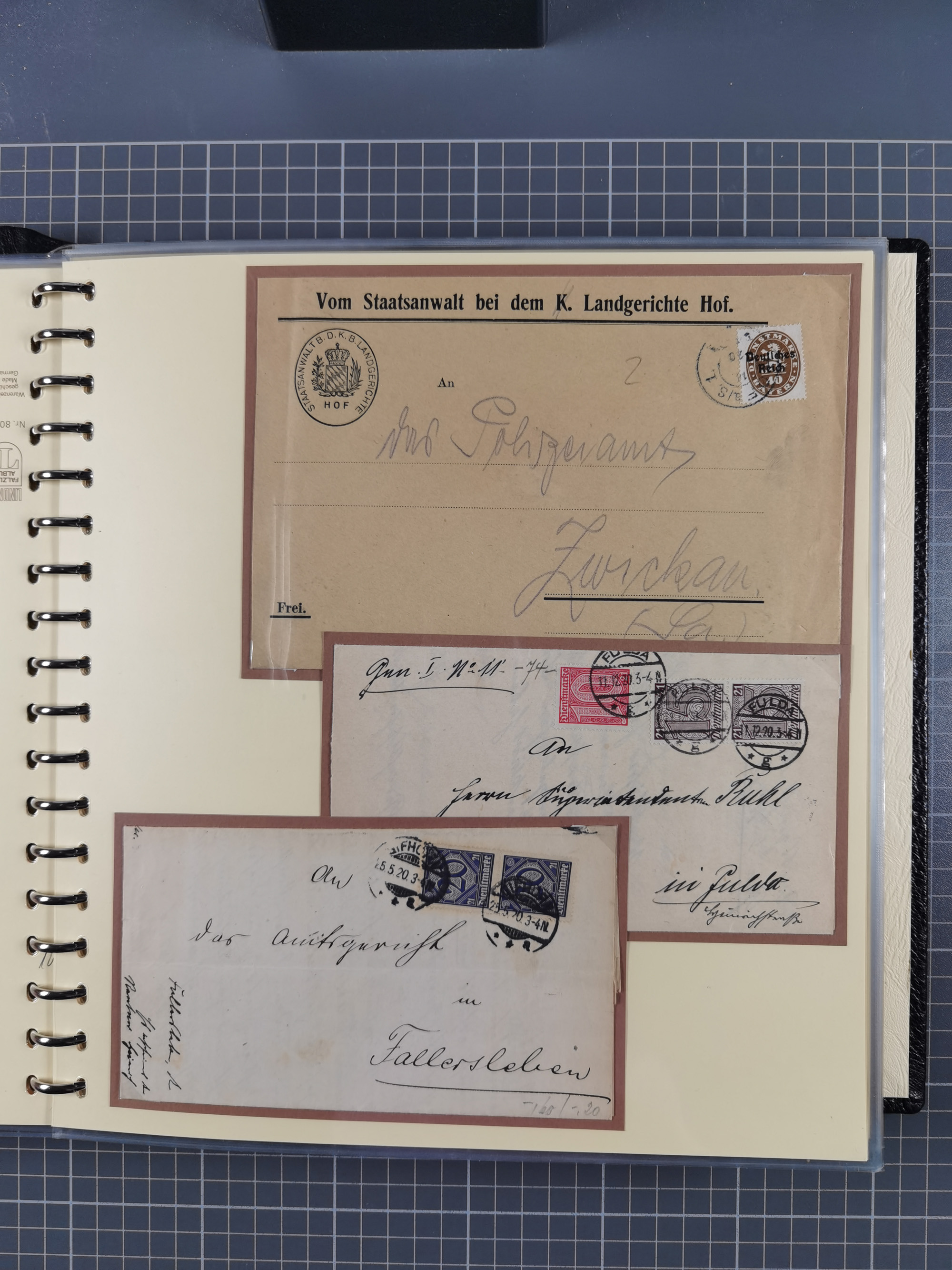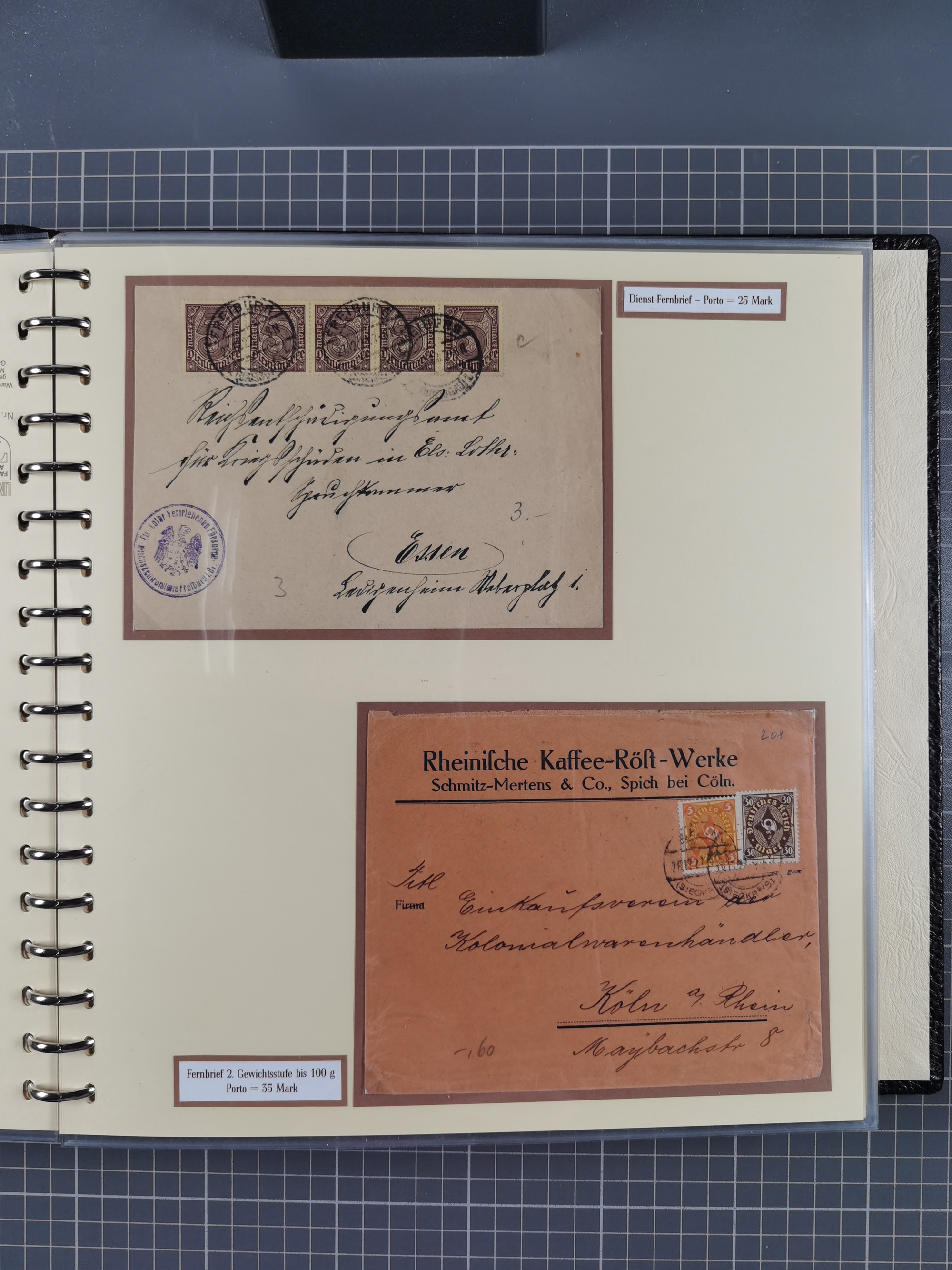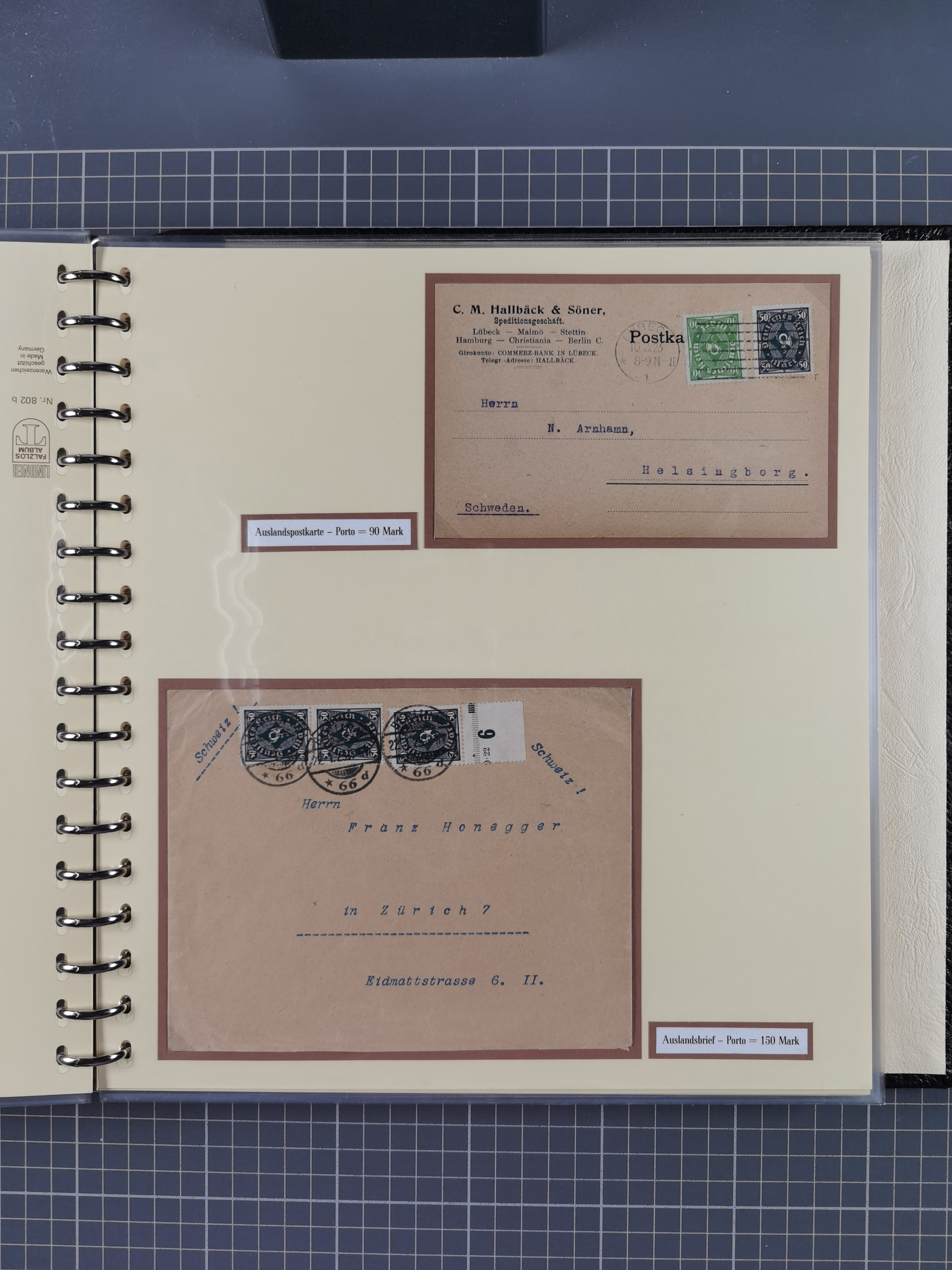 1872/1923, umfangreiche Sammlung mit ca. 800 Briefen,Karten und Ganzsachen. Am Anfang mit kleinem Teil “Hufeisentstempel”, ansonsten liegt der Schwerpunkt bei Infla mit Einzel- und Mehrfachfrankaturen, R-Briefen, Auslandspost, viel Hochinflation mit Dezember-Briefen und Portostufen. Alles auf selbst gestalteten Albenblättern in10 Alben