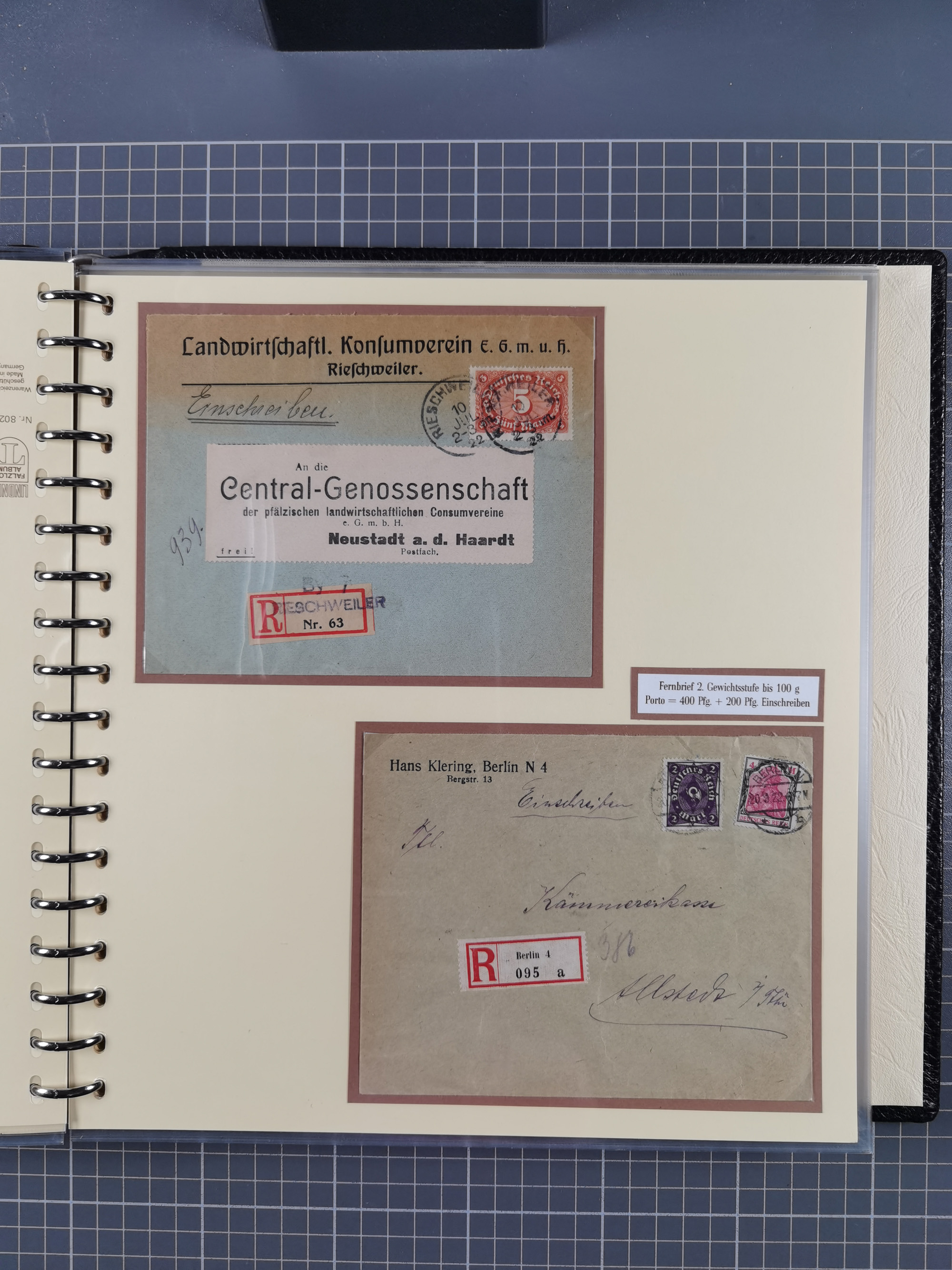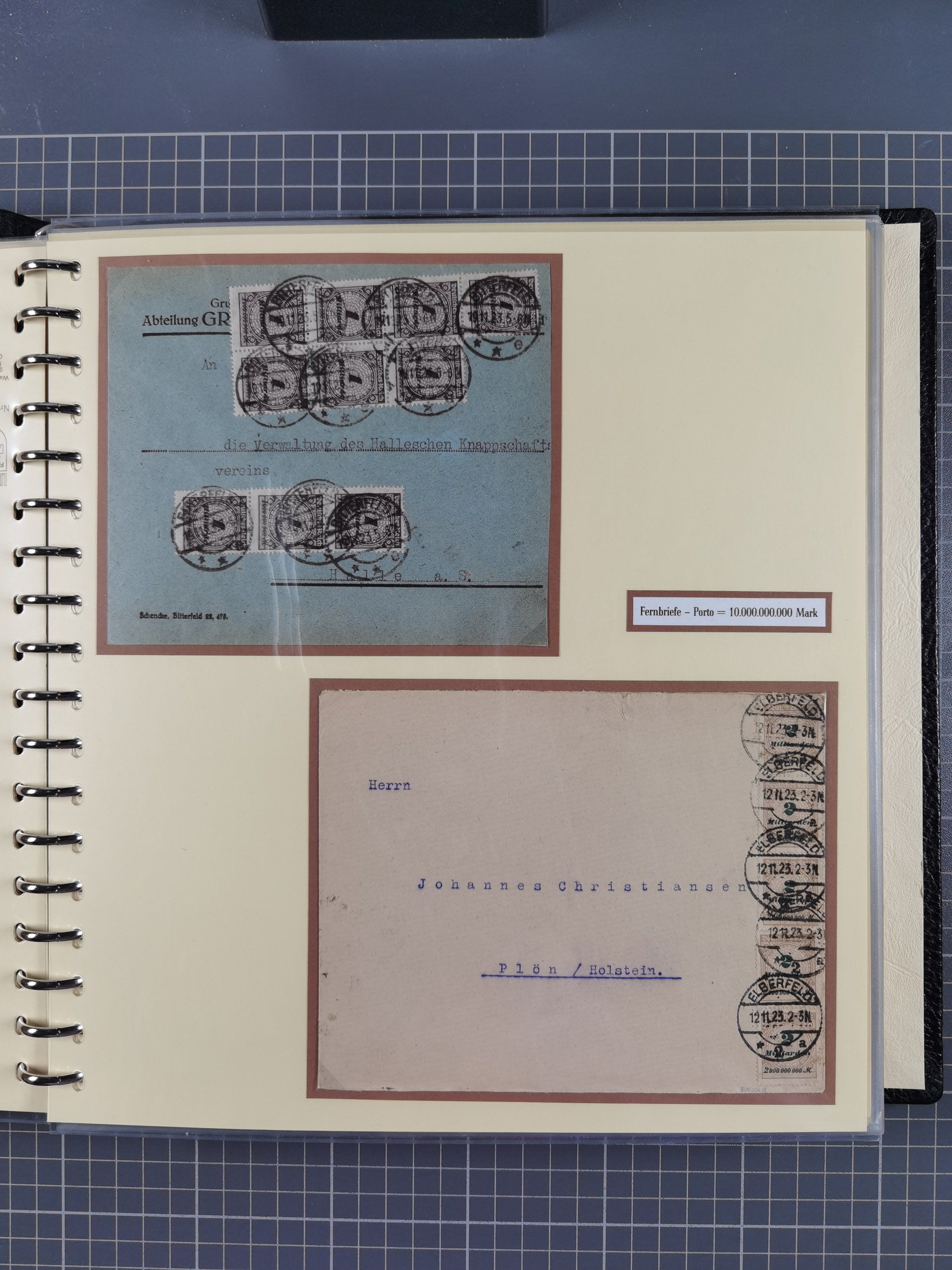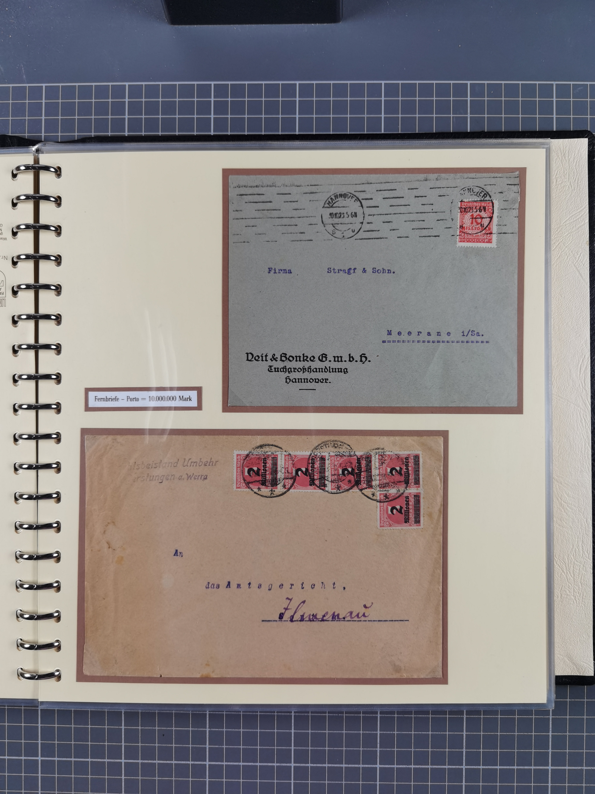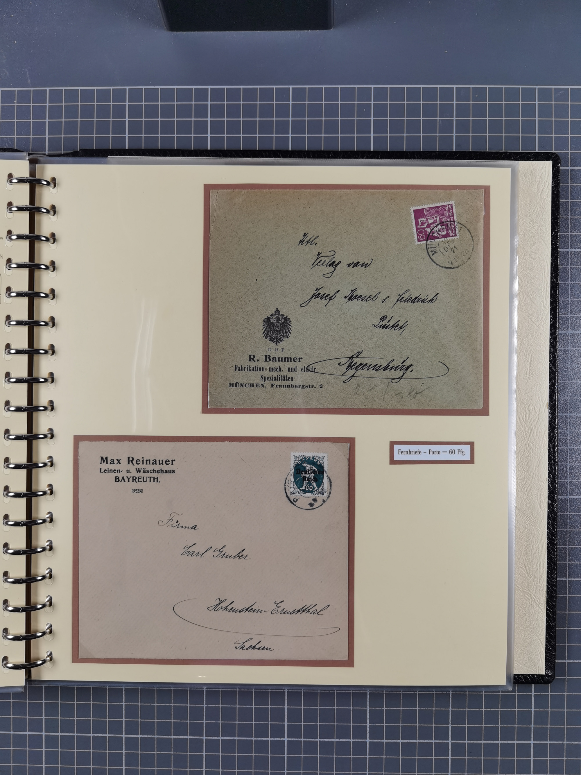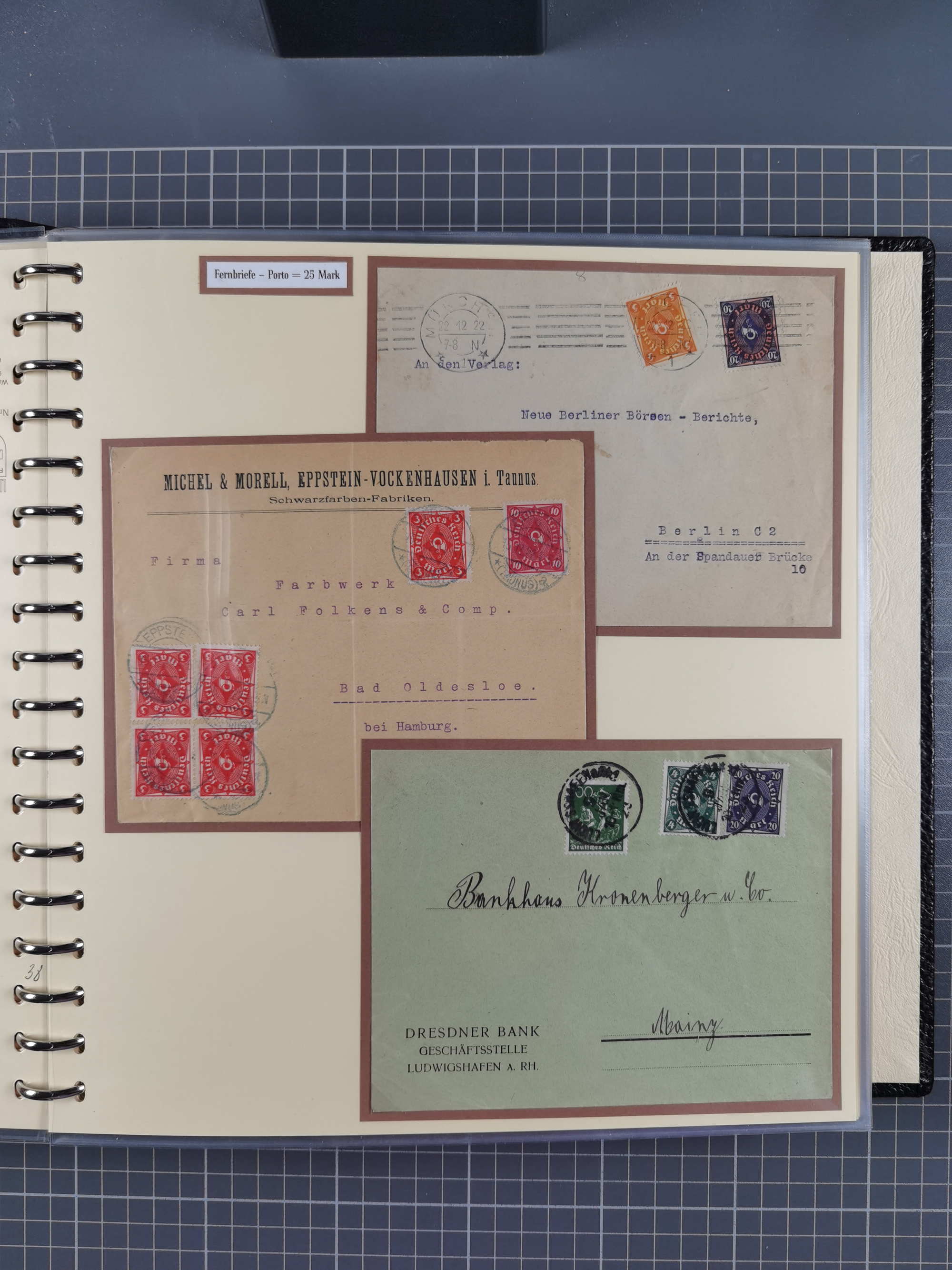 1872/1923, umfangreiche Sammlung mit ca. 800 Briefen,Karten und Ganzsachen. Am Anfang mit kleinem Teil “Hufeisentstempel”, ansonsten liegt der Schwerpunkt bei Infla mit Einzel- und Mehrfachfrankaturen, R-Briefen, Auslandspost, viel Hochinflation mit Dezember-Briefen und Portostufen. Alles auf selbst gestalteten Albenblättern in10 Alben