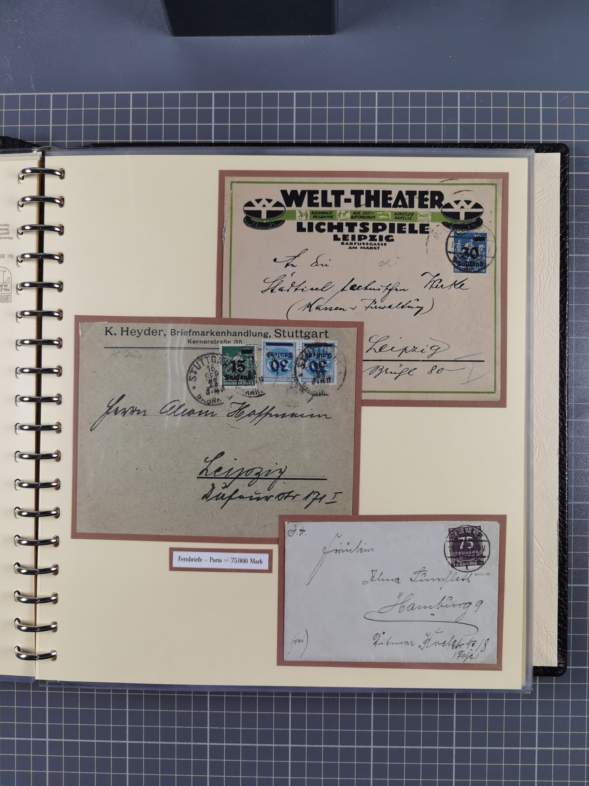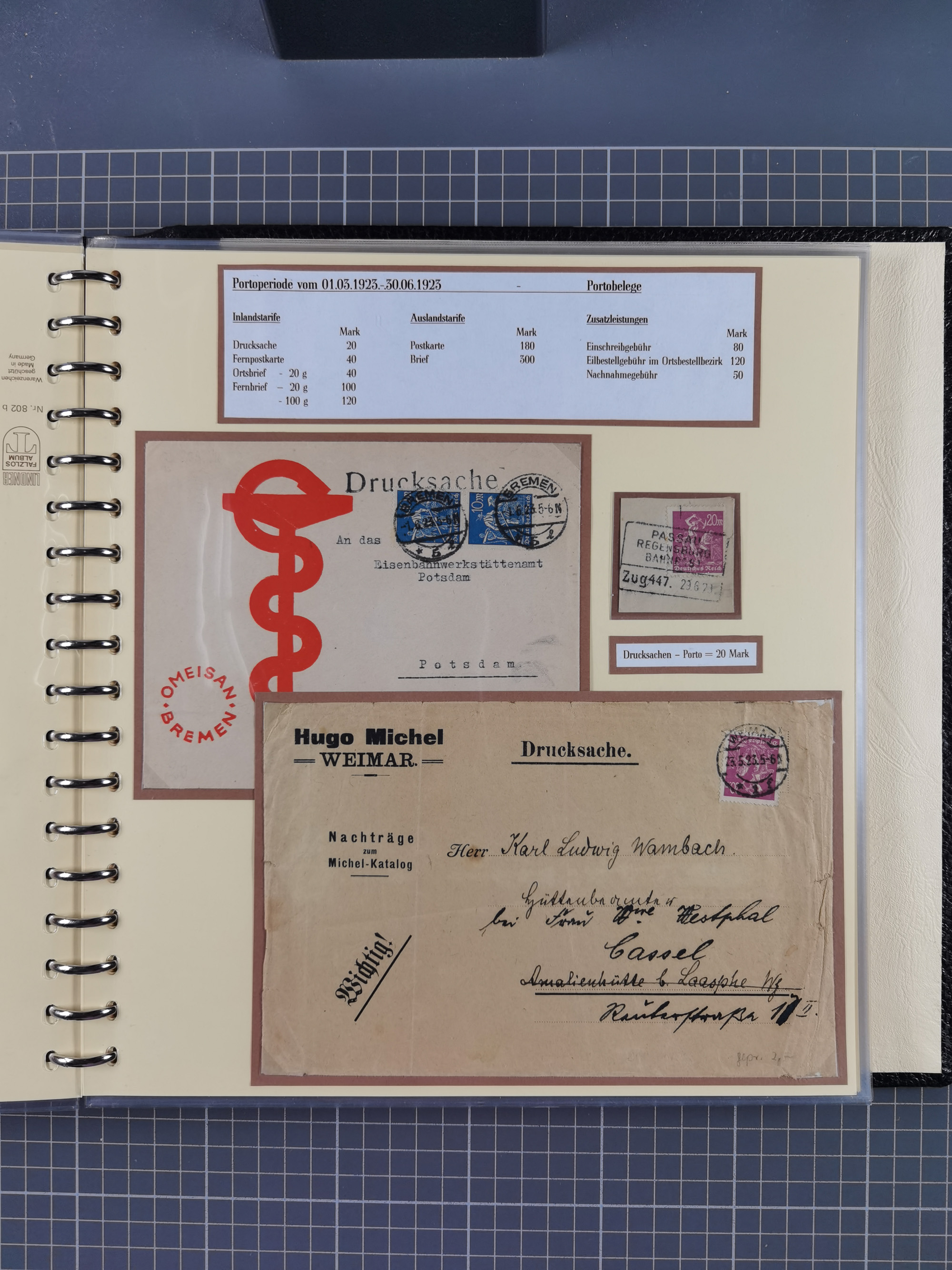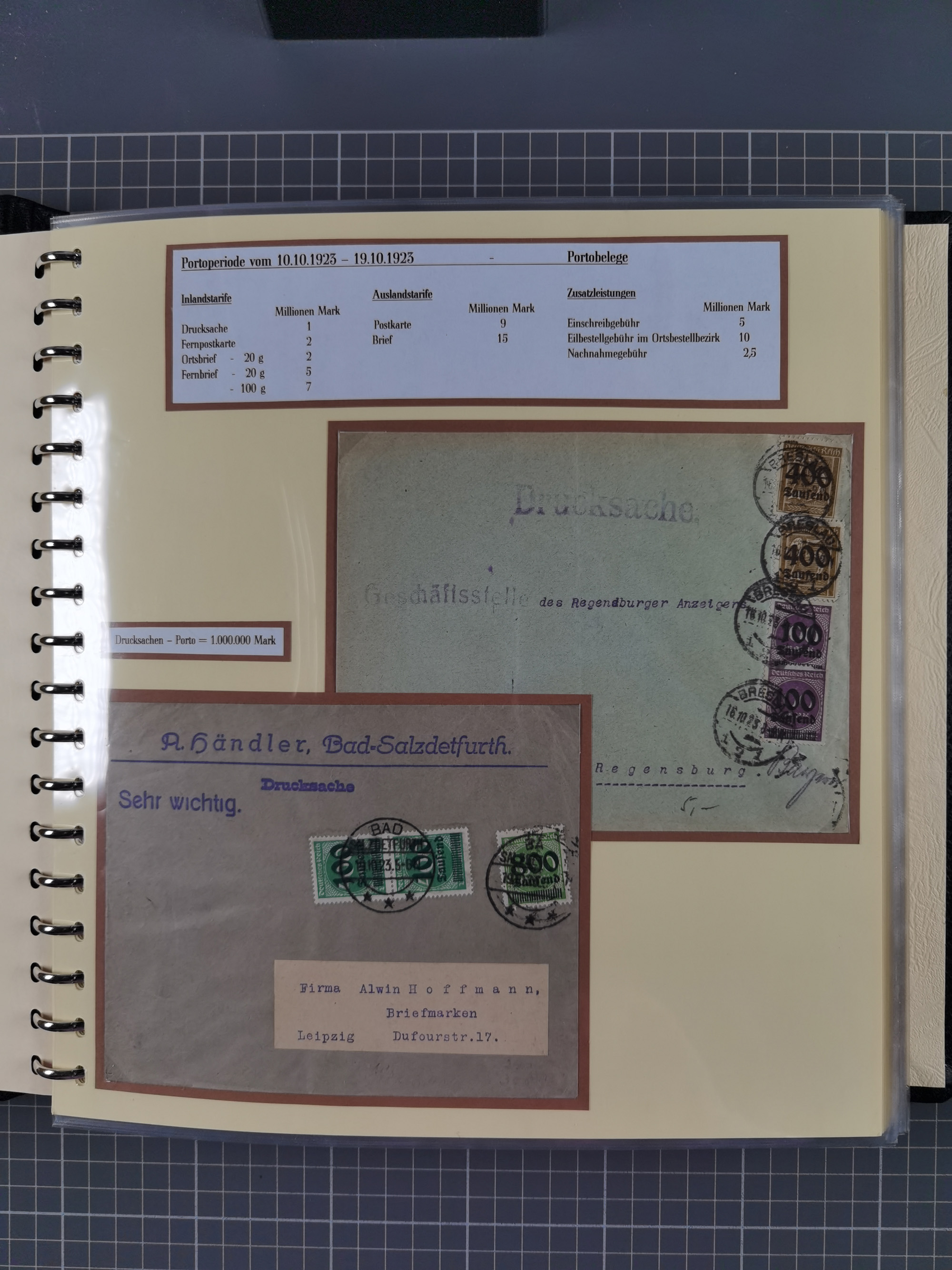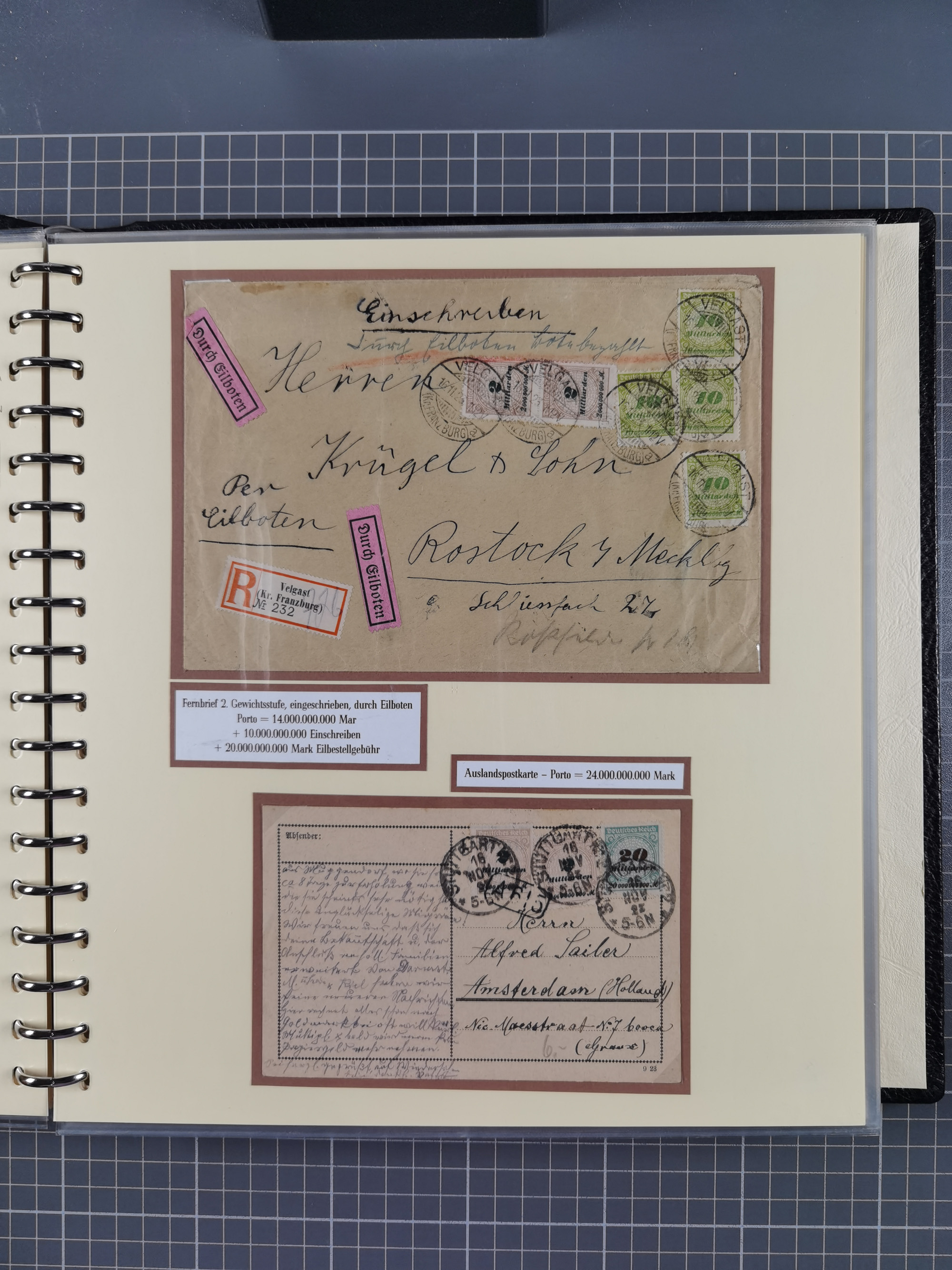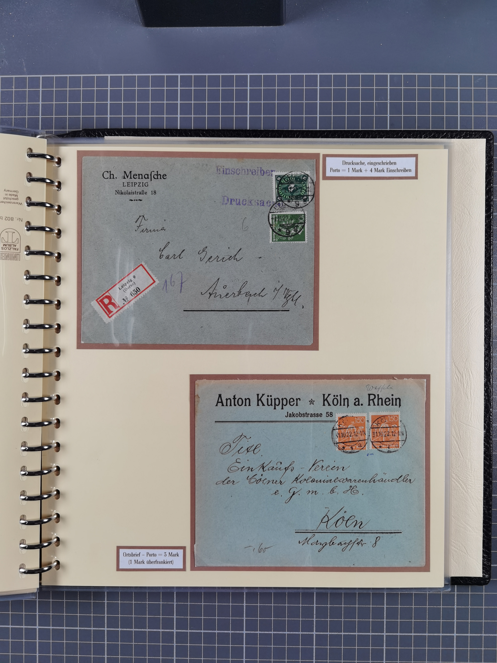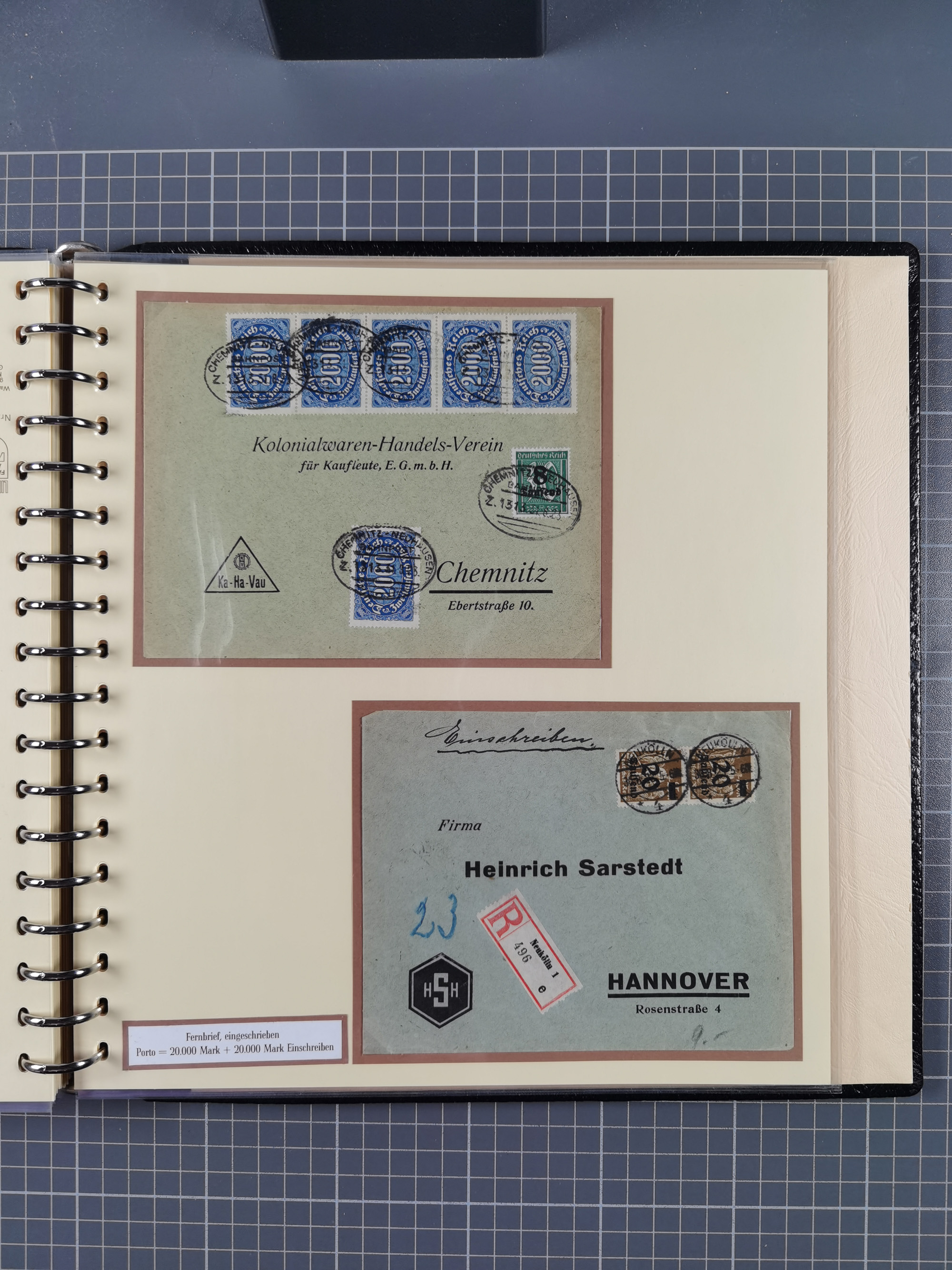 1872/1923, umfangreiche Sammlung mit ca. 800 Briefen,Karten und Ganzsachen. Am Anfang mit kleinem Teil “Hufeisentstempel”, ansonsten liegt der Schwerpunkt bei Infla mit Einzel- und Mehrfachfrankaturen, R-Briefen, Auslandspost, viel Hochinflation mit Dezember-Briefen und Portostufen. Alles auf selbst gestalteten Albenblättern in10 Alben