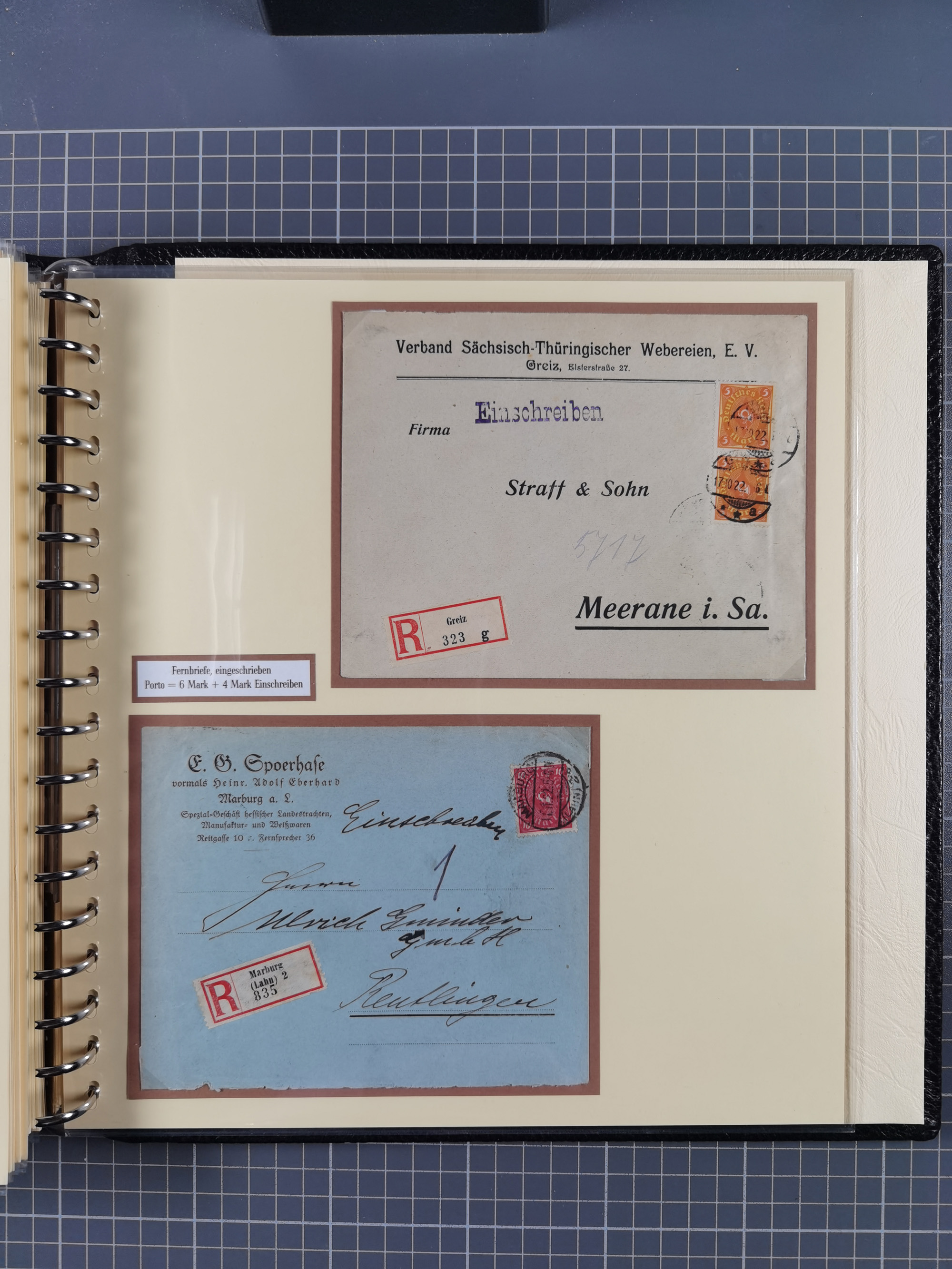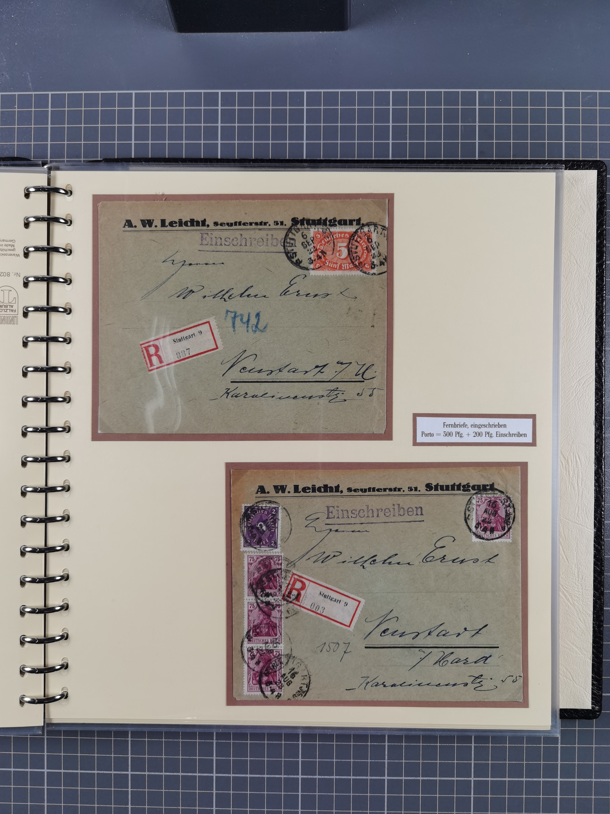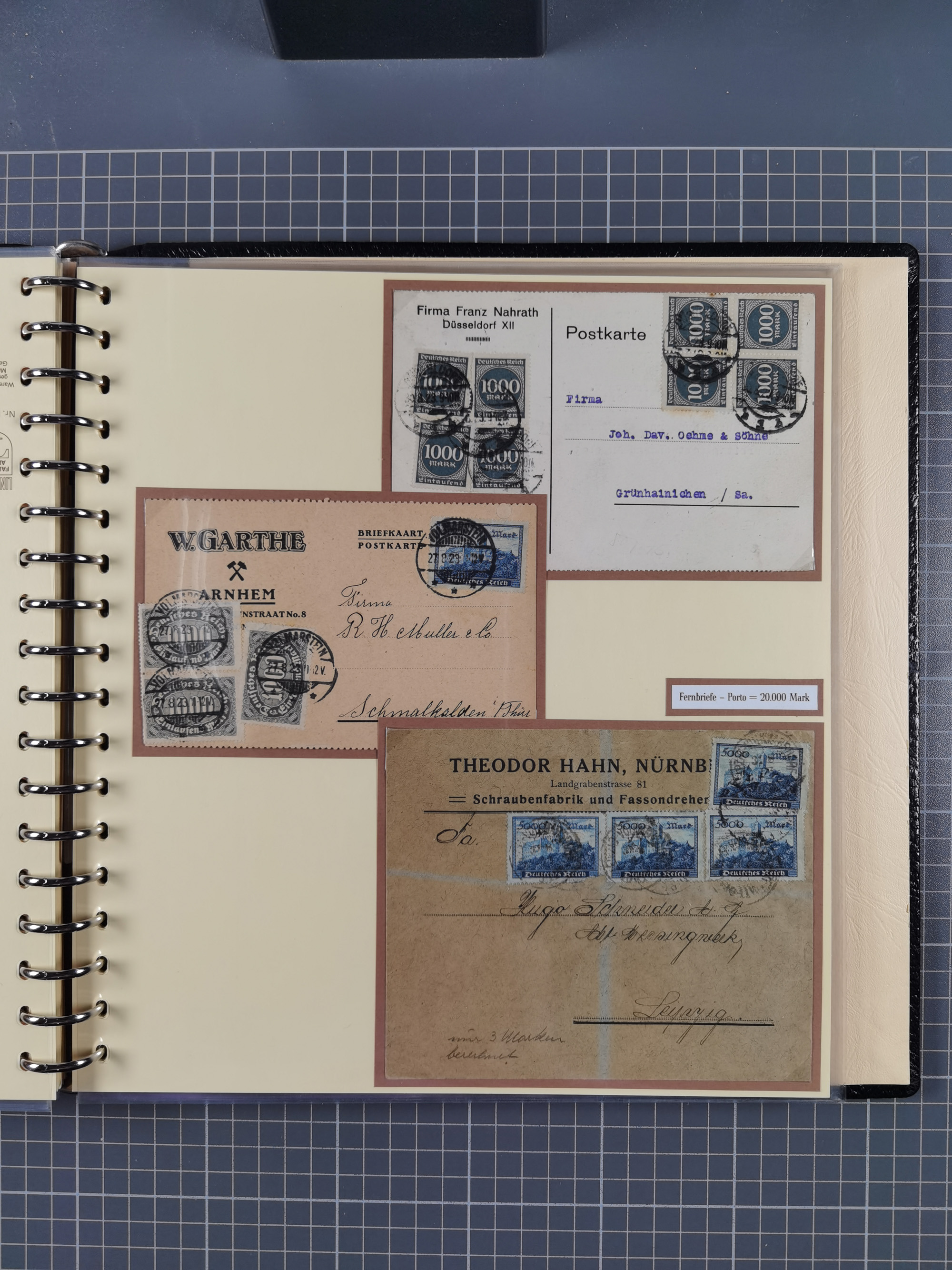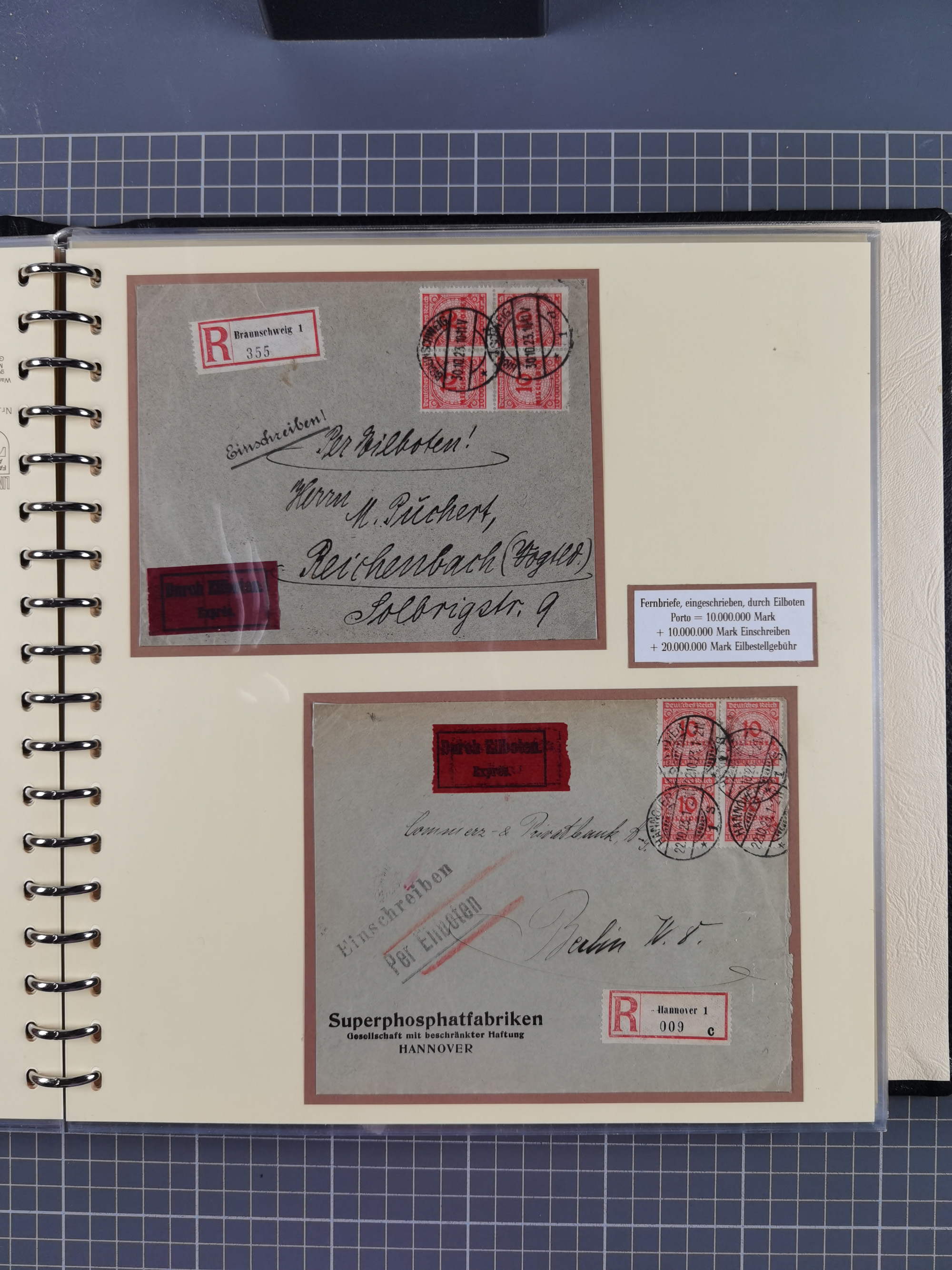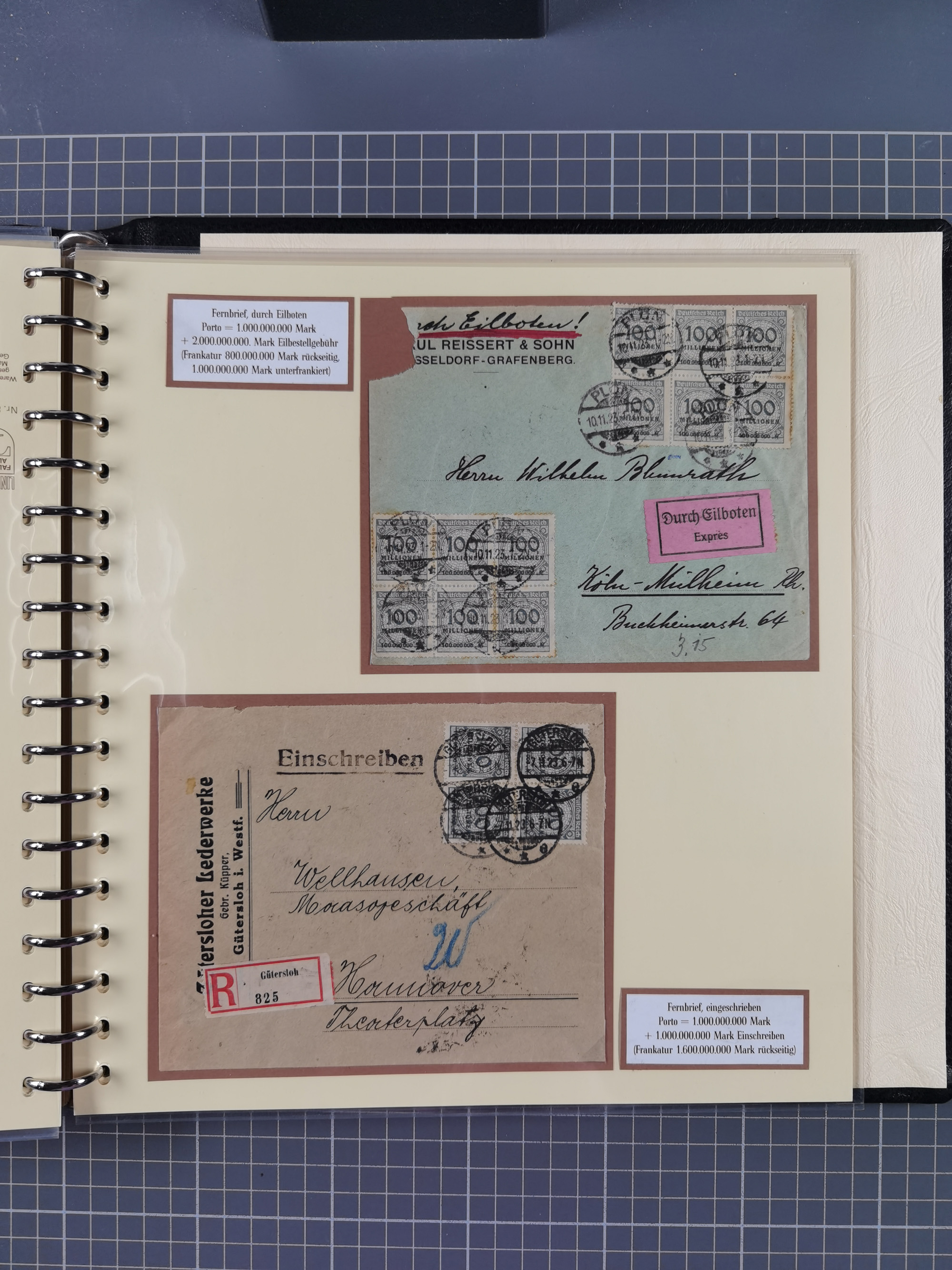 1872/1923, umfangreiche Sammlung mit ca. 800 Briefen,Karten und Ganzsachen. Am Anfang mit kleinem Teil “Hufeisentstempel”, ansonsten liegt der Schwerpunkt bei Infla mit Einzel- und Mehrfachfrankaturen, R-Briefen, Auslandspost, viel Hochinflation mit Dezember-Briefen und Portostufen. Alles auf selbst gestalteten Albenblättern in10 Alben