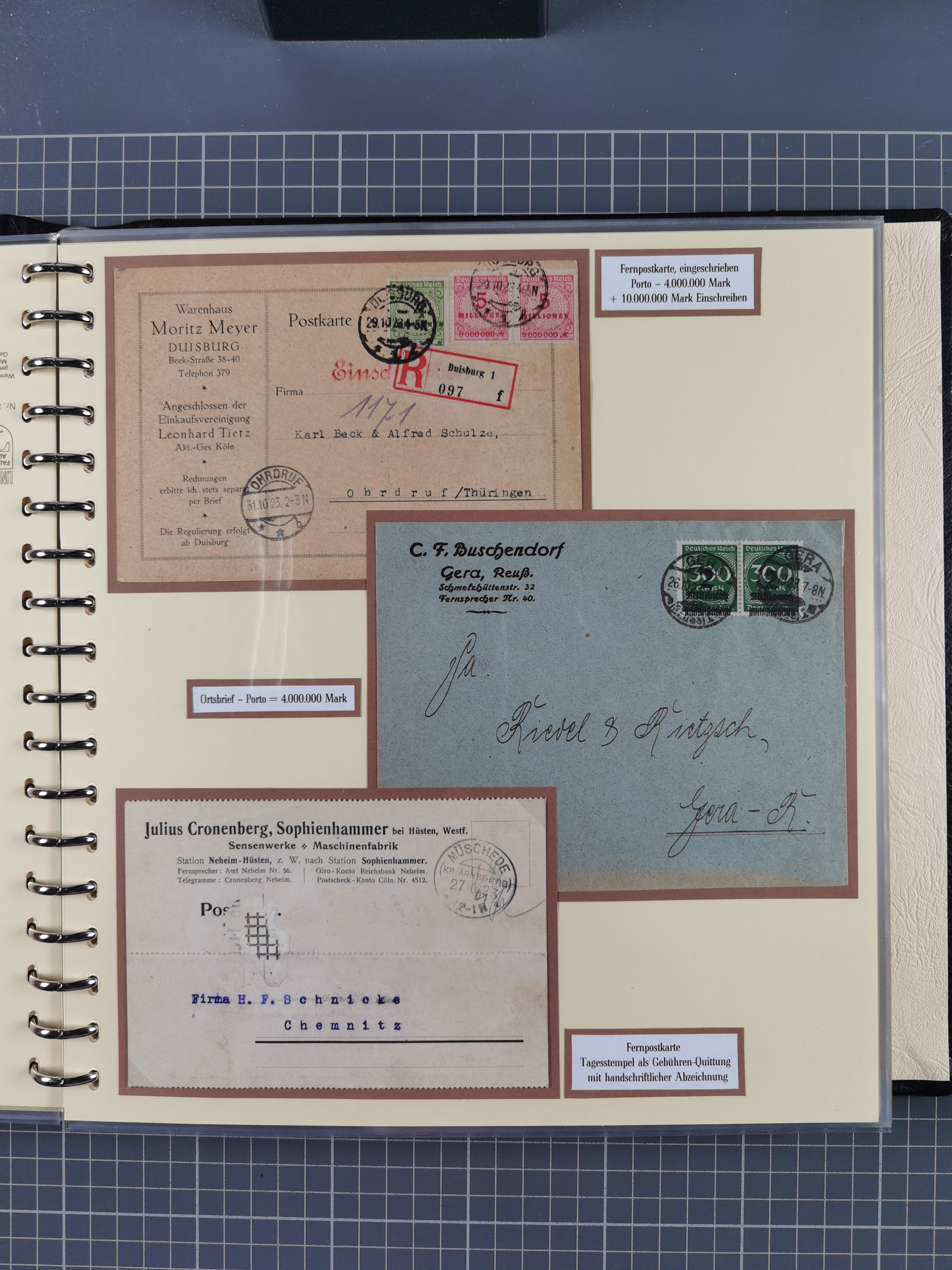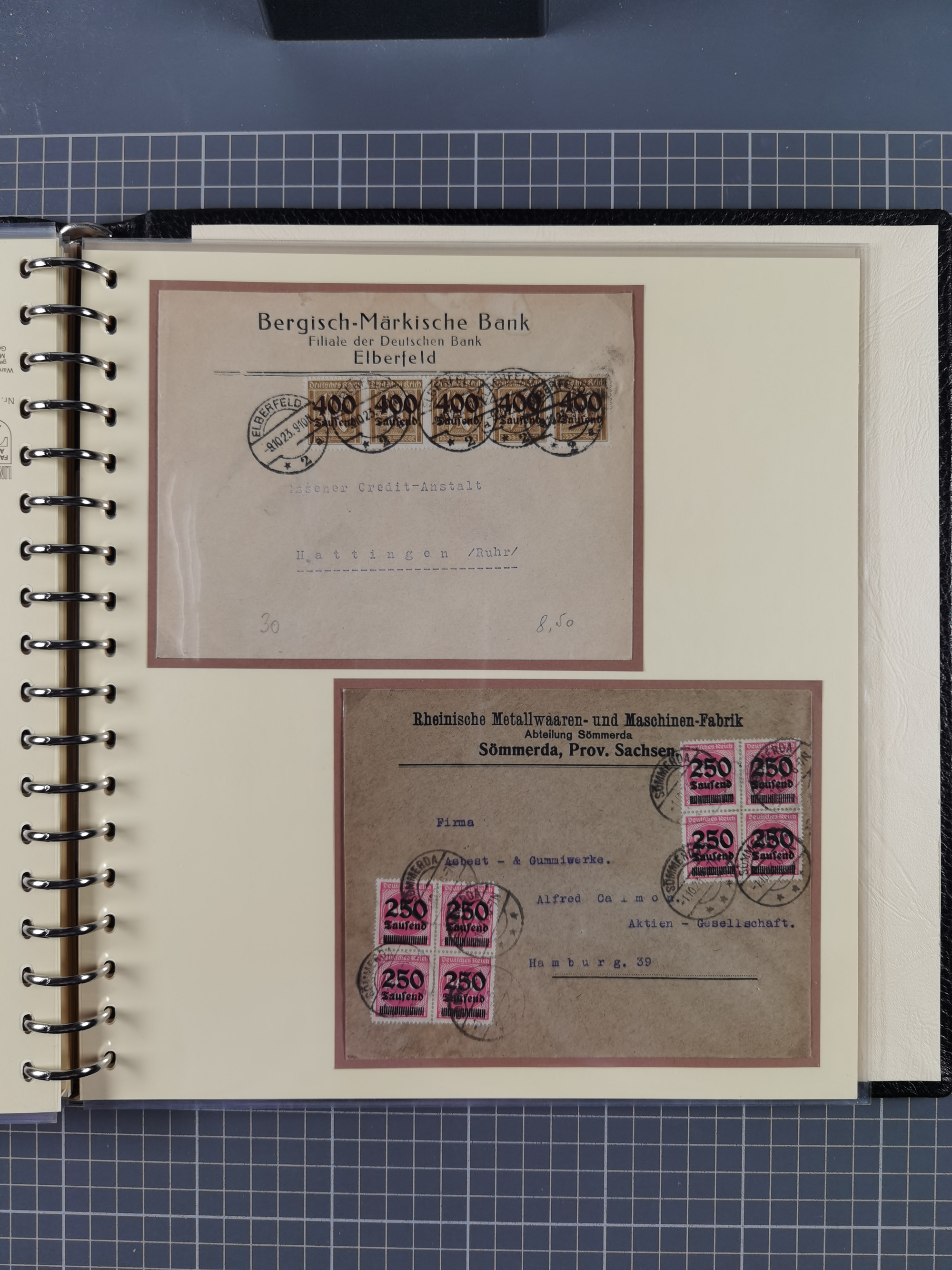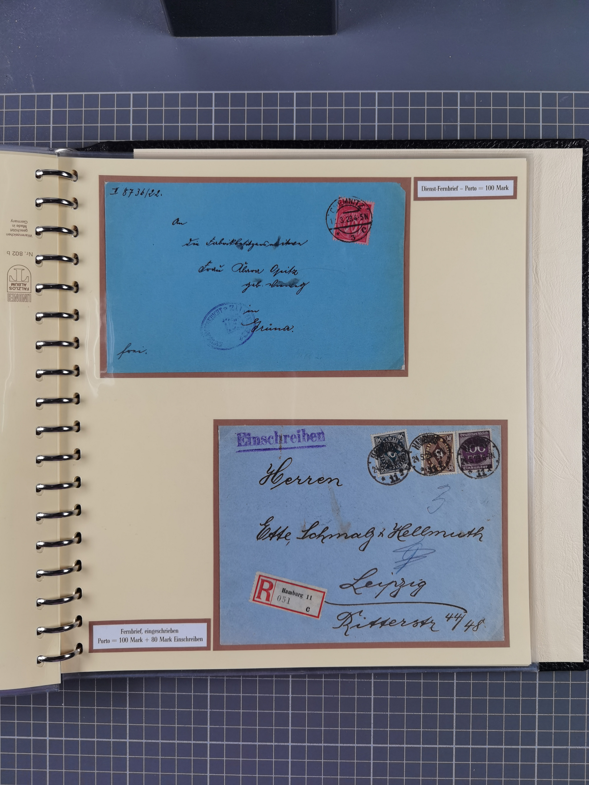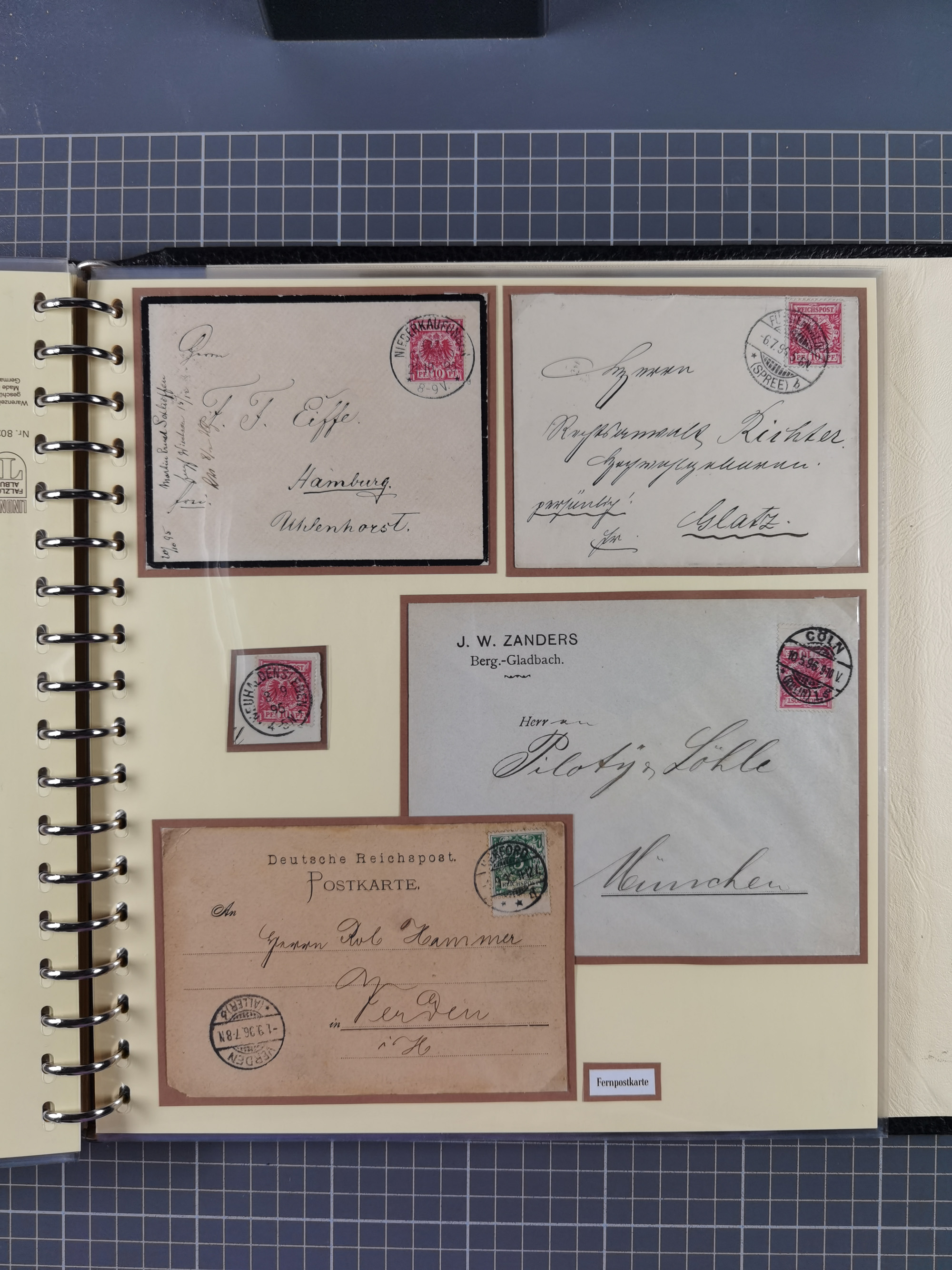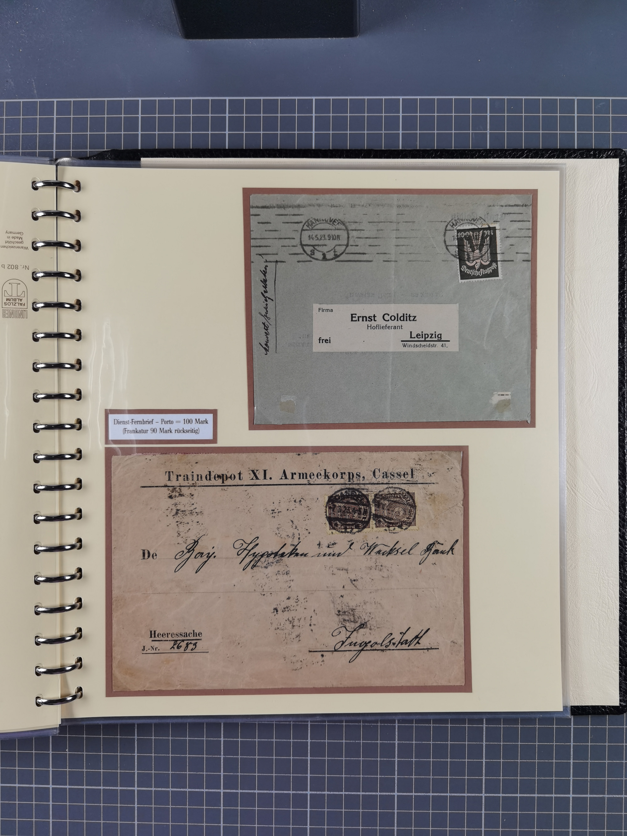 1872/1923, umfangreiche Sammlung mit ca. 800 Briefen,Karten und Ganzsachen. Am Anfang mit kleinem Teil “Hufeisentstempel”, ansonsten liegt der Schwerpunkt bei Infla mit Einzel- und Mehrfachfrankaturen, R-Briefen, Auslandspost, viel Hochinflation mit Dezember-Briefen und Portostufen. Alles auf selbst gestalteten Albenblättern in10 Alben