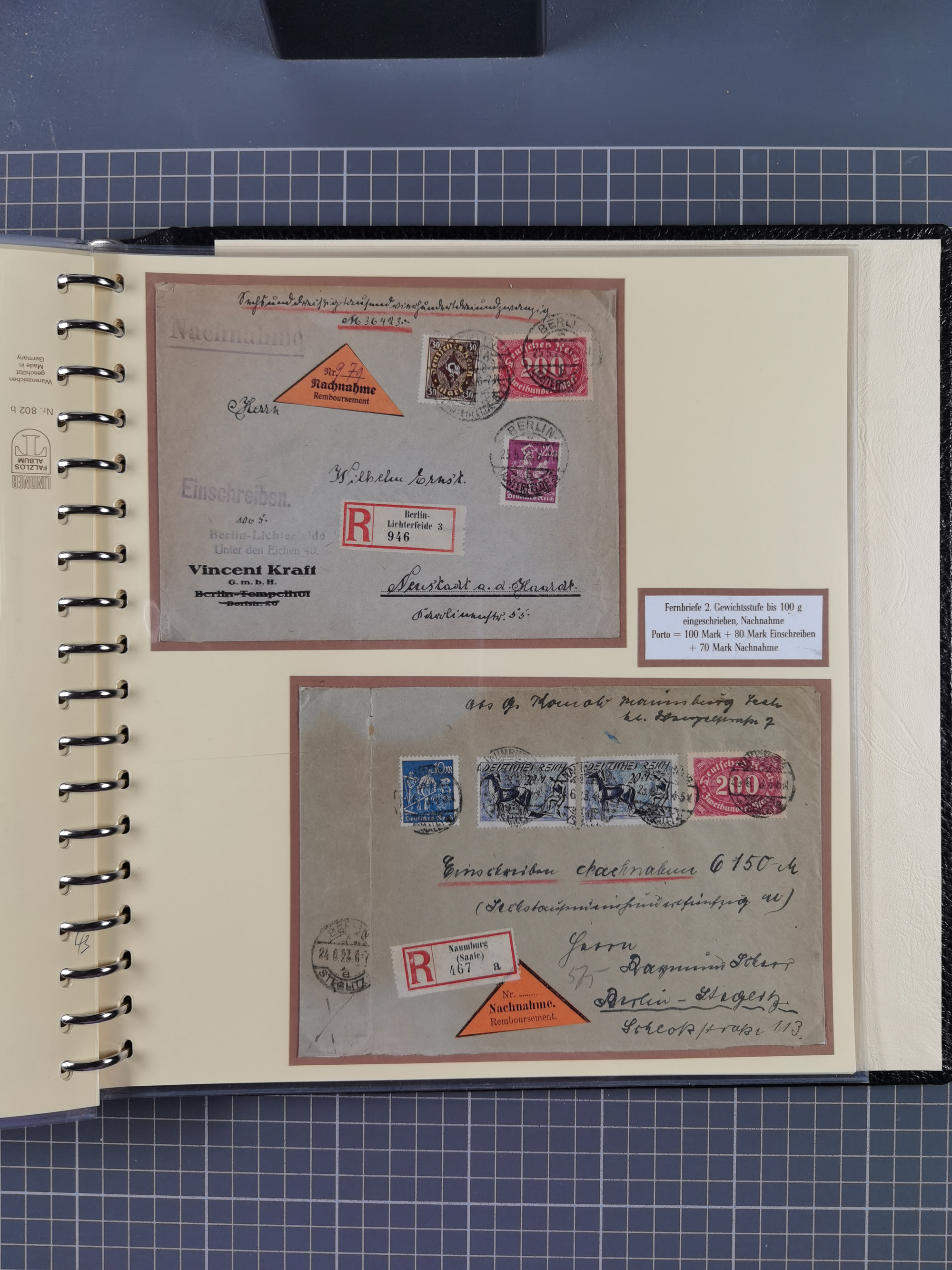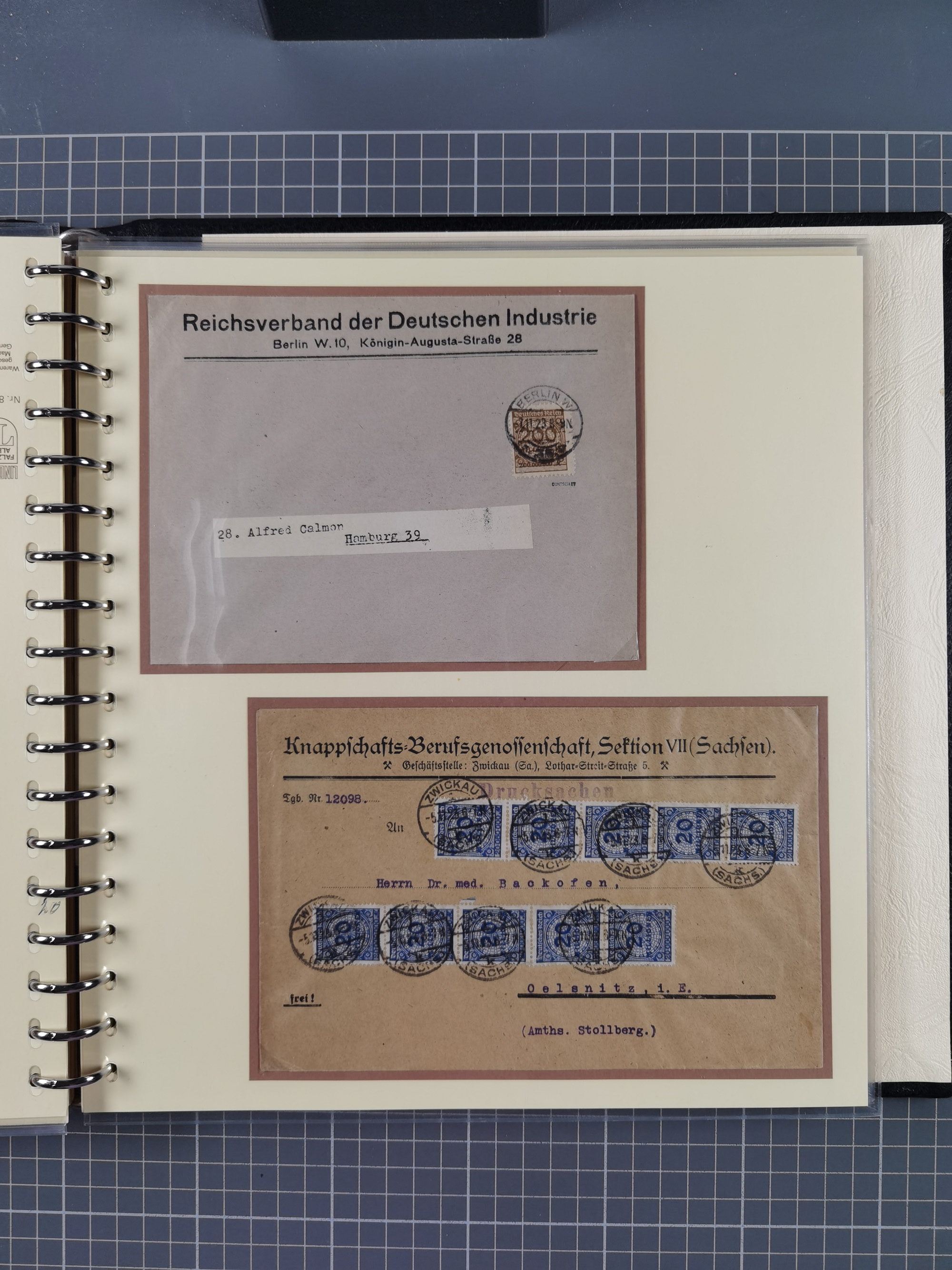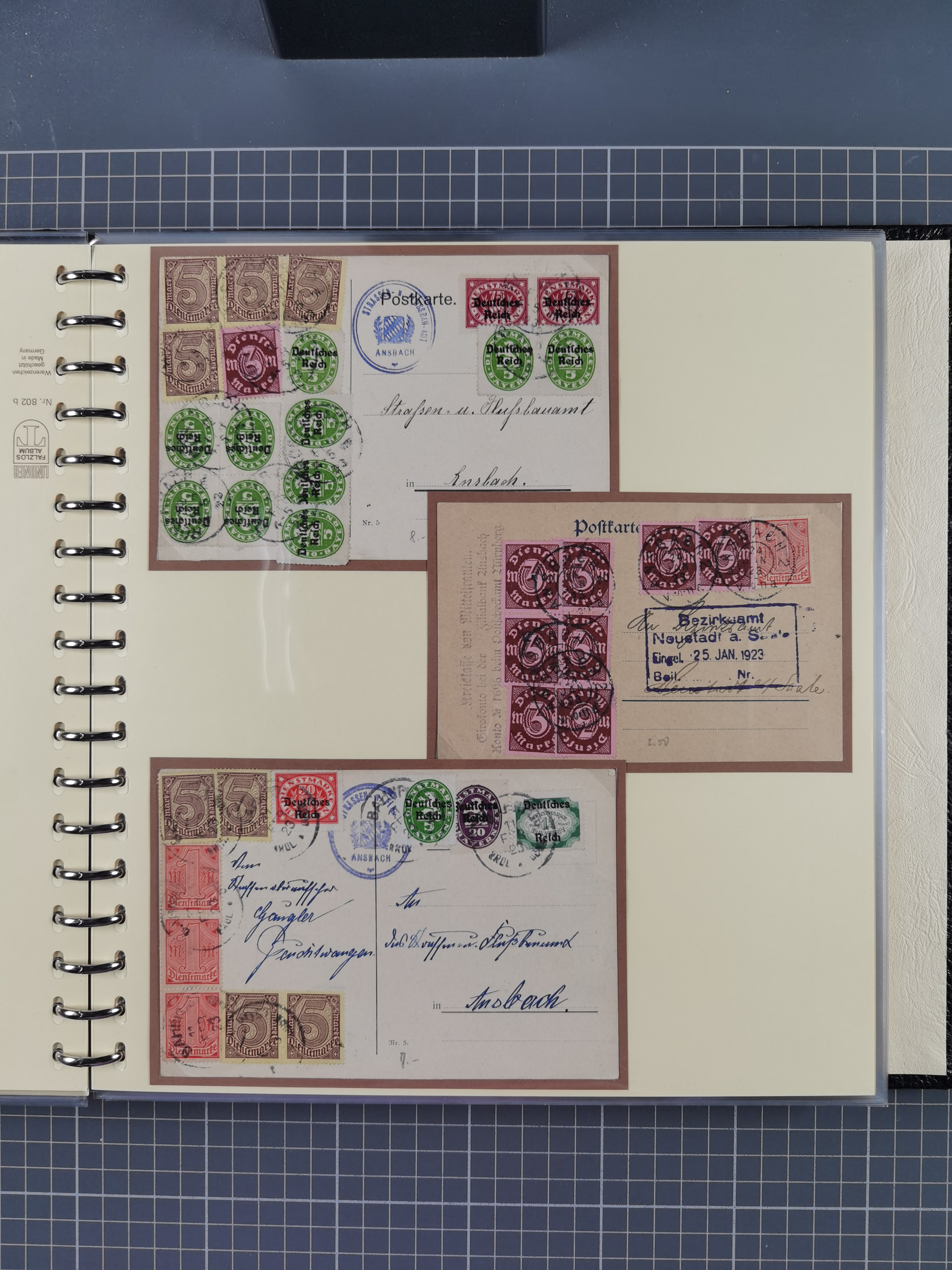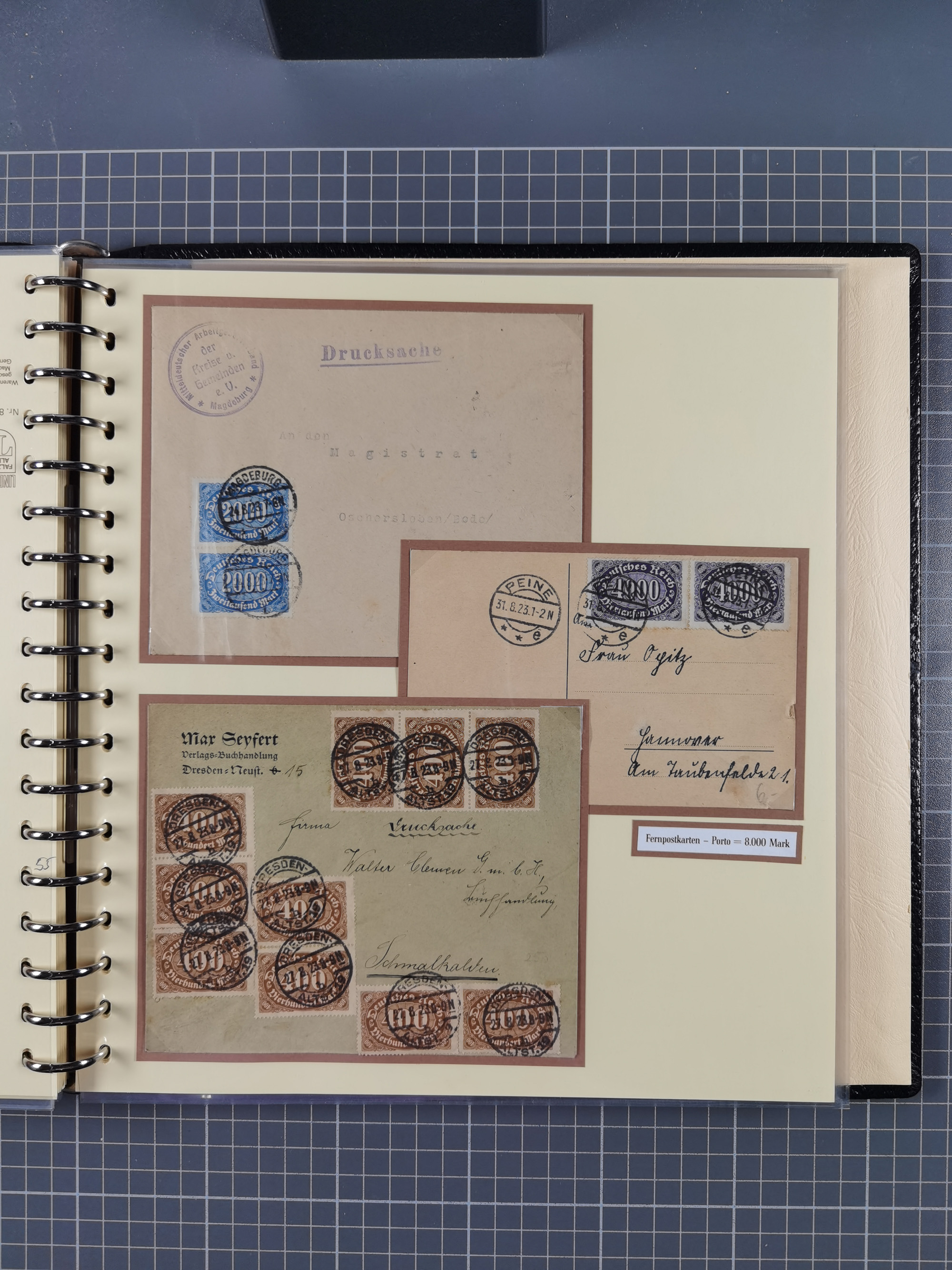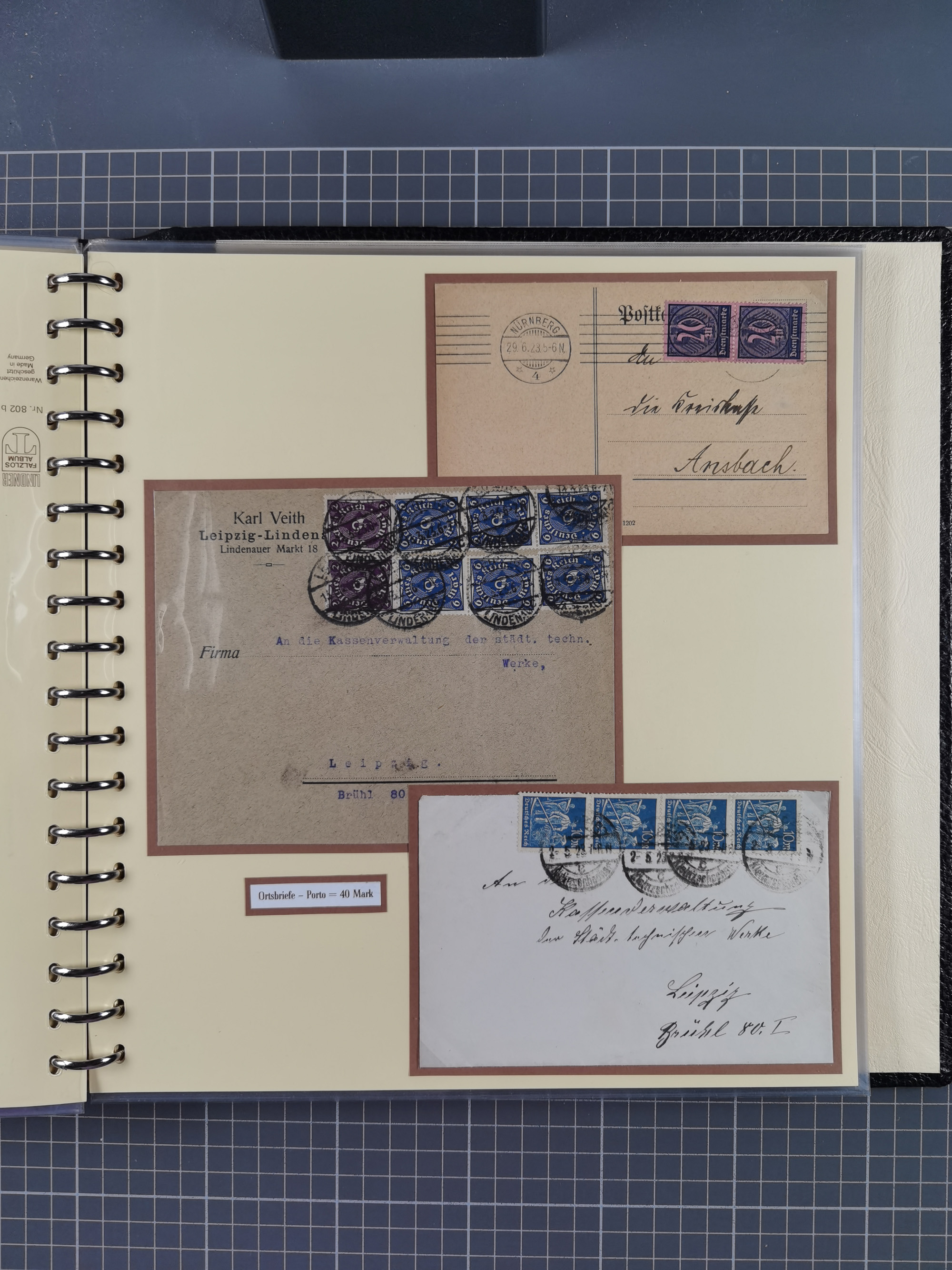 1872/1923, umfangreiche Sammlung mit ca. 800 Briefen,Karten und Ganzsachen. Am Anfang mit kleinem Teil “Hufeisentstempel”, ansonsten liegt der Schwerpunkt bei Infla mit Einzel- und Mehrfachfrankaturen, R-Briefen, Auslandspost, viel Hochinflation mit Dezember-Briefen und Portostufen. Alles auf selbst gestalteten Albenblättern in10 Alben