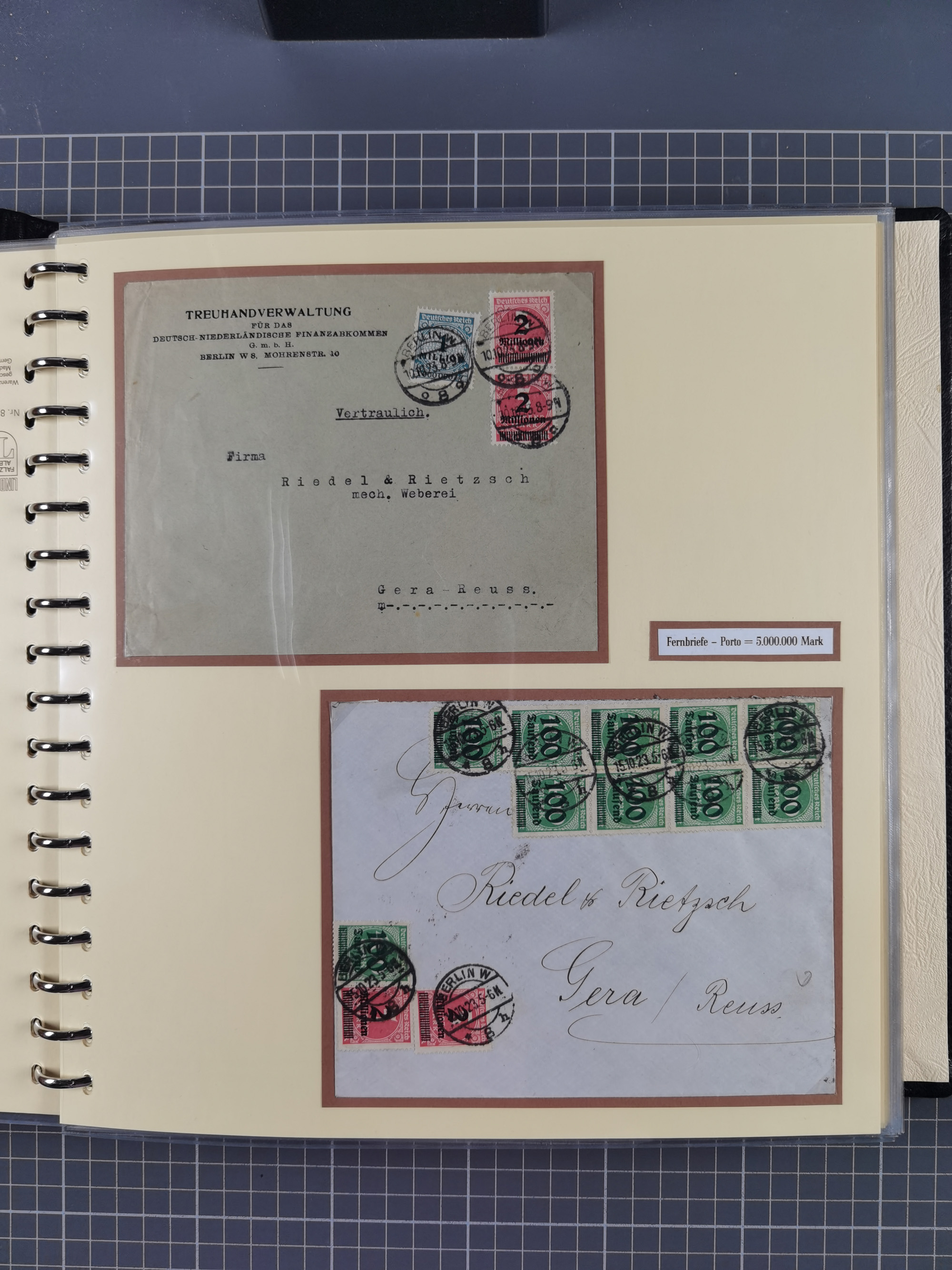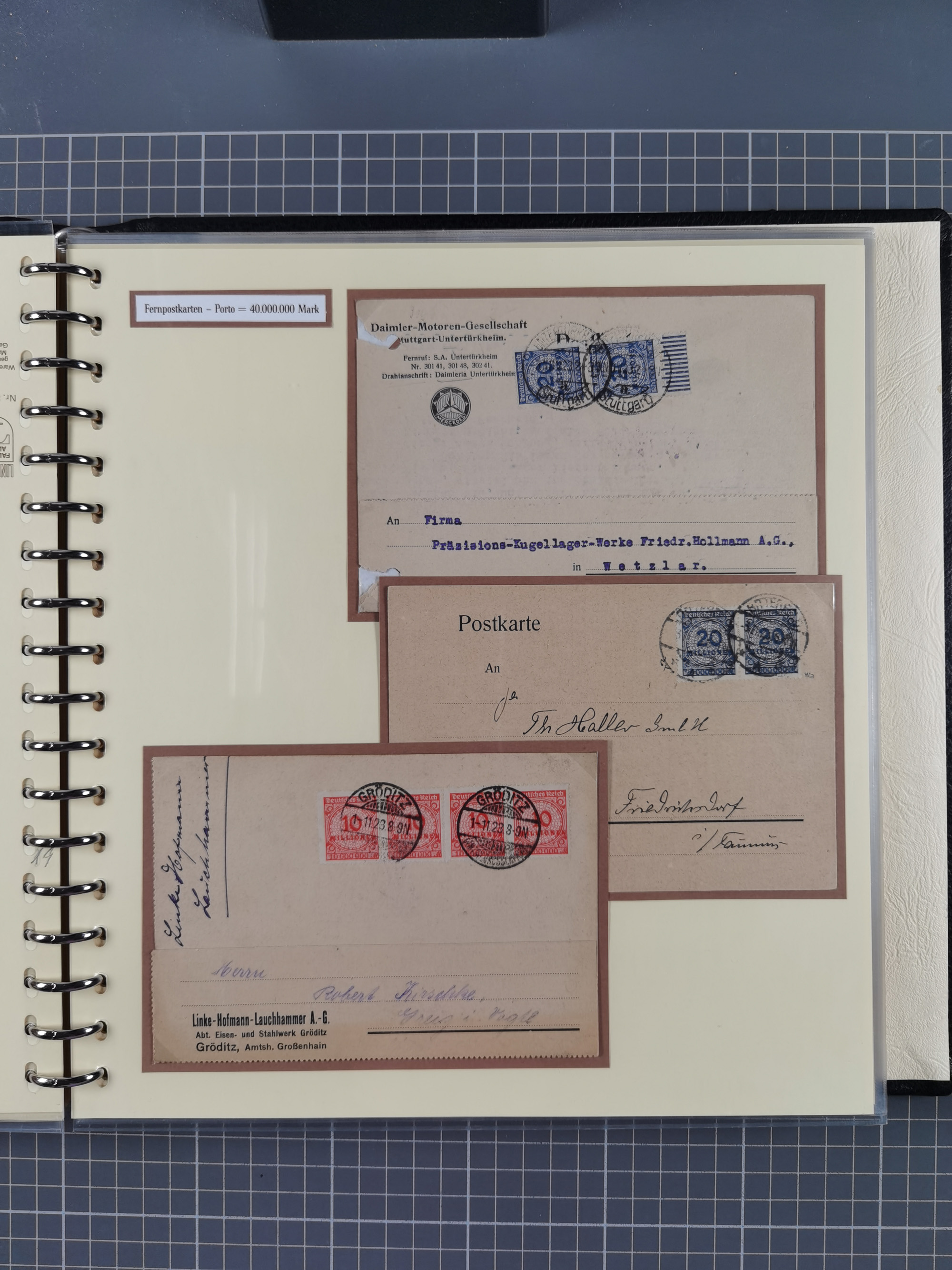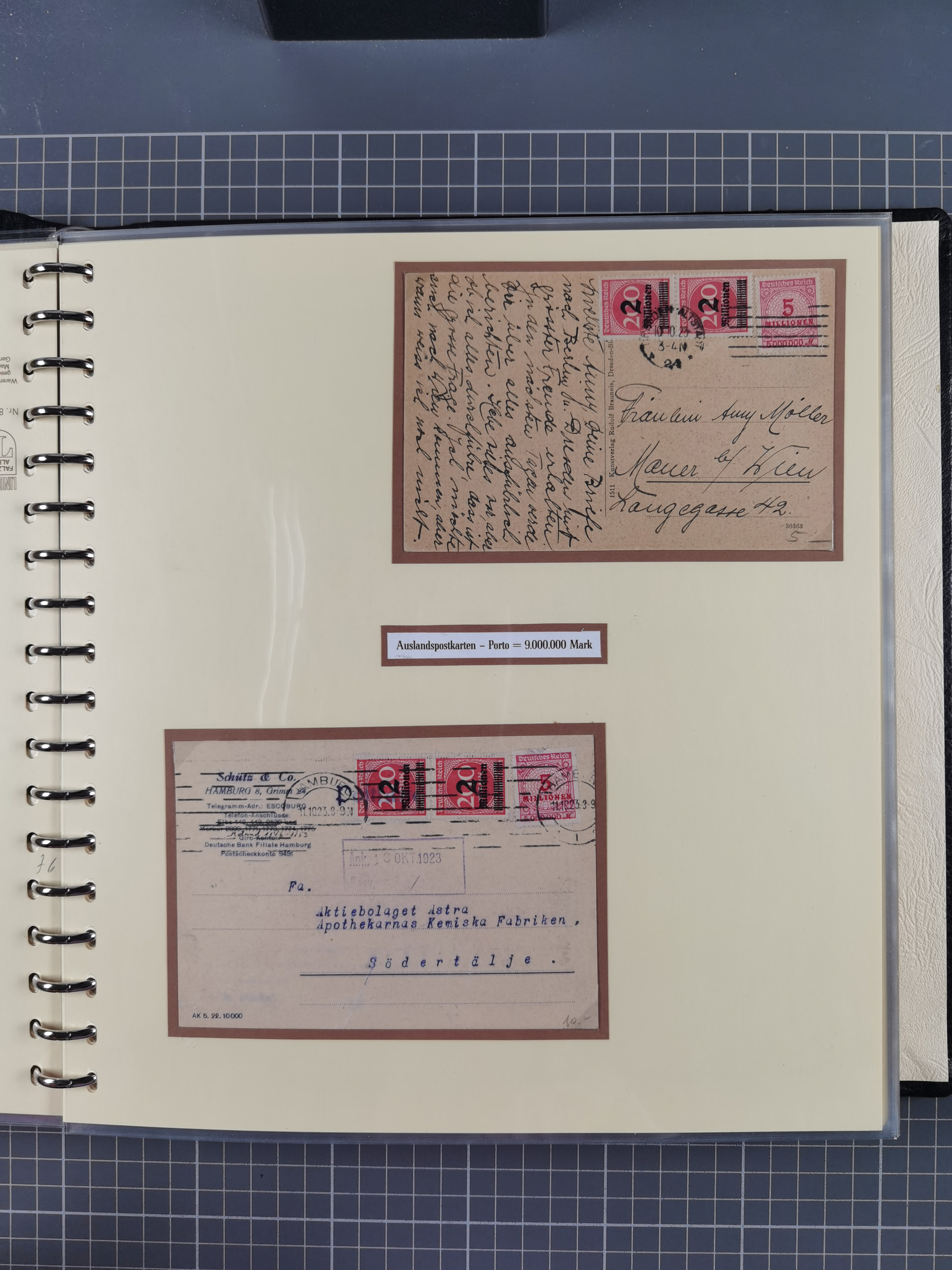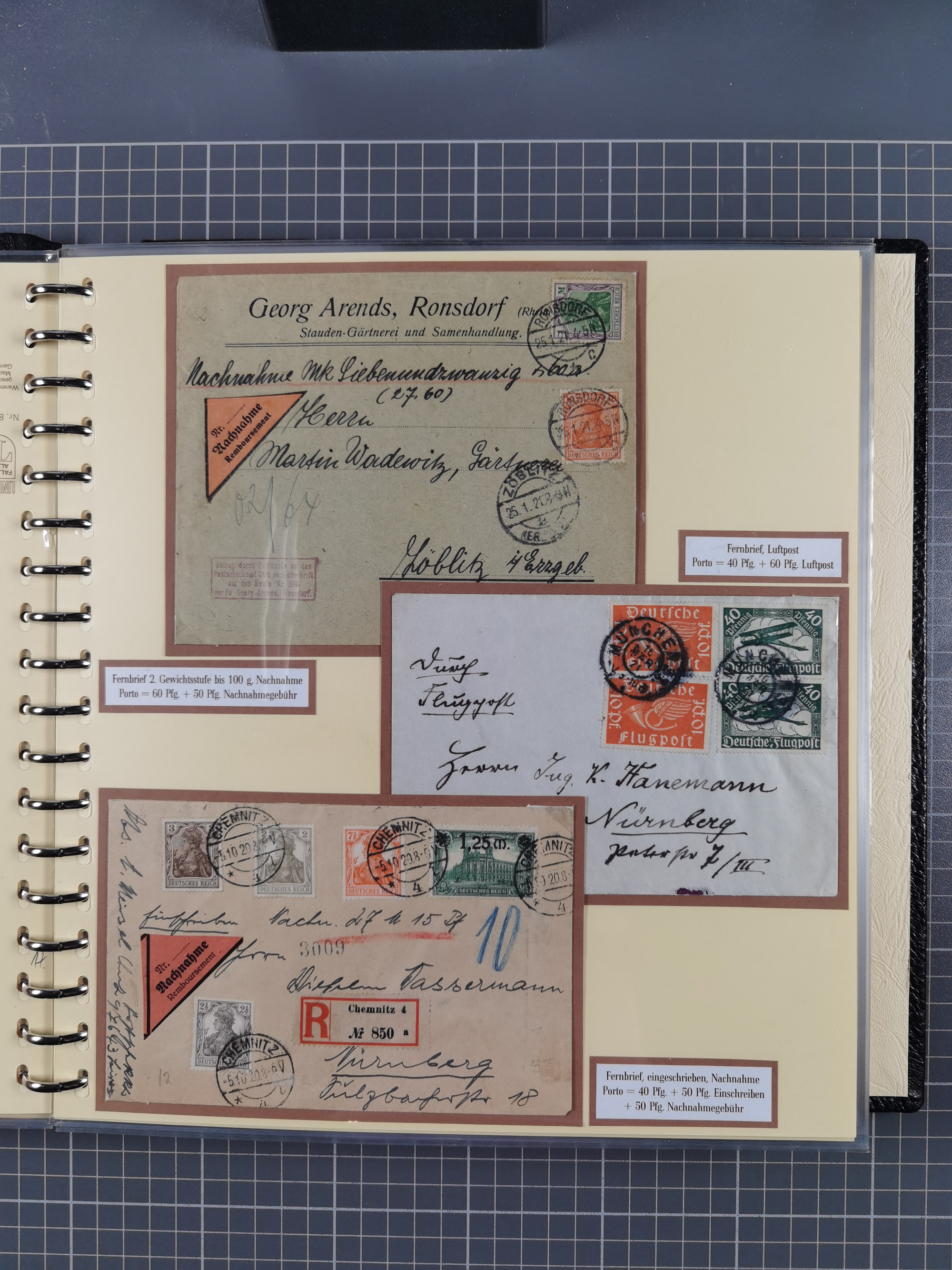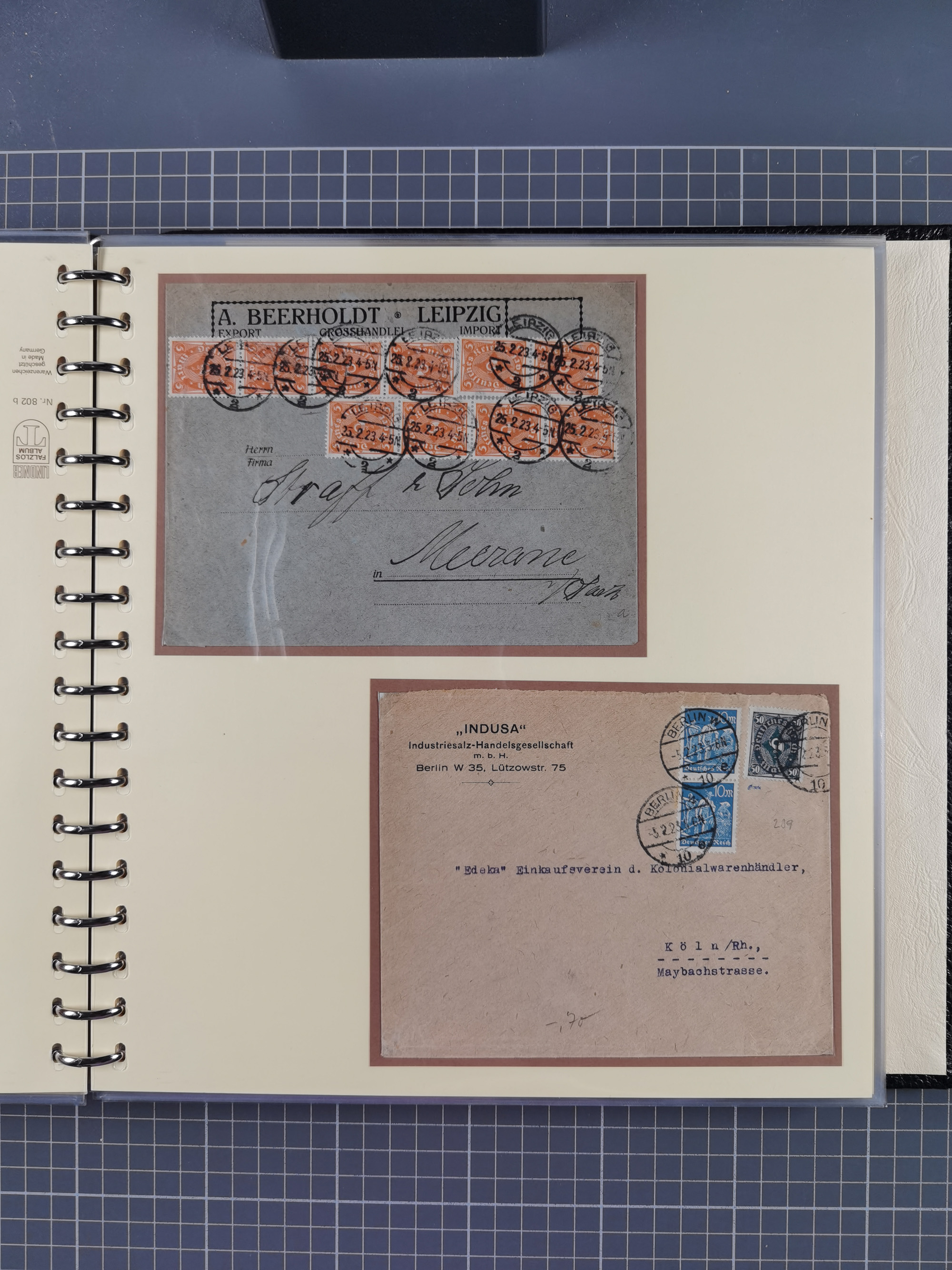 1872/1923, umfangreiche Sammlung mit ca. 800 Briefen,Karten und Ganzsachen. Am Anfang mit kleinem Teil “Hufeisentstempel”, ansonsten liegt der Schwerpunkt bei Infla mit Einzel- und Mehrfachfrankaturen, R-Briefen, Auslandspost, viel Hochinflation mit Dezember-Briefen und Portostufen. Alles auf selbst gestalteten Albenblättern in10 Alben