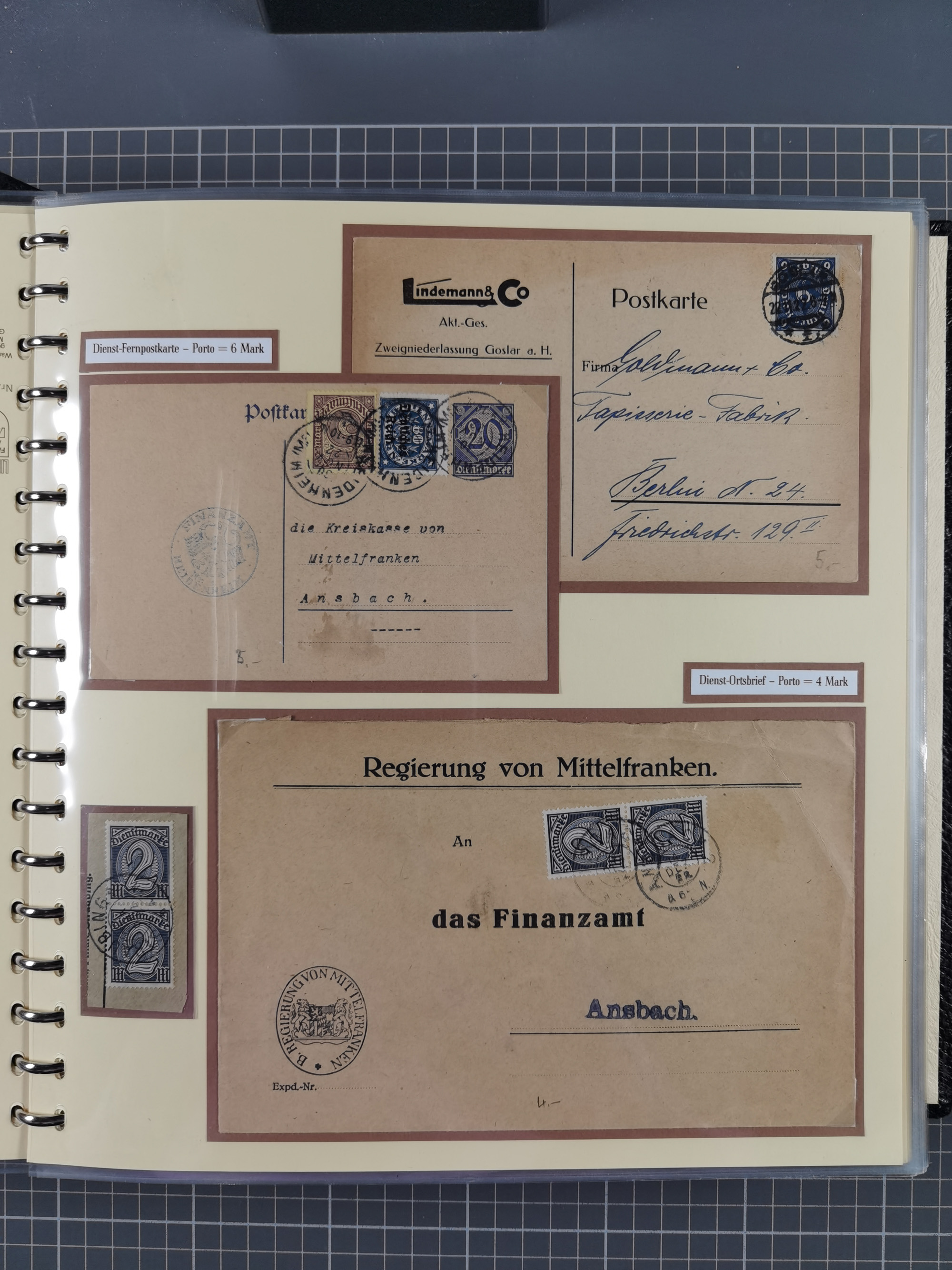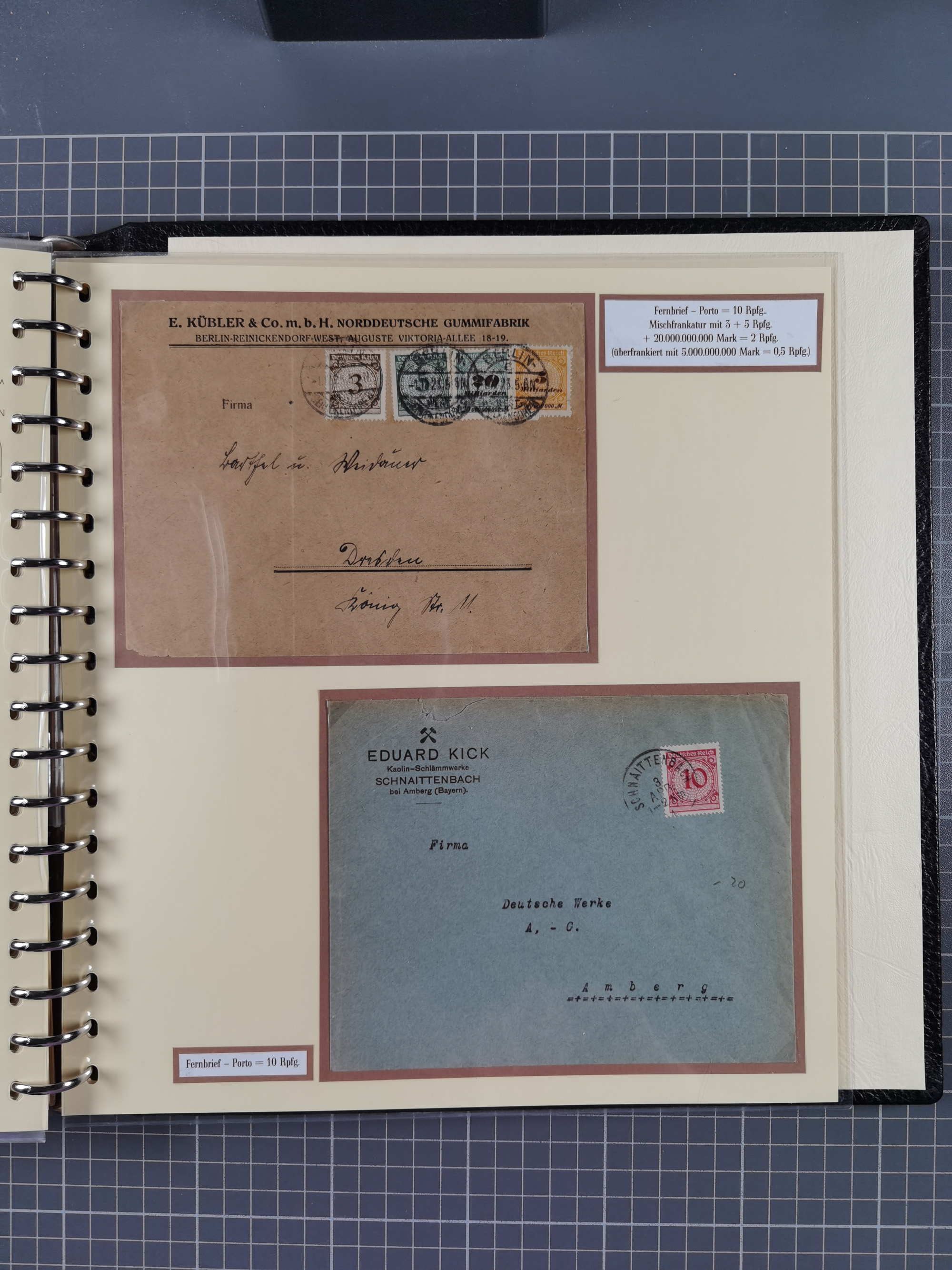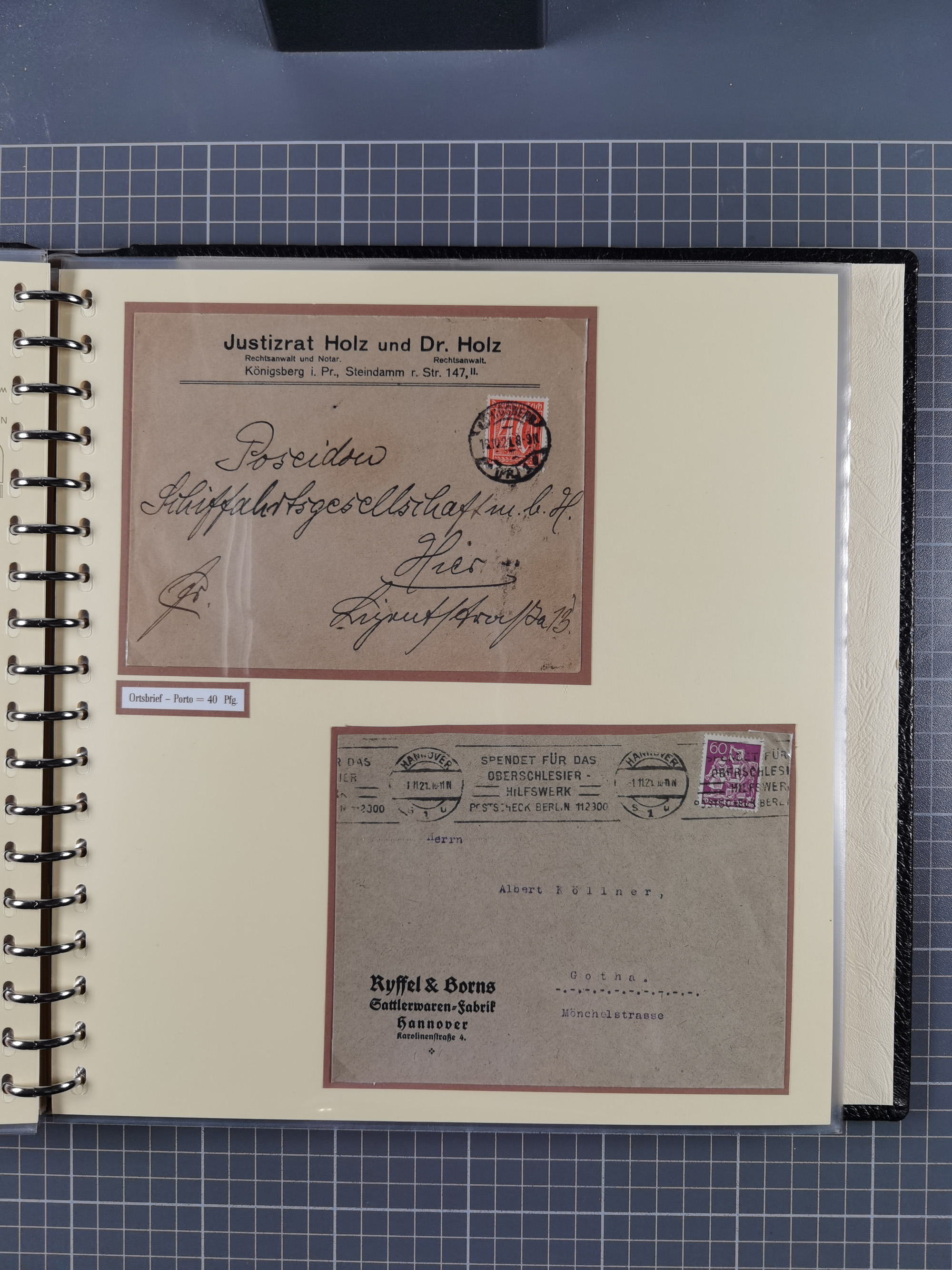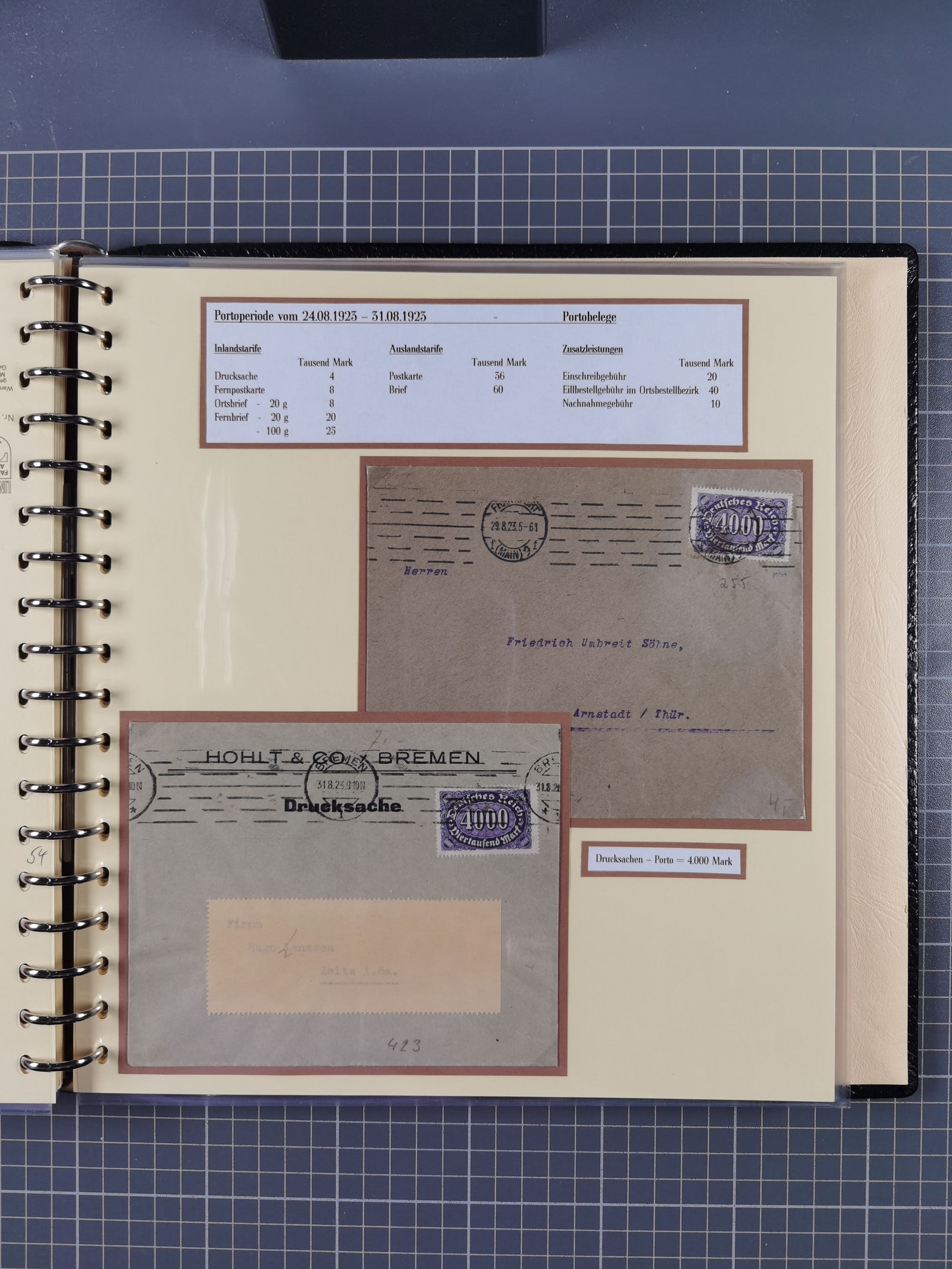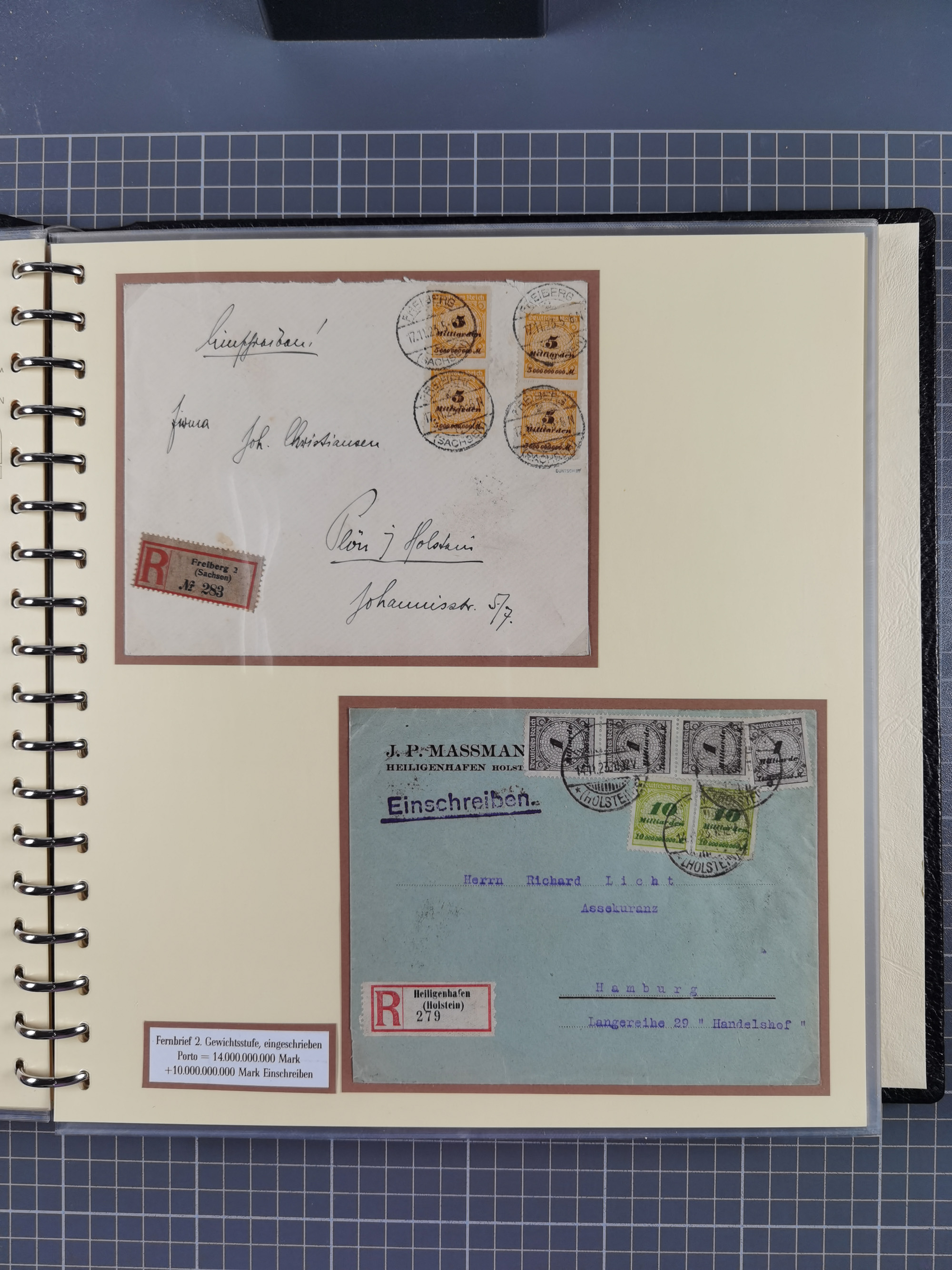 1872/1923, umfangreiche Sammlung mit ca. 800 Briefen,Karten und Ganzsachen. Am Anfang mit kleinem Teil “Hufeisentstempel”, ansonsten liegt der Schwerpunkt bei Infla mit Einzel- und Mehrfachfrankaturen, R-Briefen, Auslandspost, viel Hochinflation mit Dezember-Briefen und Portostufen. Alles auf selbst gestalteten Albenblättern in10 Alben