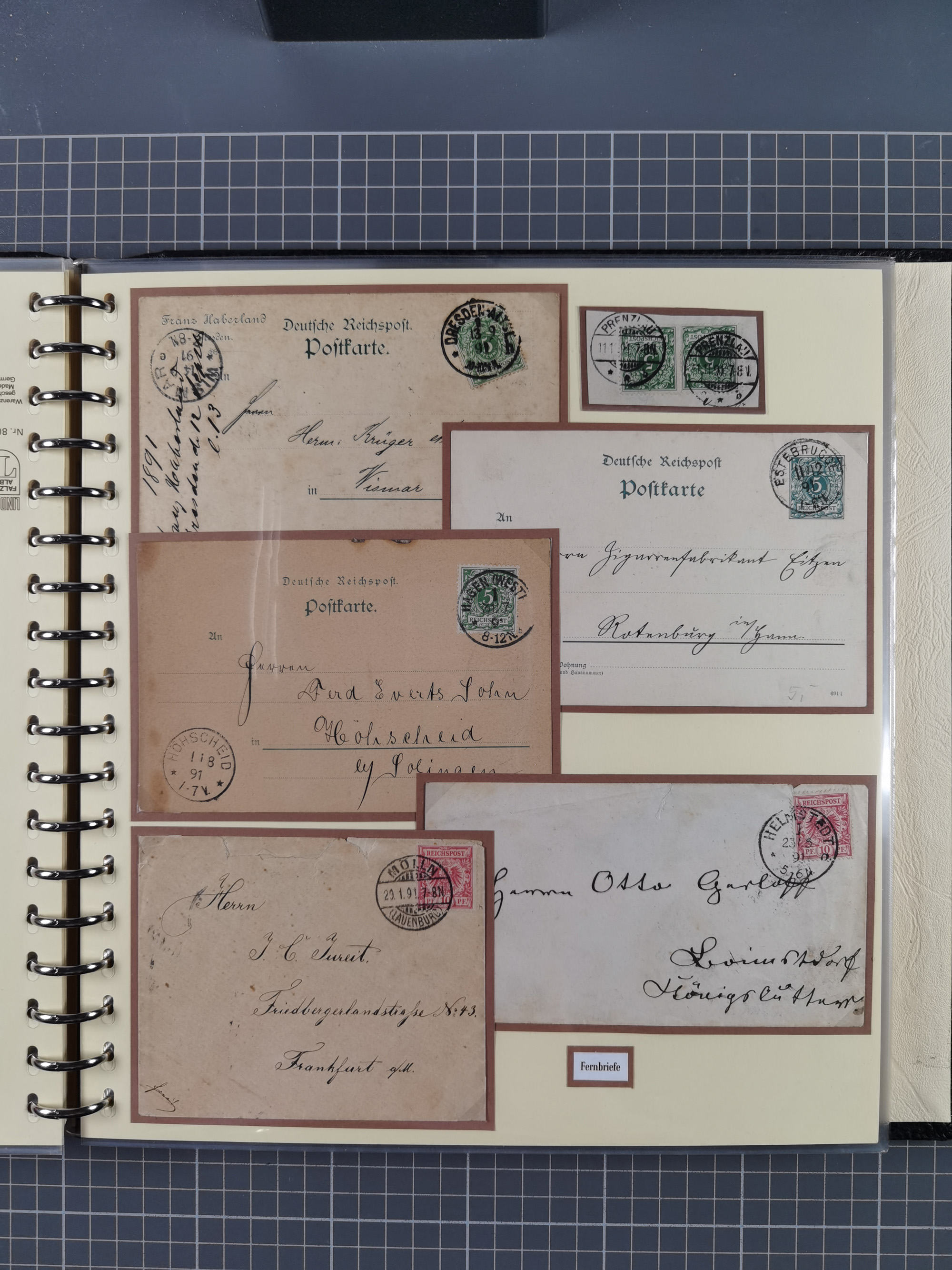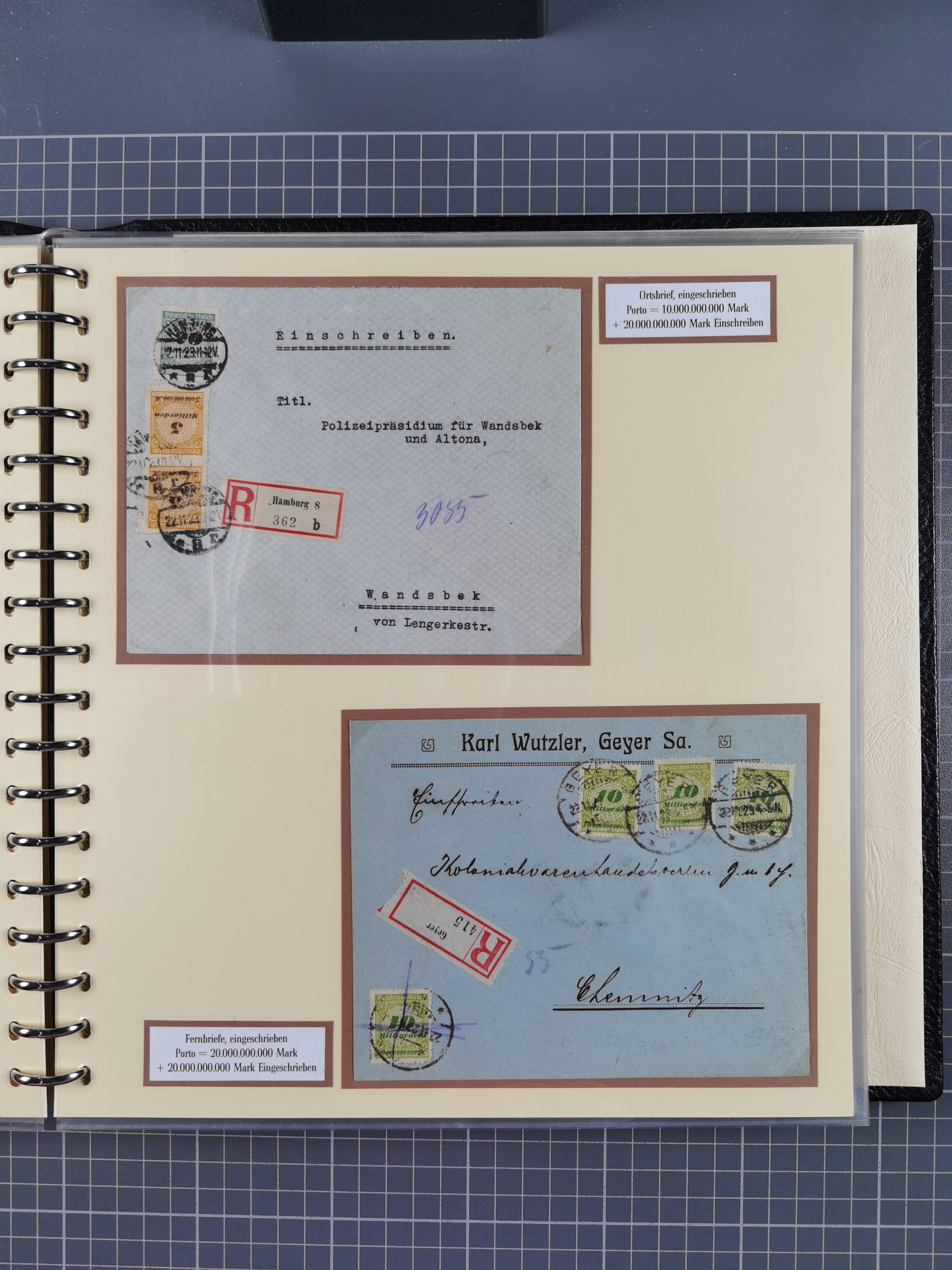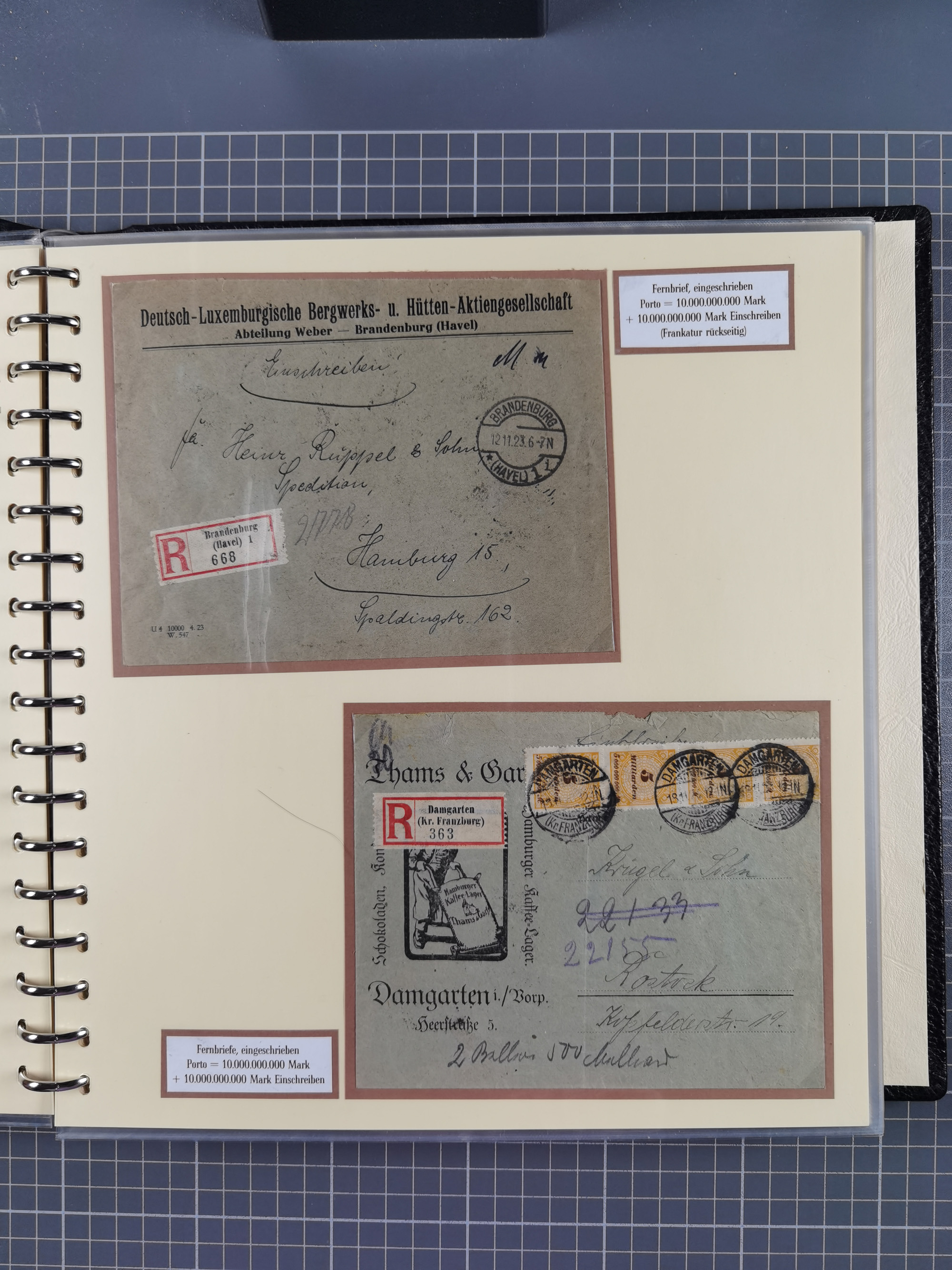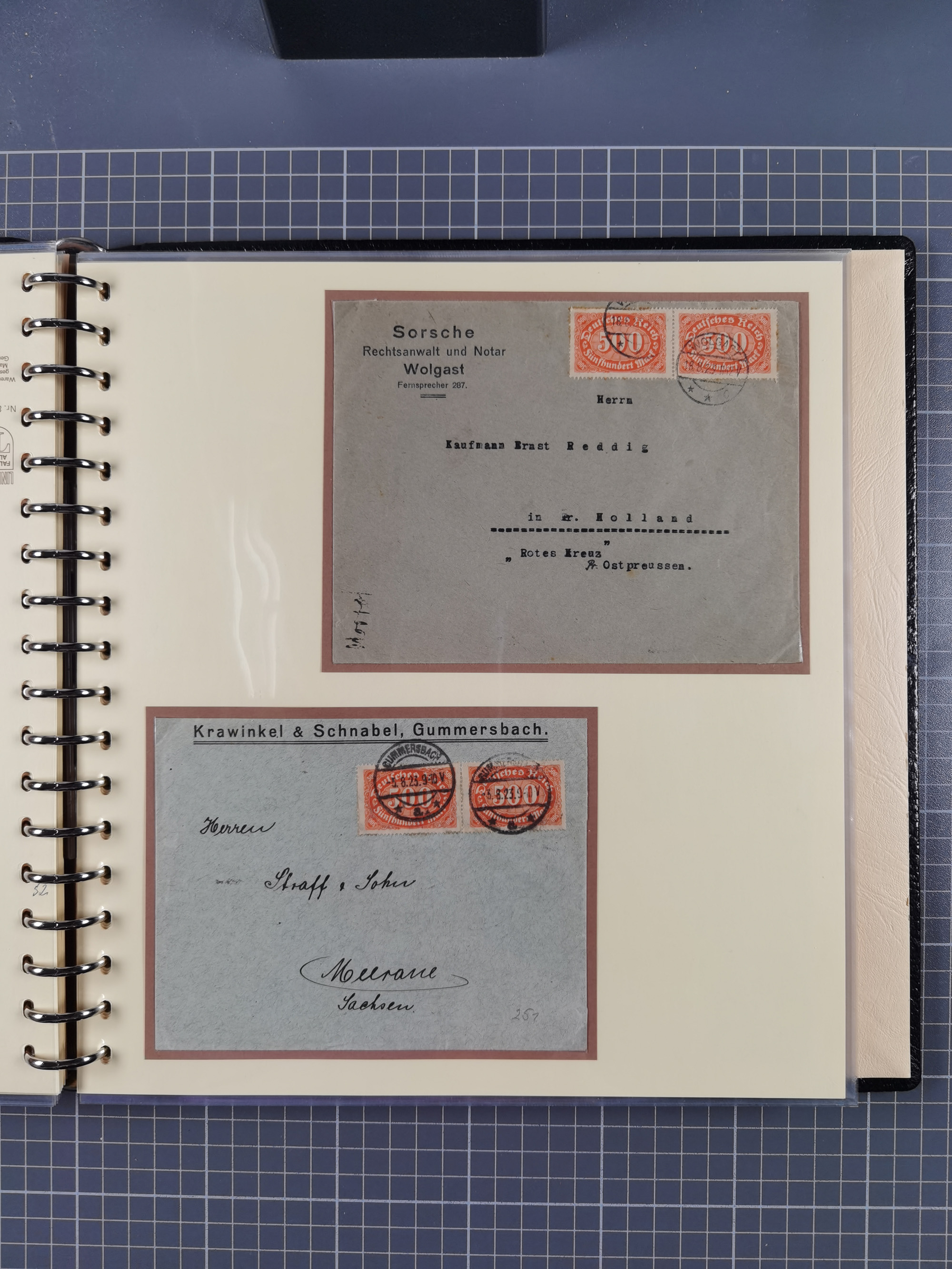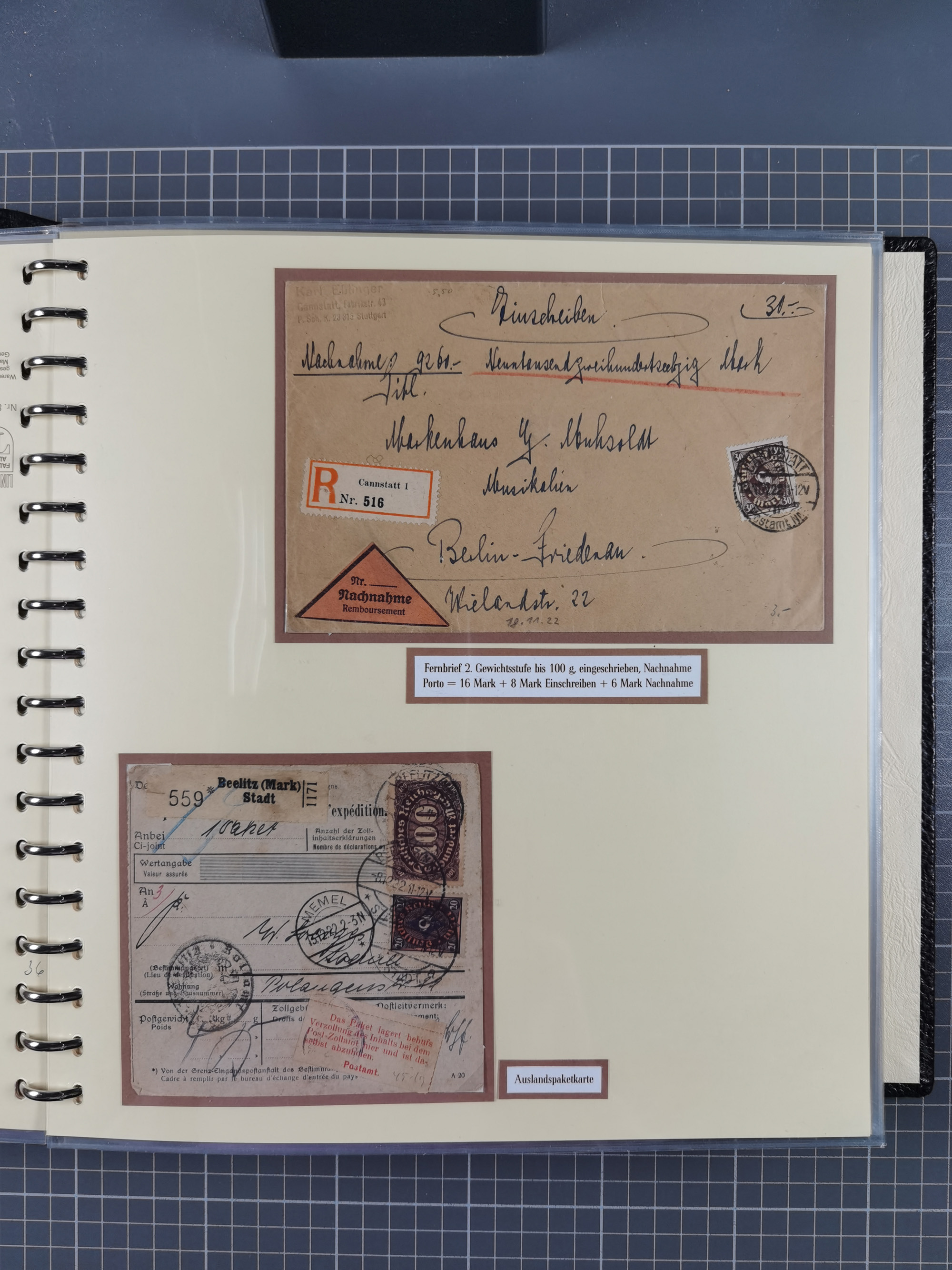 1872/1923, umfangreiche Sammlung mit ca. 800 Briefen,Karten und Ganzsachen. Am Anfang mit kleinem Teil “Hufeisentstempel”, ansonsten liegt der Schwerpunkt bei Infla mit Einzel- und Mehrfachfrankaturen, R-Briefen, Auslandspost, viel Hochinflation mit Dezember-Briefen und Portostufen. Alles auf selbst gestalteten Albenblättern in10 Alben