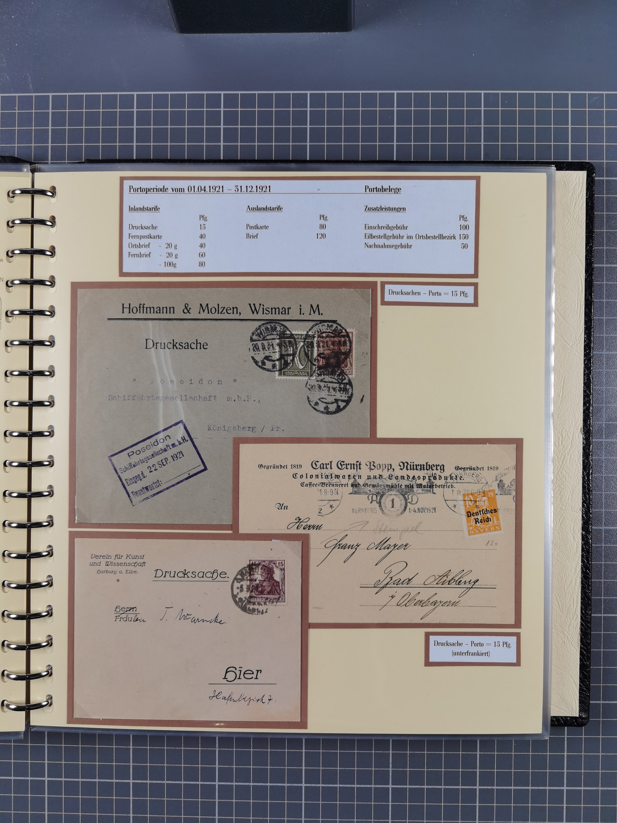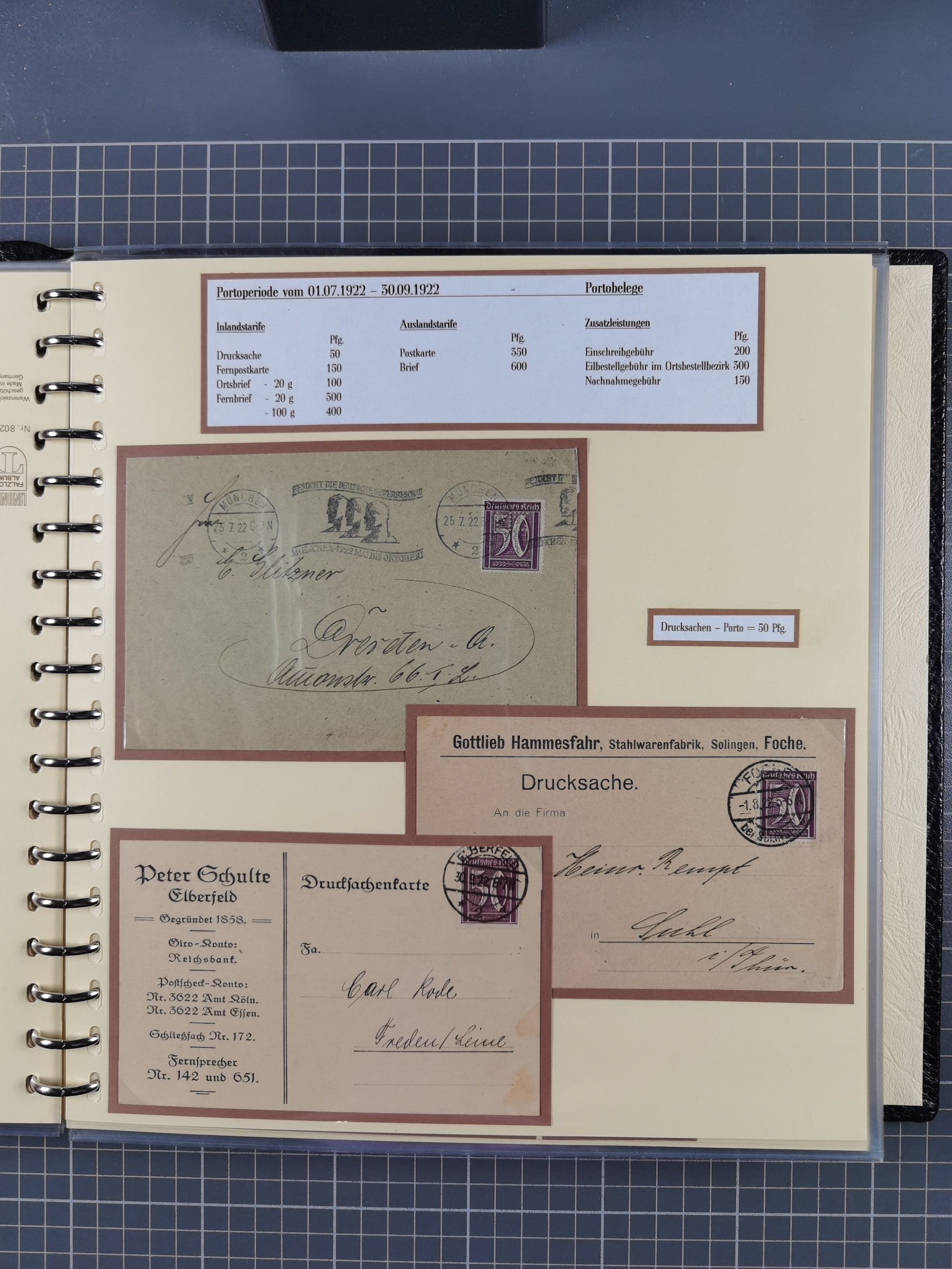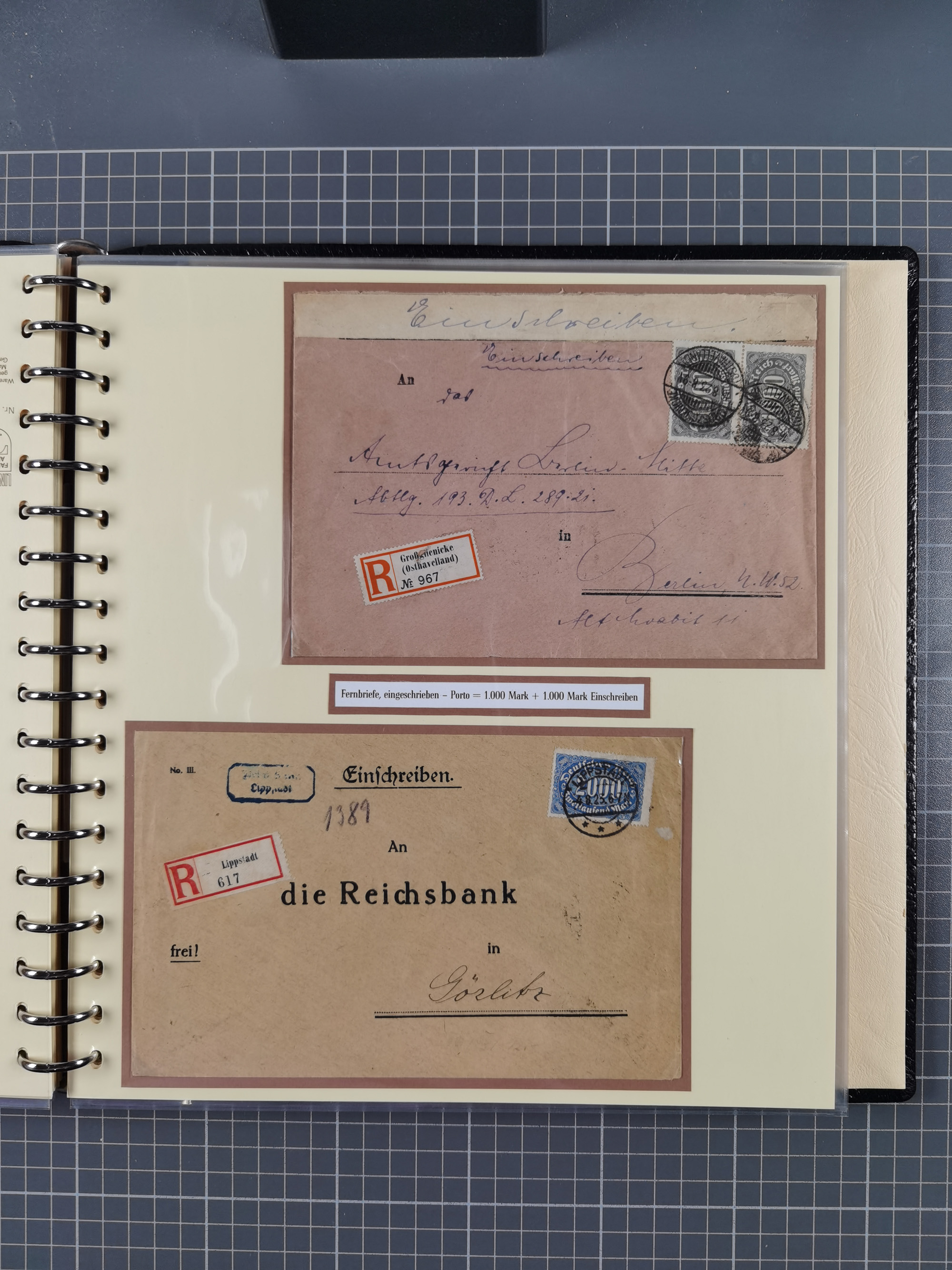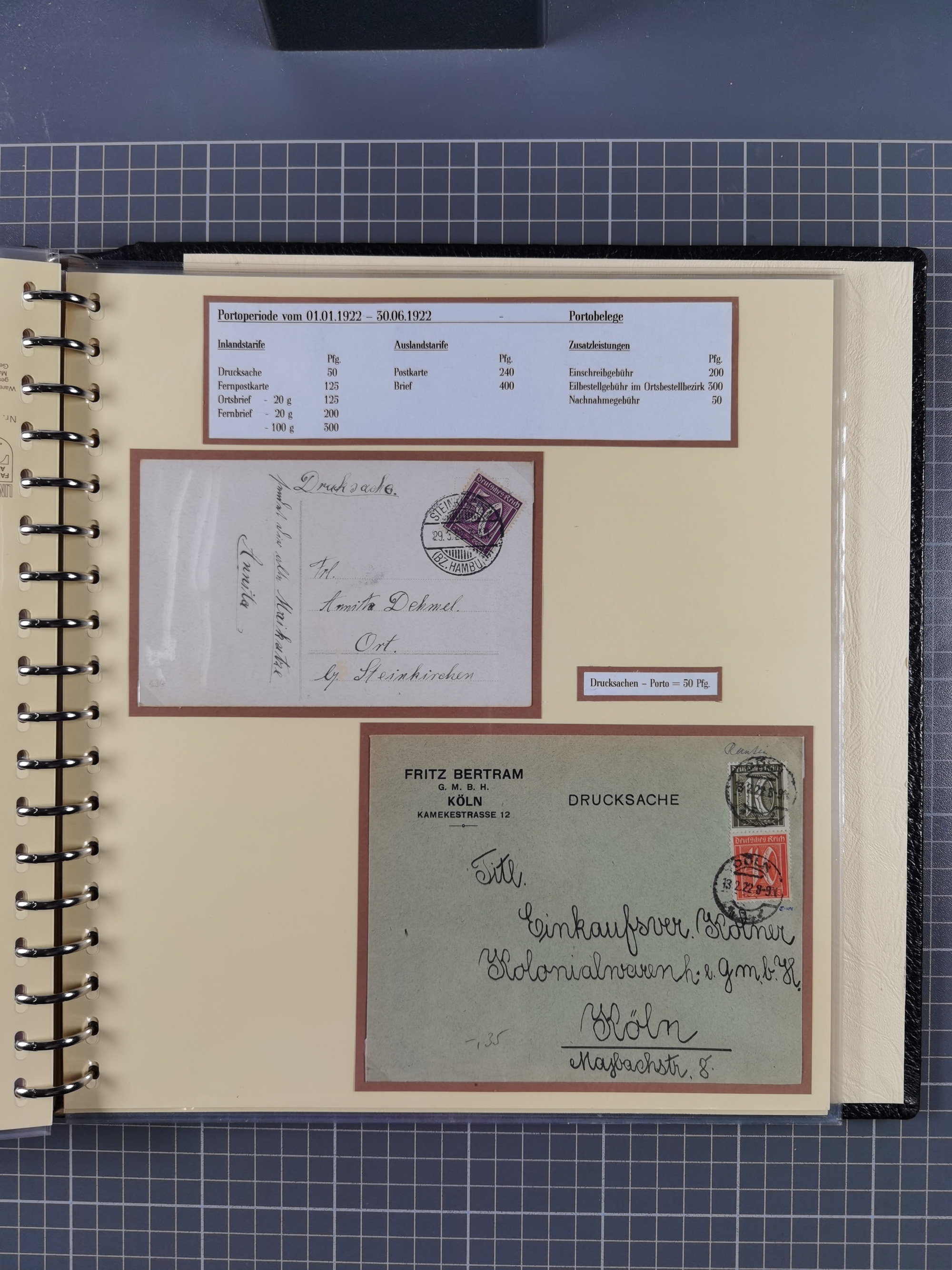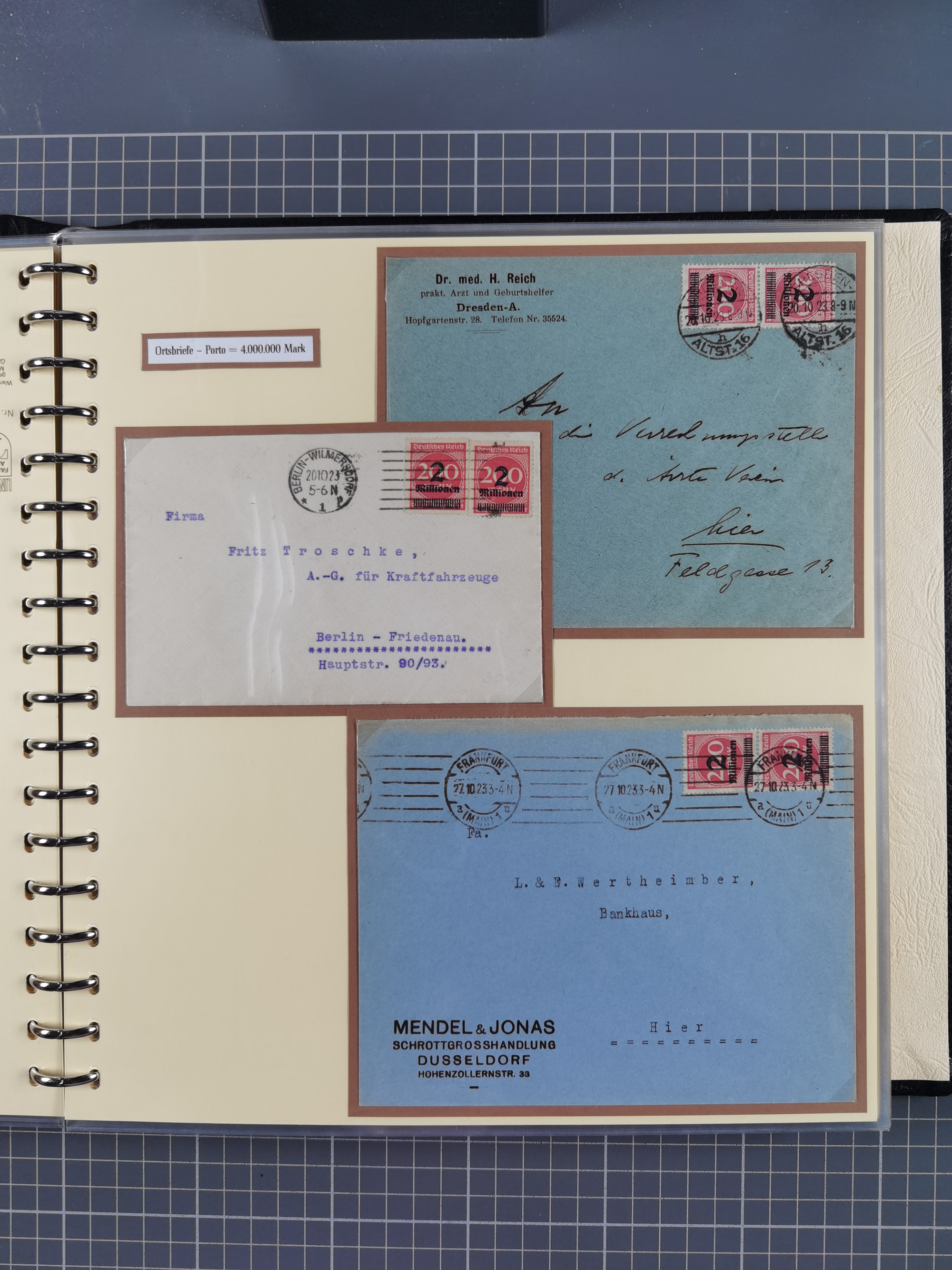 1872/1923, umfangreiche Sammlung mit ca. 800 Briefen,Karten und Ganzsachen. Am Anfang mit kleinem Teil “Hufeisentstempel”, ansonsten liegt der Schwerpunkt bei Infla mit Einzel- und Mehrfachfrankaturen, R-Briefen, Auslandspost, viel Hochinflation mit Dezember-Briefen und Portostufen. Alles auf selbst gestalteten Albenblättern in10 Alben