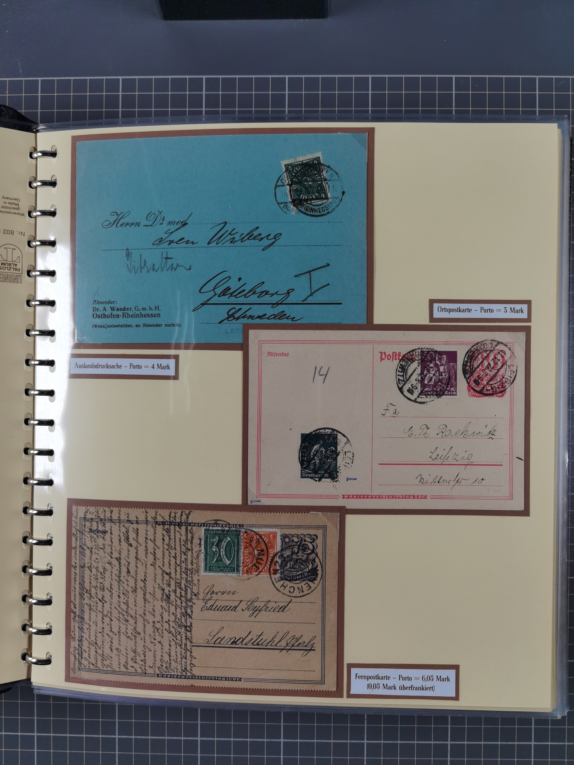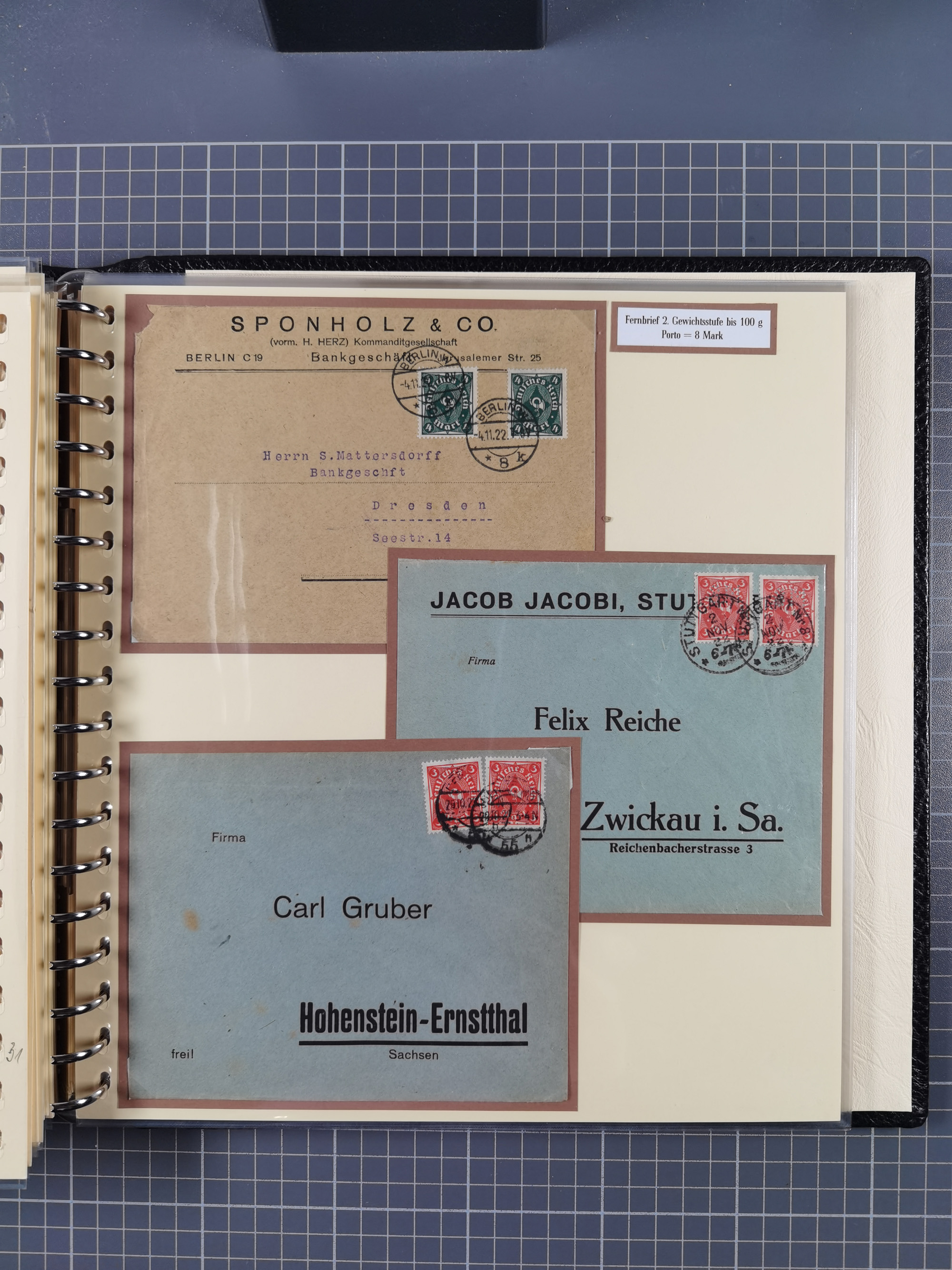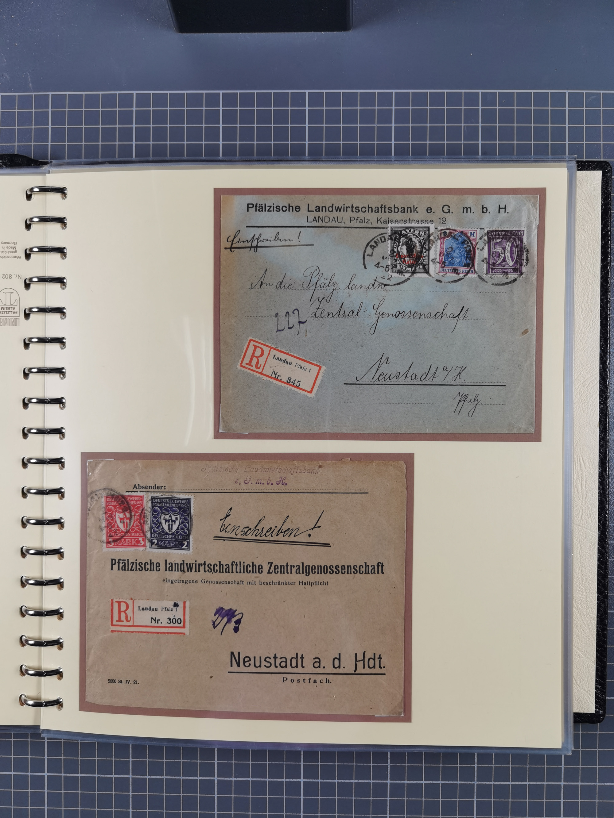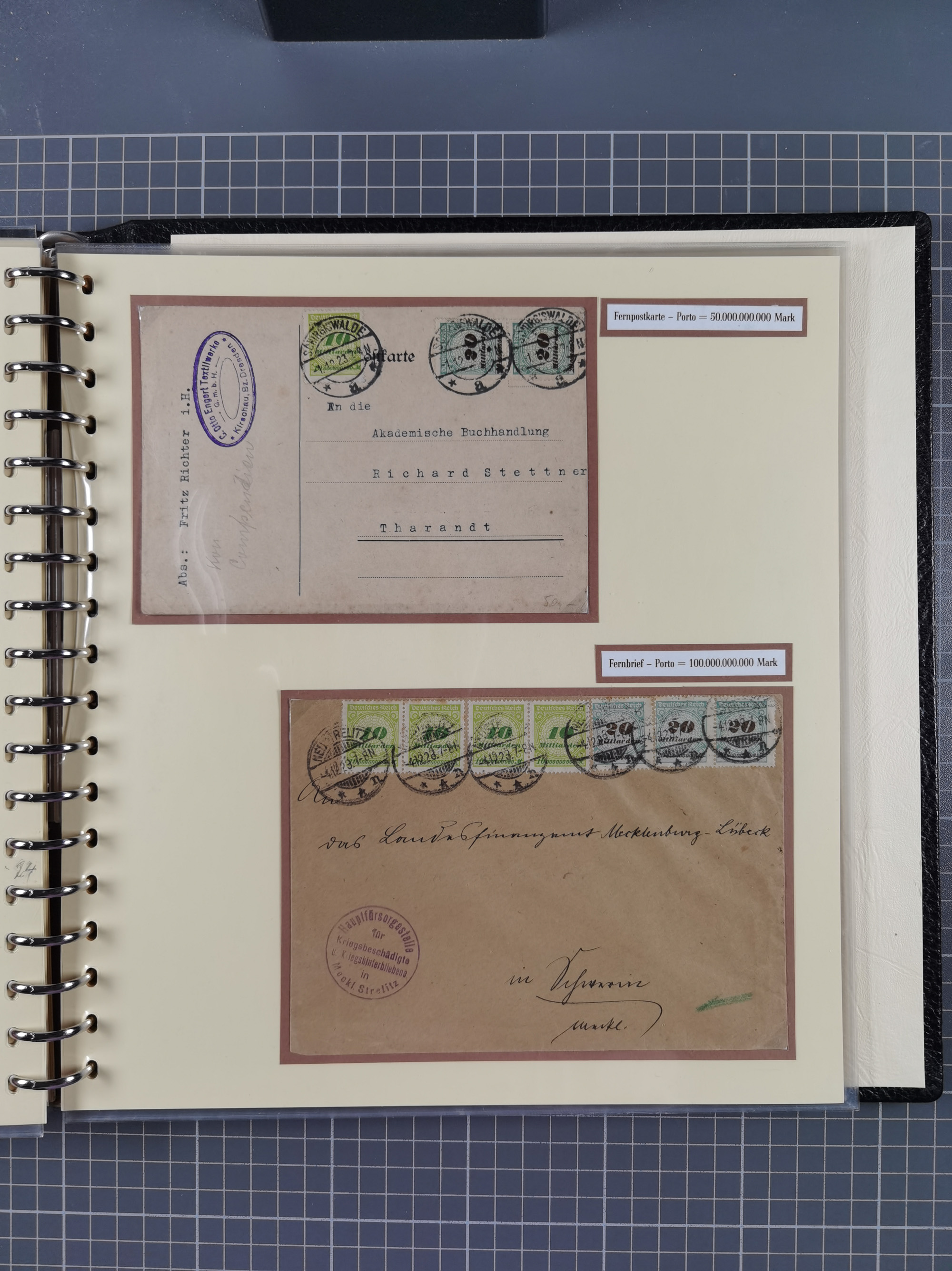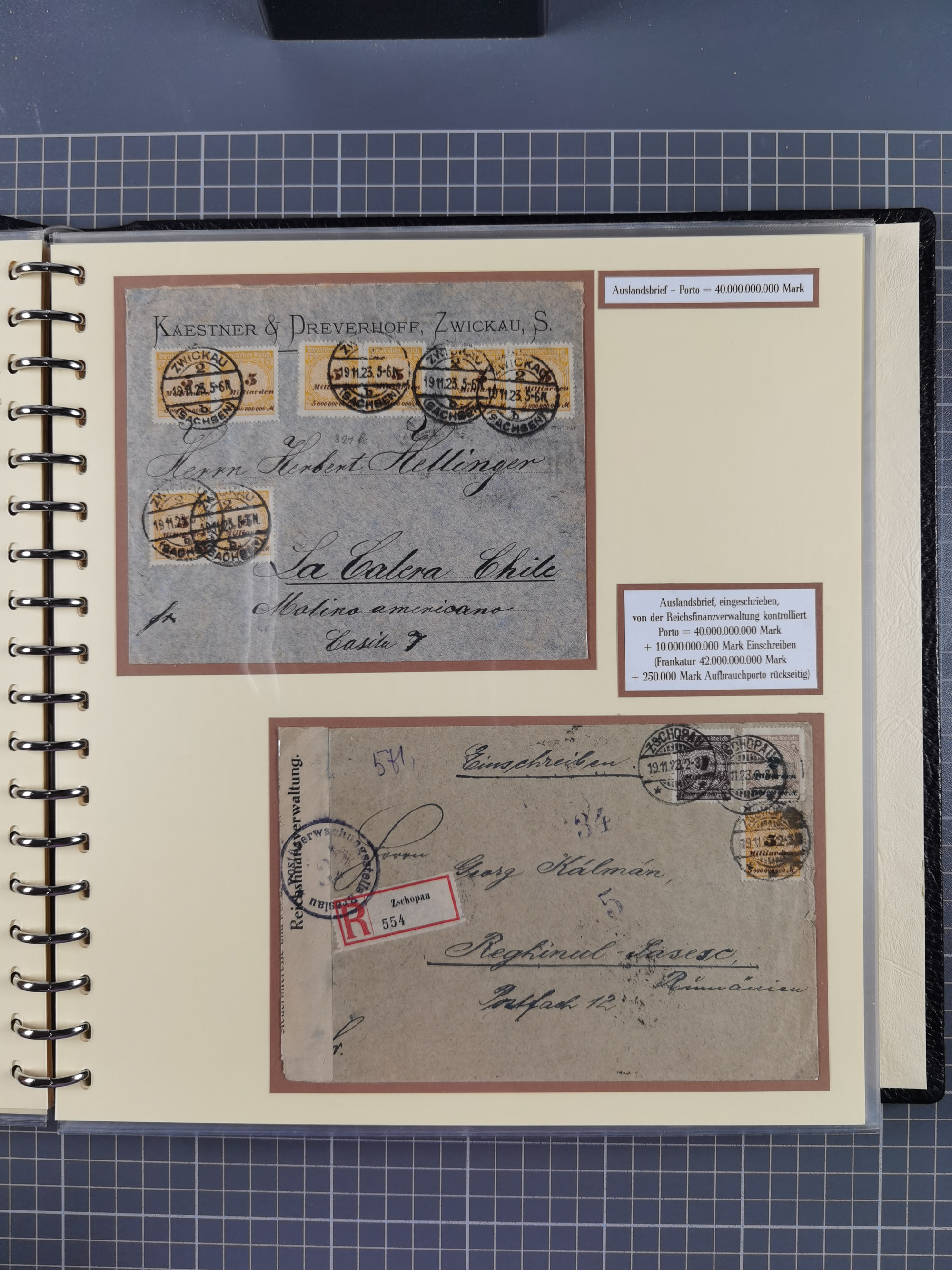1872/1923, umfangreiche Sammlung mit ca. 800 Briefen,Karten und Ganzsachen. Am Anfang mit kleinem Teil “Hufeisentstempel”, ansonsten liegt der Schwerpunkt bei Infla mit Einzel- und Mehrfachfrankaturen, R-Briefen, Auslandspost, viel Hochinflation mit Dezember-Briefen und Portostufen. Alles auf selbst gestalteten Albenblättern in10 Alben