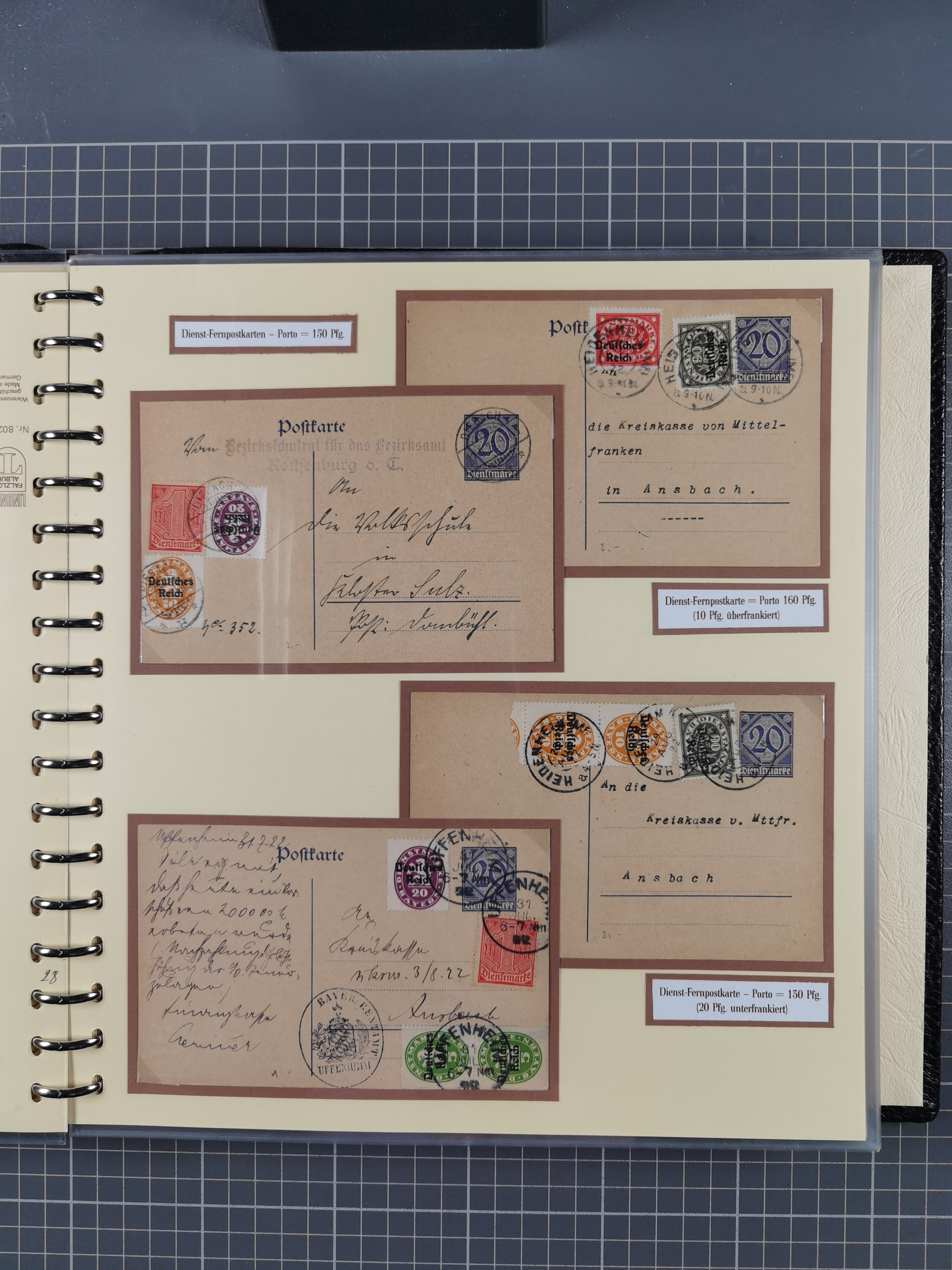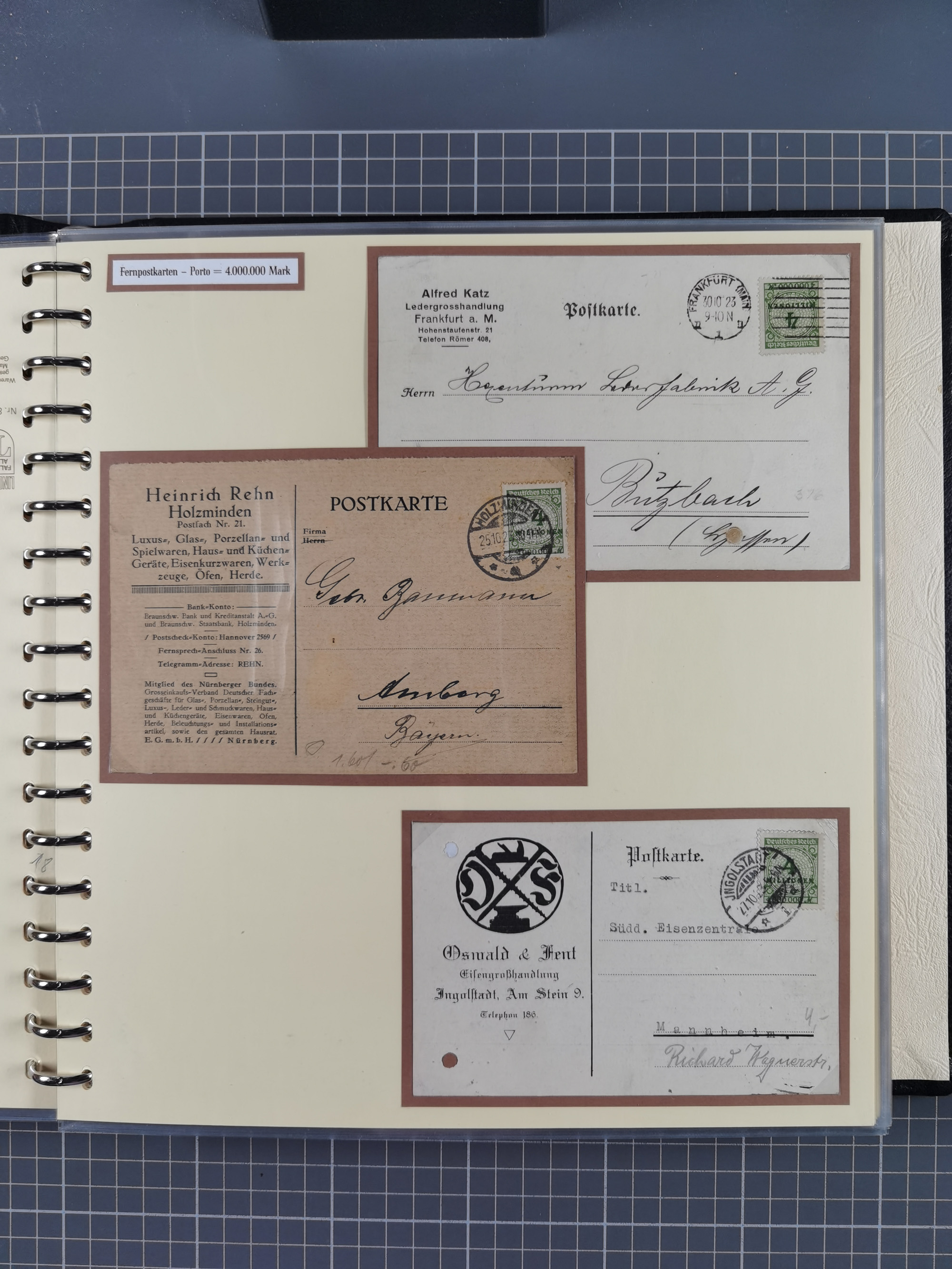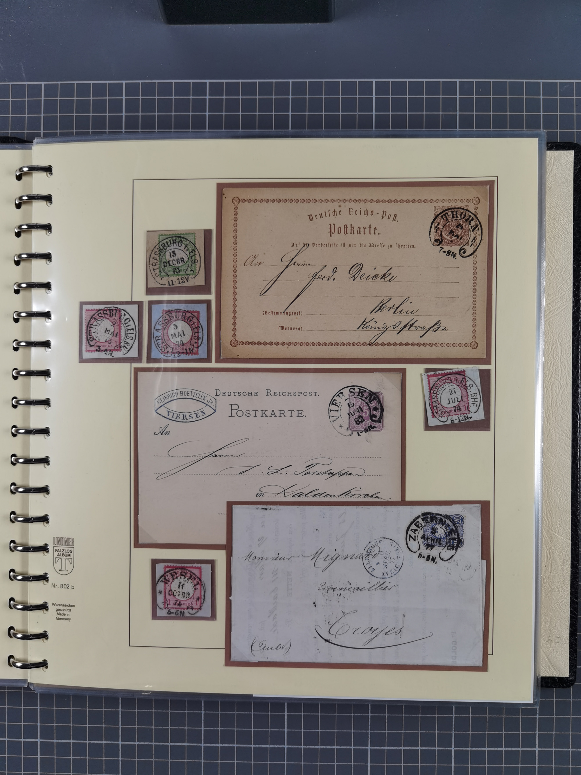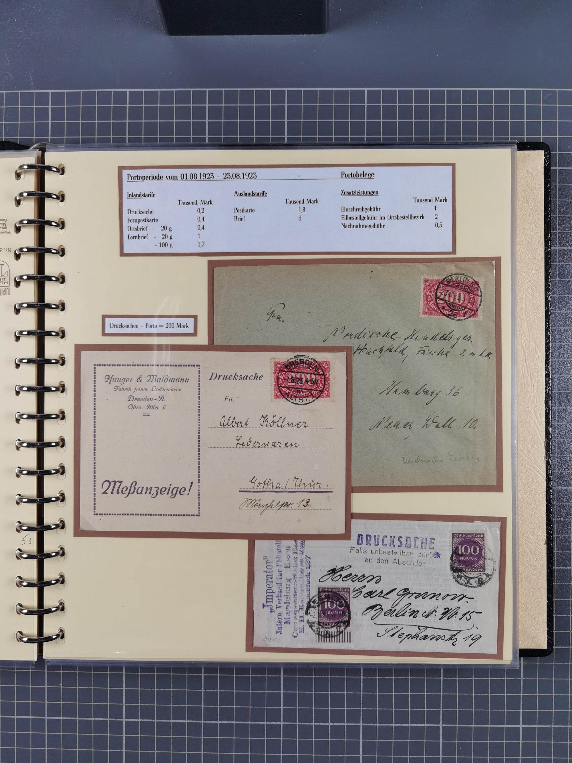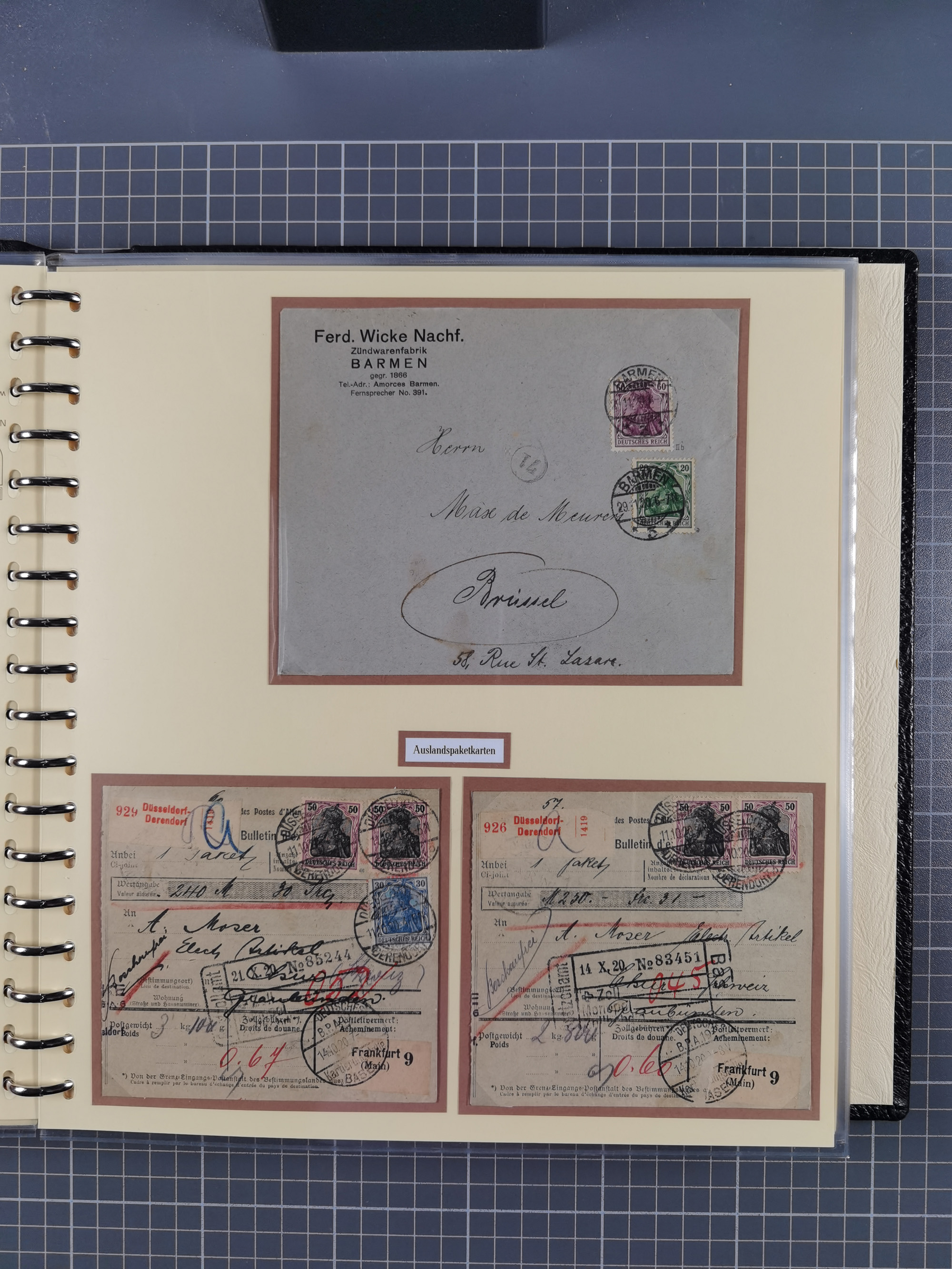 1872/1923, umfangreiche Sammlung mit ca. 800 Briefen,Karten und Ganzsachen. Am Anfang mit kleinem Teil “Hufeisentstempel”, ansonsten liegt der Schwerpunkt bei Infla mit Einzel- und Mehrfachfrankaturen, R-Briefen, Auslandspost, viel Hochinflation mit Dezember-Briefen und Portostufen. Alles auf selbst gestalteten Albenblättern in10 Alben