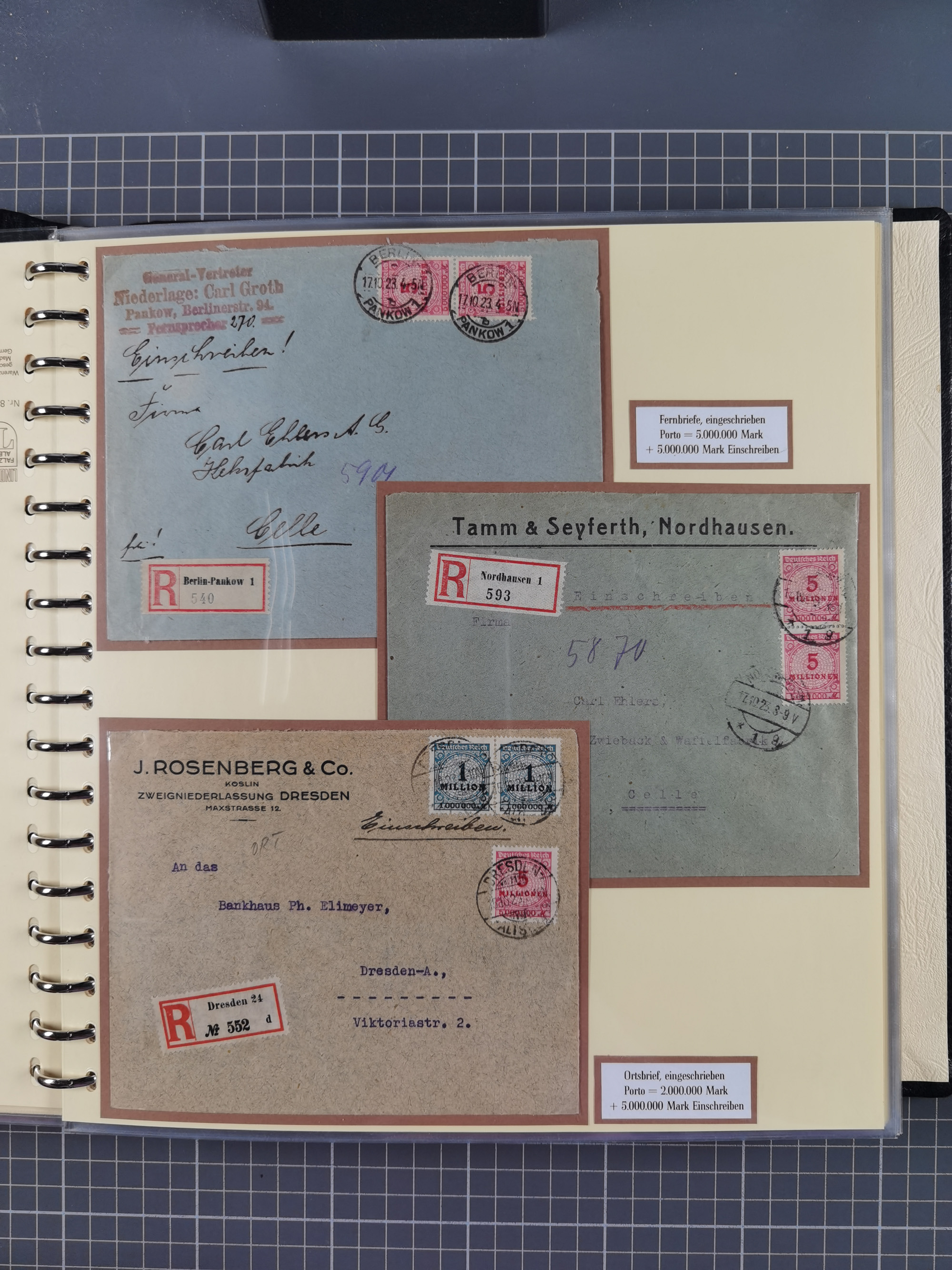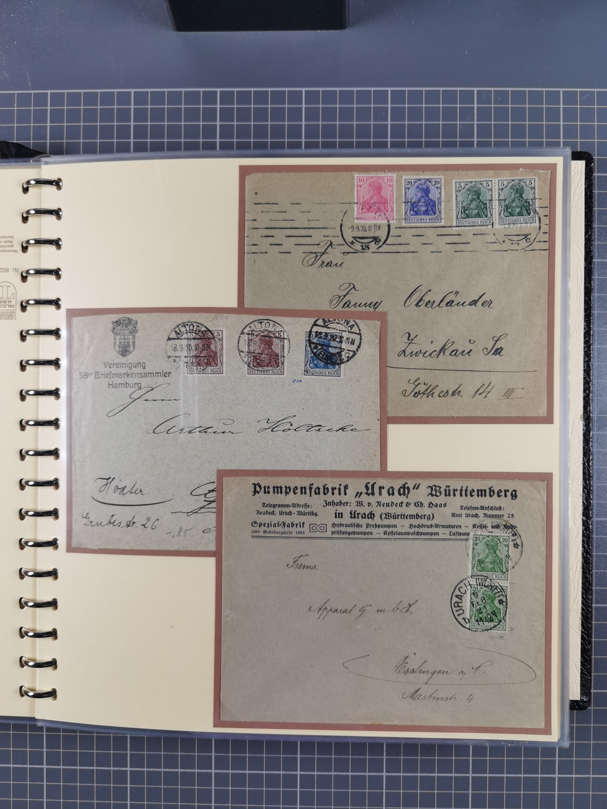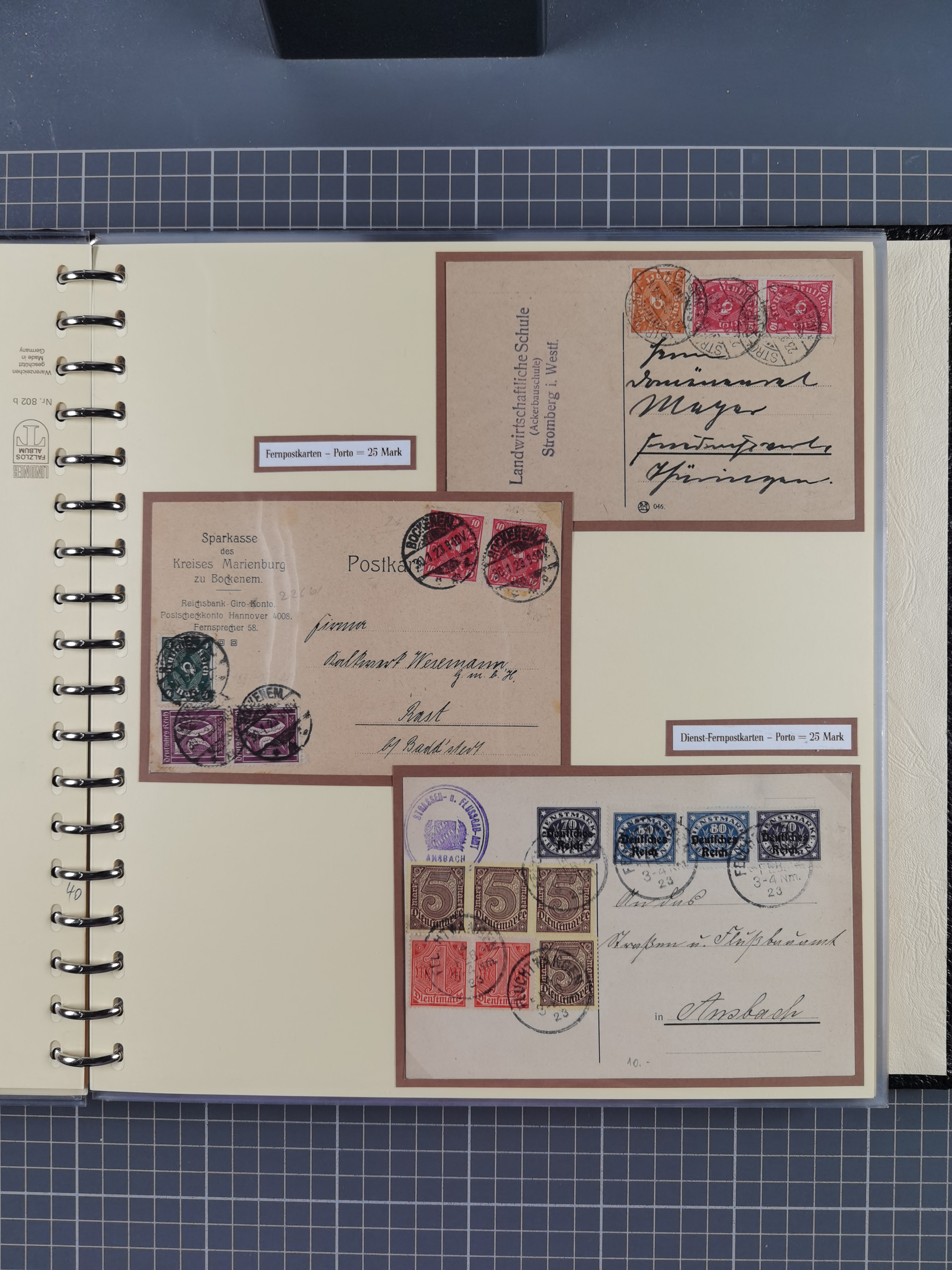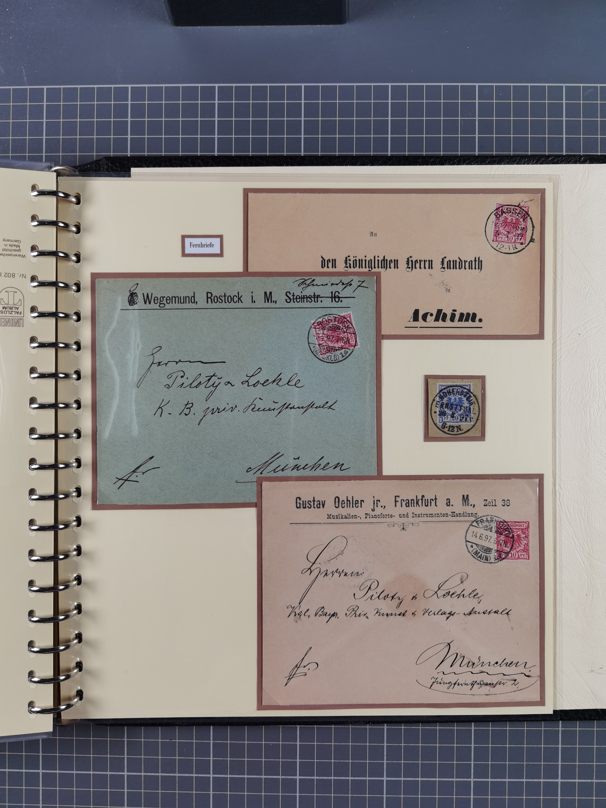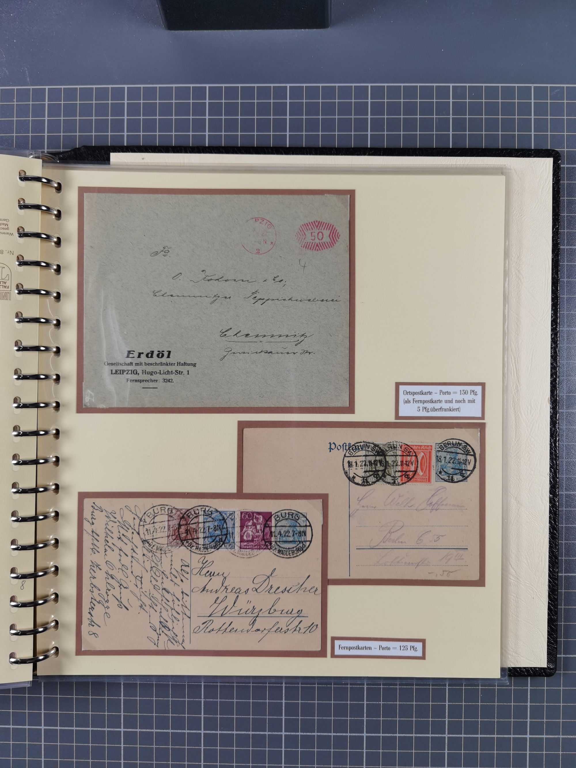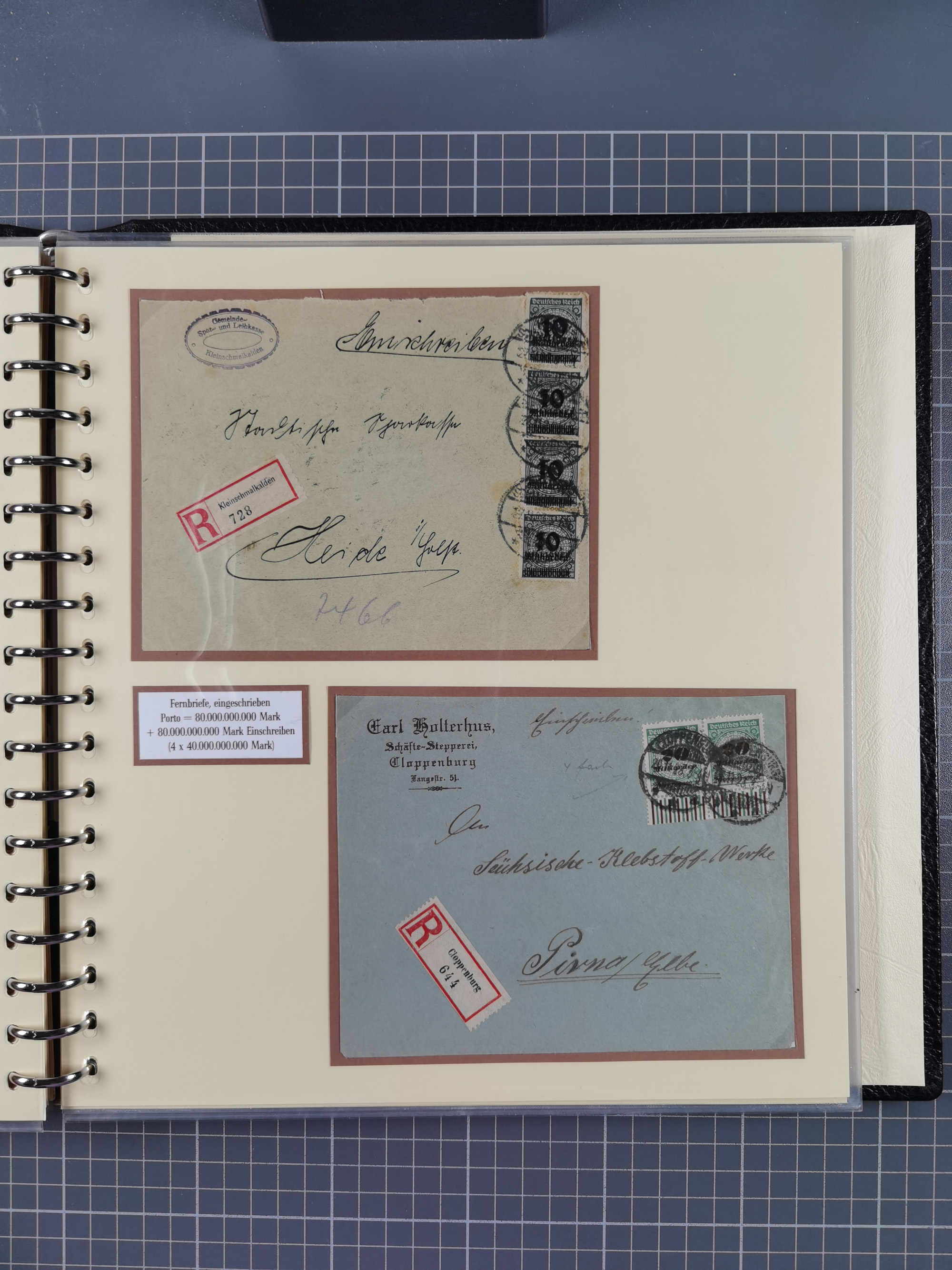 1872/1923, umfangreiche Sammlung mit ca. 800 Briefen,Karten und Ganzsachen. Am Anfang mit kleinem Teil “Hufeisentstempel”, ansonsten liegt der Schwerpunkt bei Infla mit Einzel- und Mehrfachfrankaturen, R-Briefen, Auslandspost, viel Hochinflation mit Dezember-Briefen und Portostufen. Alles auf selbst gestalteten Albenblättern in10 Alben
