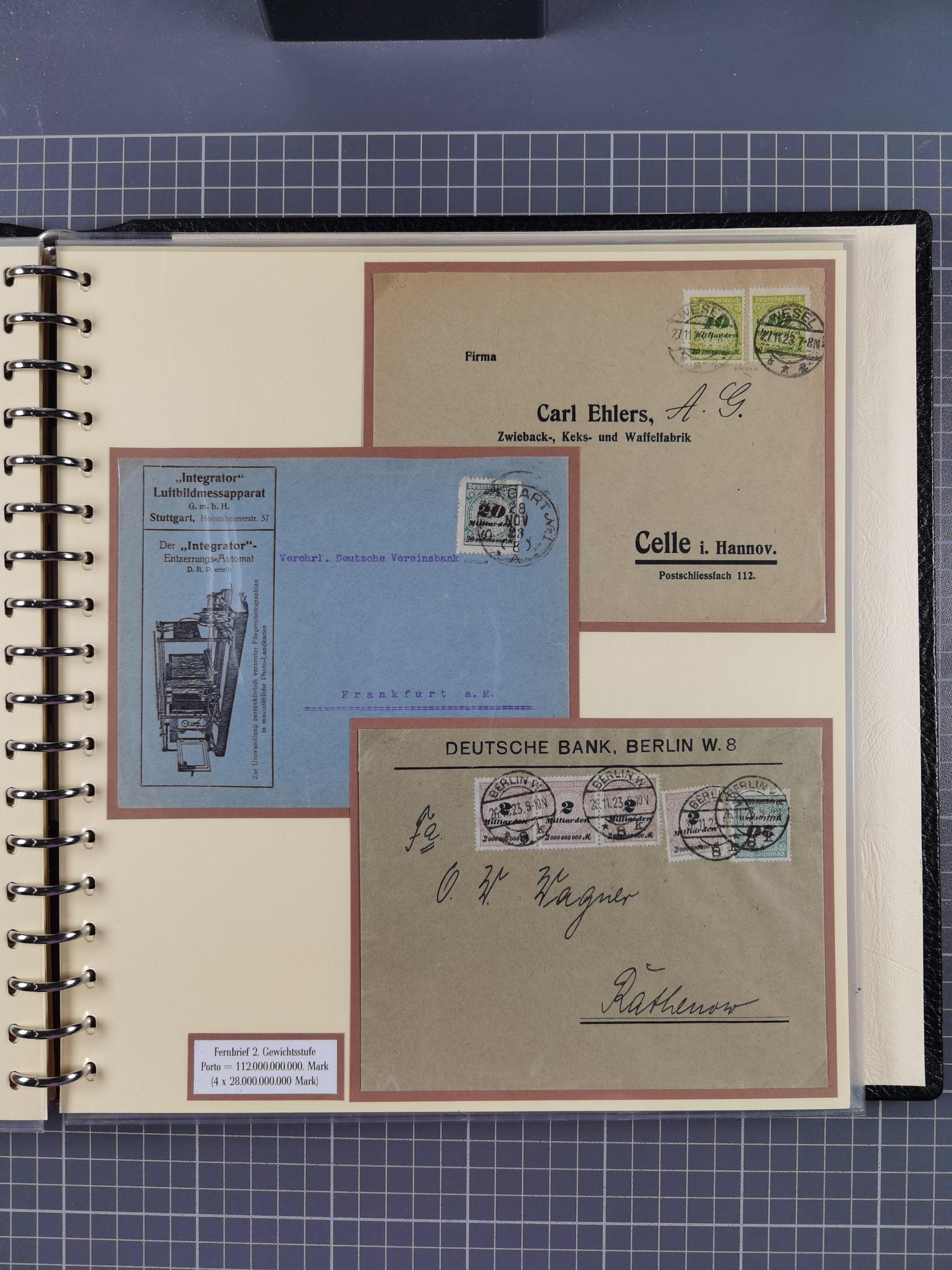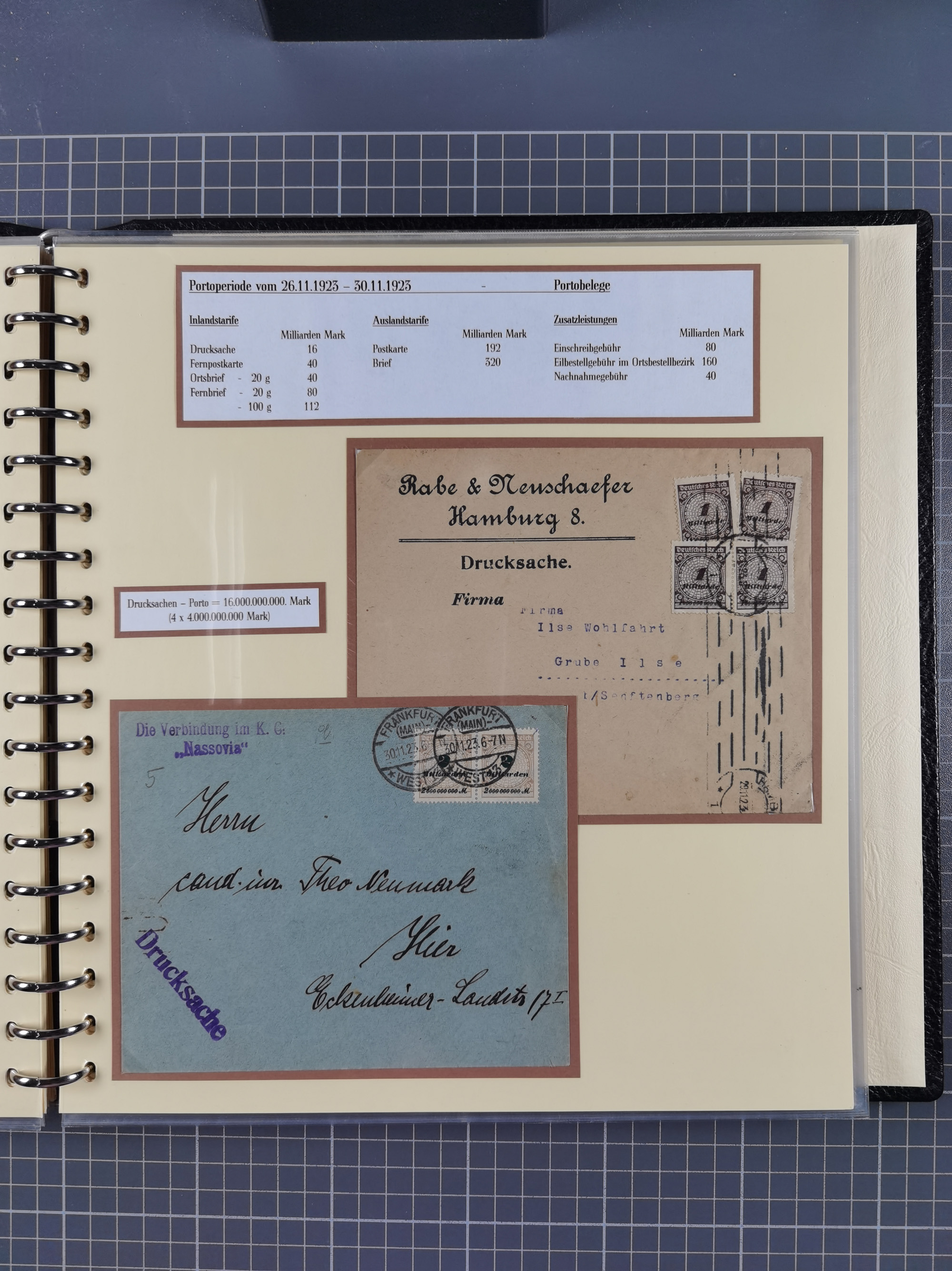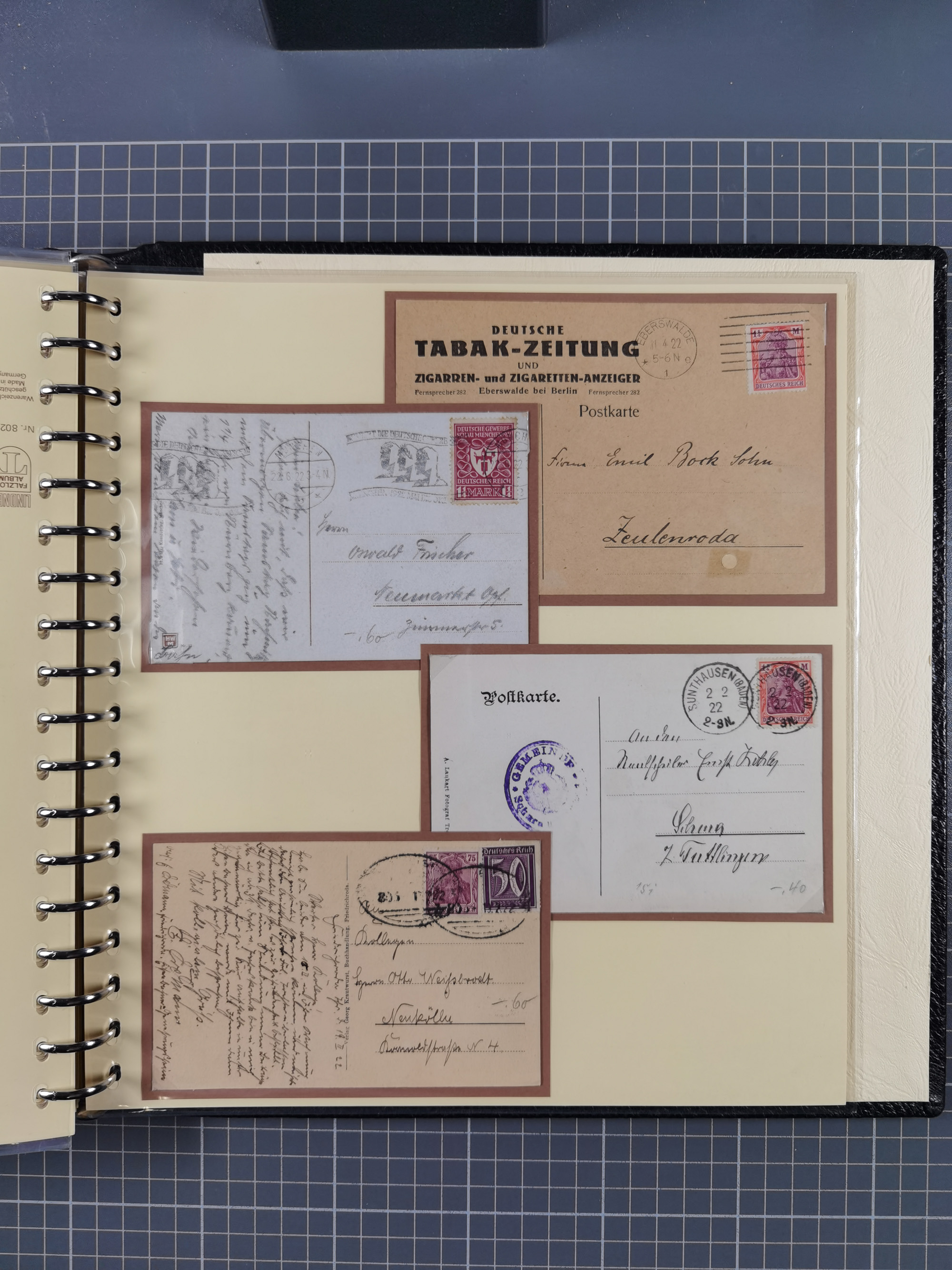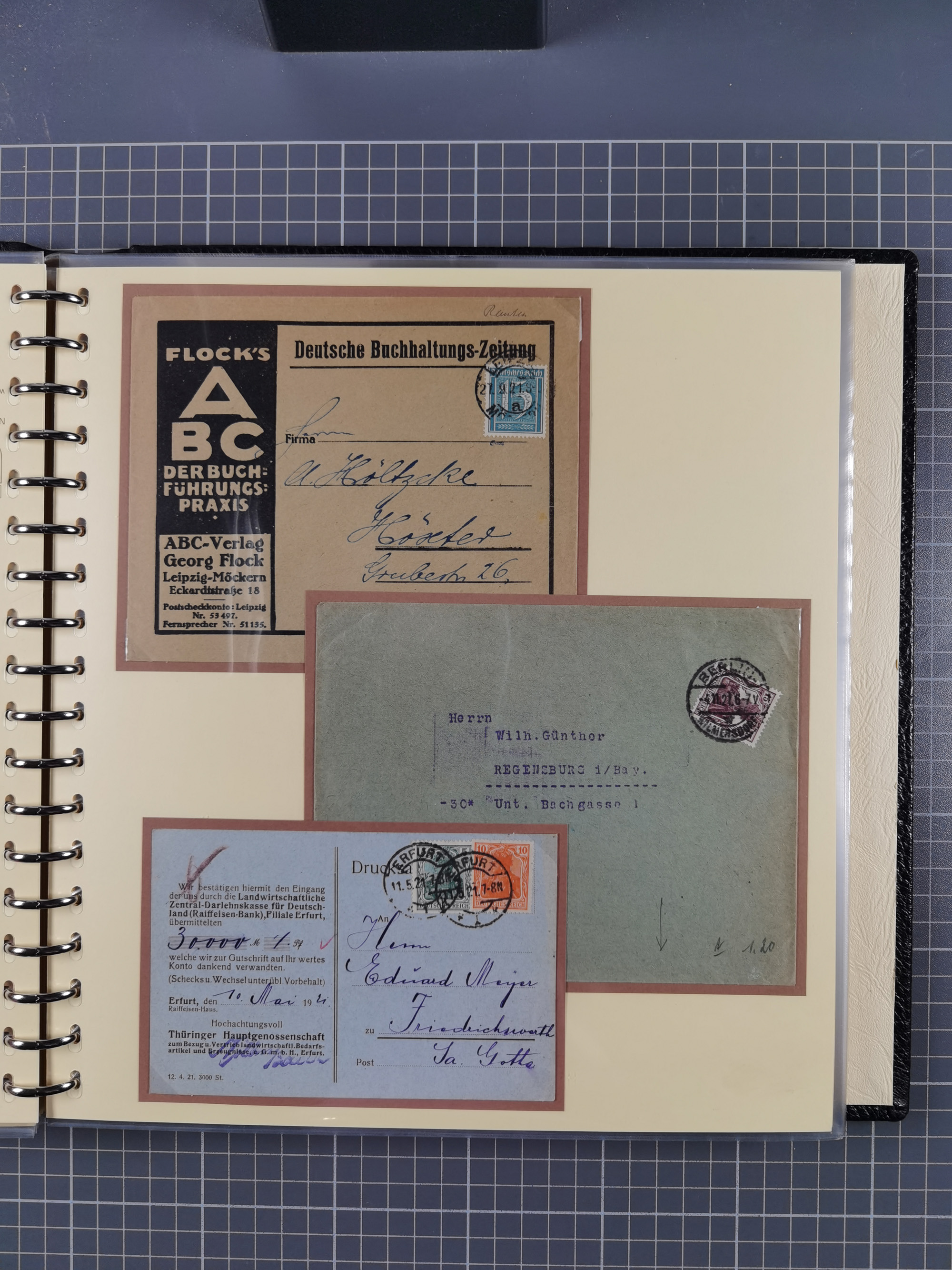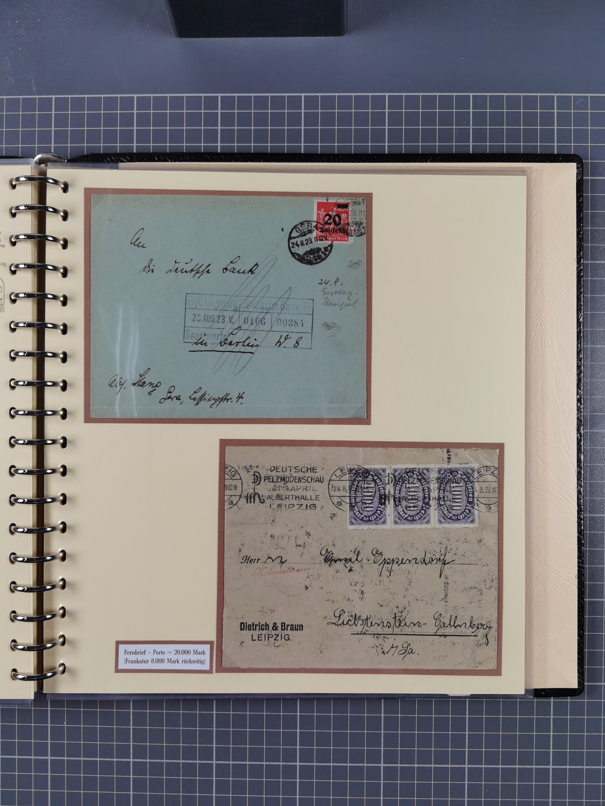 1872/1923, umfangreiche Sammlung mit ca. 800 Briefen,Karten und Ganzsachen. Am Anfang mit kleinem Teil “Hufeisentstempel”, ansonsten liegt der Schwerpunkt bei Infla mit Einzel- und Mehrfachfrankaturen, R-Briefen, Auslandspost, viel Hochinflation mit Dezember-Briefen und Portostufen. Alles auf selbst gestalteten Albenblättern in10 Alben