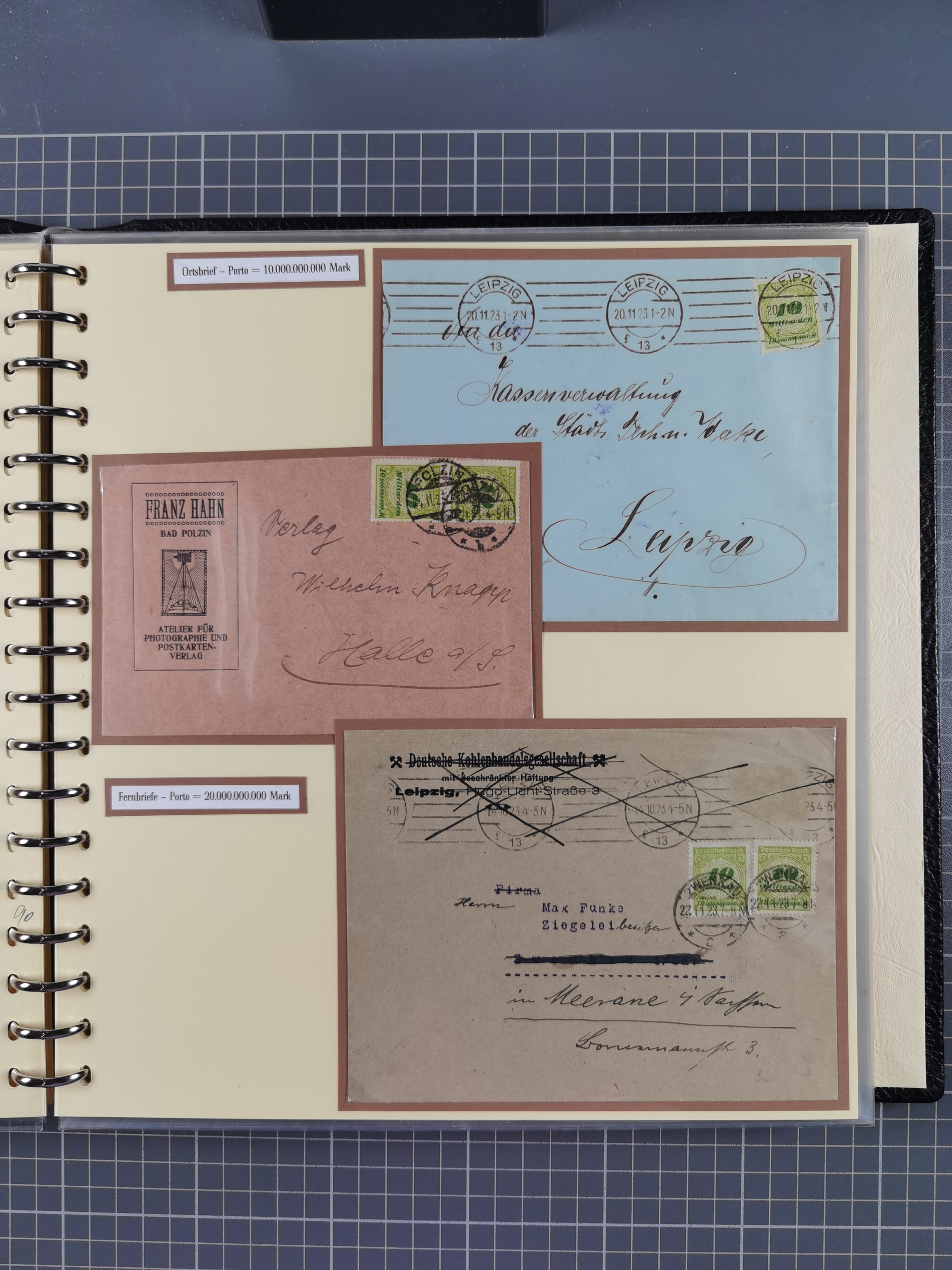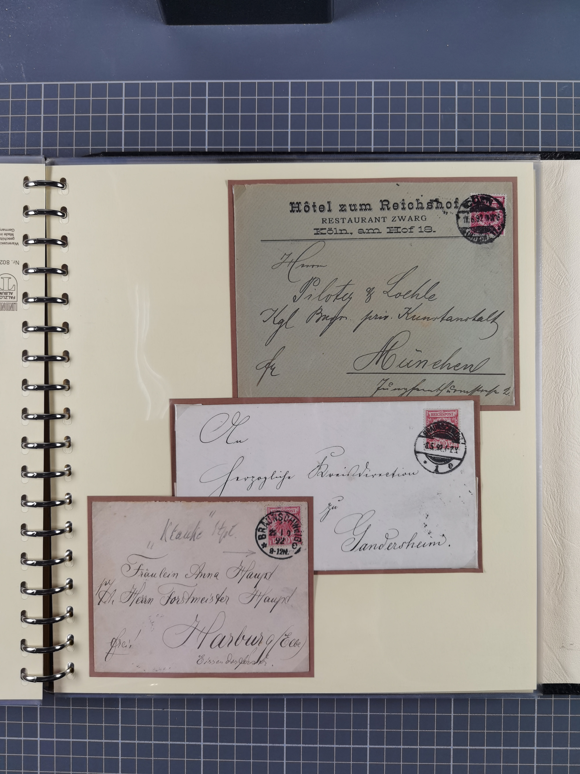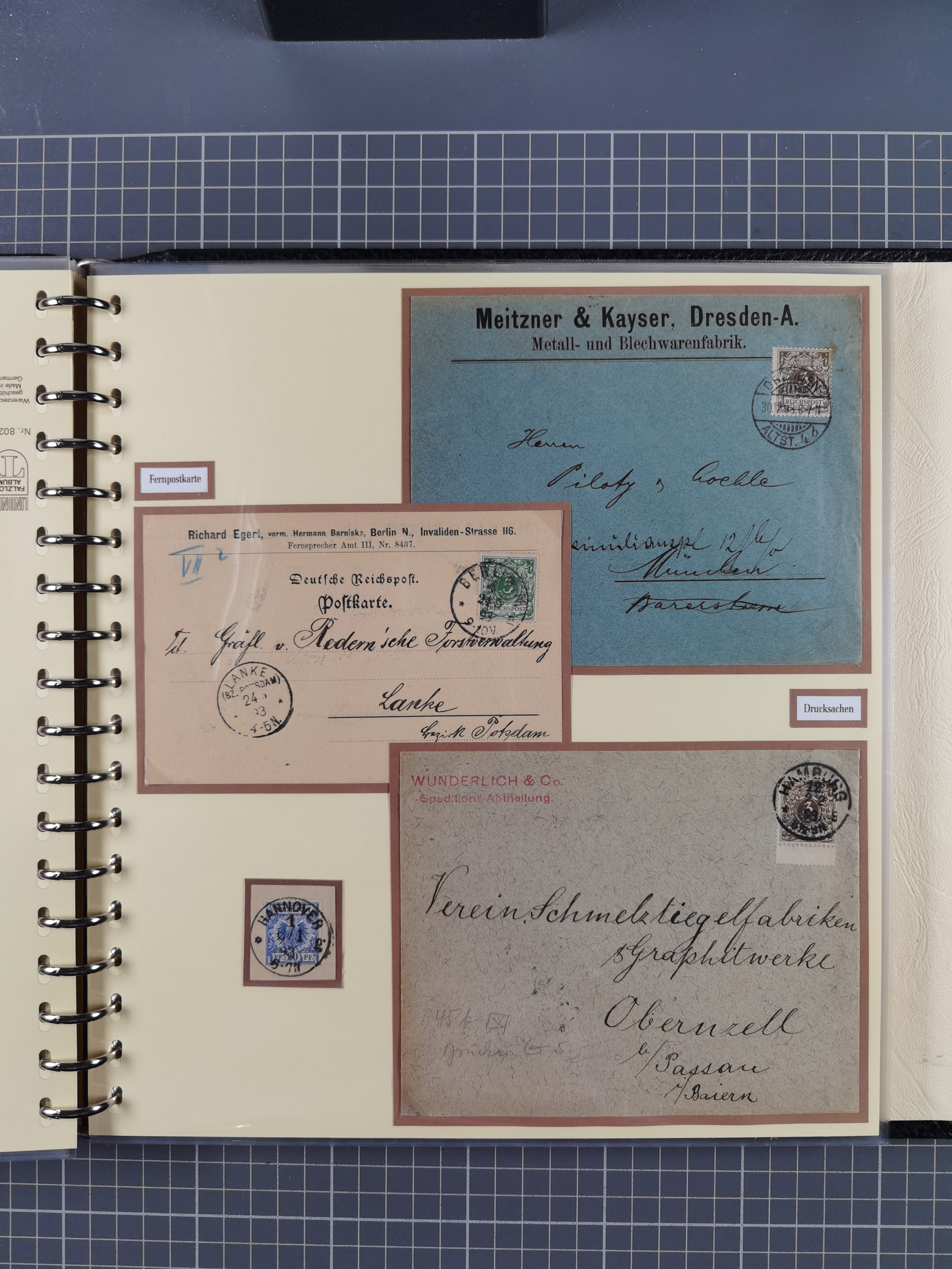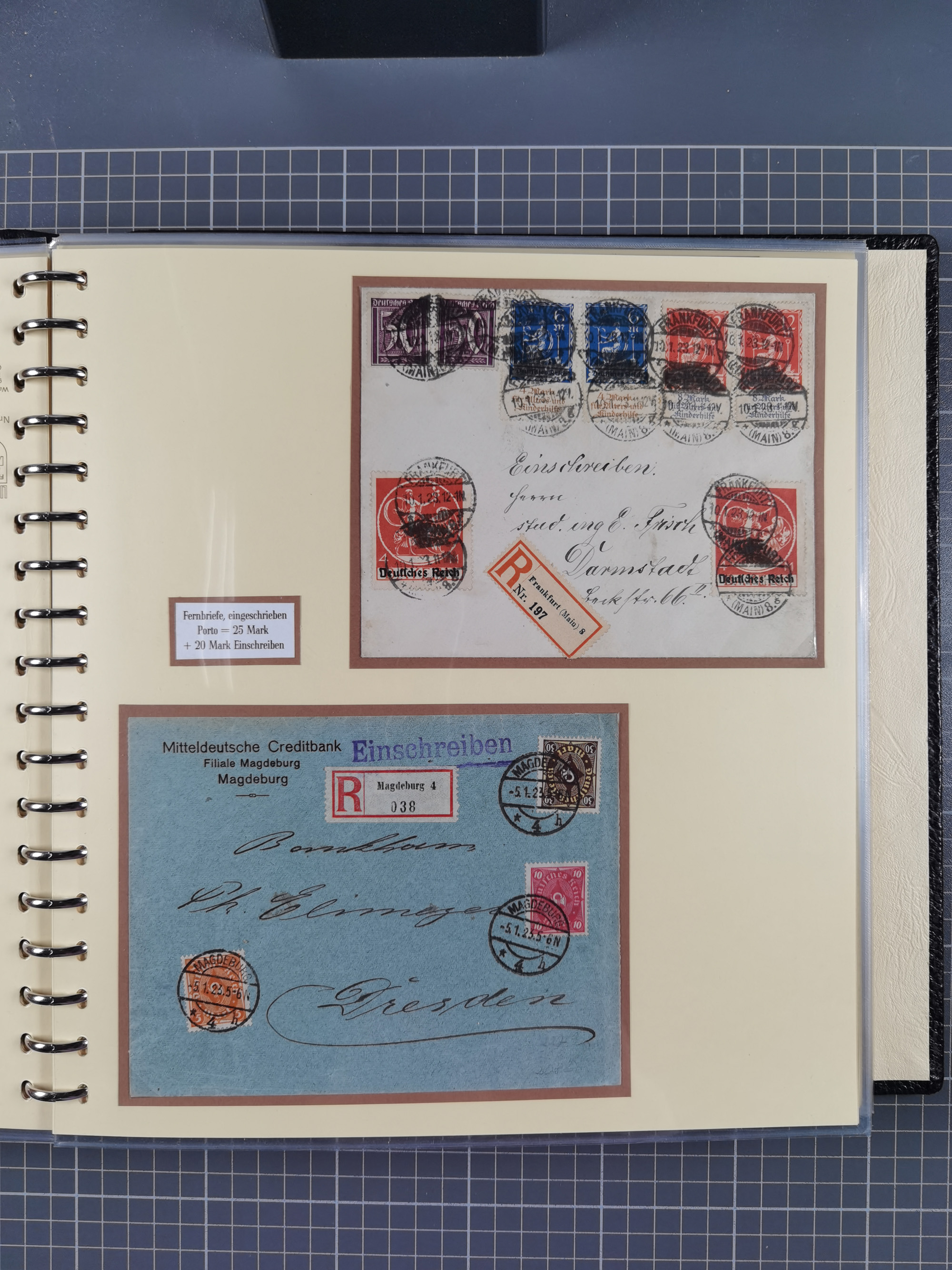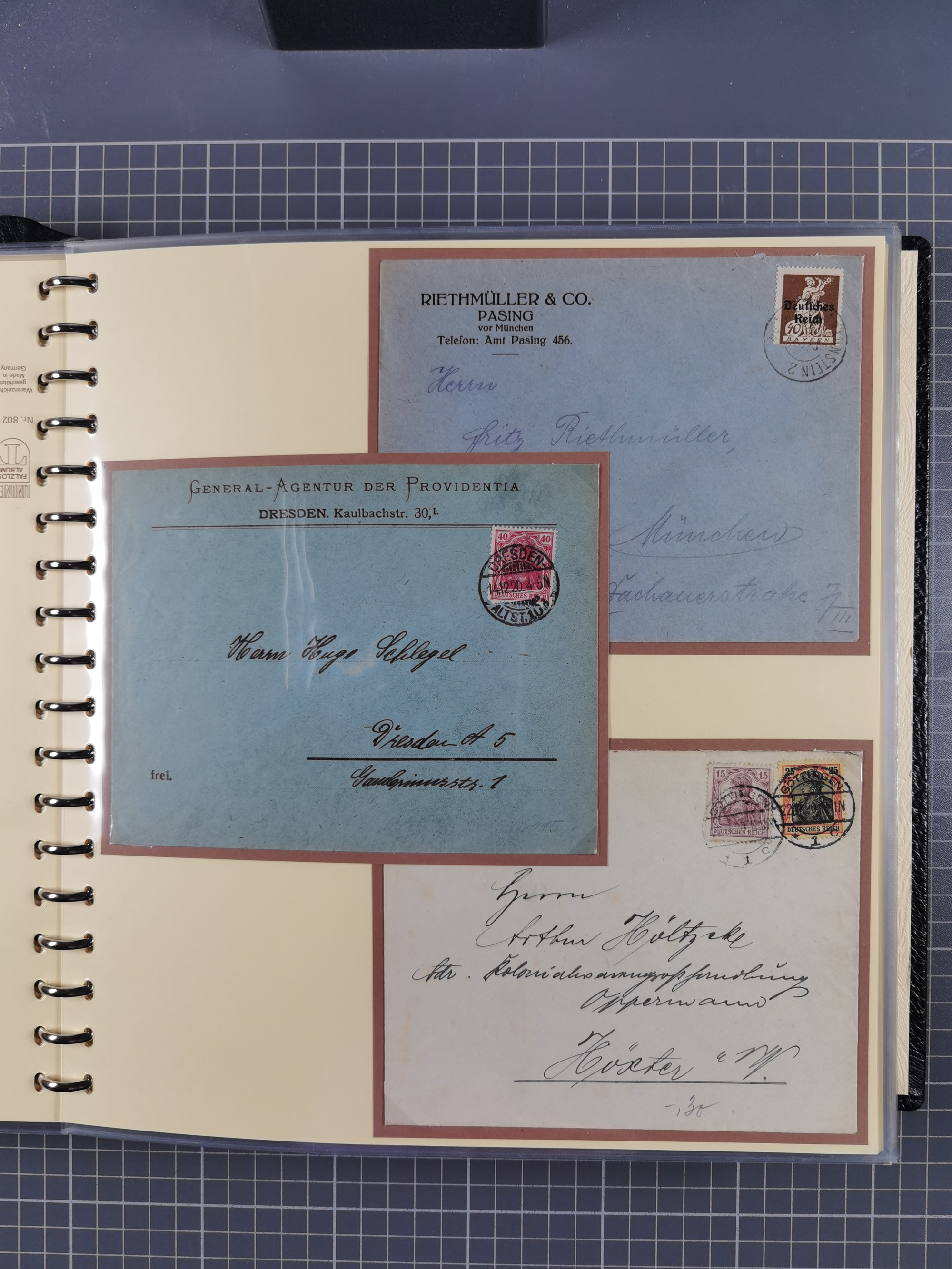 1872/1923, umfangreiche Sammlung mit ca. 800 Briefen,Karten und Ganzsachen. Am Anfang mit kleinem Teil “Hufeisentstempel”, ansonsten liegt der Schwerpunkt bei Infla mit Einzel- und Mehrfachfrankaturen, R-Briefen, Auslandspost, viel Hochinflation mit Dezember-Briefen und Portostufen. Alles auf selbst gestalteten Albenblättern in10 Alben