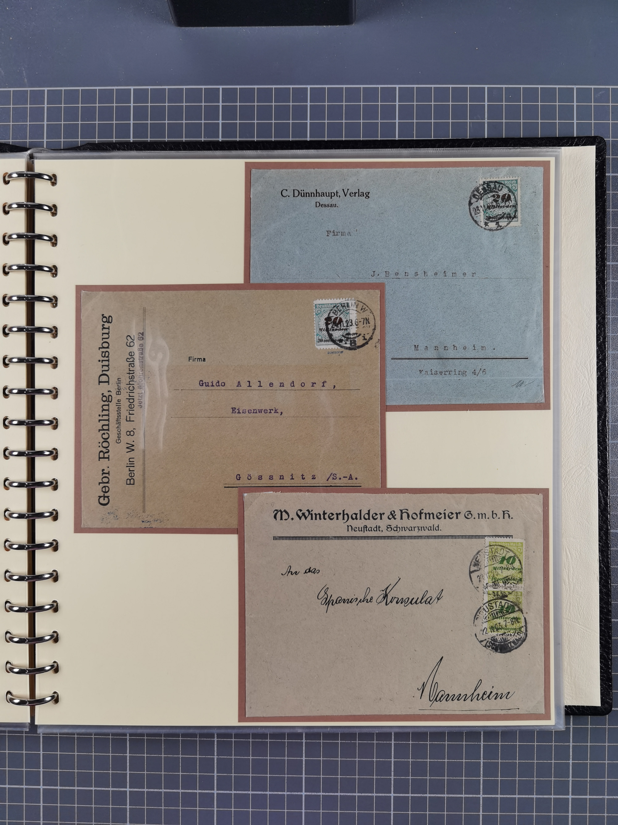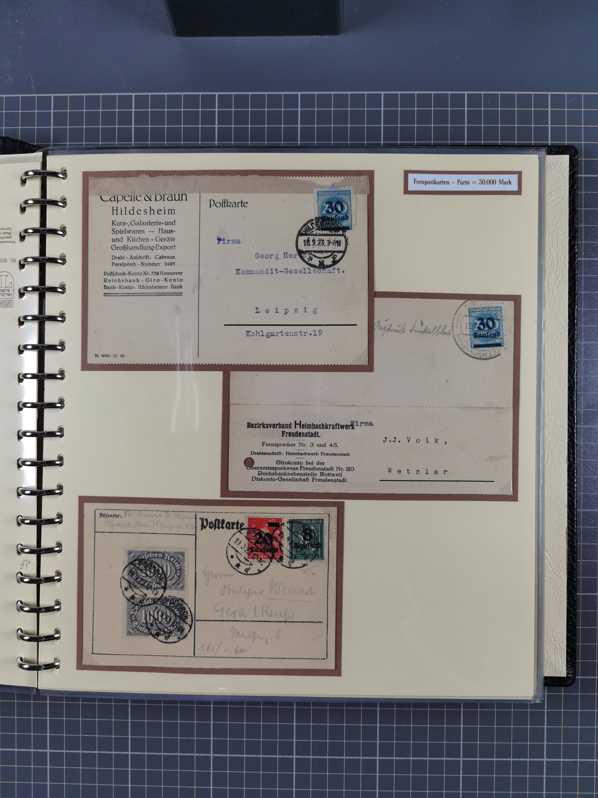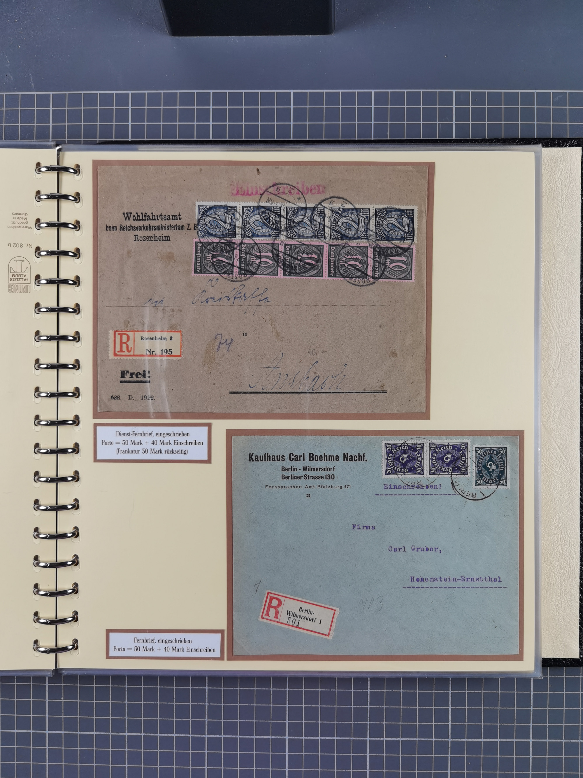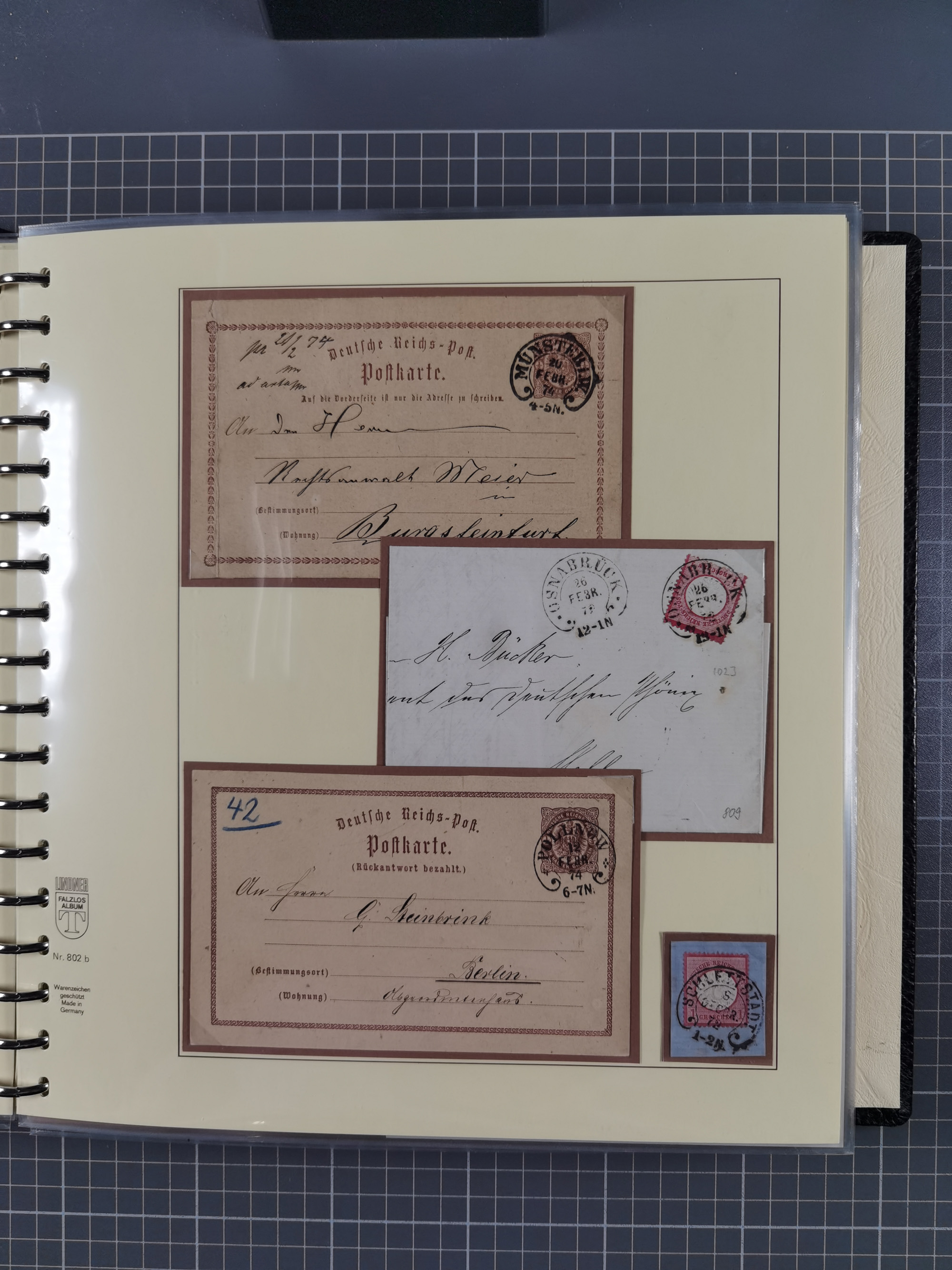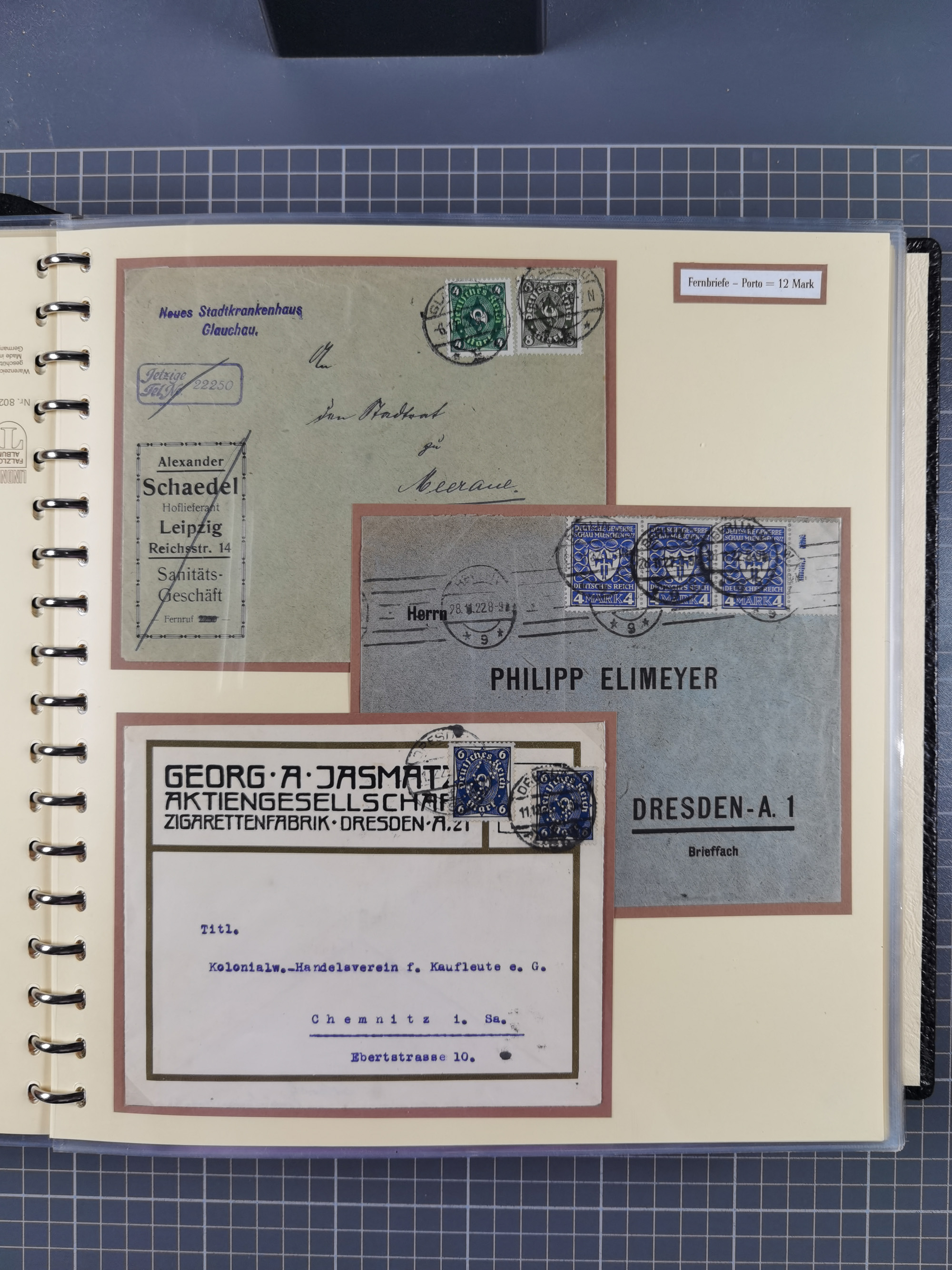 1872/1923, umfangreiche Sammlung mit ca. 800 Briefen,Karten und Ganzsachen. Am Anfang mit kleinem Teil “Hufeisentstempel”, ansonsten liegt der Schwerpunkt bei Infla mit Einzel- und Mehrfachfrankaturen, R-Briefen, Auslandspost, viel Hochinflation mit Dezember-Briefen und Portostufen. Alles auf selbst gestalteten Albenblättern in10 Alben