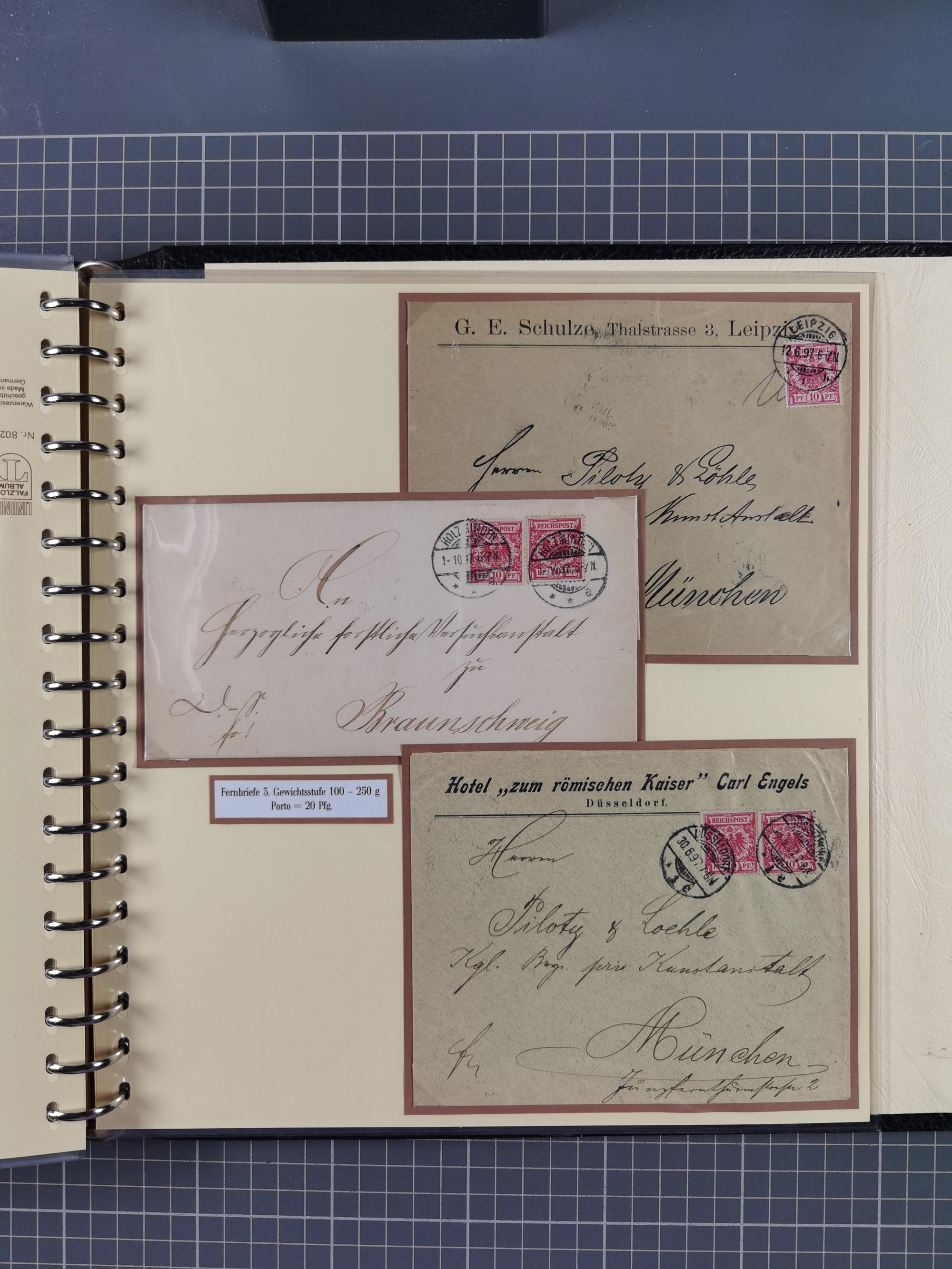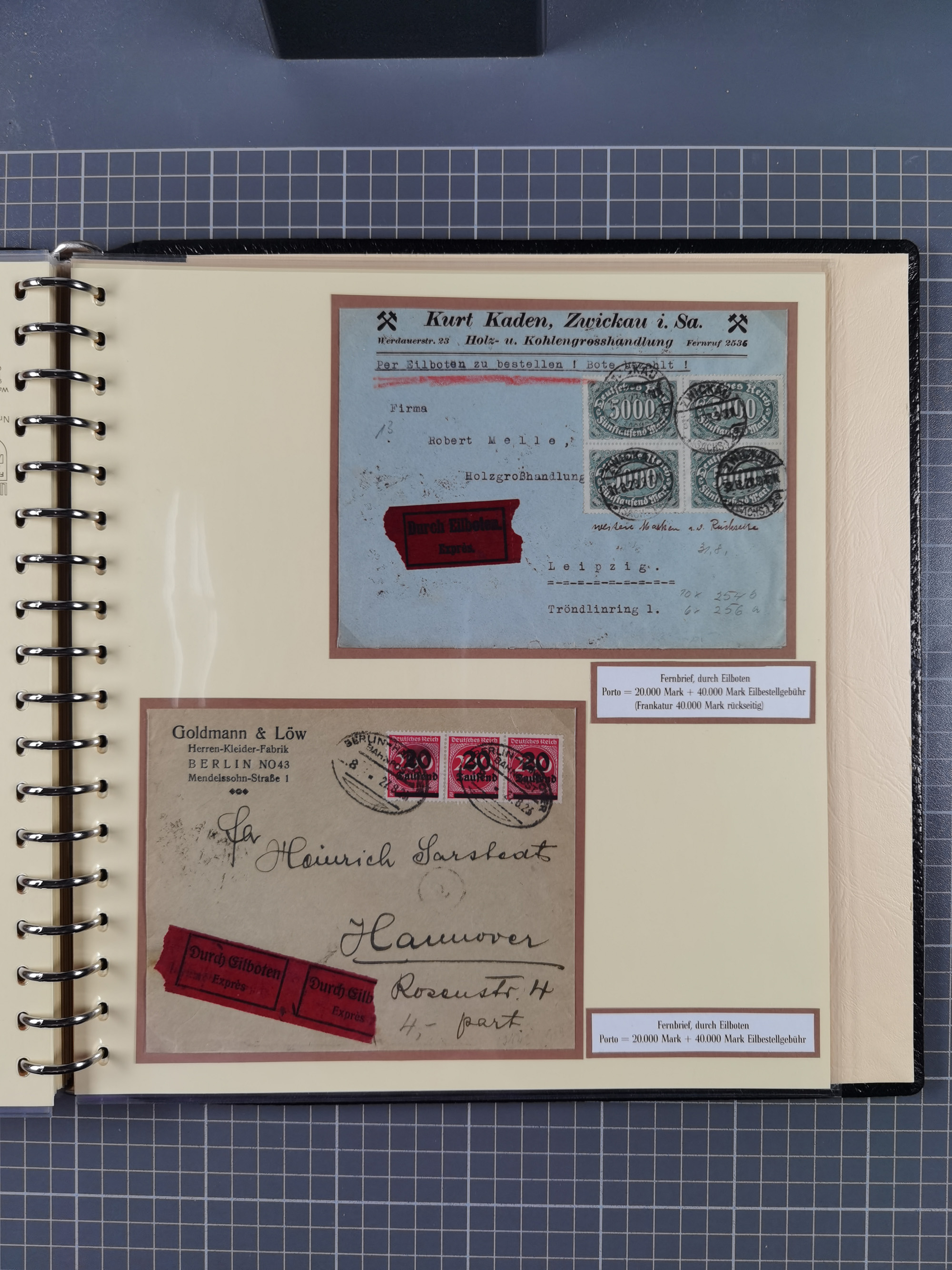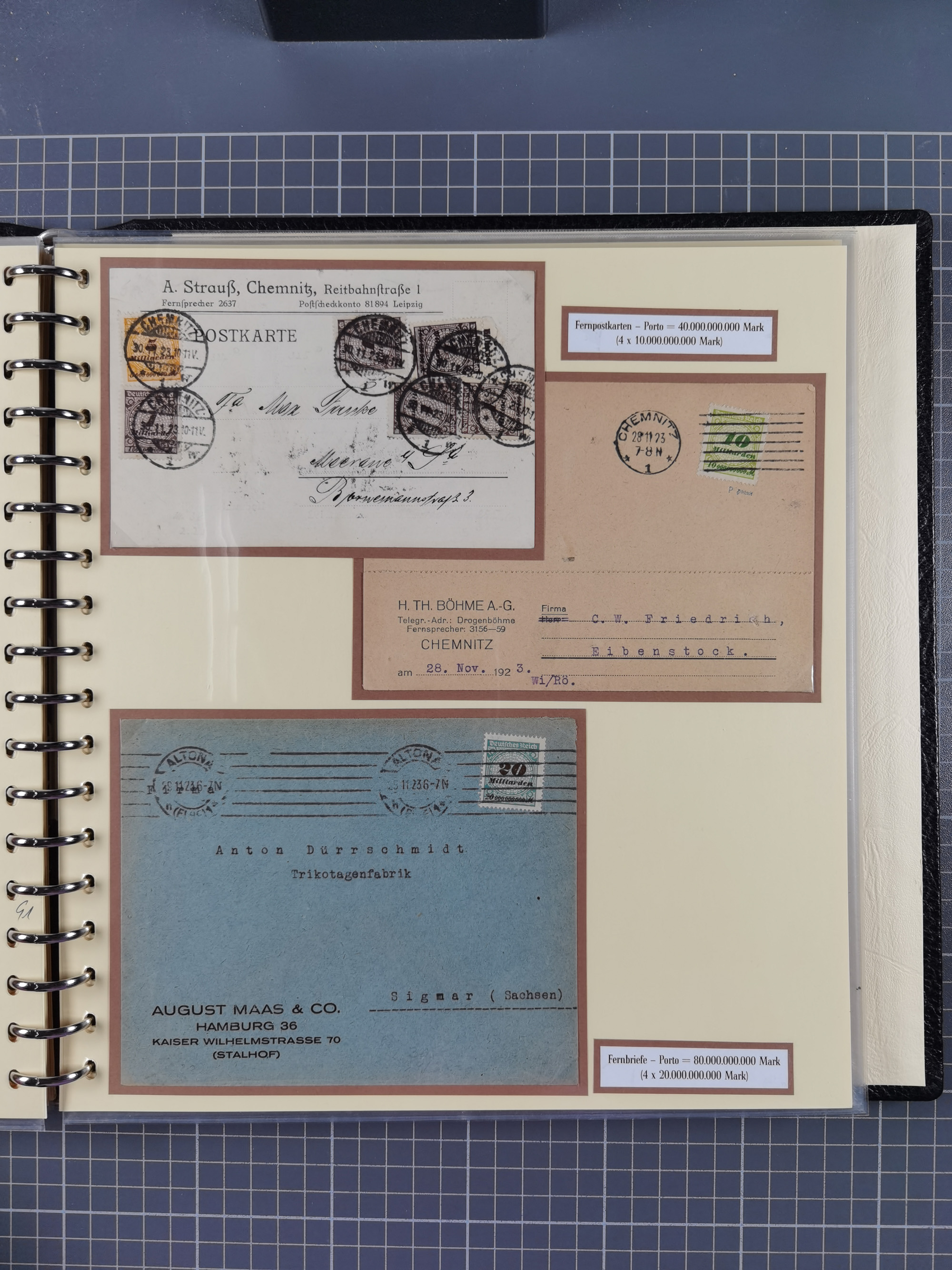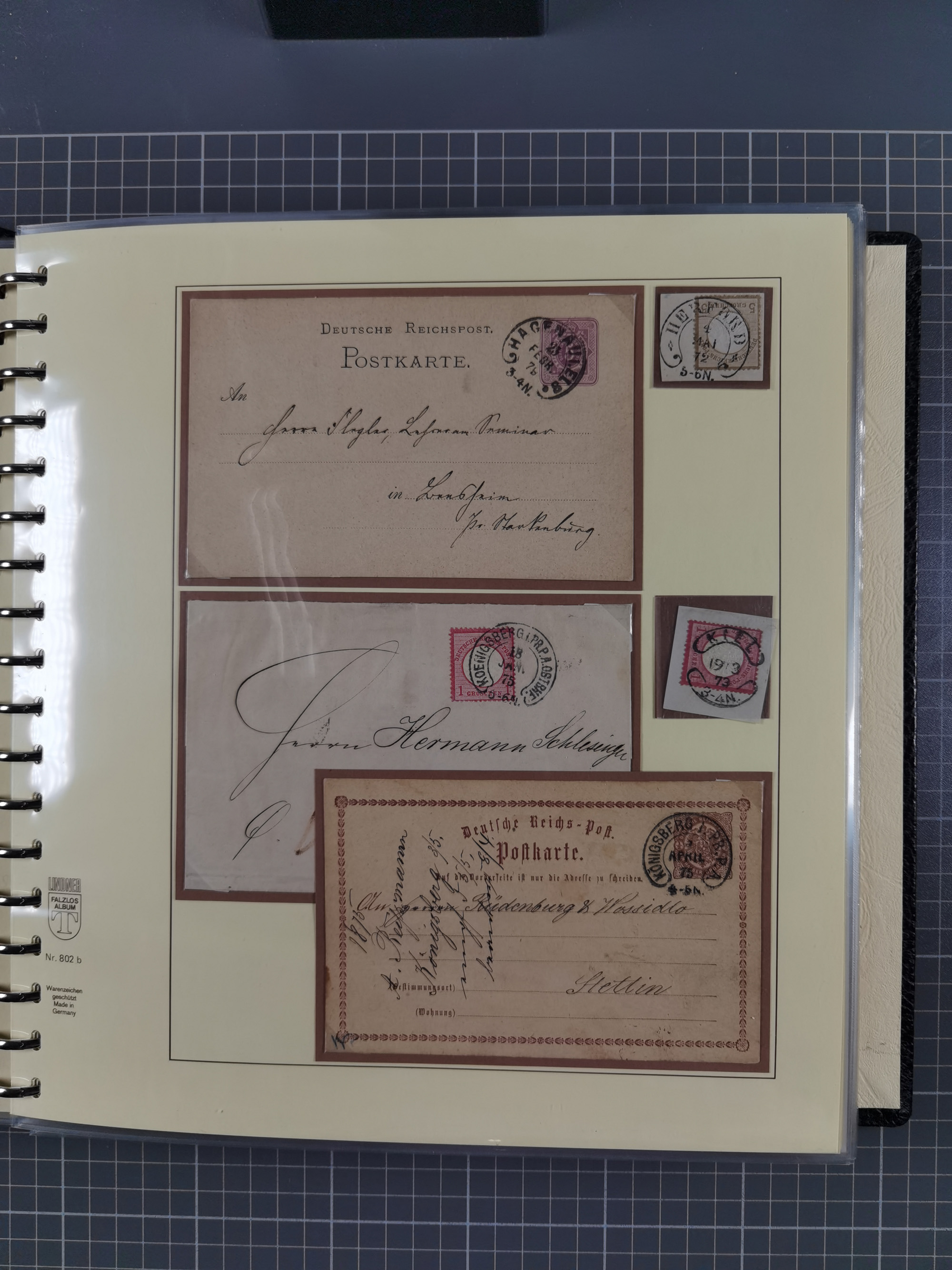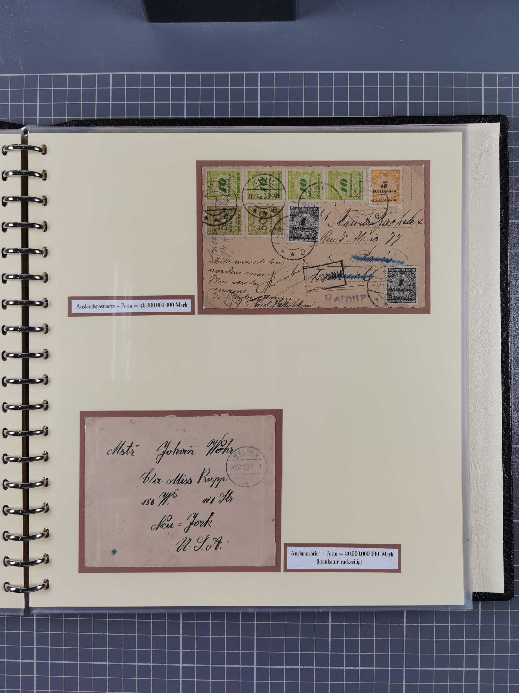 1872/1923, umfangreiche Sammlung mit ca. 800 Briefen,Karten und Ganzsachen. Am Anfang mit kleinem Teil “Hufeisentstempel”, ansonsten liegt der Schwerpunkt bei Infla mit Einzel- und Mehrfachfrankaturen, R-Briefen, Auslandspost, viel Hochinflation mit Dezember-Briefen und Portostufen. Alles auf selbst gestalteten Albenblättern in10 Alben